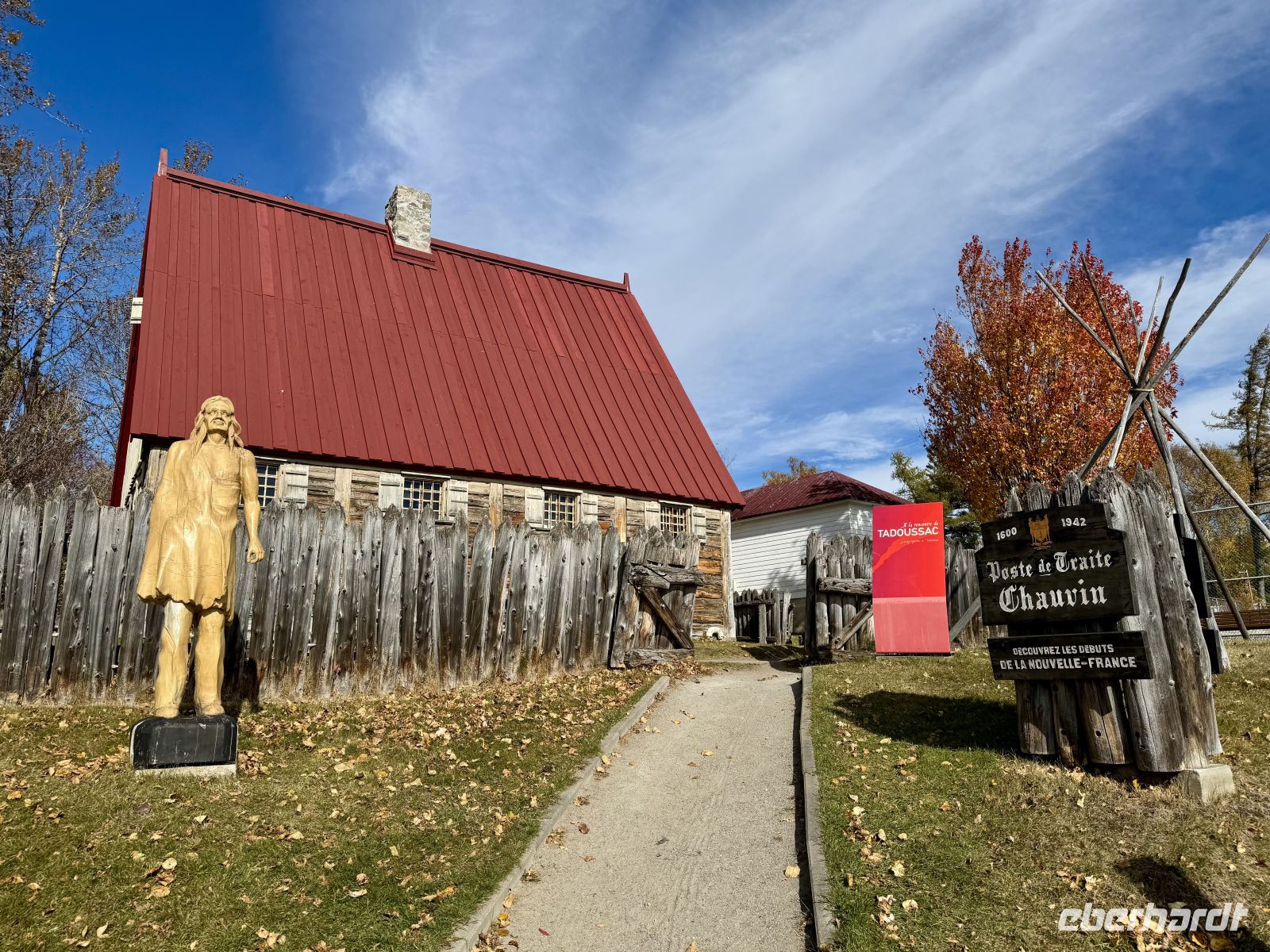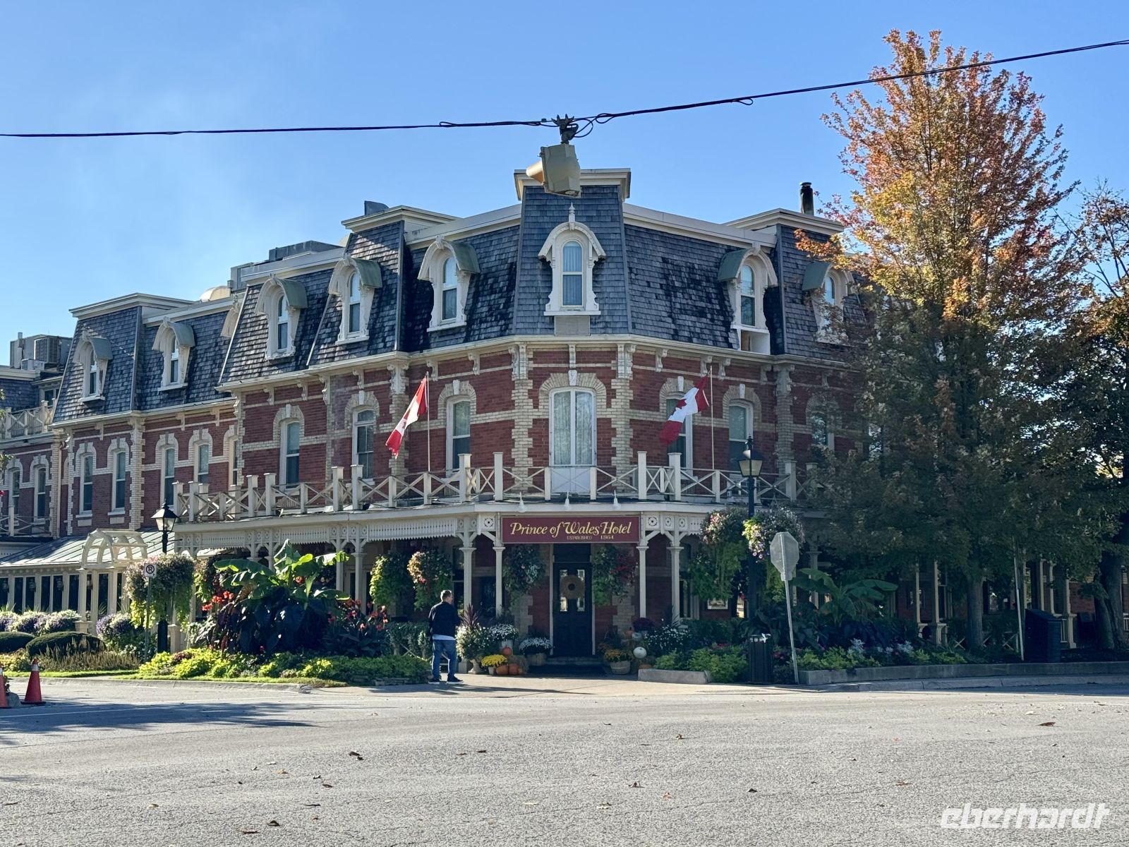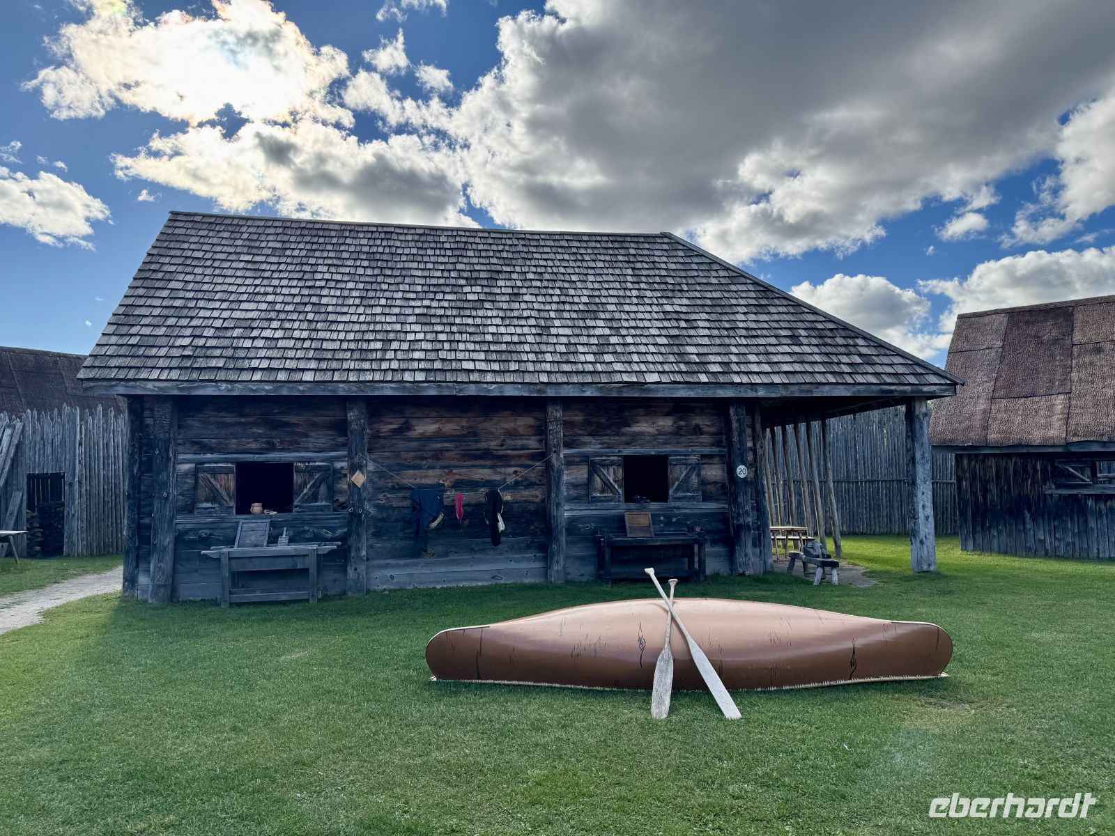 Nach den gestrigen Regenfällen ist das Wetter wieder komplett umgeschlagen. Für die nächsten Tage ist viel Sonne angesagt. Am Morgen werden wir bereits von einem herrlichen Sonnenaufgang geweckt. Für die nächsten Stunden bleiben wir noch in der Niagara-Region und folgen dem Fluss bis zum Lake Ontario. Nach einem Fotostopp am Whirlpool — einer scharfen Biegung des Niagara River mit Strudelbildung — gelangen wir in das kleine Örtchen Niagara-on-the-Lake. Es beeindruckt uns alle mit seinen hübschen Fassaden, gemütlichen Geschäften und vor allem mit der herrlichen Blumenpracht, die im Sonnenschein besonders gut zur Geltung kommt. Überall hängen Blumenampeln und die Straßen werden von prächtigen Beeten und Rabatten gesäumt. Gern hätten wir hier mehr Zeit zum Flanieren gehabt. Wie soll man sich denn in einer Stunde durch alle Eisläden durchtesten? Doch wir müssen in drei Stunden zum Mittagessen in Penetanguishene sein. Auf Jim wartet nun harte Arbeit. Vor allem die erste Strecke zurück um das Westende des Ontariosees bis zum Toronto Airport erfordert aufgrund des Verkehrsaufkommens stets höchste Konzentration. Sobald die Metropolregion Toronto hinter uns liegt, wird es für unseren netten Fahrer wesentlich entspannter. Die Landschaft wird ländlicher und auch hübscher fürs Auge. In Penetanguishene werden wir von einer sehr netten Kellnerin begrüßt und bewirtet. Ich muss nur schnell prüfen, ob wirklich alle ins richtige Etablissement gegangen sind, denn Jim musste den Bus direkt neben einem Cannabis-Geschäft parken. Sieht aber noch gut aus! Nach der Mittagspause beschäftigen wir uns intensiv mit der kolonialen Vergangenheit Kanadas und besuchen dazu das Freiluftmuseum „Sainte-Marie among the Hurons“, eine ehemalige Missionsstation französischer Jesuiten. Es ist immer wieder beeindruckend zu sehen, was sich jene Männer in kürzester Zeit fernab der Heimat aufgebaut haben – und nach etwa 10 Jahren wieder aufgeben mussten. Für die Wendat/Huronen hingegen war es der Beginn einer neuen Zeitrechnung, die auch viel Negatives brachte, vor allem tödliche Krankheiten. Viel Stoff zum Nachdenken, der uns während der Weiterfahrt nach Huntsville noch beschäftigt. Nach einem Stopp bei einem Supermarkt in Orillia erreichen wir bald die Muskoka-Region rund um Huntsville, in der uns der Indian Summer wieder einholt. Die Abendsonne bringt das bunte Laub regelrecht zum Glühen. Im Deerhurst Resort am Peninsula Lake nisten wir uns für die nächsten zwei Nächte ein. Jim darf (oder muss?) sogar in Sarkozys altem Zimmer einziehen.