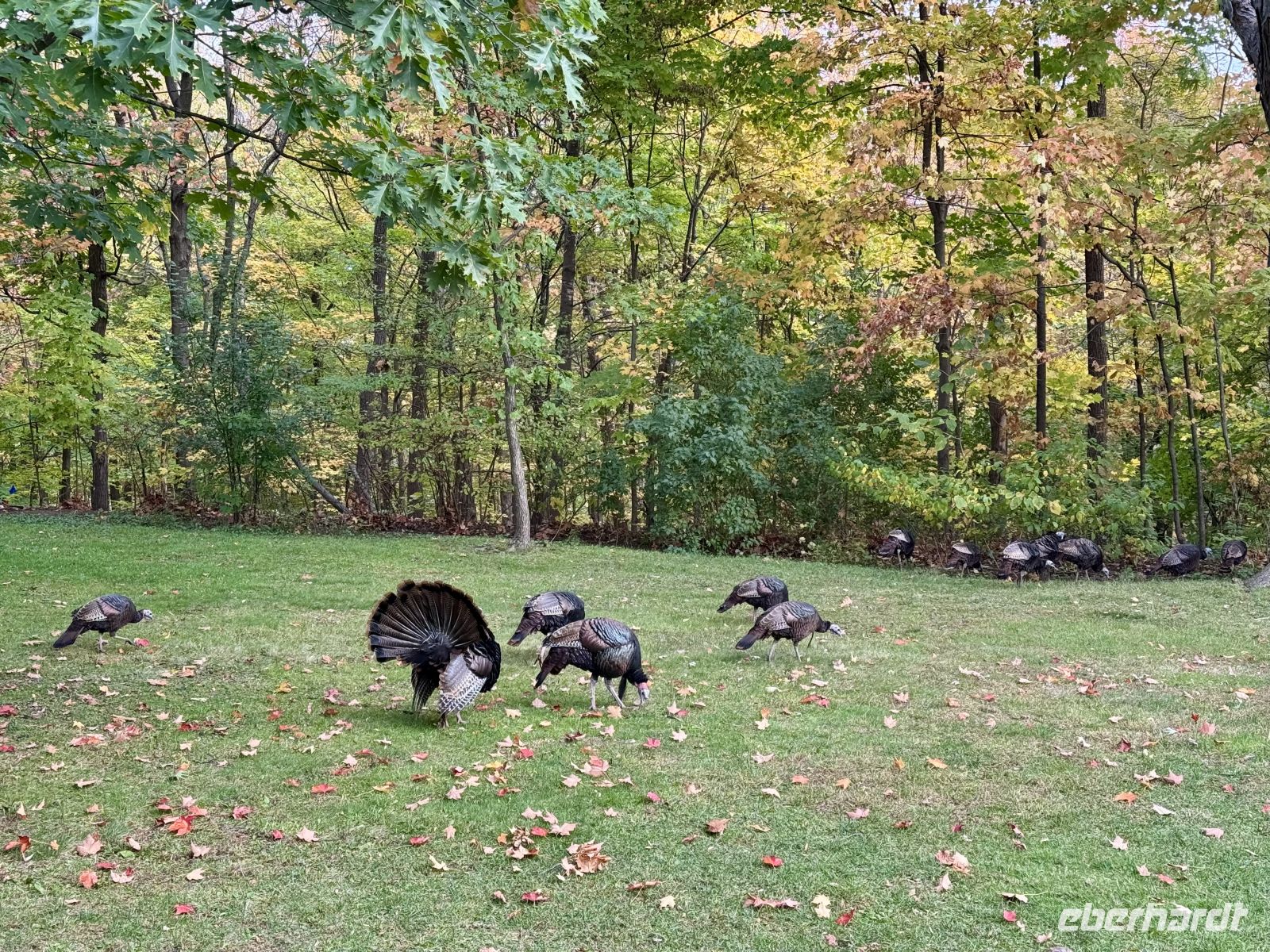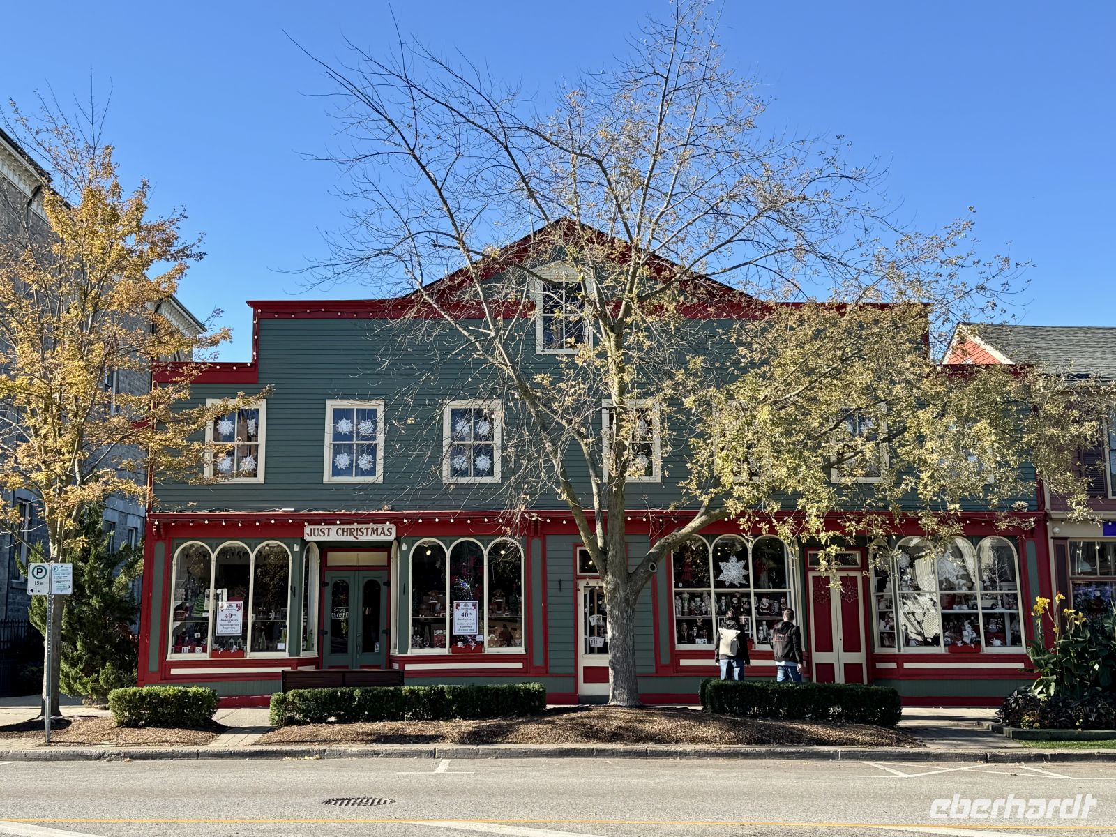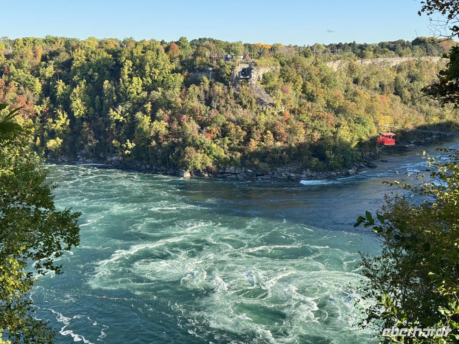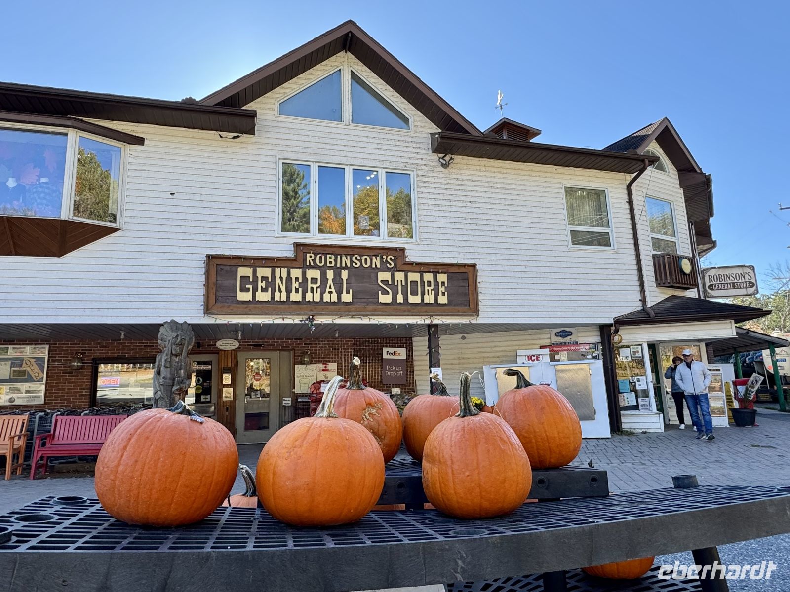 Nach den gestrigen Regenfällen ist das Wetter wieder komplett umgeschlagen. Für die nächsten Tage ist viel Sonne angesagt. Am Morgen werden wir bereits von einem herrlichen Sonnenaufgang geweckt. Für die nächsten Stunden bleiben wir noch in der Niagara-Region und folgen dem Fluss bis zum Lake Ontario. Nach einem Fotostopp am Whirlpool — einer scharfen Biegung des Niagara River mit Strudelbildung — gelangen wir in das kleine Örtchen Niagara-on-the-Lake. Es beeindruckt uns alle mit seinen hübschen Fassaden, gemütlichen Geschäften und vor allem mit der herrlichen Blumenpracht, die im Sonnenschein besonders gut zur Geltung kommt. Überall hängen Blumenampeln und die Straßen werden von prächtigen Beeten und Rabatten gesäumt. Gern hätten wir hier mehr Zeit zum Flanieren gehabt. Wie soll man sich denn in einer Stunde durch alle Eisläden durchtesten? Doch wir müssen in drei Stunden zum Mittagessen in Penetanguishene sein. Auf Jim wartet nun harte Arbeit. Vor allem die erste Strecke zurück um das Westende des Ontariosees bis zum Toronto Airport erfordert aufgrund des Verkehrsaufkommens stets höchste Konzentration. Sobald die Metropolregion Toronto hinter uns liegt, wird es für unseren netten Fahrer wesentlich entspannter. Die Landschaft wird ländlicher und auch hübscher fürs Auge. In Penetanguishene werden wir von einer sehr netten Kellnerin begrüßt und bewirtet. Ich muss nur schnell prüfen, ob wirklich alle ins richtige Etablissement gegangen sind, denn Jim musste den Bus direkt neben einem Cannabis-Geschäft parken. Sieht aber noch gut aus! Nach der Mittagspause beschäftigen wir uns intensiv mit der kolonialen Vergangenheit Kanadas und besuchen dazu das Freiluftmuseum „Sainte-Marie among the Hurons“, eine ehemalige Missionsstation französischer Jesuiten. Es ist immer wieder beeindruckend zu sehen, was sich jene Männer in kürzester Zeit fernab der Heimat aufgebaut haben – und nach etwa 10 Jahren wieder aufgeben mussten. Für die Wendat/Huronen hingegen war es der Beginn einer neuen Zeitrechnung, die auch viel Negatives brachte, vor allem tödliche Krankheiten. Viel Stoff zum Nachdenken, der uns während der Weiterfahrt nach Huntsville noch beschäftigt. Nach einem Stopp bei einem Supermarkt in Orillia erreichen wir bald die Muskoka-Region rund um Huntsville, in der uns der Indian Summer wieder einholt. Die Abendsonne bringt das bunte Laub regelrecht zum Glühen. Im Deerhurst Resort am Peninsula Lake nisten wir uns für die nächsten zwei Nächte ein. Jim darf (oder muss?) sogar in Sarkozys altem Zimmer einziehen.