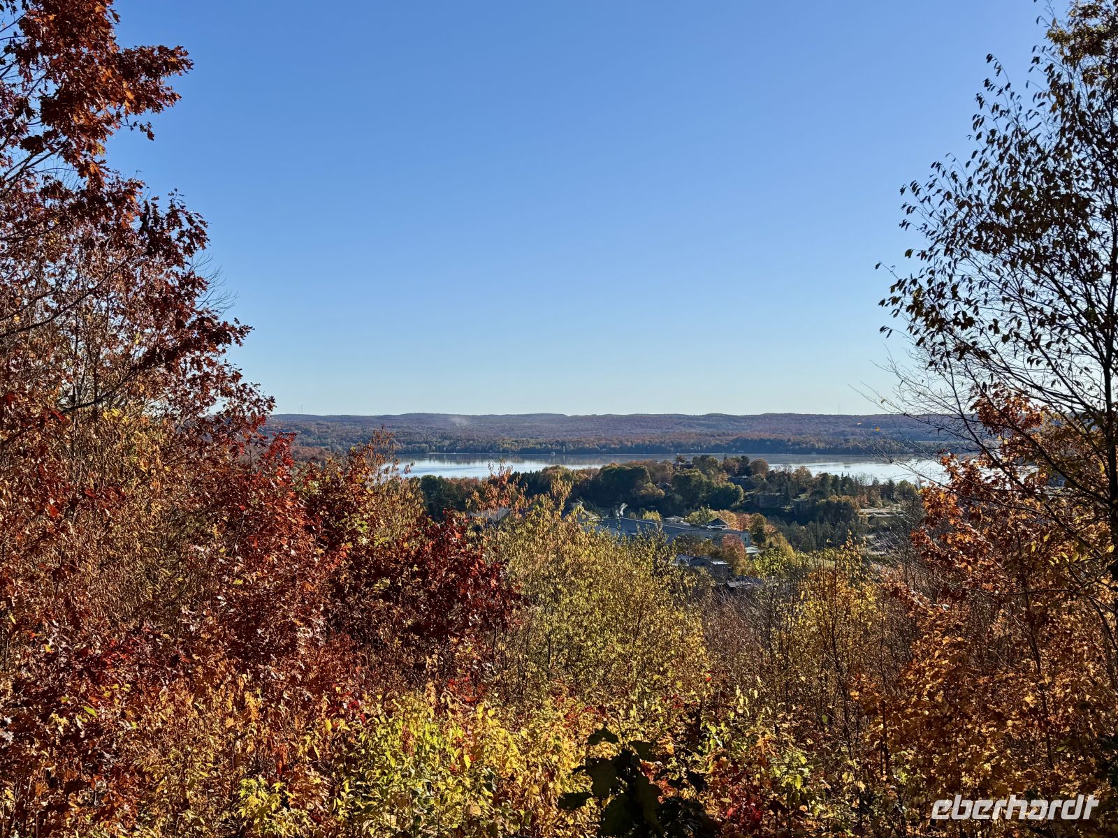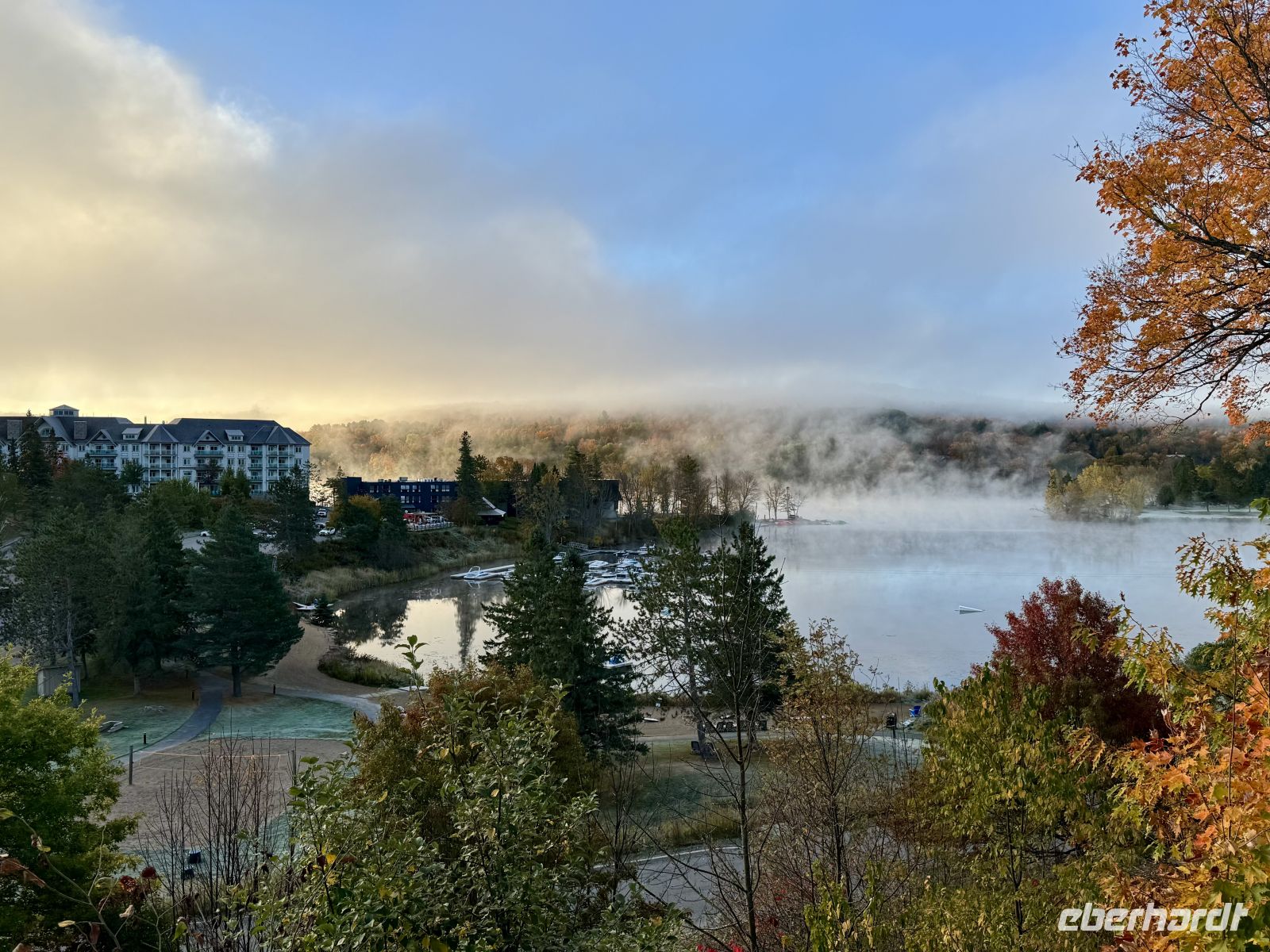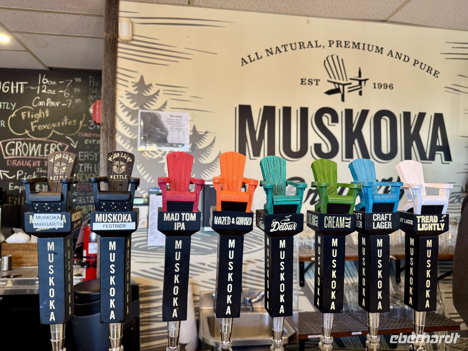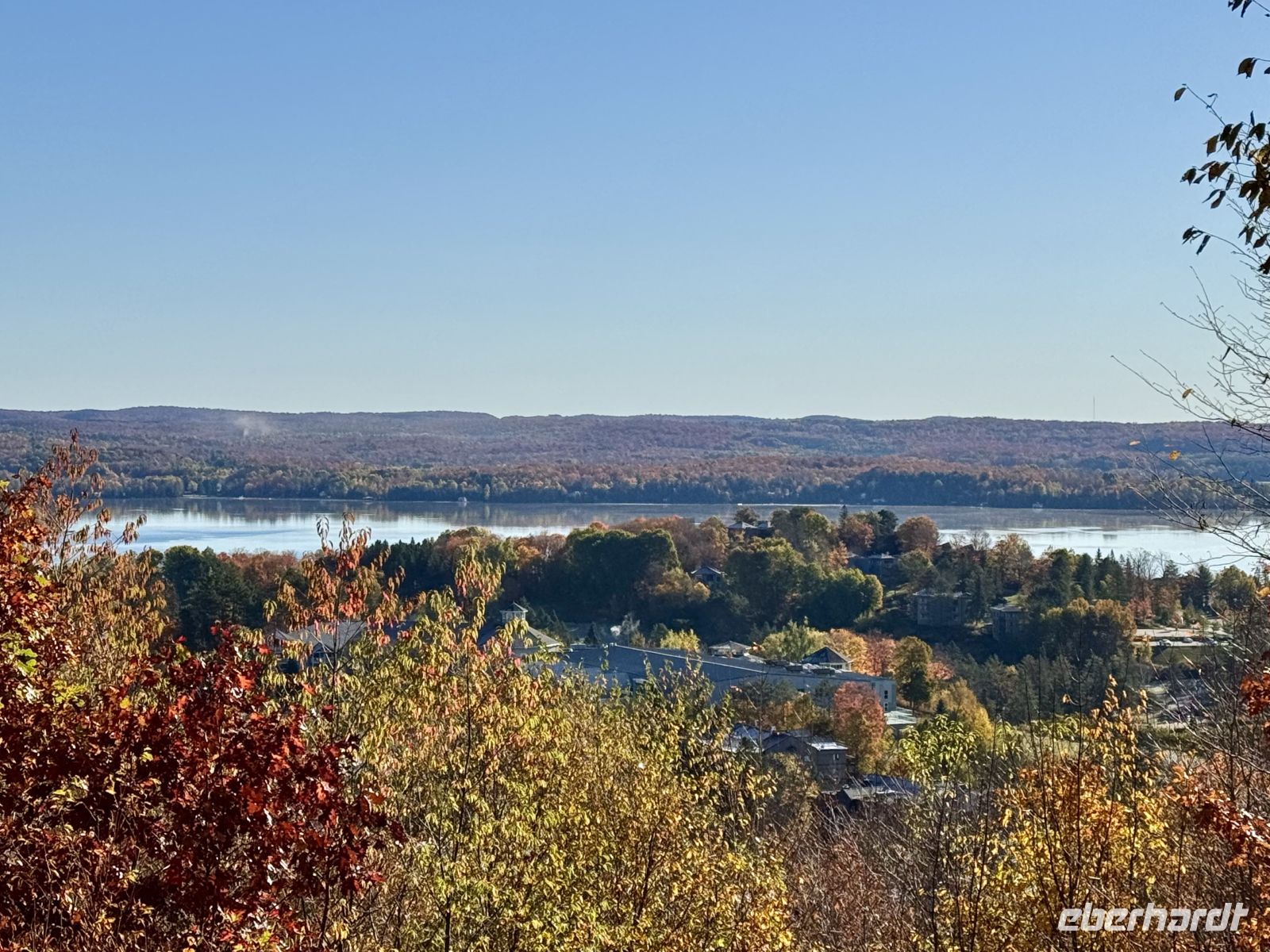 Während wir beim Frühstück sitzen, zieht noch der Morgennebel durchs Tal. Die Sonne wird langsam wach und sendet ihre goldenen Strahlen hinab. Ein Augenblick wie aus einem Märchenfilm. Bevor wir mit dem Bus zu unserer Erkundungstour durch die Muskoka-Region aufbrechen, mache ich mit meinen Gästen eine kleine Wanderung zu einem Aussichtspunkt, die mir das Hotel empfohlen hat. Wir bahnen uns unseren Weg durch das raschelnde Herbstlaub. Viele Bäume sind schon kahl. Der Indian Summer fällt dieses Jahr kurz aus; zu trocken war der richtige Sommer. Nach 15 Minuten ist der Aufstieg geschafft und wir können die gesamte Resort-Anlage überblicken. Unten wartet Jim geduldig mit unserem schicken neuen lila Reisebus auf uns. Wir bleiben heute in der Region rund um Huntsville und wollen die Landschaft und die Herbststimmung genießen. In Dorset machen wir einen kleinen Stopp am Lake of Bays (und besuchen zwei benachbarte Geschäfte mit verschiedenen Rauschmitteln) und in Gravenhurst halten wir zunächst am großen Supermarkt und decken uns für ein Picknick am See ein. Am Lake Muskoka setzen wir uns in die Sonne und lassen uns unsere Sandwiches und Cookies schmecken. Im Musikpavillon spielt parallel dazu eine Band. Das fühlt sich ja fast wie Urlaub an! Auch die Bootstour auf dem Lake Muskoka mit dem Dampfschiff-Nachbau am Nachmittag ist sehr entspannend. Wir sitzen wieder in der Sonne, ganz oben an Deck, während Landschaft und hübsche Häuser an uns vorüberziehen. Nach 1,5 Stunden müssen wir wieder an Land und treten die Rückfahrt zum Deerhurst Resort an. Allerdings hatte ich meinen Gästen noch den Besuch der Muskoka Brewery versprochen, wo wir verschiedene selbst gebraute Sorten der kleinen Craft-Beer-Brauerei verkosten können. Es gibt sogar Oktoberfestbier! Bis zum Abendessen können wir noch ein bisschen entspannen und um das Resort-Hotel spazieren gehen. Zum Dinner gibt es dann ein leckeres Menü, das den schönen, entspannten Erholungstag perfekt abrundet.