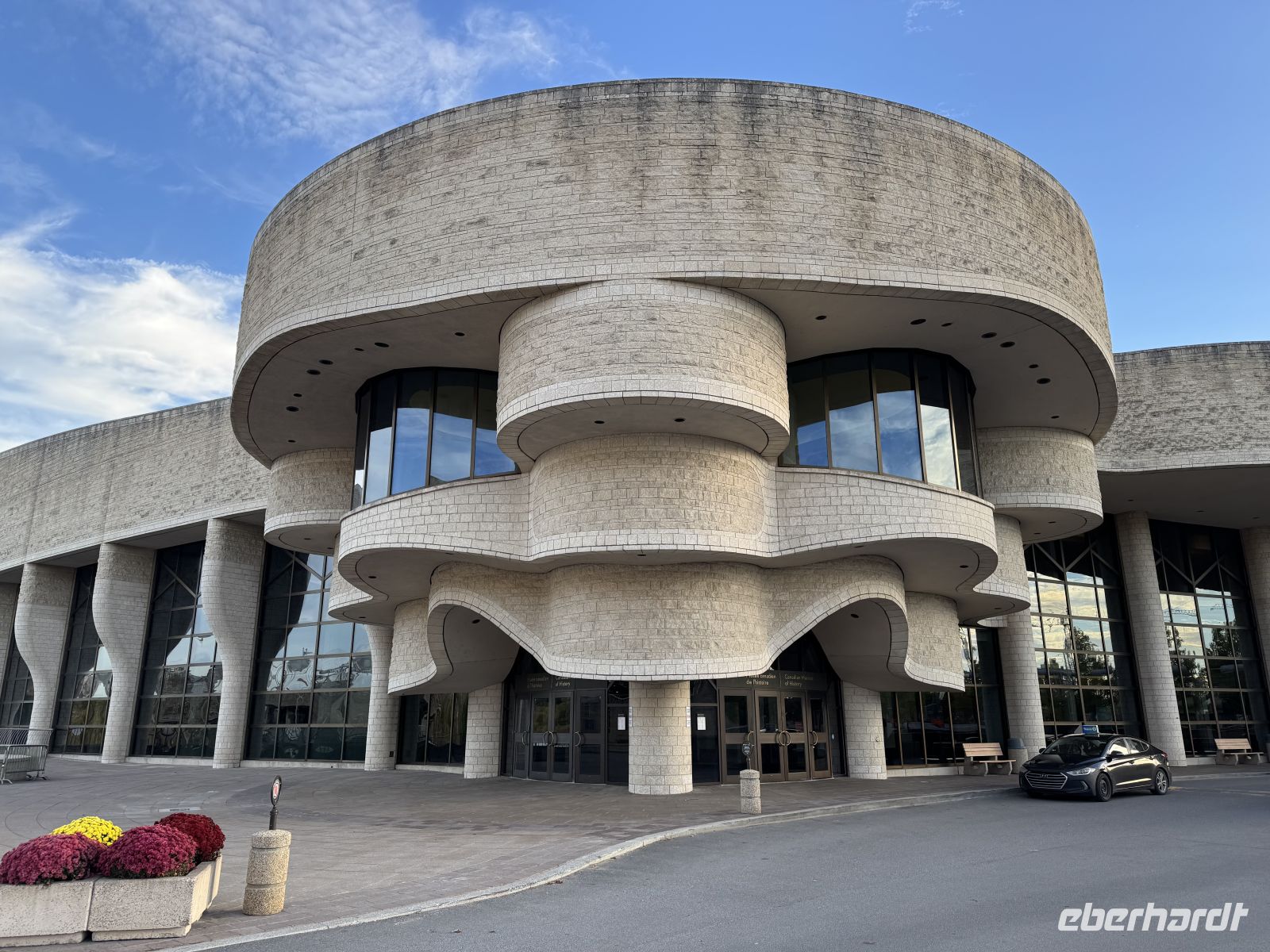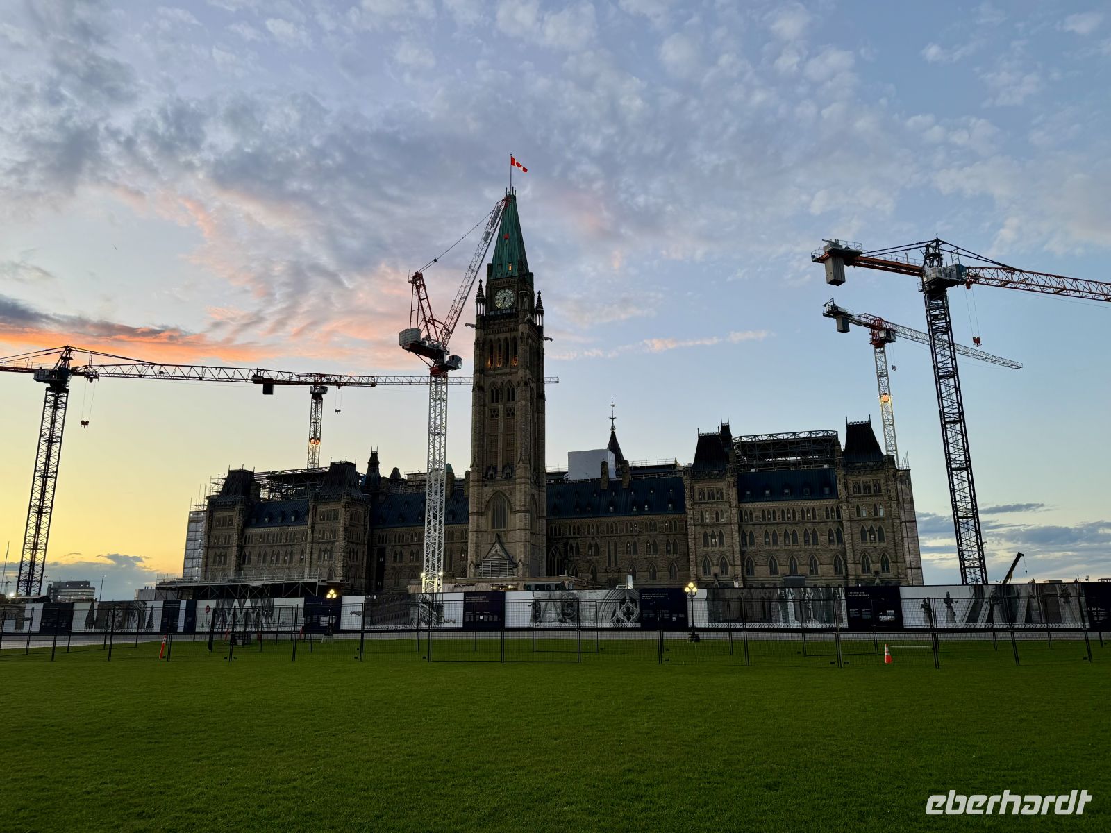 Zwei Tage konnten wir im Deerhurst Resort verschnaufen, doch nun müssen wir wieder die Koffer packen! Durch den Algonquin Park wollen wir heute bis in die kanadische Hauptstadt Ottawa fahren. Im Besucherzentrum des riesigen Parks erfahren wir mehr über die Landschaft, durch die wir schon eine ganze Weile gefahren sind. Ein kurzer Film führt uns mit wunderschönen Aufnahmen durch die Geschichte des Parks und zeigt uns das Leben seiner tierischen Bewohner durch die Jahreszeiten hinweg. Dann öffnet sich dramatisch die große Tür neben der Leinwand und wir dürfen die Aussichtsplattform betreten. Im Holzfällermuseum wartet wenig später schon die nächste Filmvorführung auf uns. Obwohl das Video ebenfalls auf Englisch ist, bekommen wir trotzdem ganz gut mit, wie beschwerlich das Leben der ersten Holzfäller Mitte des 19. Jahrhunderts war. Und selbst hundert Jahre später sah es noch nicht sehr viel luxuriöser aus. Fast die Hälfte aller arbeitsfähigen Männer war anfangs in der Holzindustrie beschäftigt. Wie sehr haben sich doch die Zeiten geändert! Der Spaziergang auf dem „Logging Trail“ lässt uns nicht nur frische Luft schnappen, sondern führt uns an vielen interessanten Exponaten vorbei, die den Film anschaulich ergänzen. Mit vielen neuen Eindrücken setzen wir unsere Reise fort. Für unsere Mittagspause habe ich uns Tische im Schnitzelhaus in Eganville reserviert. Allerdings bestellen meine Gäste mehrheitlich kein Schnitzel, sondern probieren ein Smoked Meat Sandwich – eigentlich eine Spezialität aus Montréal. Und da zieht es uns ja später auch noch hin. Doch dazwischen liegt ja immer noch die Hauptstadt, die wir nach weiteren 1,5 Stunden Fahrt erreichen. Doch halt! Genau genommen machen wir unseren ersten Stopp nicht in Ottawa, sondern in der Schwesterstadt Gatineau auf der anderen Seite des Ottawa River. Und die liegt schon in der Provinz Québec. Bonjour! Das Beste an Gatineau? Ok, das ist das Nationalmuseum für Geschichte, ein wirklich interessantes Gebäude. Aber das Zweitbeste? Der Blick nach Ottawa! Ha! Wie auf einer Perlenkette aufgereiht sehen wir vom Aussichtspunkt aus die wichtigsten Sehenswürdigkeiten, die die Hauptstadt zu bieten hat: Nationale Kunstgalerie, Château Laurier, Rideau-Kanal, Parlament mit Bibliothek, Supreme Court und Nationalarchiv. Und das Wetter spielt auch weiterhin mit, obgleich es schon etwas frisch geworden ist außerhalb des Busses. Deshalb klettern wir doch wieder zurück zu Jim in den Bus, fahren erstmal ins Hotel und ziehen uns dann schön warm an für einen Abendspaziergang zum Parlamentshügel, Kanal und Fairmont-Hotel. Mit Einbruch der Dämmerung wird auch alles schön beleuchtet. Insgesamt erscheint uns die Hauptstadt aber fast ein wenig verschlafen im Vergleich zu Toronto. Alles geht gemütlich zu – und auch wir verabschieden uns allmählich voneinander für einen gemütlichen Abend in kleiner Runde bei einem Bier oder leichten Dinner.