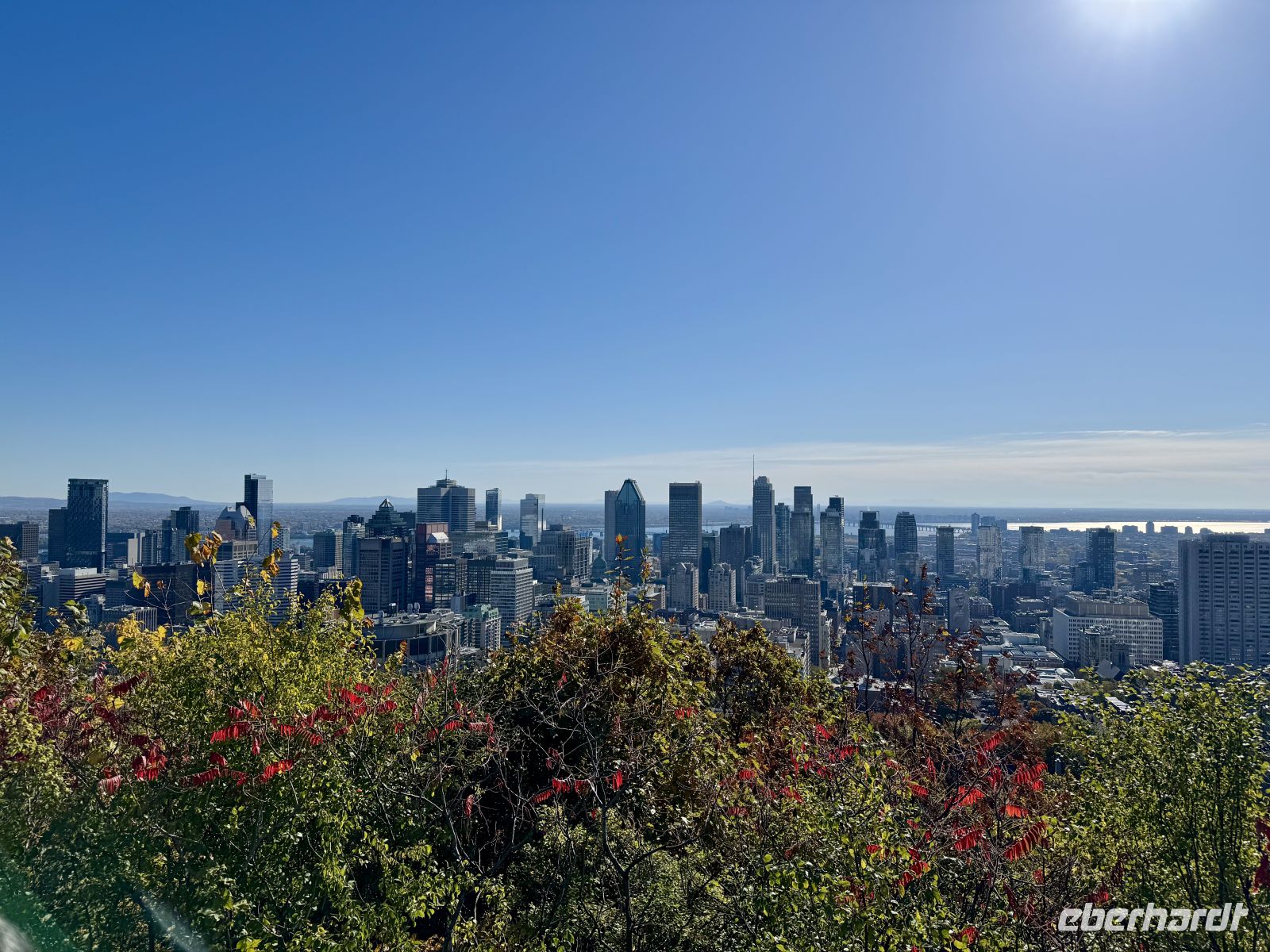 An unserem letzten Tag in Kanada haben wir noch einmal viel Sonne — und auch Freizeit am Vormittag, um sie bei einem Spaziergang durch die Altstadt zu genießen. Wir können Parlament und Château Frontenac noch einmal bei blauem Himmel fotografieren und finden vielleicht noch ein Souvenir (z. B. eine Flasche Zauberwasser). Um 11 Uhr müssen wir dann die Zimmer verlassen und die Fahrt nach Montréal antreten. Die letzte Fahrt mit Jim. Sie führt uns auf den Trans-Canada Highway auf der Südseite des Sankt-Lorenz-Stroms. Hier herrscht noch richtig schöner Indian Summer und wir können uns an den prächtigen Farben erfreuen. Einschließlich der eingeplanten Mittagspause an einer Raststätte erreichen wir den Flughafen Pierre-Elliott Trudeau in Montréal trotz großem Stau zeitlich ungefähr so wie geplant — den kanadischen Busspuren sei Dank. Zum Glück haben wir für die Verabschiedung von Jim am Flughafen nicht viel Zeit, sonst wären mir noch die Tränen gekommen. Er war ein wirklich guter Fahrer und angenehmer Geselle. Auch von unseren Koffern müssen wir uns nun schnell verabschieden und sie sogar selber aufs Band legen. Bei Air Canada wurde schon alles durchautomatisiert. Die Wartezeit bis zum Abflug vergeht dann recht schnell, auch weil wir sie schon für die vorsorgliche Verabschiedung voneinander nutzen. In Frankfurt werden sich unsere Wege schnell trennen. Das Abendessen nach dem Start finde ich erstaunlich lecker …
