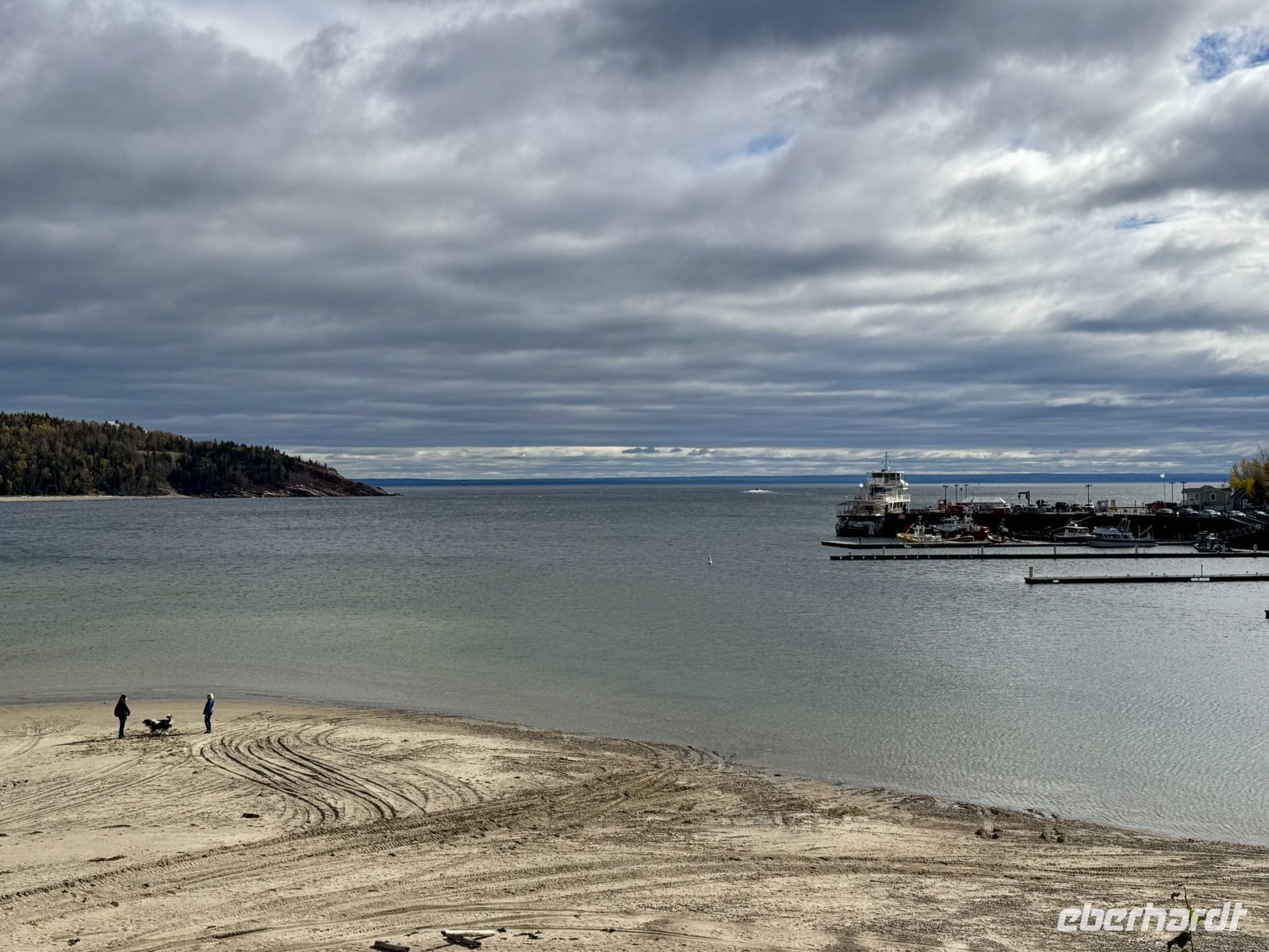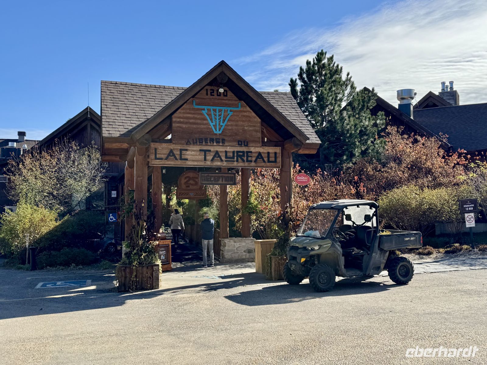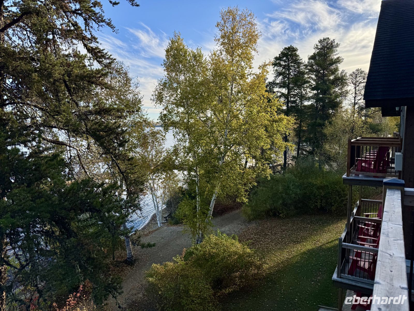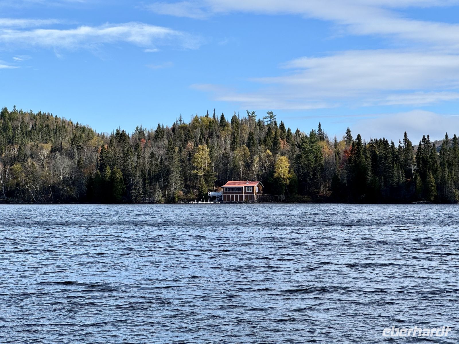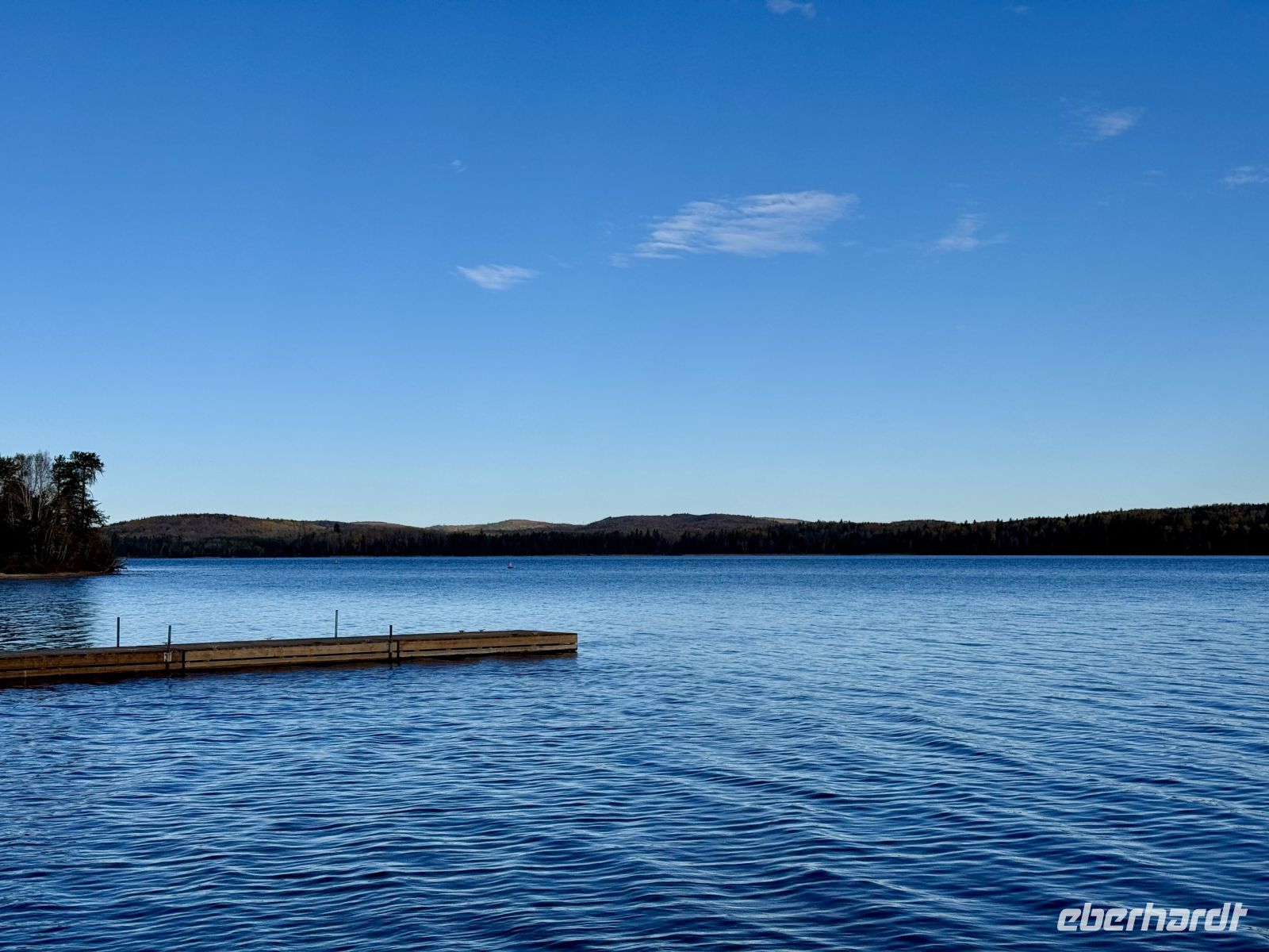 Nach zwei Tagen in Großstädten steht heute Erholung in der Natur auf dem Programm. Außerdem starten wir ganz entspannt in den Tag und kosten das tolle Frühstücksbuffet mit Omelett-Station so richtig aus — bis einfach nichts mehr reingeht. Nur vielleicht noch ein kleines Pain au Chocolat? Oder zwei? Die anderen Hotelgäste checken nach dem Frühstück aus, sodass wir das Resort-Hotel am Lac Taureau ab Mittag wirklich ganz für uns haben. Wer möchte, kann sich mir am späten Vormittag für einen Spaziergang/eine kleine Wanderung durch den herrlichen Herbstwald anschließen. An Tieren sehen wir leider nur Eichhörnchen, die sich aber von uns nicht stören lassen und uns neugierig vom Ast aus beäugen. Familie Biber traut sich jedoch nicht vor die Tür. Oder sind sie schon wieder umgezogen? Ihr neues Domizil, das sie sich in den letzten Jahren erbaut haben, liegt jedenfalls trocken. Für unser gemeinsames Picknick treffen wir uns im Bistro-Bereich und verspeisen genüsslich unsere mitgebrachten Snacks und Sandwiches. Für den „Nachtisch“ müssen wir jedoch das Gebäude verlassen und uns am Strand zu einem konspirativen Treffen verabreden. Dort stoßen wir mit kanadischem Whisky mit Ahornsirup auf unser allgemeines Wetterglück und die nette Reisegesellschaft an. Den Nachmittag können wir dann im Schwimmbecken, Whirlpool oder in der Sauna verbringen. Oder wir gehen nochmal spazieren. Auch das zweite Abendessen im urigen Speisesaal ist wieder sehr lecker. Und da wir jetzt wirklich ganz alleine sind, geht auch alles ein bisschen flotter. Unser Kellner ist zudem sehr aufmerksam und gut organisiert. Warum können wir eigentlich nicht noch einen Tag verlängern?
