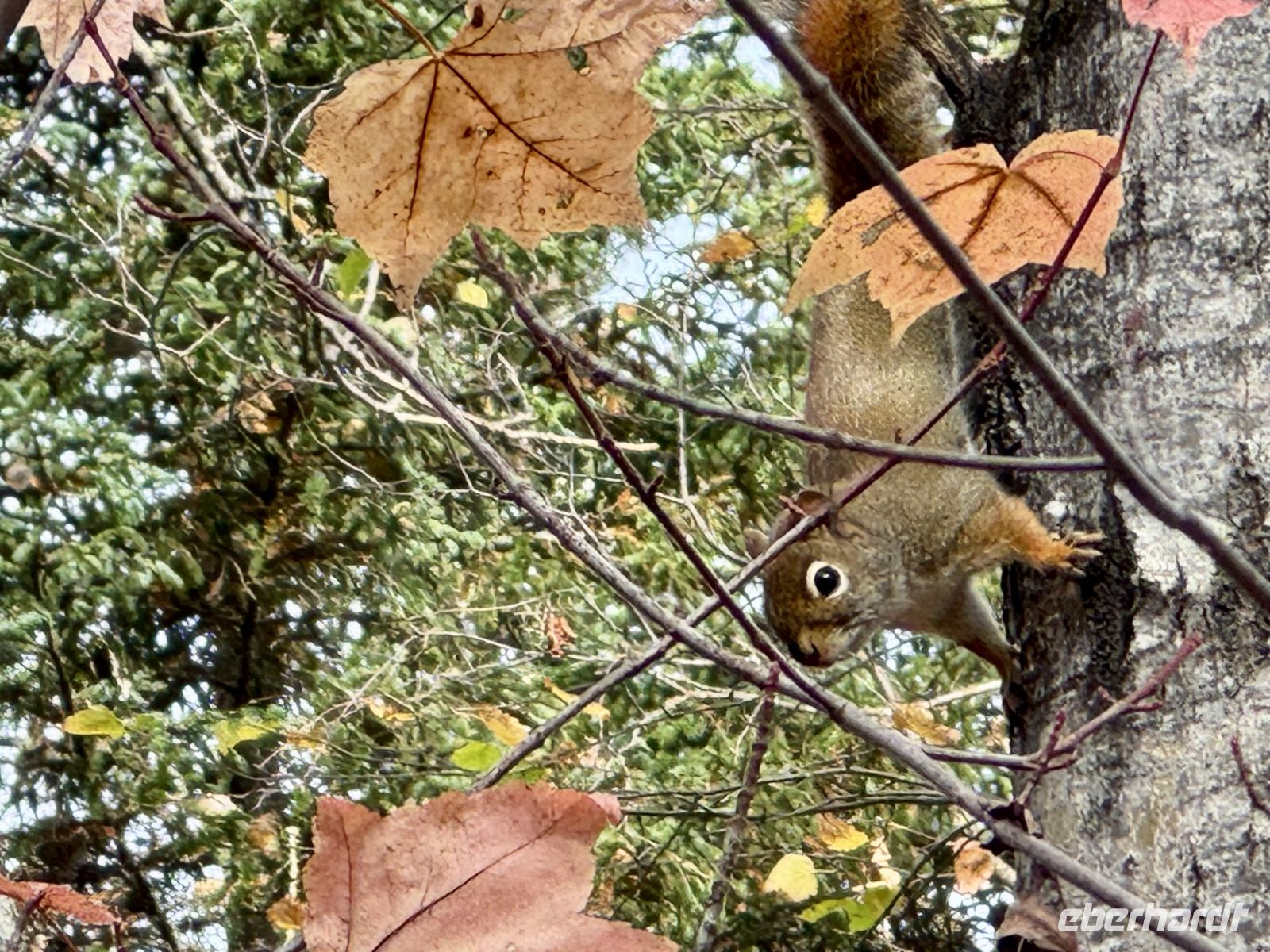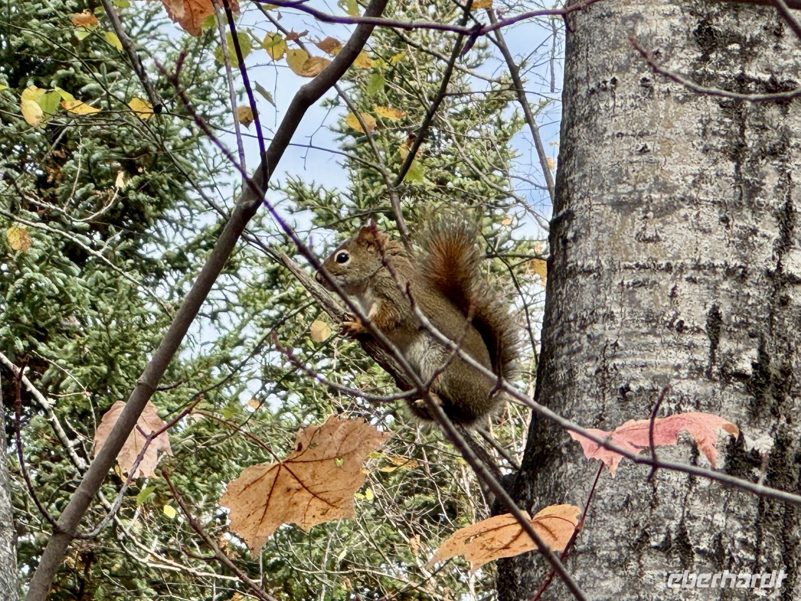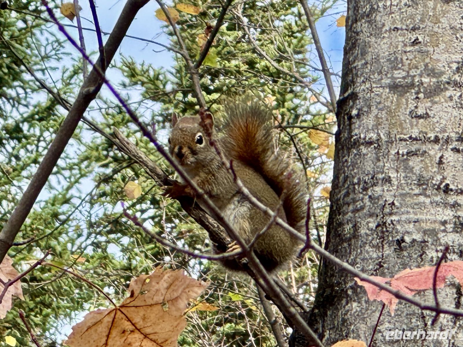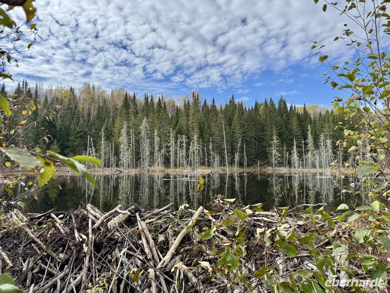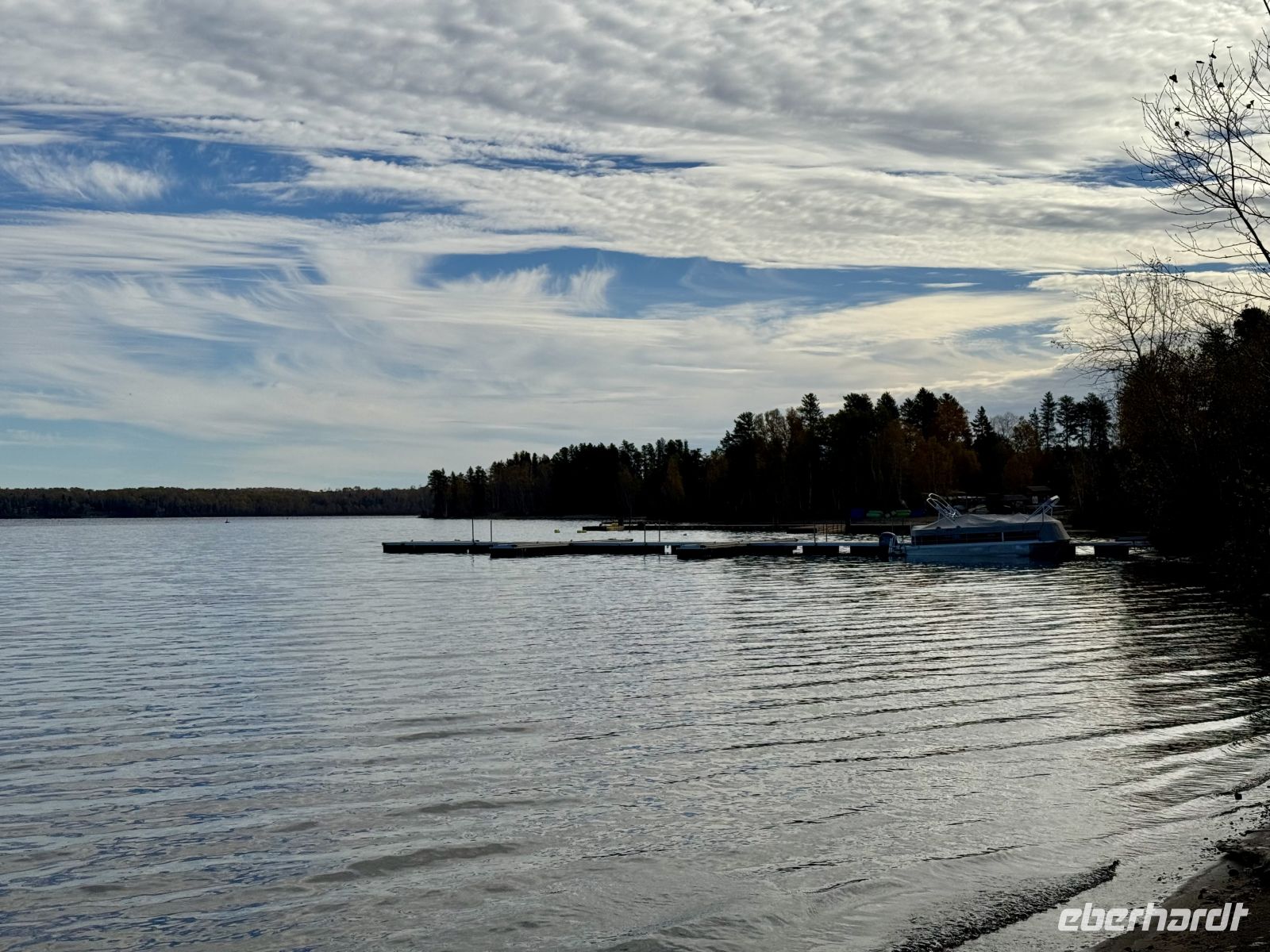Nach zwei Tagen in Großstädten steht heute Erholung in der Natur auf dem Programm. Außerdem starten wir ganz entspannt in den Tag und kosten das tolle Frühstücksbuffet mit Omelett-Station so richtig aus — bis einfach nichts mehr reingeht. Nur vielleicht noch ein kleines Pain au Chocolat? Oder zwei? Die anderen Hotelgäste checken nach dem Frühstück aus, sodass wir das Resort-Hotel am Lac Taureau ab Mittag wirklich ganz für uns haben. Wer möchte, kann sich mir am späten Vormittag für einen Spaziergang/eine kleine Wanderung durch den herrlichen Herbstwald anschließen. An Tieren sehen wir leider nur Eichhörnchen, die sich aber von uns nicht stören lassen und uns neugierig vom Ast aus beäugen. Familie Biber traut sich jedoch nicht vor die Tür. Oder sind sie schon wieder umgezogen? Ihr neues Domizil, das sie sich in den letzten Jahren erbaut haben, liegt jedenfalls trocken. Für unser gemeinsames Picknick treffen wir uns im Bistro-Bereich und verspeisen genüsslich unsere mitgebrachten Snacks und Sandwiches. Für den „Nachtisch“ müssen wir jedoch das Gebäude verlassen und uns am Strand zu einem konspirativen Treffen verabreden. Dort stoßen wir mit kanadischem Whisky mit Ahornsirup auf unser allgemeines Wetterglück und die nette Reisegesellschaft an. Den Nachmittag können wir dann im Schwimmbecken, Whirlpool oder in der Sauna verbringen. Oder wir gehen nochmal spazieren. Auch das zweite Abendessen im urigen Speisesaal ist wieder sehr lecker. Und da wir jetzt wirklich ganz alleine sind, geht auch alles ein bisschen flotter. Unser Kellner ist zudem sehr aufmerksam und gut organisiert. Warum können wir eigentlich nicht noch einen Tag verlängern?