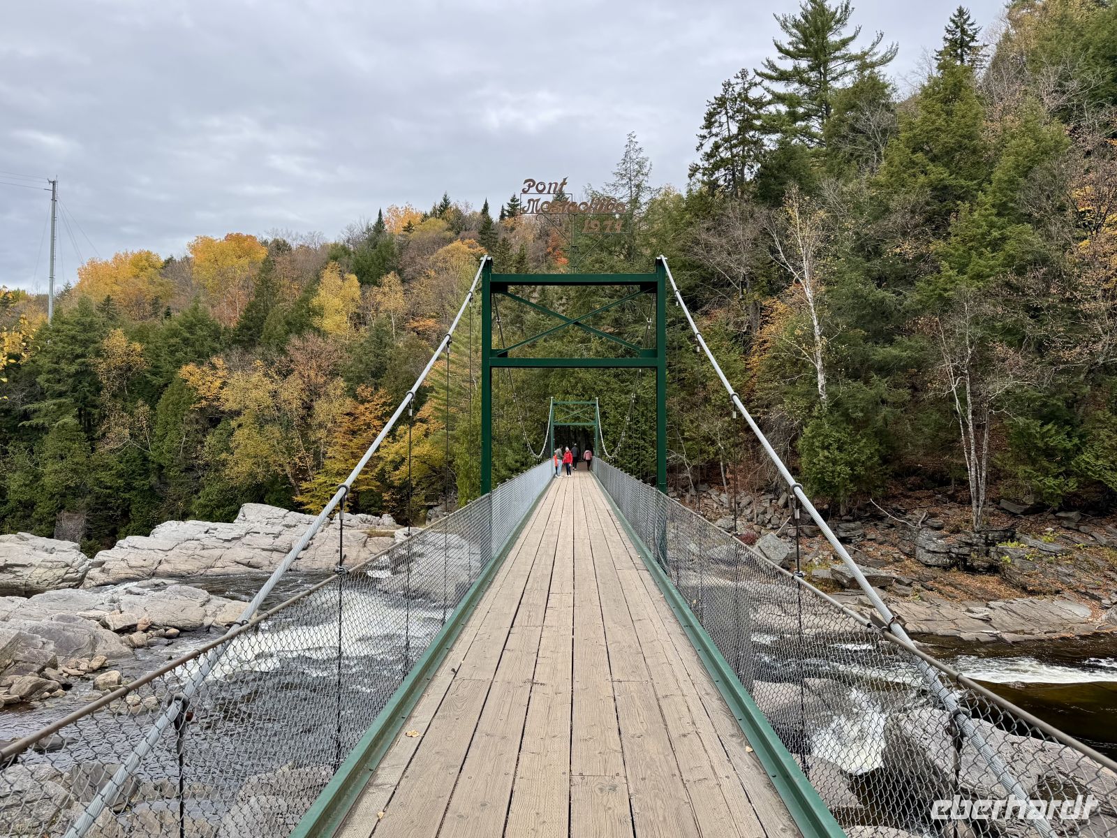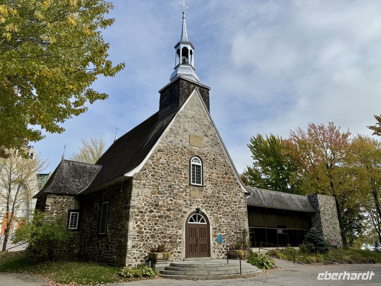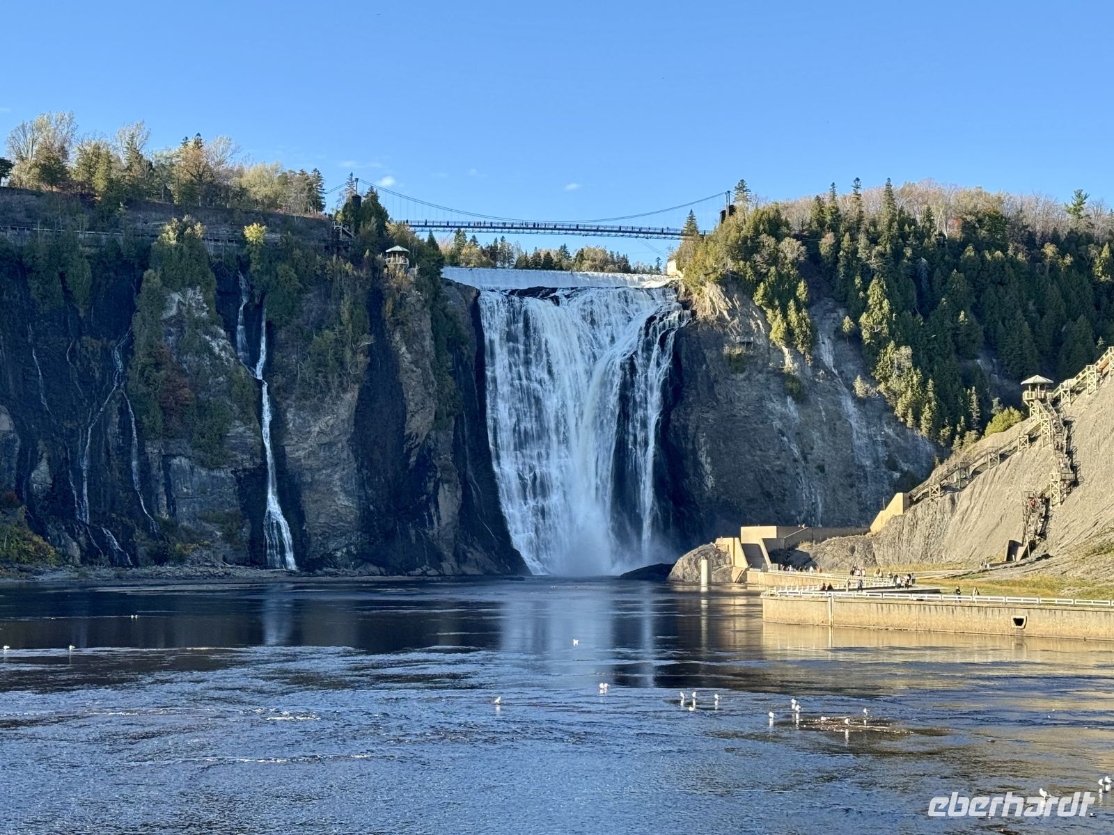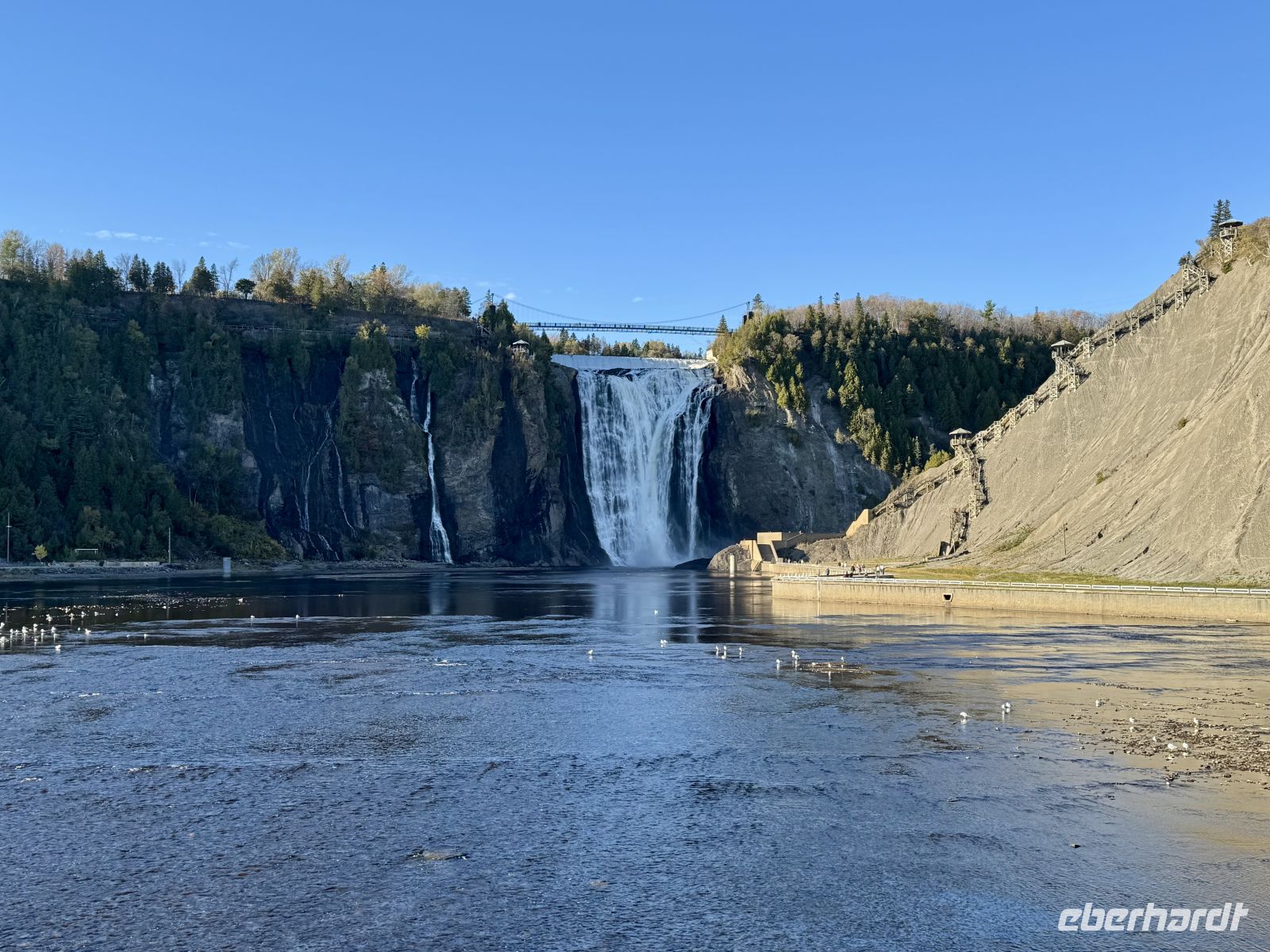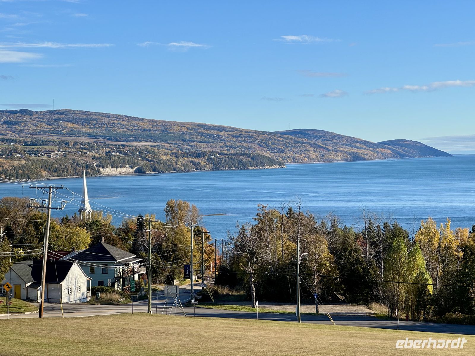 Das zweite und letzte Frühstück am Lac Taureau in diesem schönen Speiseraum müssen wir noch einmal richtig genießen und zelebrieren. Das tut offenbar auch unsere Kellnerin, die heute den Kaffee serviert, denn sie ist unheimlich gut gelaunt. Ob nach uns noch jemand kommt bis zum Winter? Durch die schöne Herbstlandschaft und hübsche kleine Dörfer mit romantischen Kirchen und schon ordentlich Halloween-Deko fährt uns Jim zum nächsten Ziel: Tim Hortons! Eigentlich wollte ich erst die nächste Filiale 15 km weiter nehmen, doch offenbar war sein Verlangen nach einem Double Double so groß, dass er gleich hier angehalten hat. Von der beliebtesten kanadischen Kaffeekette wechseln wir anschließend elegant das Thema und beschäftigen uns intensiv mit der Produktion von Ahornsirup. Wir sind nämlich dieses Jahr Versuchskaninchen und dürfen/sollen eine (zumindest für Eberhardt TRAVEL) neue Zuckerhütte testen. Wir bekommen erst eine anschauliche Erklärung zur Herstellung und werden dann zum großen Mahl geladen, das traditionell für die vielen fleißigen Erntehelfer gedacht wäre. Zum Nachtisch gibt es – natürlich – Pancakes mit Ahornsirup. Östlich von Trois-Rivières können wir 20 Minuten später am Sanctuaire Notre-Dame du Cap am Sankt-Lorenz-Strom wenigstens ein paar Kalorien ablaufen und ganz viele aufgekratzte Eichhörnchen beobachten. Auf dem Chemin du Roy, dem alten Königsweg, setzen wir die Reise fort und suchen uns wieder jeder ein nettes Häuschen am Wasser aus. Später wechseln wir jedoch auf den großen Highway und nähern uns nun zügig Québec. Die Hauptstadt der Provinz heben wir uns jedoch mit Absicht ganz zum Schluss auf und halten erstmal nur in einem Vorort, um die Montmorency-Wasserfälle zu besuchen. Das Wetter ist jetzt wieder richtig traumhaft und wir genießen die Abendsonne, bevor wir zur letzten Etappe starten. Noch 1,5 Stunden quer durch die reizvolle Charlevoix-Region bis La Malbaie, dann haben wir unser vorletztes Hotel erreicht. Es bietet uns ebenfalls einen tollen Blick aufs Wasser und überzeugt mit seiner sehr guten frankokanadischen Küche. Wie wäre es zum Beispiel mit Schnecken als Vorspeise, Entenbrust in Portweinsoße als Hauptgericht und Zitronentarte als Dessert?