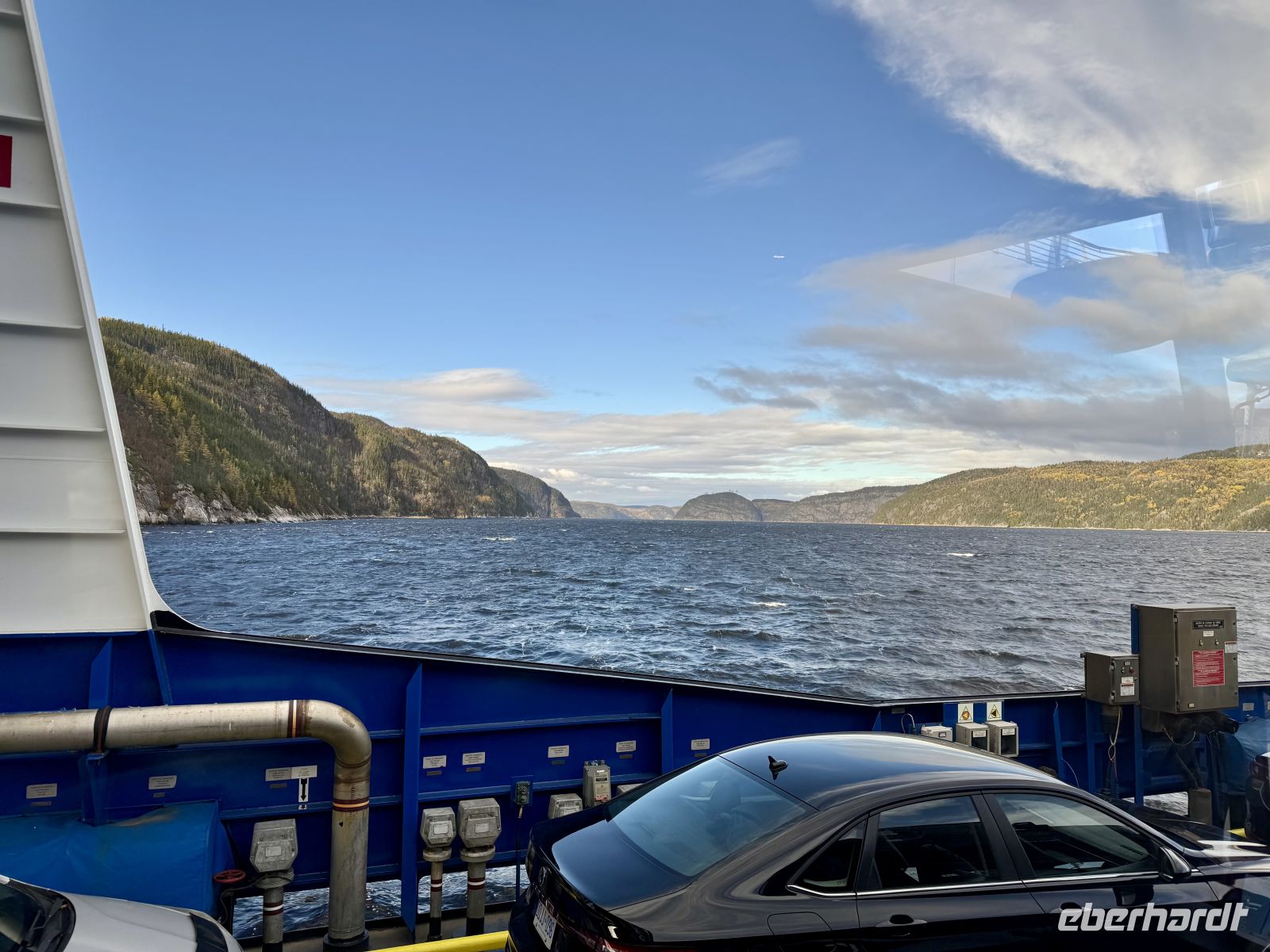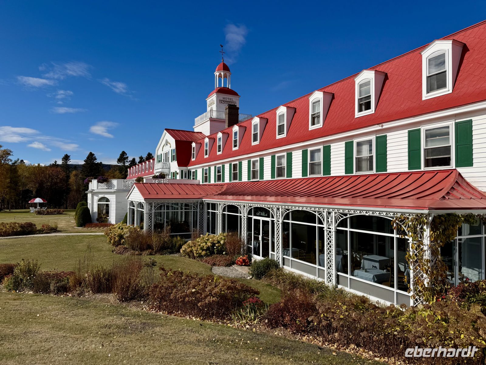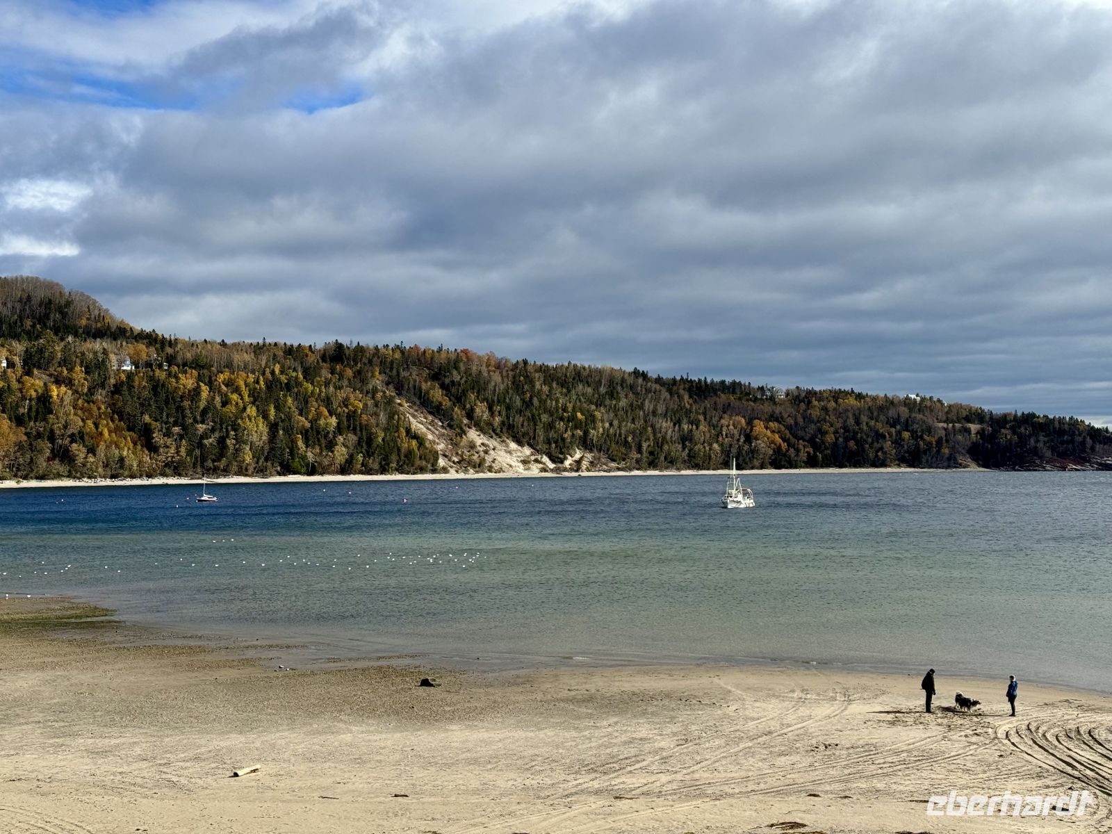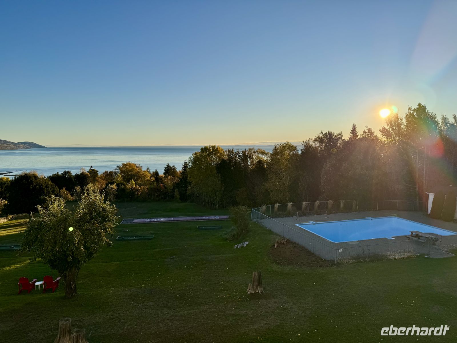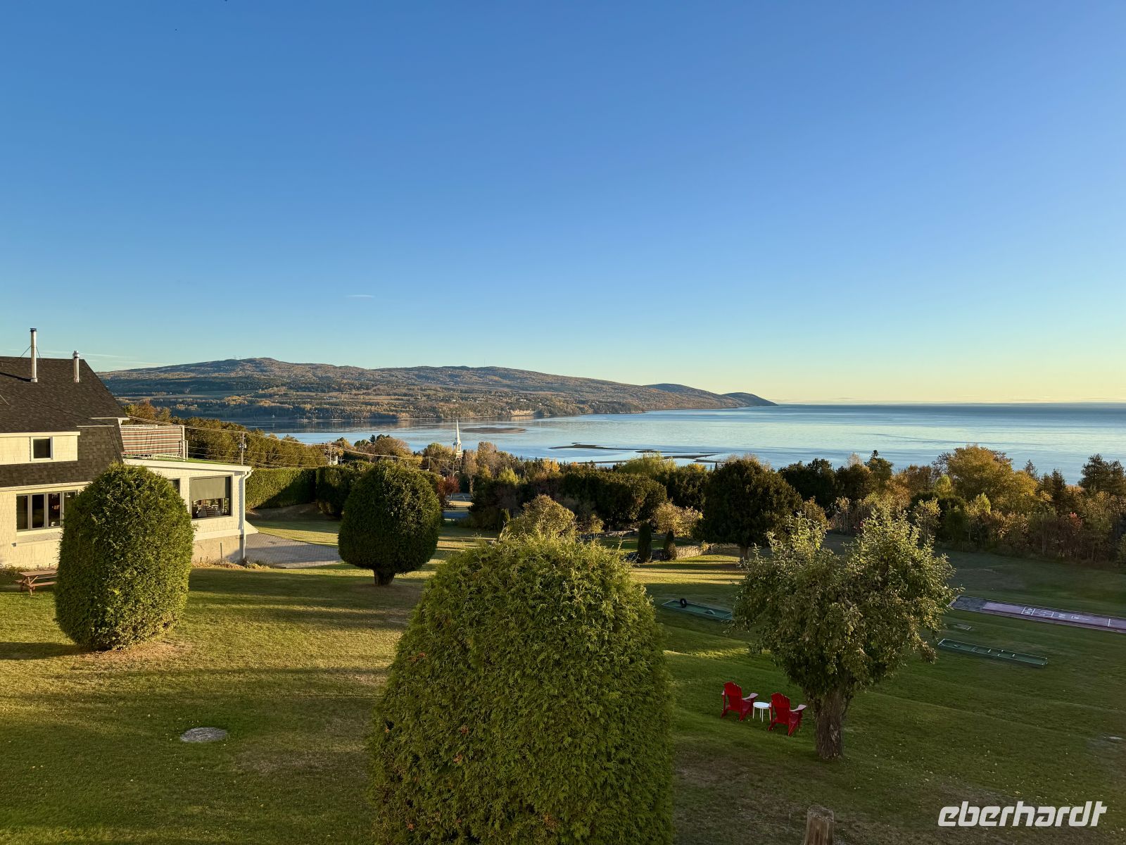 Ein wunderschöner Sonnenaufgang lässt uns motiviert aus den Betten hüpfen und anschließend wieder im gemütlichen Restaurant zum Frühstück einfinden. Dabei sind wir hin- und hergerissen zwischen Buffet und Aussicht. Der zehnte Tag unserer Rundreise durch Ost-Kanada steht dann ganz im Zeichen der Wale, die im Sankt-Lorenz-Strom leben. Deshalb fahren wir noch ein Stück weiter gen Osten bis nach Tadoussac. Unterwegs machen wir einen Fotostopp an einem See und setzen mit der Fähre über den Saguenay-Fjord über. Obwohl wir nur etwa 70–80 km von La Malbaie entfernt sind, ist es in Tadoussac deutlich kühler und windiger. Aber Tadoussac ist auch ein geschichtsträchtiger Ort, denn mit dem ersten permanenten Handelsposten begann hier 1600 die französische Besiedelung. Zudem gibt es nebenan ein schönes altes Resort-Hotel zu fotografieren. Im Museum für Meeressäugetiere können wir uns nicht nur aufwärmen, sondern einem sehr guten interaktiven Vortrag von Camille über das Sozialleben der Belugas lauschen, die ganzjährig im Strom und Fjord leben. Wir wechseln in die große Halle nebenan und betrachten beeindruckt die Walskelette, zu denen es auch wieder Geschichten zu hören gibt. Am Nachmittag versuchen wir dann selbst unser Glück bei einer dreistündigen Walbeobachtung auf dem Sankt-Lorenz-Strom. Die Ausbeute bleibt allerdings recht mager, auch wenn alle drei möglichen Spezies vereinzelt gesichtet werden: Finnwale, Zwergwale und Belugas. Wer erfolgreich sein will, braucht jedoch außen an Deck warme Kleidung und viel Geduld. Ich selbst sichte (unter den Augen von Zeugen) einen Finnwal und zwei Belugas. Die Zwergwale verpasse ich jedoch knapp. Insgesamt gab es schon bessere Jahre, aber auch schlechtere. Einen Finnwal zu sehen, dazu gehört schon großes Glück. Jim wartet — geduldig wie immer — mit dem Bus am Ausstiegspunkt auf uns und fährt uns nach La Malbaie zurück. Kurz vor unserem Hotel biegen wir zum Château Richelieu und zum benachbarten Casino ab, denn auch in La Malbaie gibt es ein Eisenbahnhotel, in dem 2018 sogar schon Macron, Trump und Merkel nächtigten. Wir jedoch sind auch mit unserer Auberge sehr zufrieden. Vor allem das Essen ist immer sehr gut — und mit sogar vier Gängen mehr als ausreichend. Wer rollt mich jetzt zurück auf mein Zimmer?