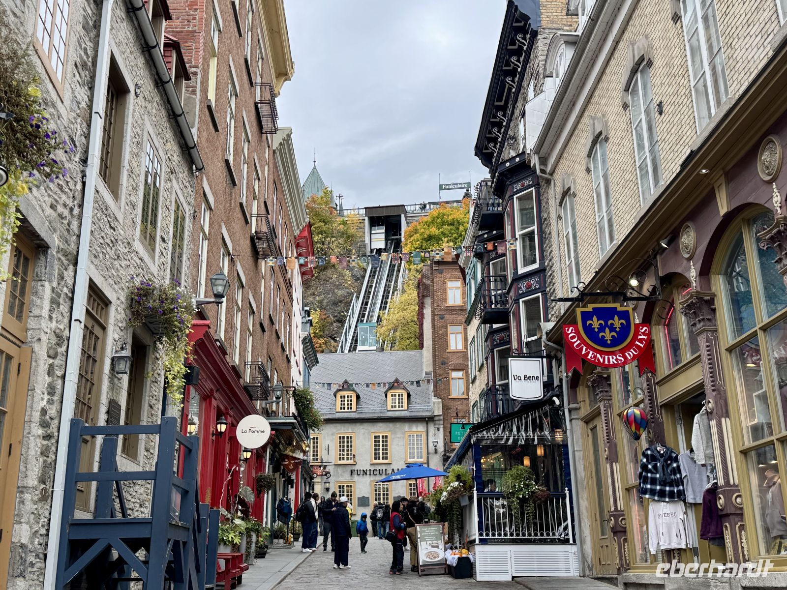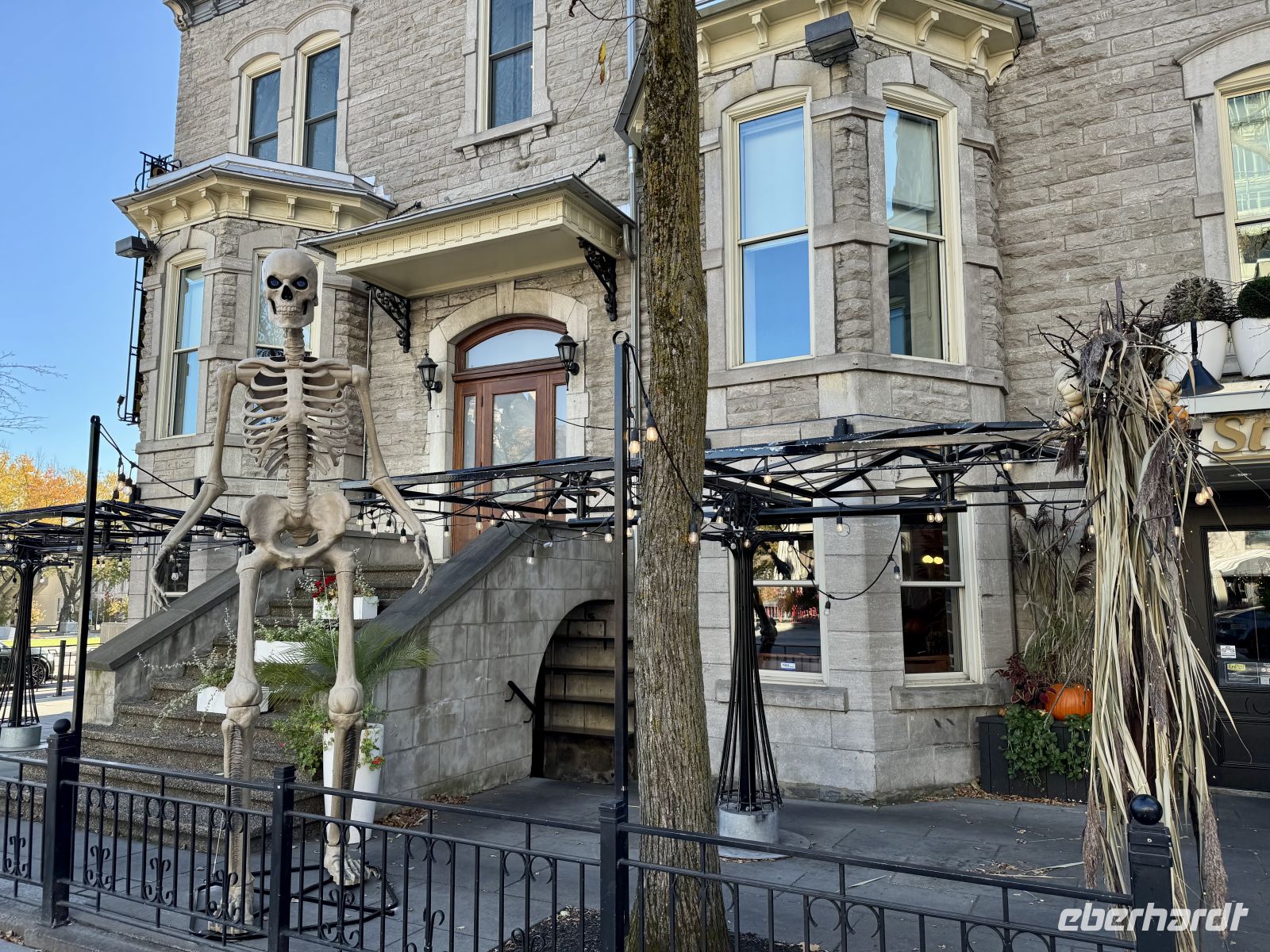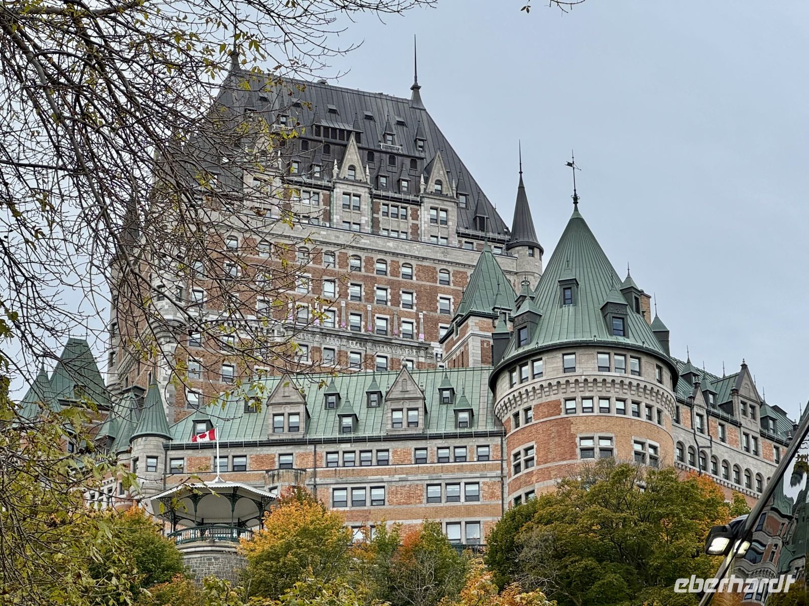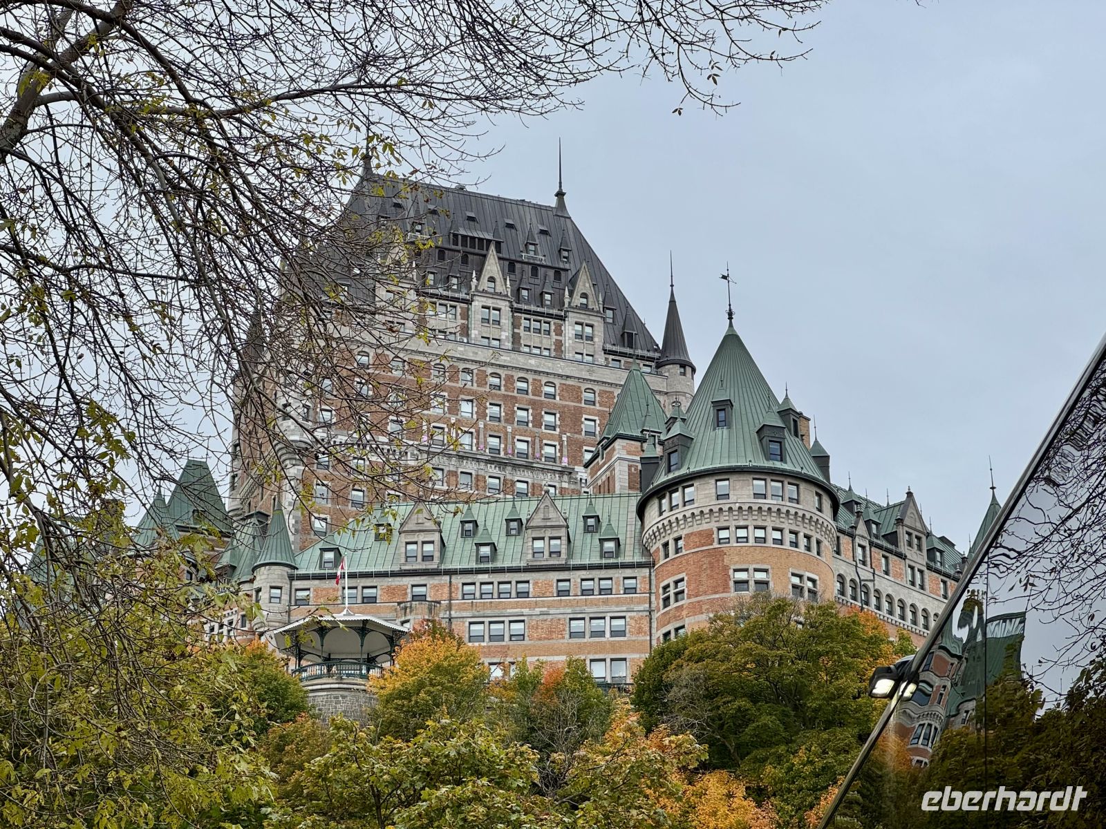 Mit Québec wartet heute das letzte große Ziel dieser Reise auf uns. Die älteste Stadt Kanadas haben wir uns mit Absicht bis zum Schluss aufgehoben. Durch den Charlevoix-Krater fahren wir also am Morgen zurück in Richtung Westen. Diesmal nehmen wir allerdings die Route entlang des Sankt-Lorenz-Stroms. Es ist ein bisschen wie eine Achterbahnfahrt, nur deutlich langsamer. Kurz nach 10 Uhr haben wir dann den Canyon Sainte-Anne erreicht. Hier erwartet uns ein schöner Spaziergang zum Wasserfall sowie eine Zipline, von der meine Gäste reichlich Gebrauch machen. Auch die benachbarte Basilika in Beaupré ist der Heiligen Anna geweiht. Ein beeindruckender Bau, der nächstes Jahr sein 100-jähriges Jubiläum feiert. Die Mosaike an der Decke erzählen die Lebens- und Leidensgeschichte der Mutter von Maria. Für viele Katholiken weltweit ist die Kirche ein wichtiger Wallfahrtsort. Und damit leite ich fließend über zur Stadt Québec, denn die ist wiederum als älteste Stadt Kanadas und UNESCO-Weltkulturerbe ein Pilgerort für unzählige Touristen aus der ganzen Welt — völlig zu Recht. Auch wir erliegen sofort dem Charme der alten Häuser und engen Gassen in der unteren Altstadt, blicken ehrfürchtig zum Château Frontenac hinauf. Und das, obwohl wir zunächst nur Freizeit und Mittagspause haben, und die eigentliche Stadtrundfahrt mit Nadia am Nachmittag noch vor uns liegt. Glücklicherweise liegt nur ein kleineres Kreuzfahrtschiff im Hafen und es ist vergleichsweise wenig los. Auf der anderen Seite ist es schade, dass der Sonne ausgerechnet heute vorübergehend die Kraft ausgeht. Es ist zwar trocken, aber bewölkt. Aber wir wollen uns nicht zu sehr beschweren, denn insgesamt hatten wir ja großes Glück mit dem Wetter. Auch mit Nadia arbeite ich schon viele Jahre zusammen. Die gebürtige Moskauerin ist mit einem Franzosen verheiratet und lebt auch schon fast 20 Jahre in Québec. Trotz ihrer Herkunft haben sie die Winter in Kanada überrascht. Ein Kapitel, das immer wieder zur Sprache kommt, während wir mit ihr von der Batterie Royale zum Sonnenkönig ziehen, daneben das riesige Fresko bewundern und einen Abstecher in die Rue du Petit-Champlain wagen. Den Aufstieg in die Oberstadt über die Halsbrechertreppe erspart uns Nadia freundlicherweise. Ich rufe Jim herbei und wir fahren mit dem Bus zum sehr eleganten Parlamentsgebäude knapp außerhalb der Stadtmauer. Am majestätischen Eisenbahnhotel gewährt uns die Stadtverwaltung nur 10 Minuten Halt, was immerhin für ein paar Fotos reicht. Schließlich zeigt uns Nadia noch die Plains of Abraham, das zum riesigen Stadtpark umgewidmete Schlachtfeld. Unser Hotel liegt quasi direkt daneben an der Grande Allée, weshalb auch die Altstadt zu Fuß gut zu erreichen ist. Wer möchte, kann also vor dem Abschiedsabendessen z. B. noch einen Spaziergang zum Château Frontenac unternehmen. Auch unser Restaurant liegt in der oberen Altstadt, im Herzen von Québec. Auch heute bekommen wir wieder vier Gänge serviert, sodass wir mit den gefüllten Windbeuteln zum Dessert ganz schön zu kämpfen haben. Aber es wäre schade um die ganze Schokoladensoße … Wer nun noch Muße hat, dem empfehle ich einen Abstecher zur beleuchteten Halloween-Dekoration am Rathaus und zum Fairmont-Hotel. Den Großteil der Gruppe begleite ich aber zum Hotel zurück, denn es ist spät und auch ganz schön kalt geworden. Winter is coming.