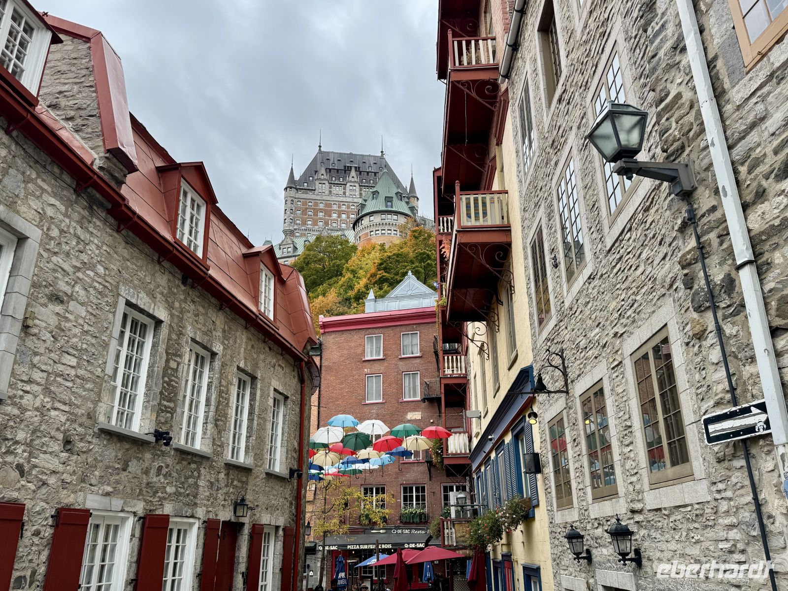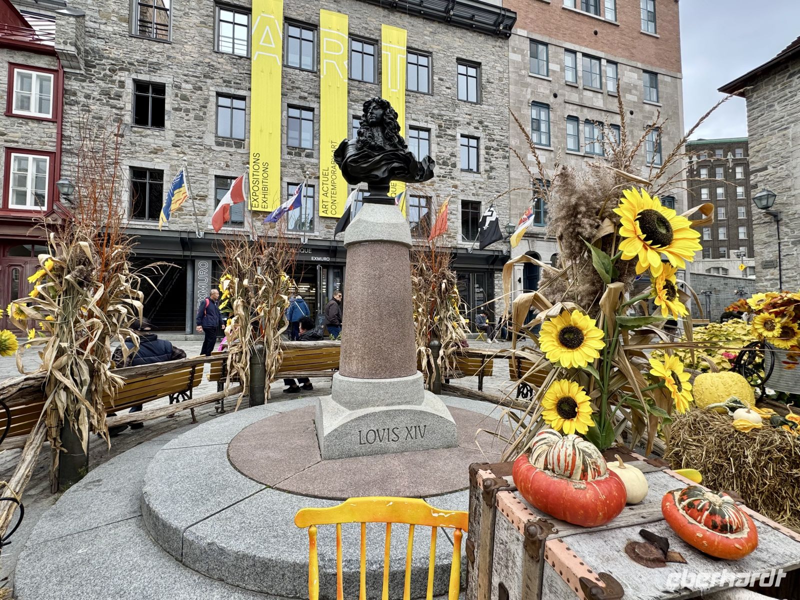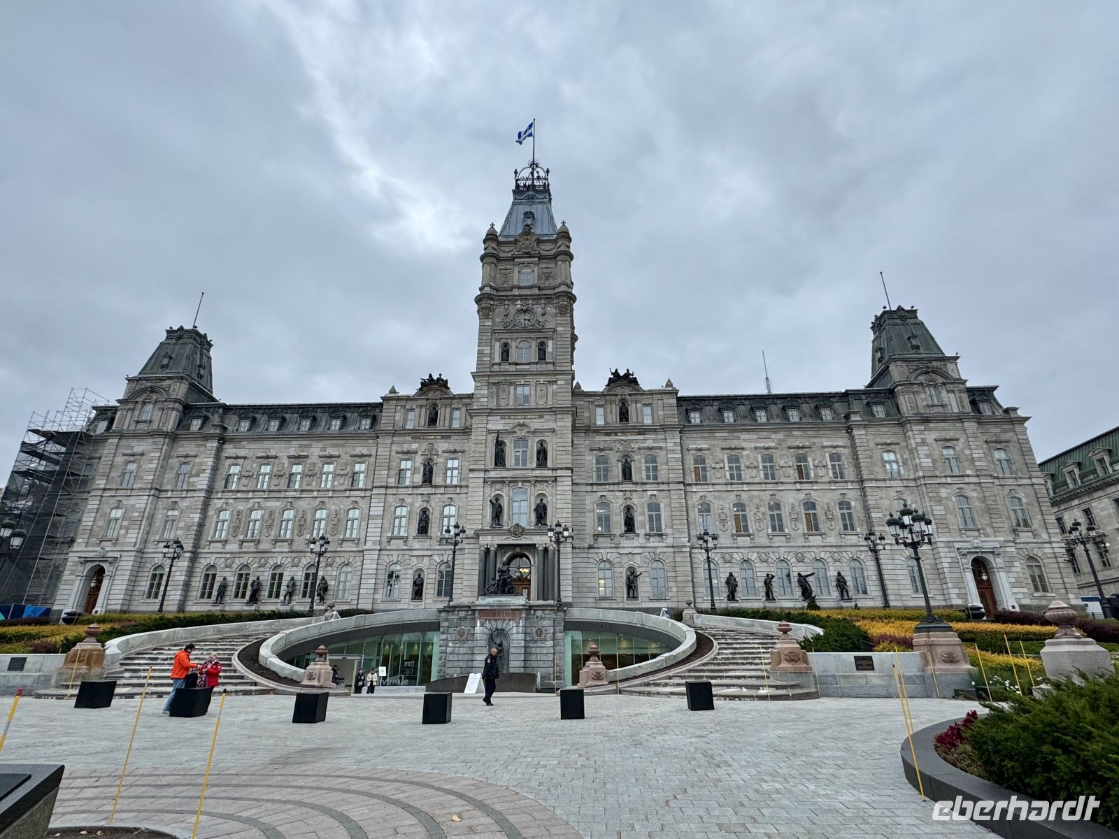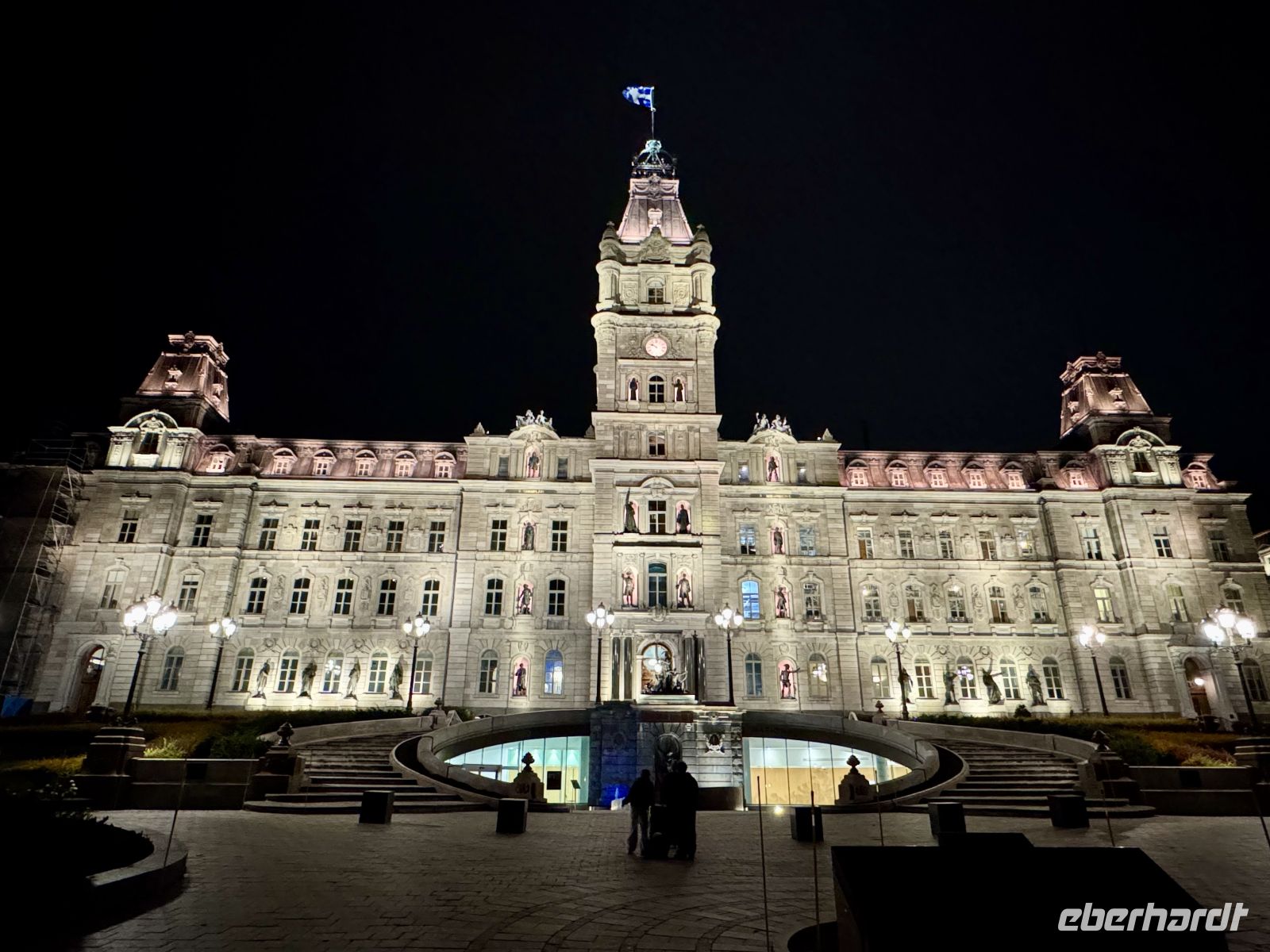 Mit Québec wartet heute das letzte große Ziel dieser Reise auf uns. Die älteste Stadt Kanadas haben wir uns mit Absicht bis zum Schluss aufgehoben. Durch den Charlevoix-Krater fahren wir also am Morgen zurück in Richtung Westen. Diesmal nehmen wir allerdings die Route entlang des Sankt-Lorenz-Stroms. Es ist ein bisschen wie eine Achterbahnfahrt, nur deutlich langsamer. Kurz nach 10 Uhr haben wir dann den Canyon Sainte-Anne erreicht. Hier erwartet uns ein schöner Spaziergang zum Wasserfall sowie eine Zipline, von der meine Gäste reichlich Gebrauch machen. Auch die benachbarte Basilika in Beaupré ist der Heiligen Anna geweiht. Ein beeindruckender Bau, der nächstes Jahr sein 100-jähriges Jubiläum feiert. Die Mosaike an der Decke erzählen die Lebens- und Leidensgeschichte der Mutter von Maria. Für viele Katholiken weltweit ist die Kirche ein wichtiger Wallfahrtsort. Und damit leite ich fließend über zur Stadt Québec, denn die ist wiederum als älteste Stadt Kanadas und UNESCO-Weltkulturerbe ein Pilgerort für unzählige Touristen aus der ganzen Welt — völlig zu Recht. Auch wir erliegen sofort dem Charme der alten Häuser und engen Gassen in der unteren Altstadt, blicken ehrfürchtig zum Château Frontenac hinauf. Und das, obwohl wir zunächst nur Freizeit und Mittagspause haben, und die eigentliche Stadtrundfahrt mit Nadia am Nachmittag noch vor uns liegt. Glücklicherweise liegt nur ein kleineres Kreuzfahrtschiff im Hafen und es ist vergleichsweise wenig los. Auf der anderen Seite ist es schade, dass der Sonne ausgerechnet heute vorübergehend die Kraft ausgeht. Es ist zwar trocken, aber bewölkt. Aber wir wollen uns nicht zu sehr beschweren, denn insgesamt hatten wir ja großes Glück mit dem Wetter. Auch mit Nadia arbeite ich schon viele Jahre zusammen. Die gebürtige Moskauerin ist mit einem Franzosen verheiratet und lebt auch schon fast 20 Jahre in Québec. Trotz ihrer Herkunft haben sie die Winter in Kanada überrascht. Ein Kapitel, das immer wieder zur Sprache kommt, während wir mit ihr von der Batterie Royale zum Sonnenkönig ziehen, daneben das riesige Fresko bewundern und einen Abstecher in die Rue du Petit-Champlain wagen. Den Aufstieg in die Oberstadt über die Halsbrechertreppe erspart uns Nadia freundlicherweise. Ich rufe Jim herbei und wir fahren mit dem Bus zum sehr eleganten Parlamentsgebäude knapp außerhalb der Stadtmauer. Am majestätischen Eisenbahnhotel gewährt uns die Stadtverwaltung nur 10 Minuten Halt, was immerhin für ein paar Fotos reicht. Schließlich zeigt uns Nadia noch die Plains of Abraham, das zum riesigen Stadtpark umgewidmete Schlachtfeld. Unser Hotel liegt quasi direkt daneben an der Grande Allée, weshalb auch die Altstadt zu Fuß gut zu erreichen ist. Wer möchte, kann also vor dem Abschiedsabendessen z. B. noch einen Spaziergang zum Château Frontenac unternehmen. Auch unser Restaurant liegt in der oberen Altstadt, im Herzen von Québec. Auch heute bekommen wir wieder vier Gänge serviert, sodass wir mit den gefüllten Windbeuteln zum Dessert ganz schön zu kämpfen haben. Aber es wäre schade um die ganze Schokoladensoße … Wer nun noch Muße hat, dem empfehle ich einen Abstecher zur beleuchteten Halloween-Dekoration am Rathaus und zum Fairmont-Hotel. Den Großteil der Gruppe begleite ich aber zum Hotel zurück, denn es ist spät und auch ganz schön kalt geworden. Winter is coming.