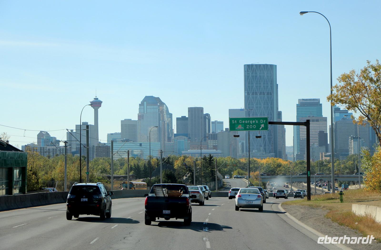 Die Fahrt zum Hotel in Calgary dauert etwa 30 bis 40 Minuten und wir erhalten einen ersten Eindruck von der Stadt. Wir beziehen unsere Hotelzimmer und nutzen die Zeit vor dem Abendessen für einen kleinen Spaziergang zum Prince's Island Park, einem kleinen Park auf einer Insel im Bow-Fluss. In der Abendsonne haben wir von hier einen schönen Blick auf die Skyline von Calgary.