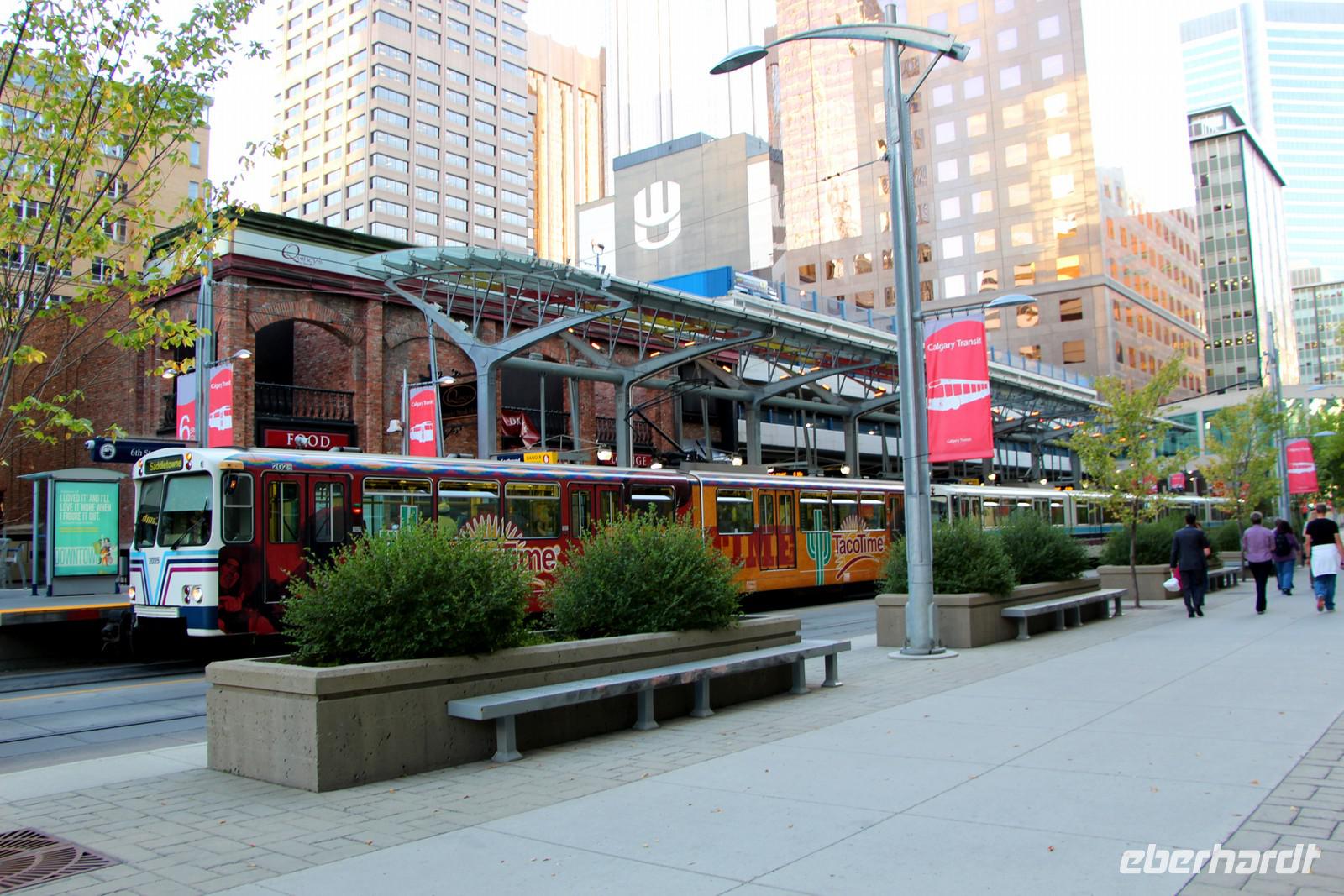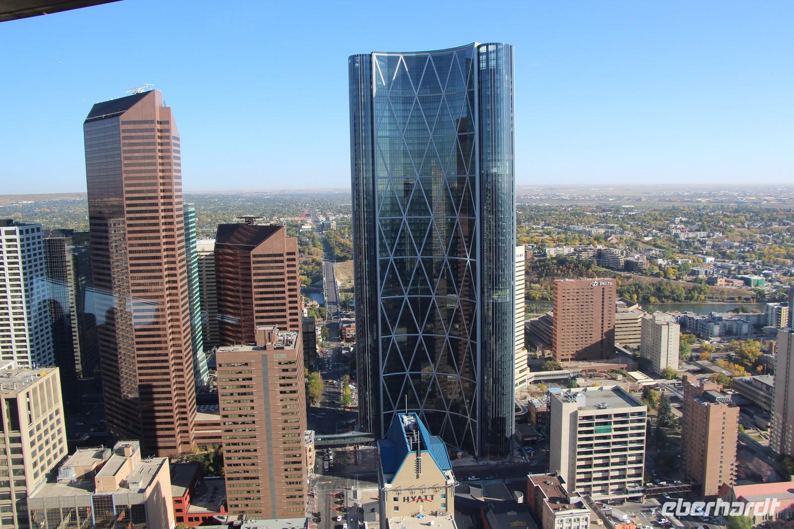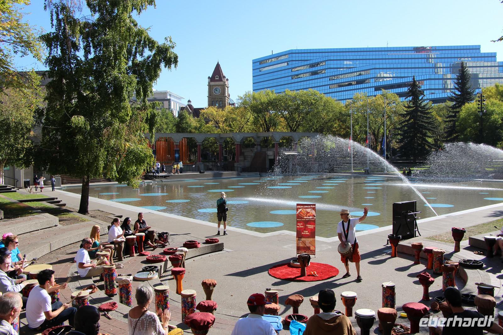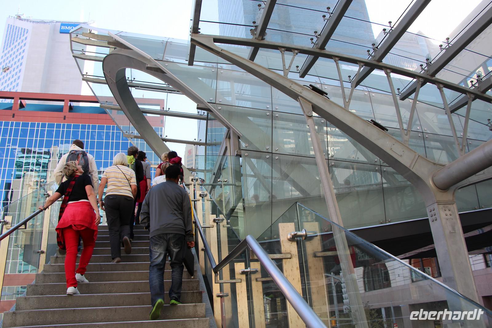 Bei einem Spaziergang lernen wir die Haupteinkaufsstraße Stephen Avenue und die Olympic Plaza kennen - einen Platz, an dem alle Teilnehmer und Preisträger der Olympischen Winterspiele von 1988 geehrt werden. Wir spazieren durch den Devonian Garden in der obersten Etage des Einkaufszentrums an der Stephen Avenue mit seinen Blumenbeeten, Palmen und Koikarpfen.