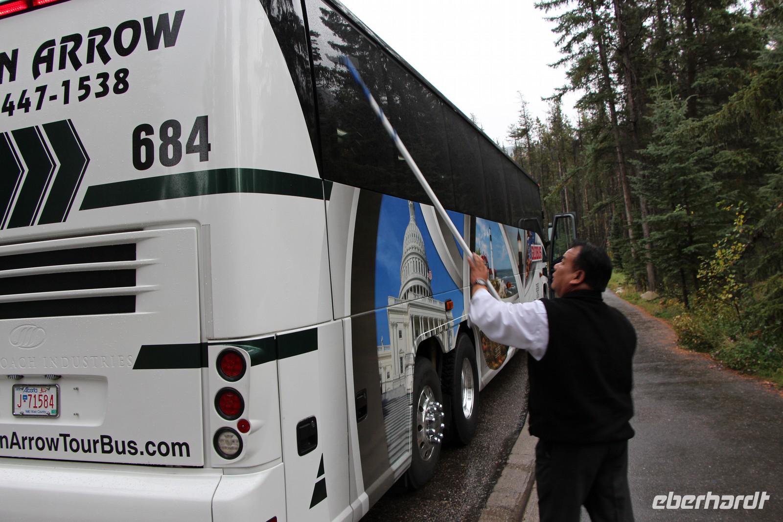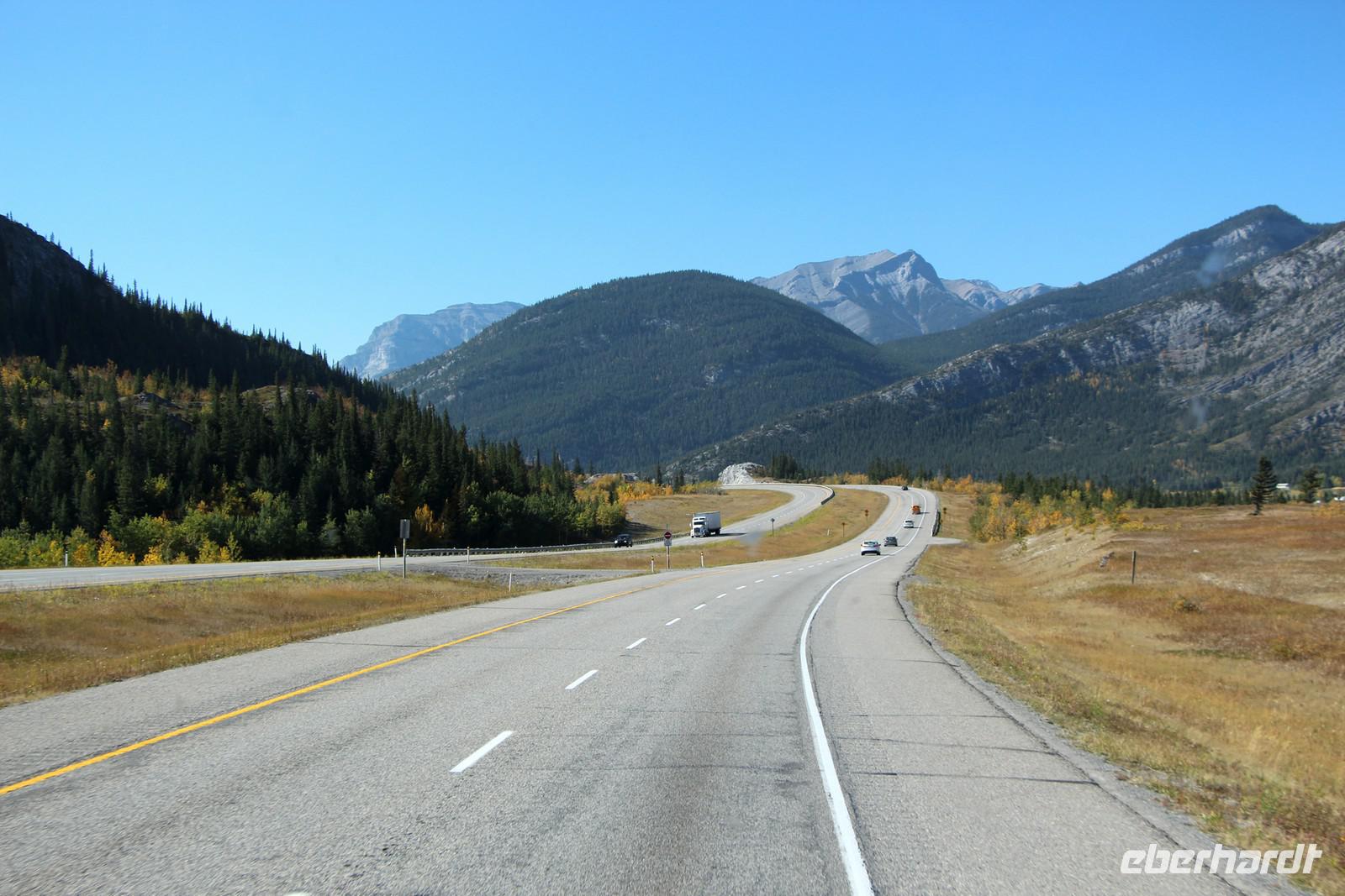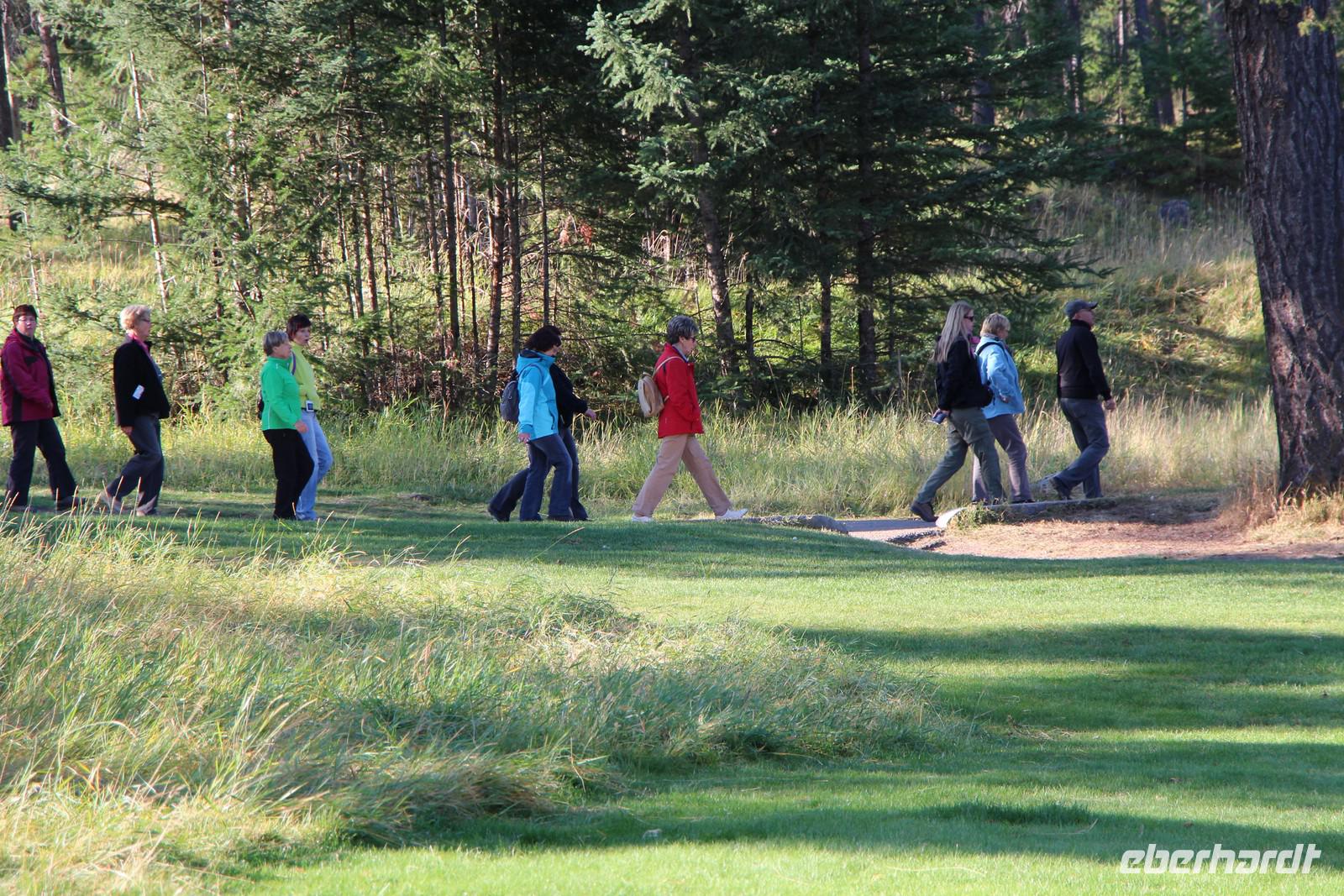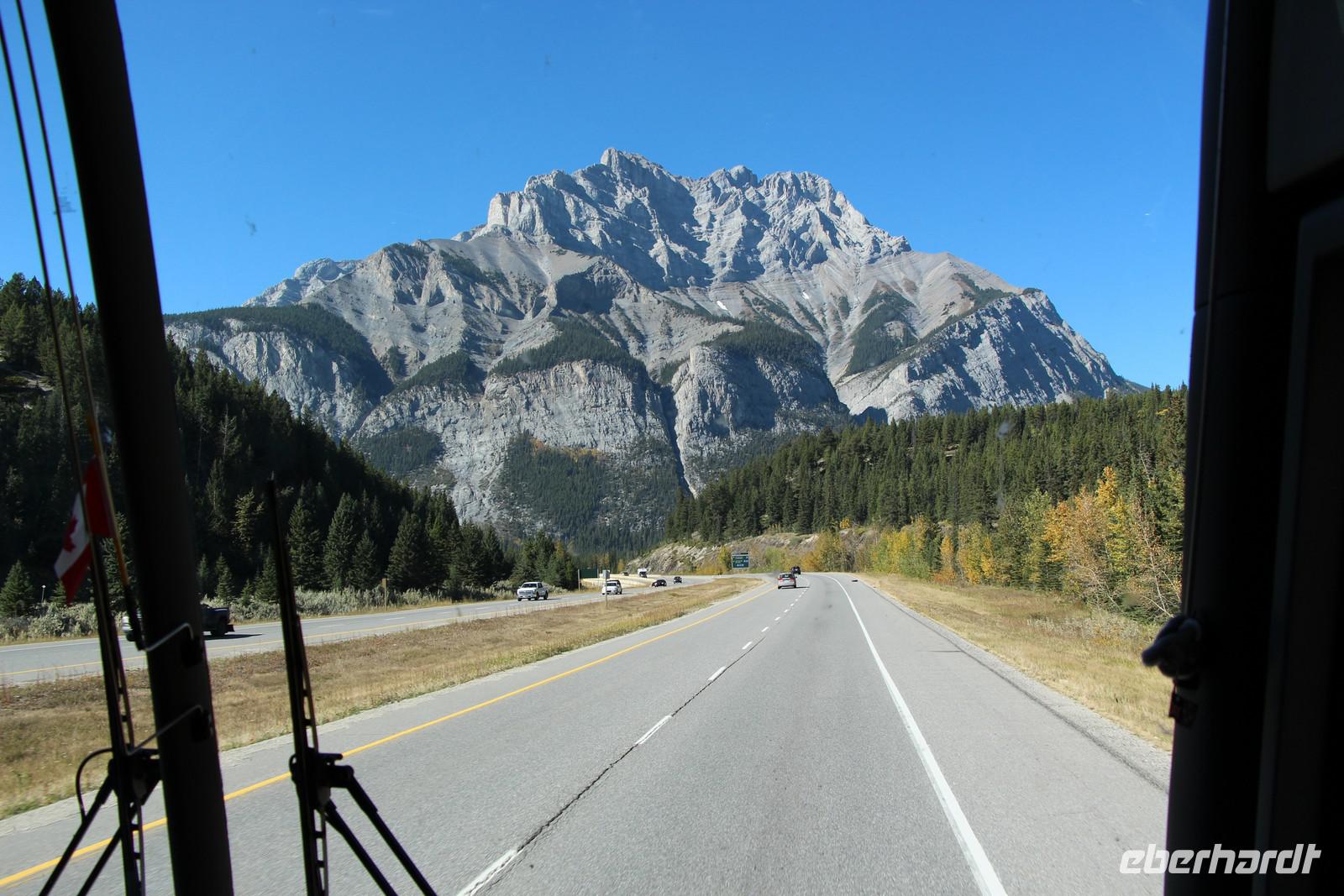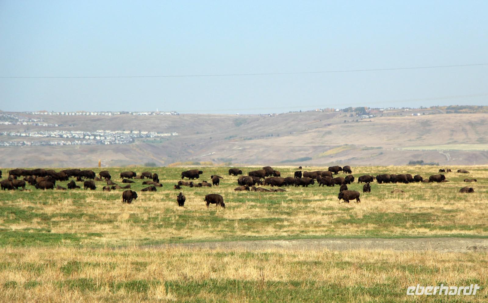 Auf dem Weg in Richtung Rocky Mountains sehen wir uns den Canada Olympic Park mit seinen Sportstätten, Skisprungschanzen und Bobbahn an. Schließlich reisen wir weiter den Highway Nummer 1 entlang. Ein kurzes Stück führt durch Prärieland und unser Busfahrer zeigt uns abseits des Highways eine Büffelfarm und eine riesige Büffelherde, die hier privat gehalten wird.