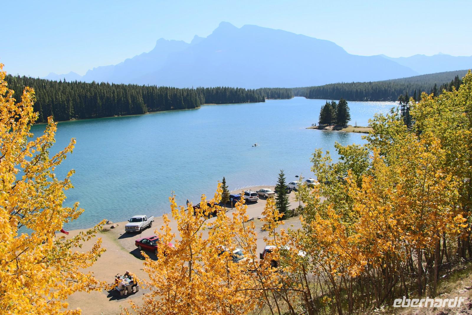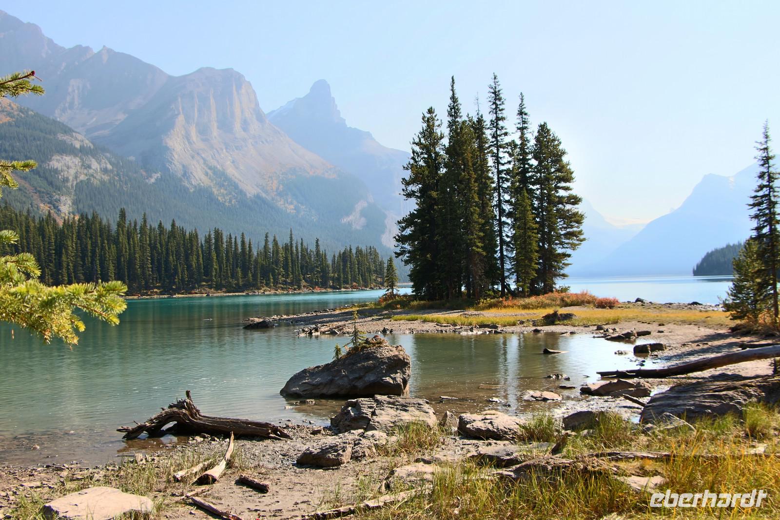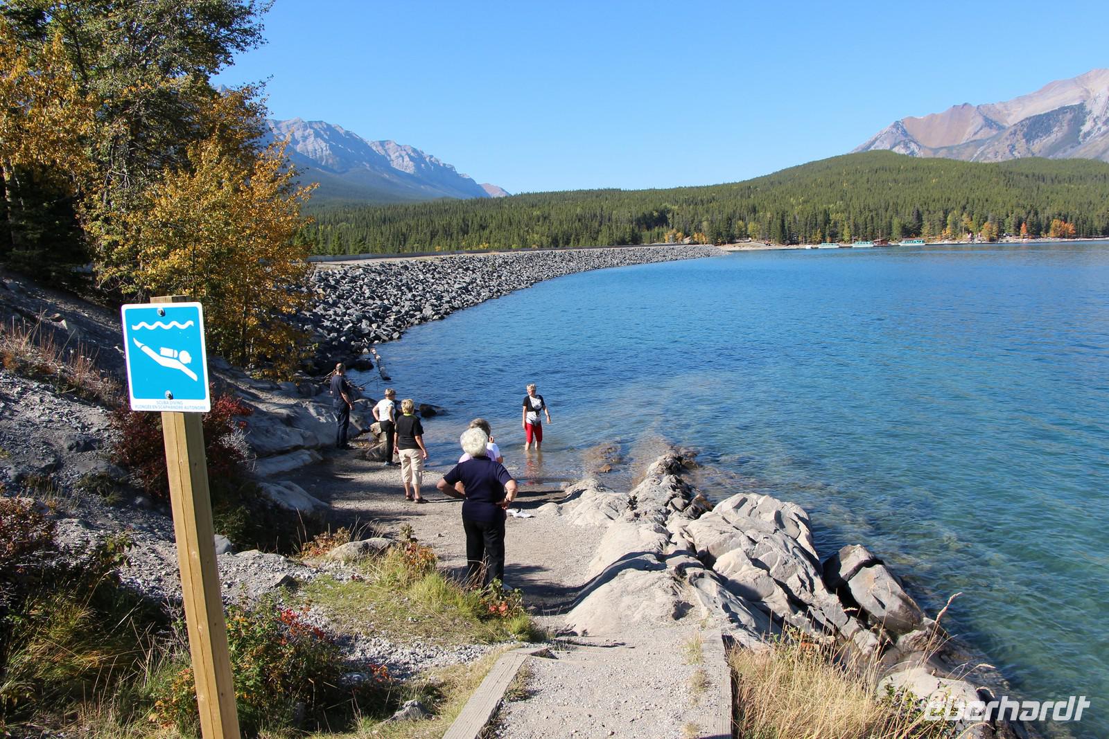 Wer nicht mit fährt, kann im Selbstbedienungsrestaurant oder auf der großen Terrasse eine Mittagspause einlegen. Einige Wanderwege führen am Seeufer entlang und durch den angrenzenden Wald. Empfehlenswert ist zum Beispiel der etwa drei Kilometer lange Mary Schäffer Loop, den jeder bequem erwandern kann.