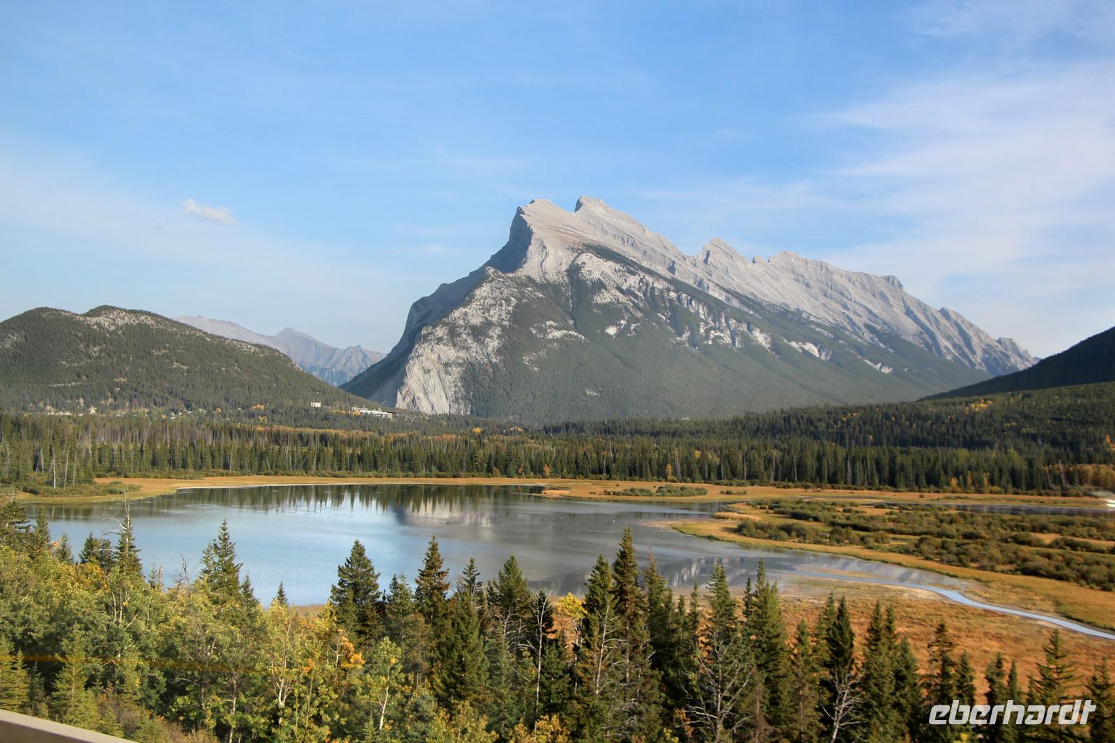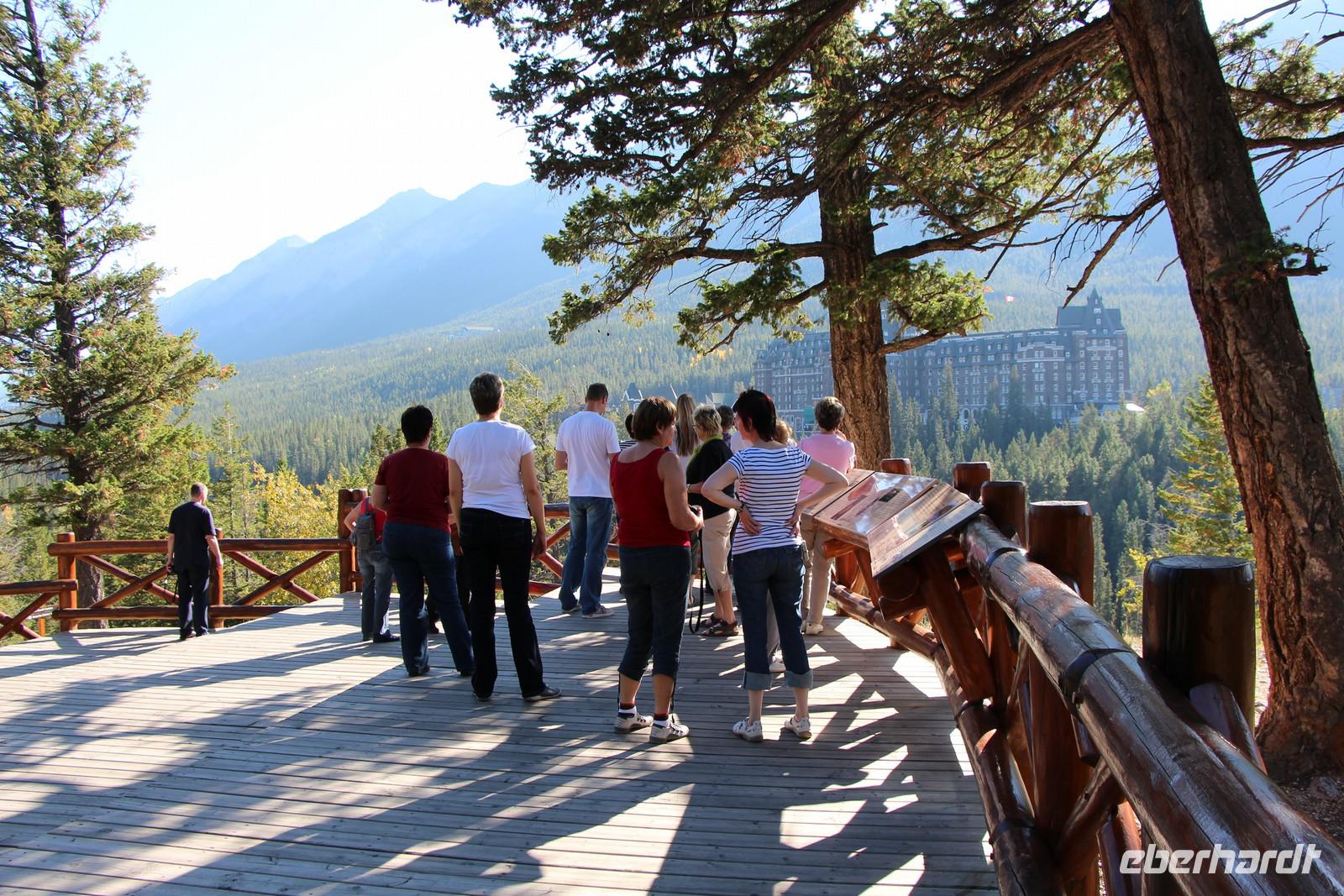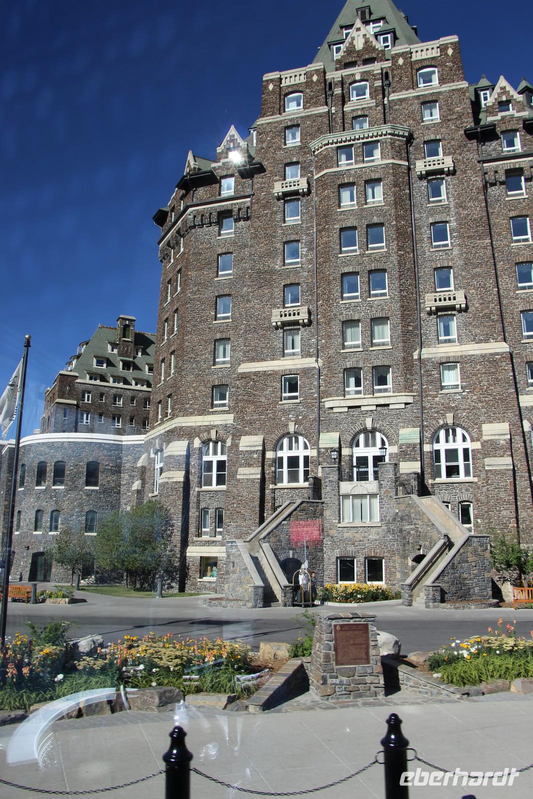 Am frühen Nachmittag erreichen wir den Banff-Nationalpark und erkunden mit dem Bus die Umgebung von Banff. Wir sehen die ersten türkisblauen Bergseen - den Two Jack Lake und den Lake Minnewanka. Das Luxushotel "Fairmont Banff Springs" ist eines der ehemaligen großen Eisenbahnhotels und thront inmitten der Bergwelt. Wir legen mehrere Fotostopps ein zum Beispiel am Bow-Waserfall oder an den Hoodoos - Sandsteinskulpturen oberhalb des Bow-Flusstals. Von hier hören wir auch immer wieder den eigentümlichen Brunftschrei der Wapitihirsche.