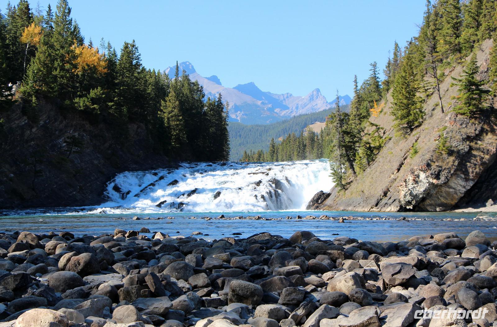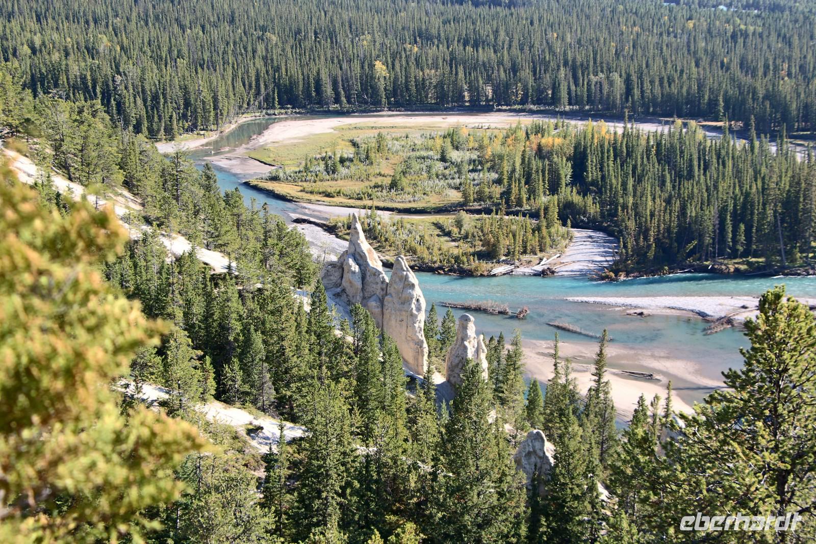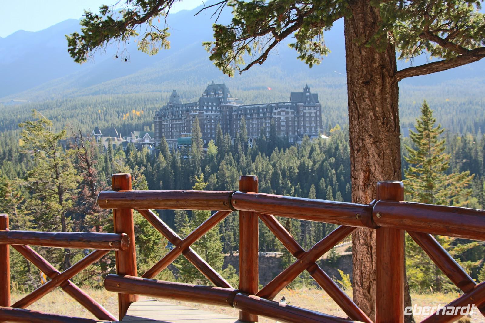 Am frühen Nachmittag erreichen wir den Banff-Nationalpark und erkunden mit dem Bus die Umgebung von Banff. Wir sehen die ersten türkisblauen Bergseen - den Two Jack Lake und den Lake Minnewanka. Das Luxushotel "Fairmont Banff Springs" ist eines der ehemaligen großen Eisenbahnhotels und thront inmitten der Bergwelt. Wir legen mehrere Fotostopps ein zum Beispiel am Bow-Waserfall oder an den Hoodoos - Sandsteinskulpturen oberhalb des Bow-Flusstals. Von hier hören wir auch immer wieder den eigentümlichen Brunftschrei der Wapitihirsche.