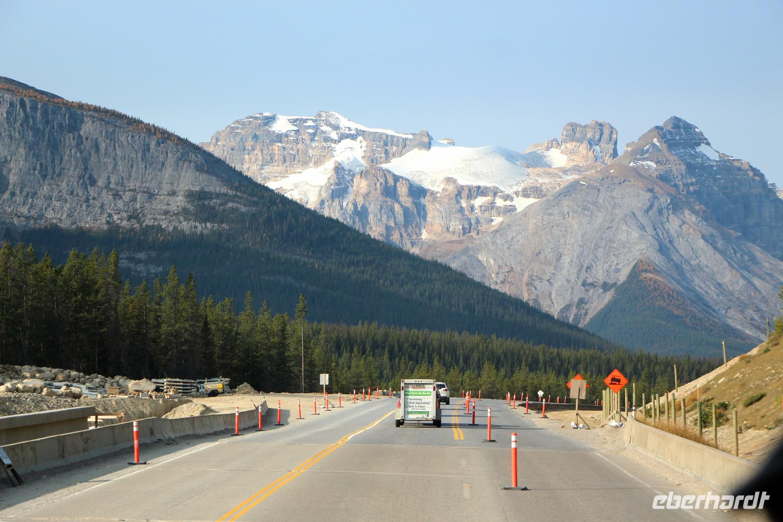 Heute steht der Banff-Nationalpark auf unserem Reiseprogramm. Nach dem Frühstück im Restaurant "El Toro" fahren wir von Banff los in Richtung Yoho-Nationalpark. Nach einem Fotostopp am Castle Mountain, einem der bekanntesten Bergmassive in den Rocky Mountains, überqueren wir die Grenze zu British Columbia. Wir gelangen über den Kicking-Horse-Pass auf mehr als 1200 Meter Höhe und stoppen an den einzigartigen Spiraltunneln der Pacific Railway Zugstrecke. Es gibt einen oberen und einen unteren Spiraltunnel durch die Berge, durch die die bis zu zwei Kilometer langen Güterzüge fahren - eine ingenieurtechnische Meisterleistung aus der Zeit des Eisenbahnbaus. Leider kommt bei unserem Stopp gerade kein Zug durch die Tunnel, aber man sieht auf Schautafeln, wie die Spiraltunnel funktionieren.