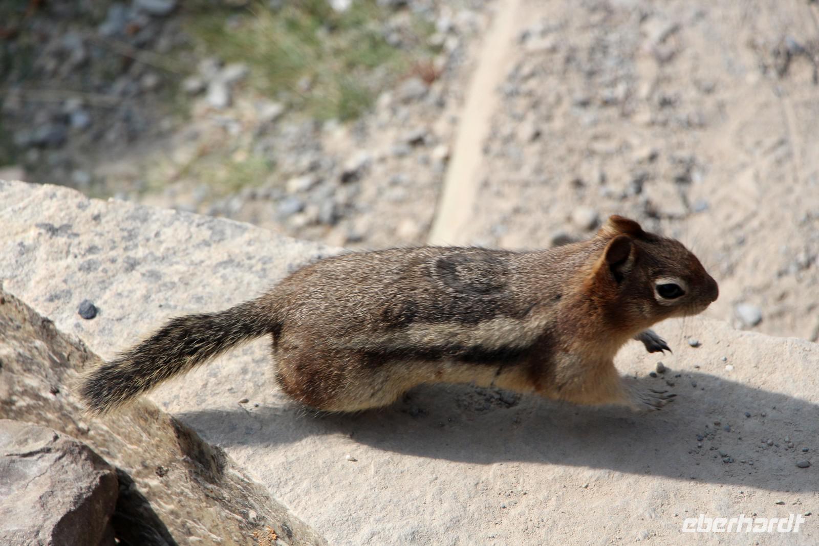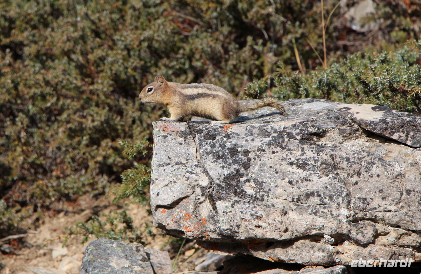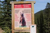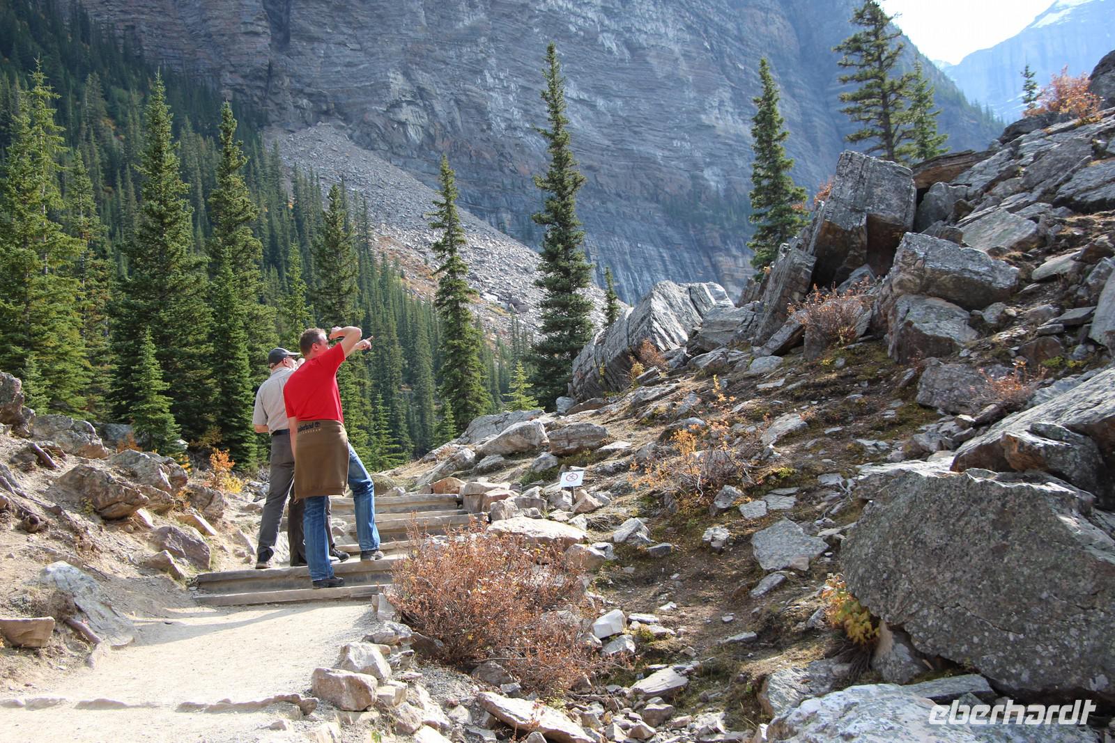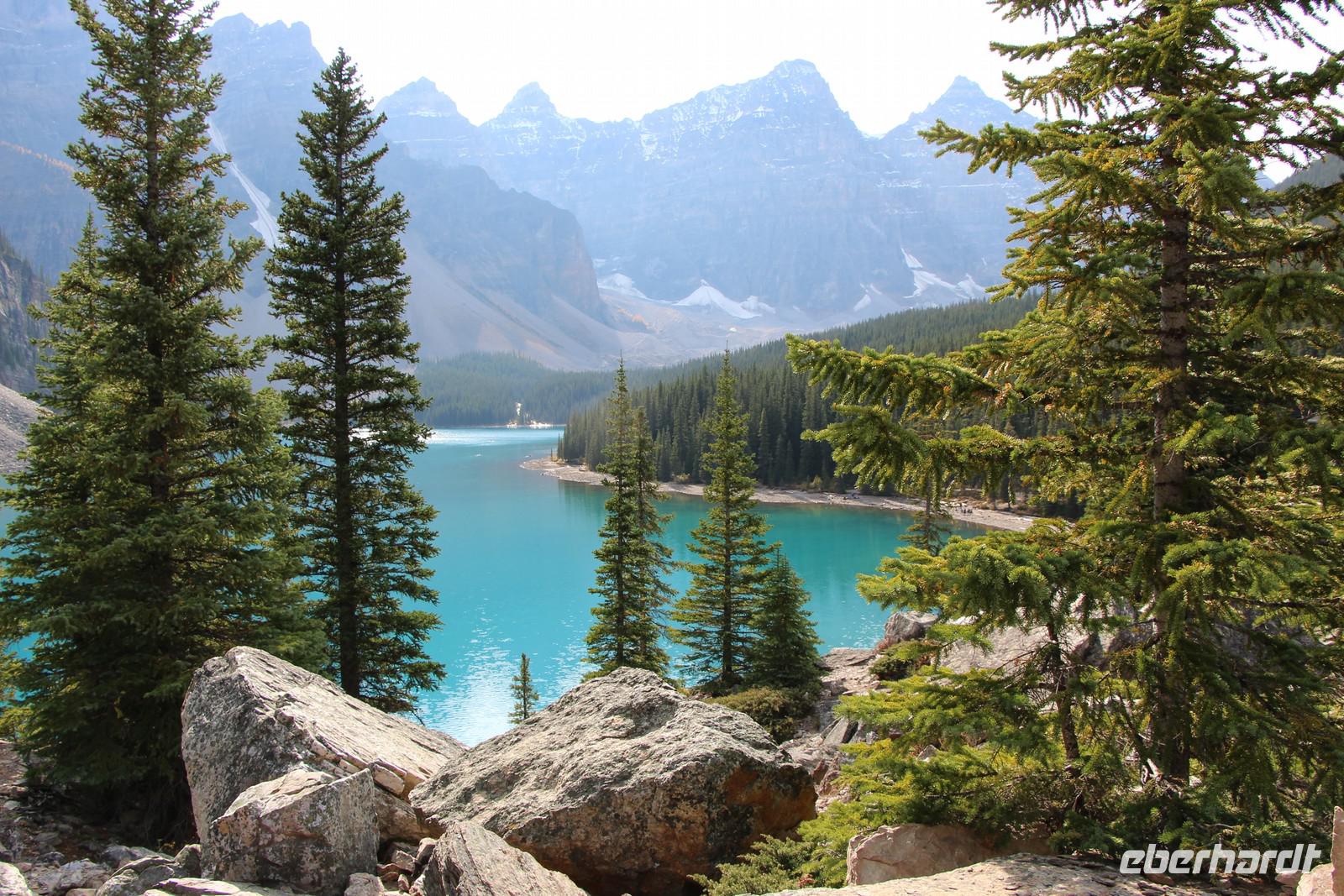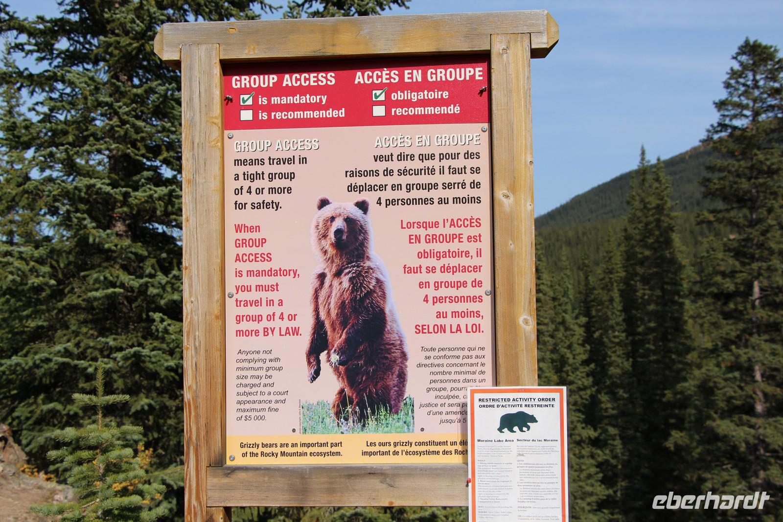 Danach geht es weiter zum Moraine Lake, ein türkisfarbener Gletschersee, der von insgesamt 10 Bergspitzen umrahmt wird. Ein kleiner Rundwanderweg führt nach oben und bietet herrliche Ausblicke auf den See mit den dahinter liegenden Bergspitzen und Gletschern. Auf dem Weg sehen wir Pikas, kleine Erdhörnchen, und Streifenhörnchen sowie ein Warnschild vor Grizzly-Bären, die hier in der Umgebung leben.