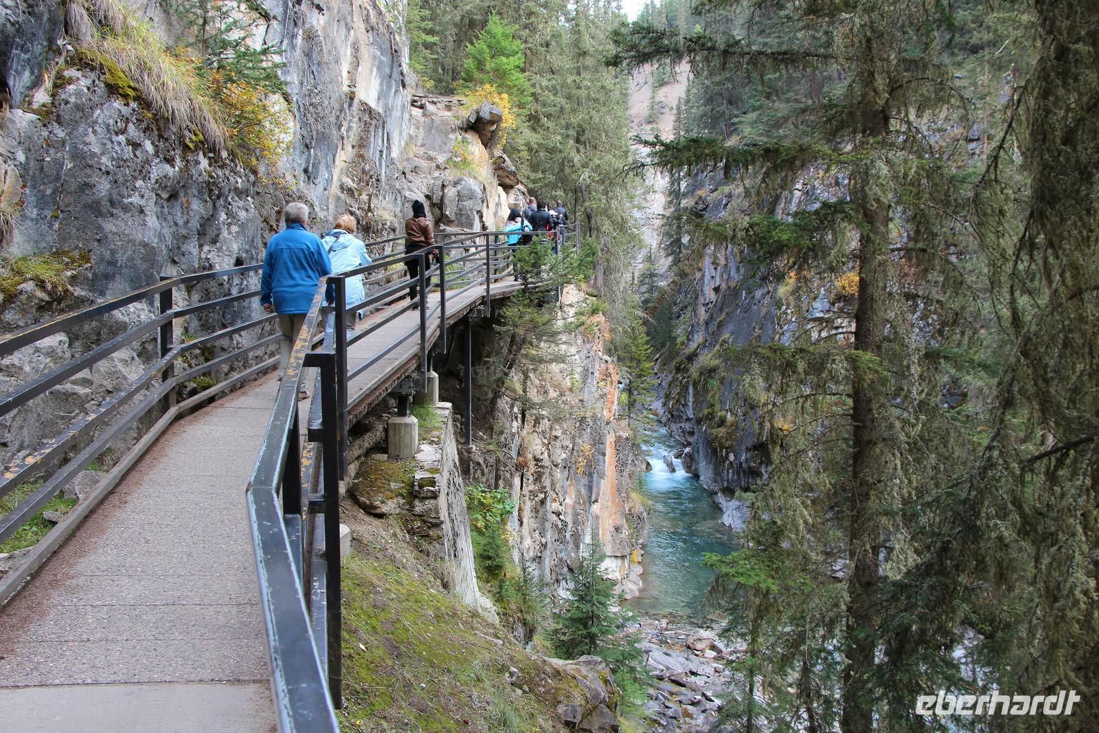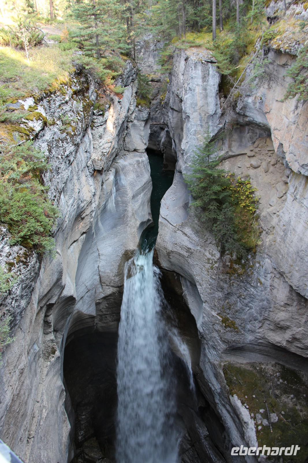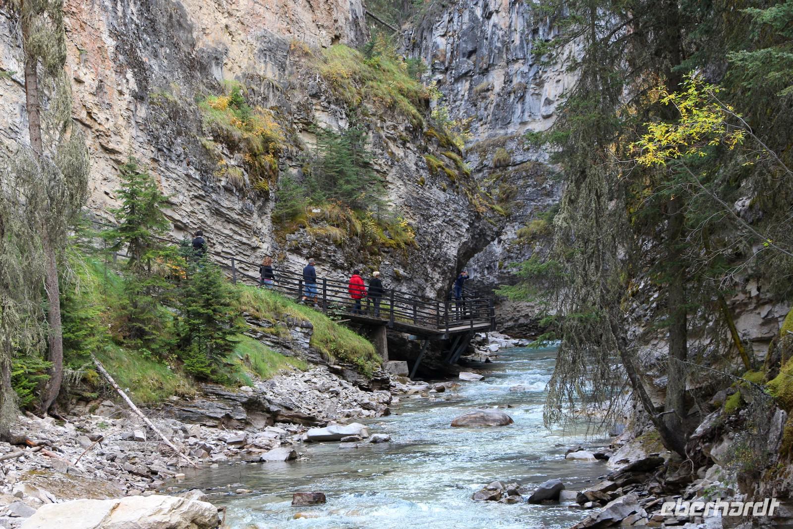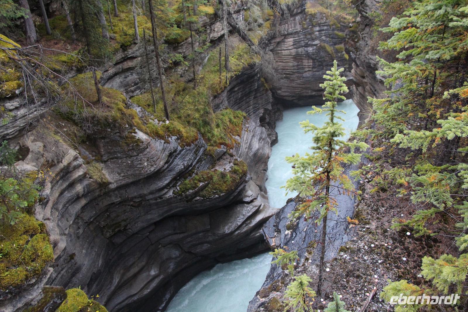 Auf dem Rückweg besuchen wir den Maligne Canyon. Hier unternehmen wir einen Spaziergang zur bis zu 50 Meter tiefen, aber teilweise nur zwei bis drei Meter breiten Schlucht des Maligne River.