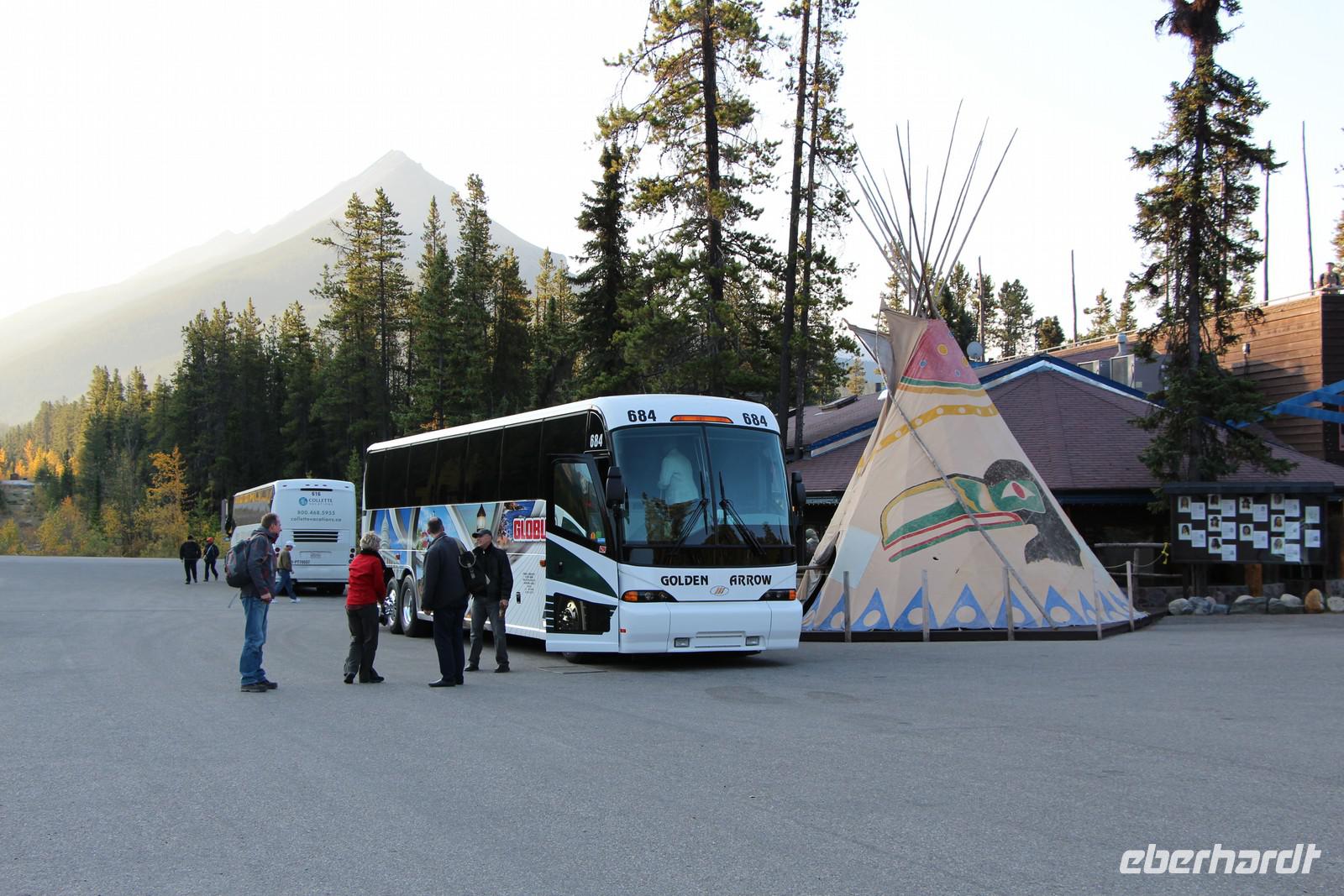 Schließlich erreichen wir mit dem Bus das Städtchen Jasper, in dem nur 4500 Einwohner leben. Hier haben wir Freizeit zum Bummeln. Es gibt auch Banken zum Geld abheben, Cafés und Supermärkte. Dann fahren wir zurück zur Sunwapta-Lodge. Im Garten vor unseren Bungalows schenken wir den kanadischen Rotwein und Weißwein aus und stoßen auf die schöne Reise an, bevor wir gemeinsam zum Abendessen gehen. Ein gelungener Abschluss eines erlebnisreichen Tages!