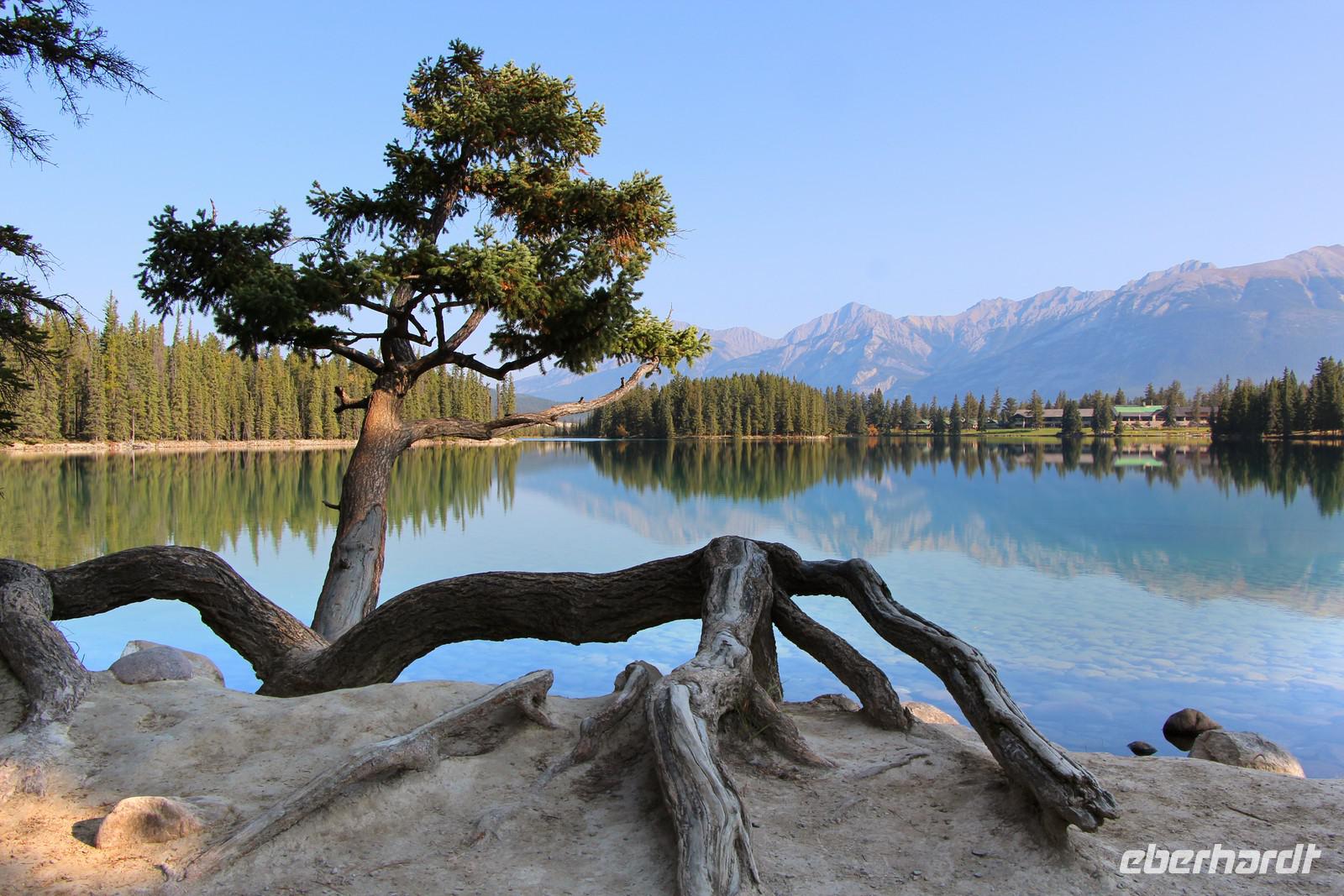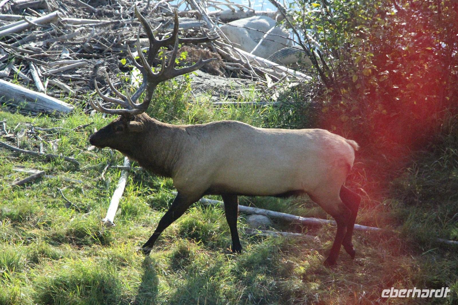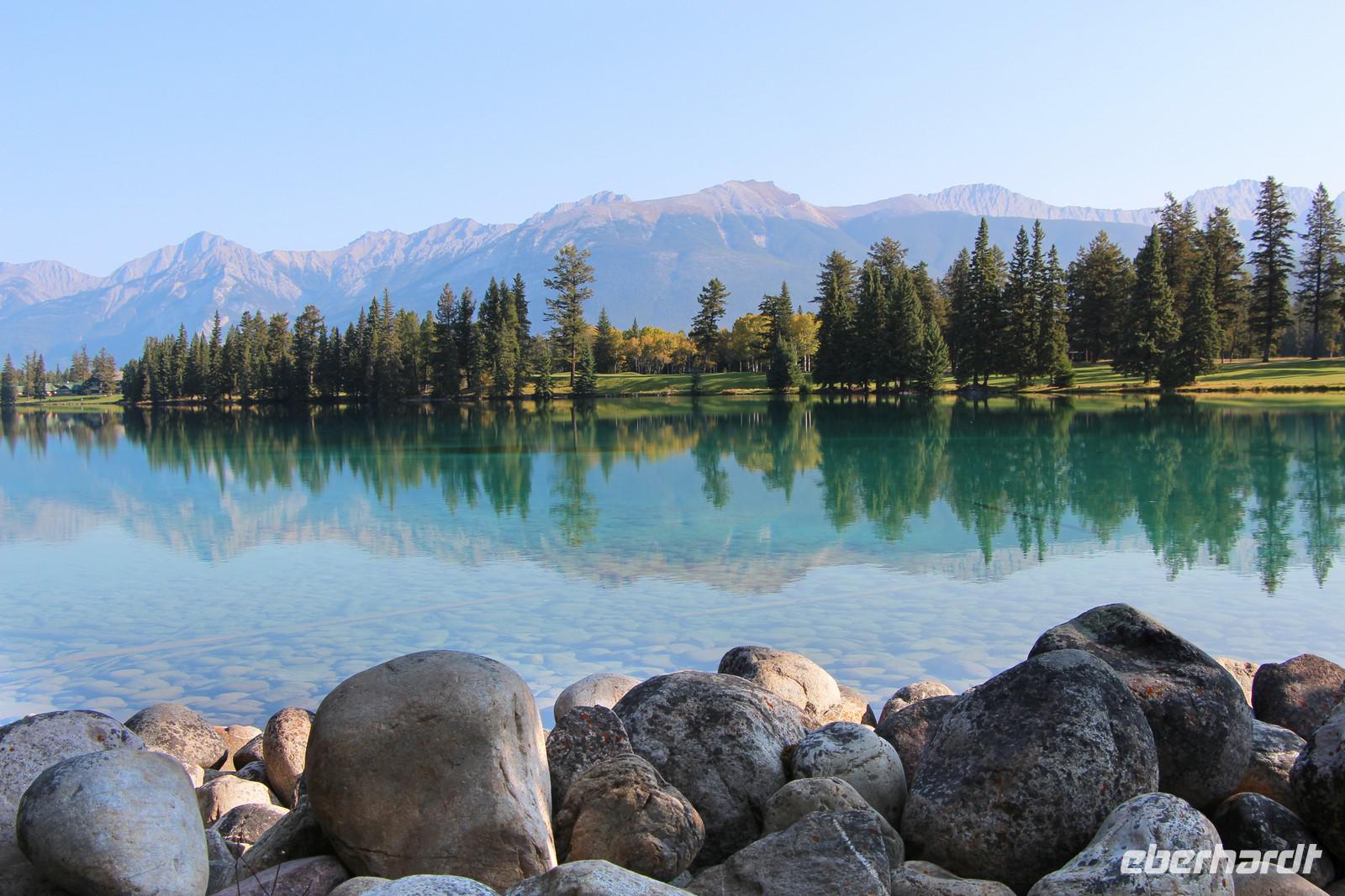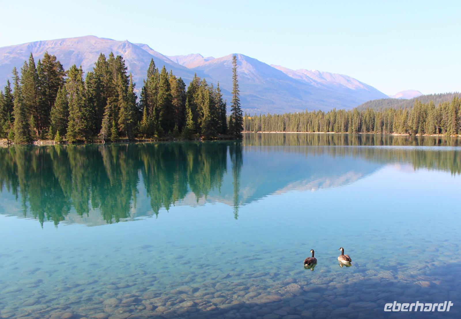 Heute wird der „Tag der Tiere"! Mit dem Bus geht es das letzte Stück des Icefield Parkway hinauf im Jasper-Nationalpark. Unterwegs sehen wir eine Schneeziege mit einem Jungen, einen jungen Wapiti-Hirsch und etwas später einen stattlichen Wapiti-Bullen mit einem riesigen Geweih. Wir fahren bis zum Städtchen Jasper und zum Fairmont-Resort „Fairmont Jasper Lodge" am kleinen Bergsee Lac Beauvert. Hier unternehmen wir eine gemeinsame Wanderung rund um den See. Wir sehen bei unserer etwa einstündigen Wanderung Kanadagänse, Eichhörnchen, eine Bisamratte und Streifenhörnchen. Der Weg ist eben und führt immer am Seeufer entlang. Das Wetter ist wieder herrlich: am Morgen kühl, gegen Mittag aber über 20 °C mit blauem Himmel und Sonnenschein.