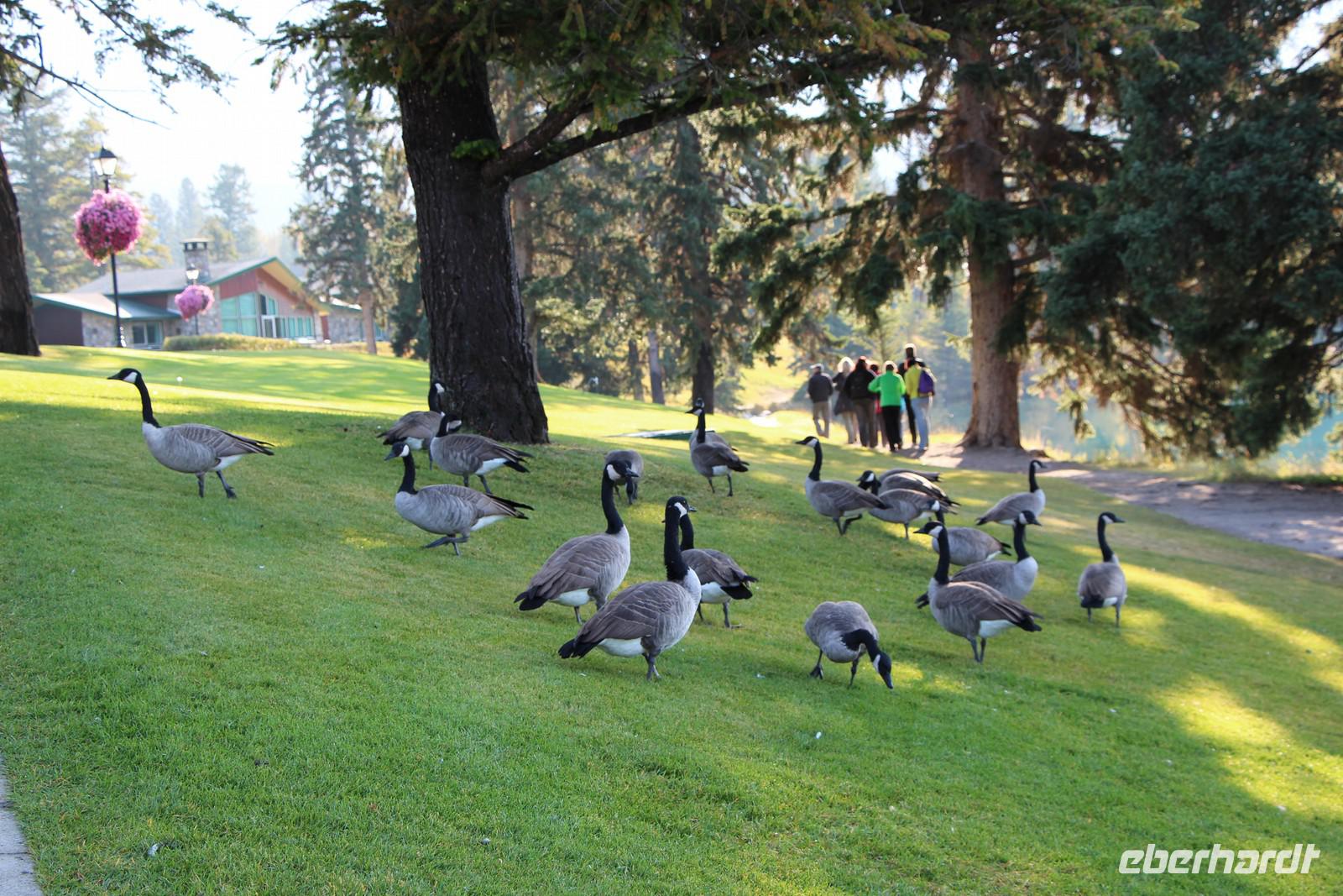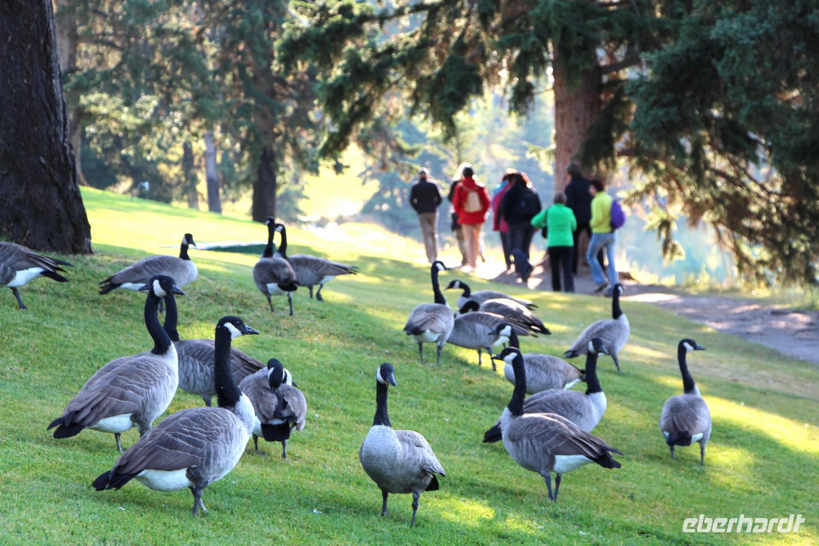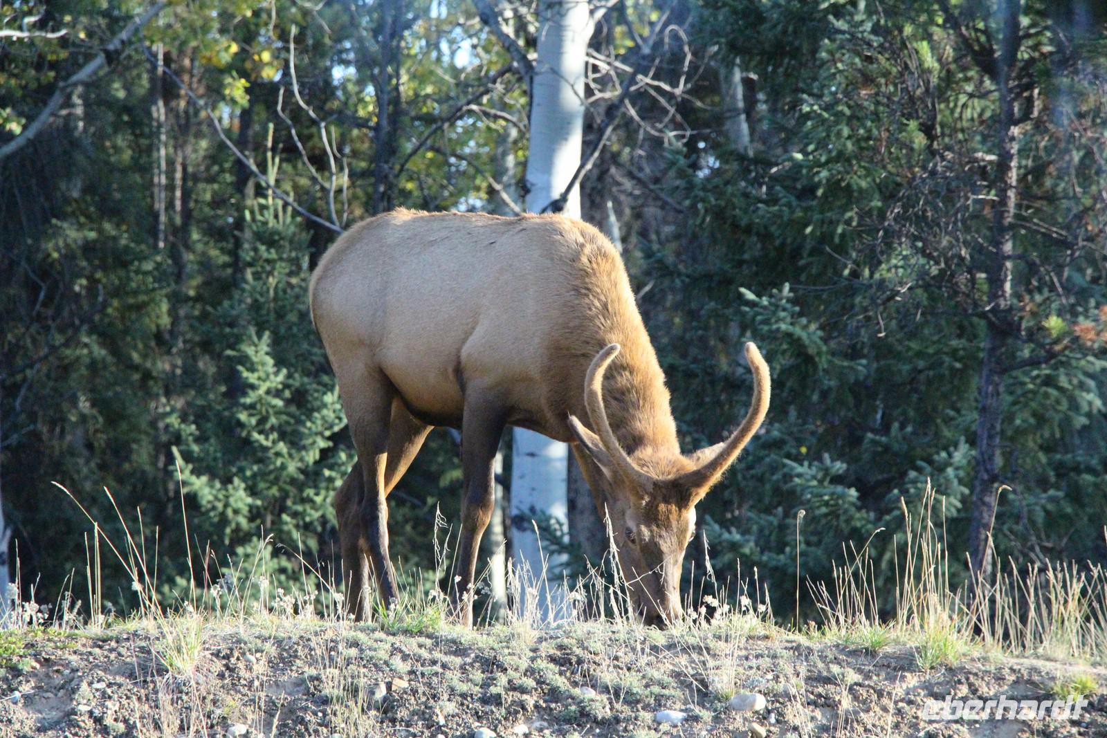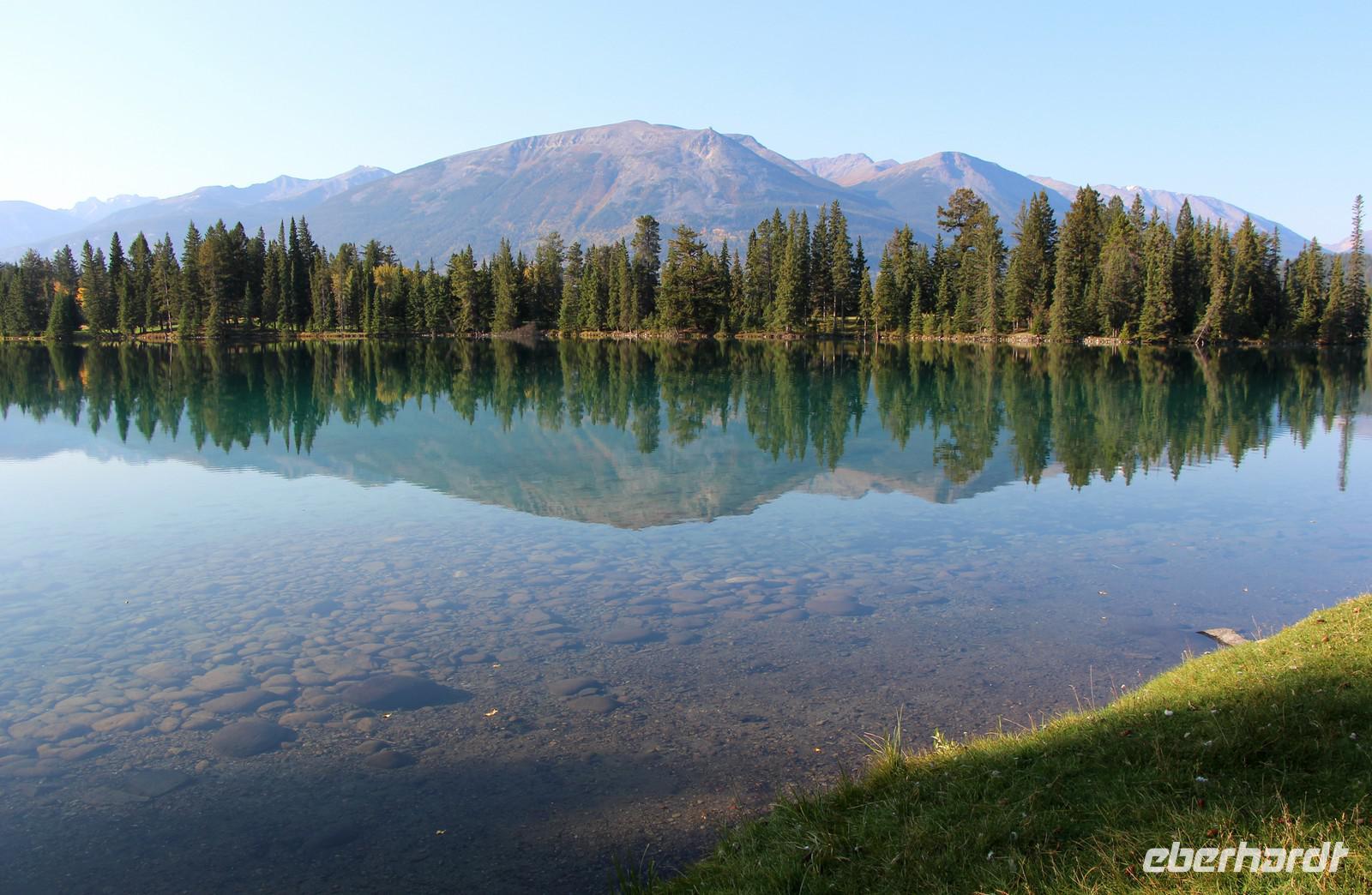 Heute wird der „Tag der Tiere"! Mit dem Bus geht es das letzte Stück des Icefield Parkway hinauf im Jasper-Nationalpark. Unterwegs sehen wir eine Schneeziege mit einem Jungen, einen jungen Wapiti-Hirsch und etwas später einen stattlichen Wapiti-Bullen mit einem riesigen Geweih. Wir fahren bis zum Städtchen Jasper und zum Fairmont-Resort „Fairmont Jasper Lodge" am kleinen Bergsee Lac Beauvert. Hier unternehmen wir eine gemeinsame Wanderung rund um den See. Wir sehen bei unserer etwa einstündigen Wanderung Kanadagänse, Eichhörnchen, eine Bisamratte und Streifenhörnchen. Der Weg ist eben und führt immer am Seeufer entlang. Das Wetter ist wieder herrlich: am Morgen kühl, gegen Mittag aber über 20 °C mit blauem Himmel und Sonnenschein.