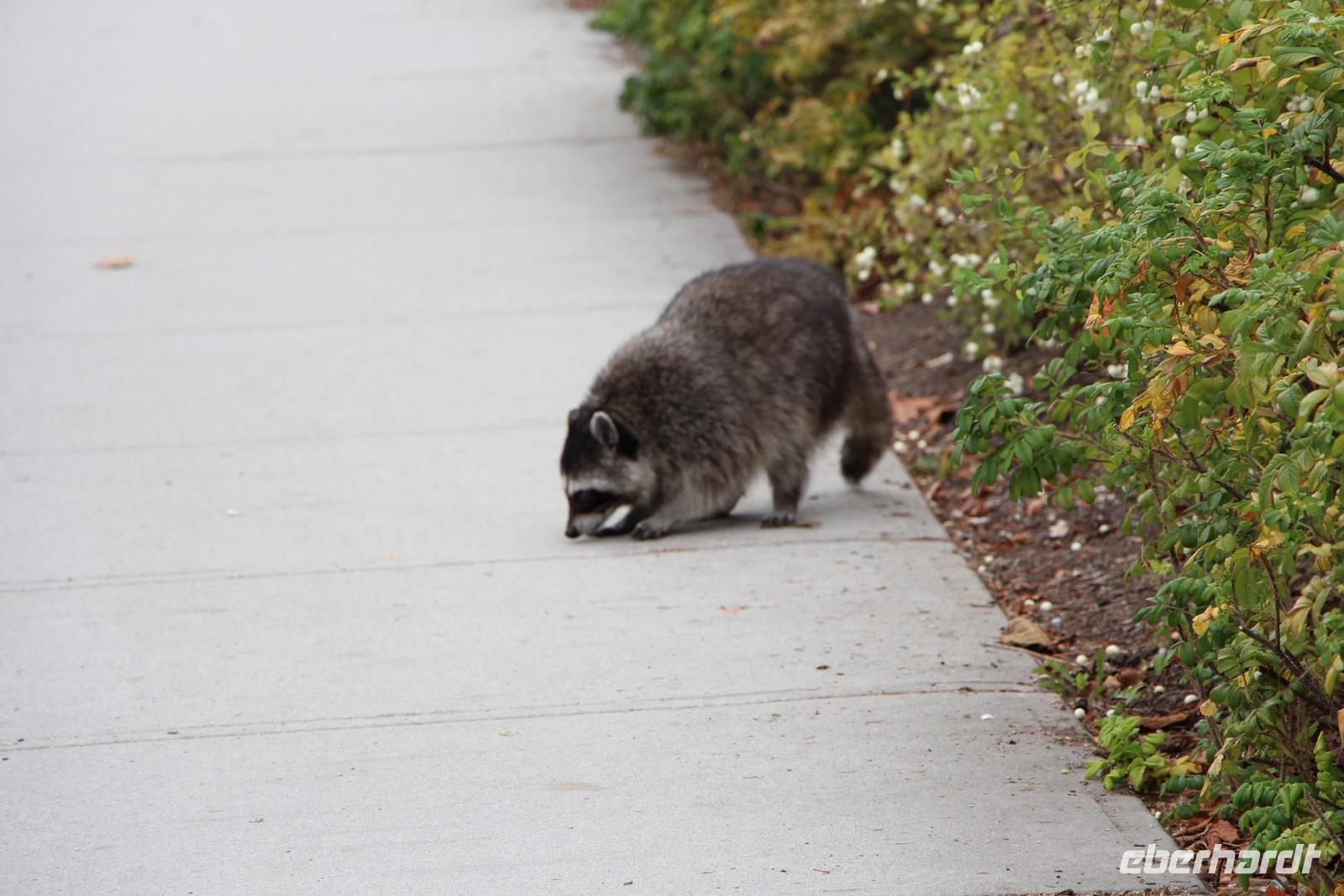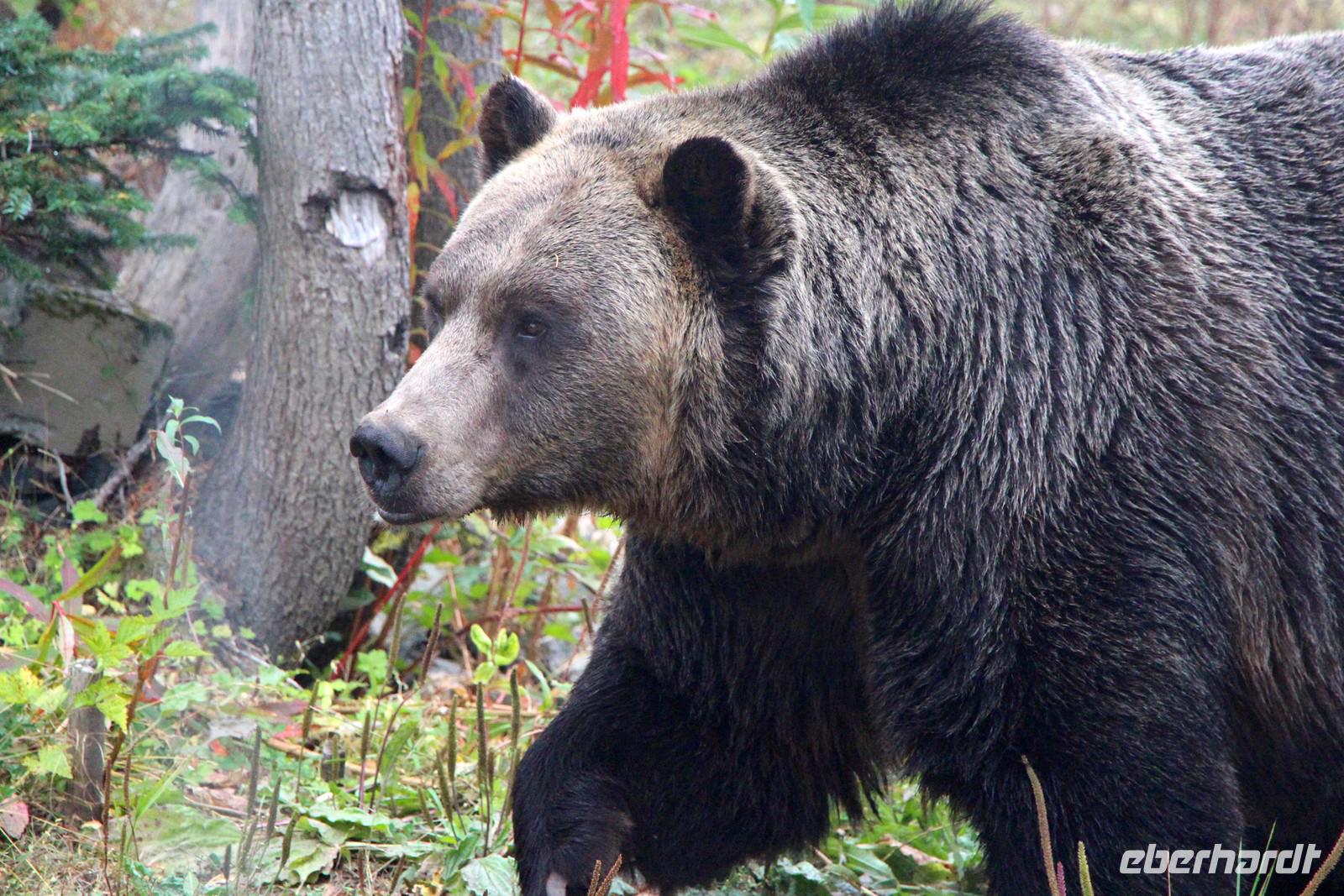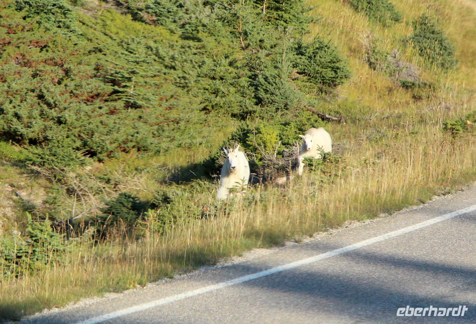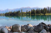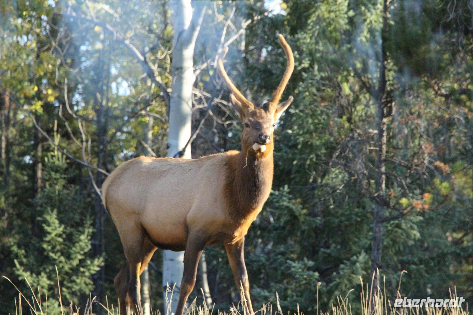 Heute wird der „Tag der Tiere"! Mit dem Bus geht es das letzte Stück des Icefield Parkway hinauf im Jasper-Nationalpark. Unterwegs sehen wir eine Schneeziege mit einem Jungen, einen jungen Wapiti-Hirsch und etwas später einen stattlichen Wapiti-Bullen mit einem riesigen Geweih. Wir fahren bis zum Städtchen Jasper und zum Fairmont-Resort „Fairmont Jasper Lodge" am kleinen Bergsee Lac Beauvert. Hier unternehmen wir eine gemeinsame Wanderung rund um den See. Wir sehen bei unserer etwa einstündigen Wanderung Kanadagänse, Eichhörnchen, eine Bisamratte und Streifenhörnchen. Der Weg ist eben und führt immer am Seeufer entlang. Das Wetter ist wieder herrlich: am Morgen kühl, gegen Mittag aber über 20 °C mit blauem Himmel und Sonnenschein.