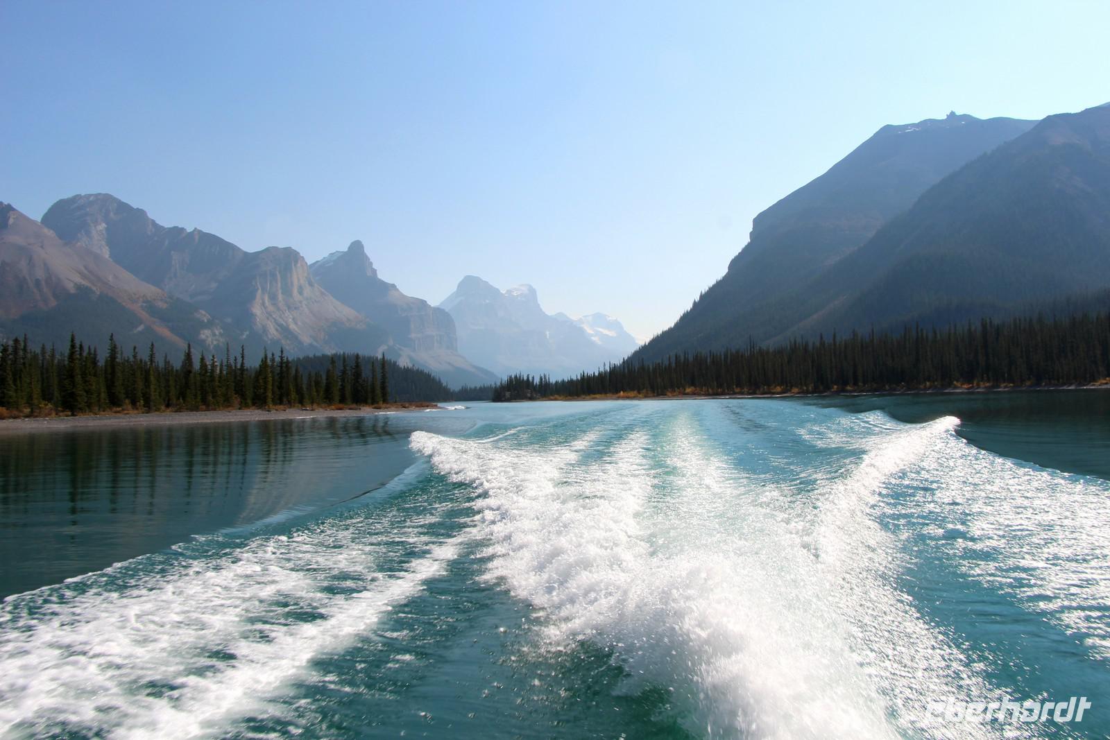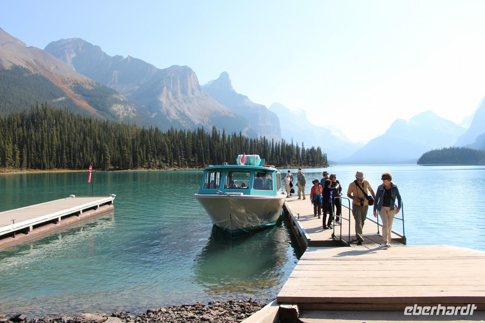 Um 13.00 Uhr startet unsere fakultative Bootsfahrt über den Maligne Lake. Unterwegs sehen wir den Maligne-Gletscher und die u-förmige Maligne-Bergkette - das Panorama ist einmalig. Die Fahrt findet in überdachten, sicheren Booten statt, auf denen etwa 30 Personen Platz finden. Die Erklärungen an Bord sind auf Englisch. Ich übersetze unterwegs die wichtigsten Informationen. Die Bootsfahrt dauert etwa 1,5 Stunden. Das Boot fährt bis zur kleinen Insel Spirit Island - nach Lake Louise das meistfotografierte Motiv in den kanadischen Rocky Mountains. Bei so gutem Wetter ist diese Bootsfahrt trotz des Preises von 50 CAD sehr lohnenswert.