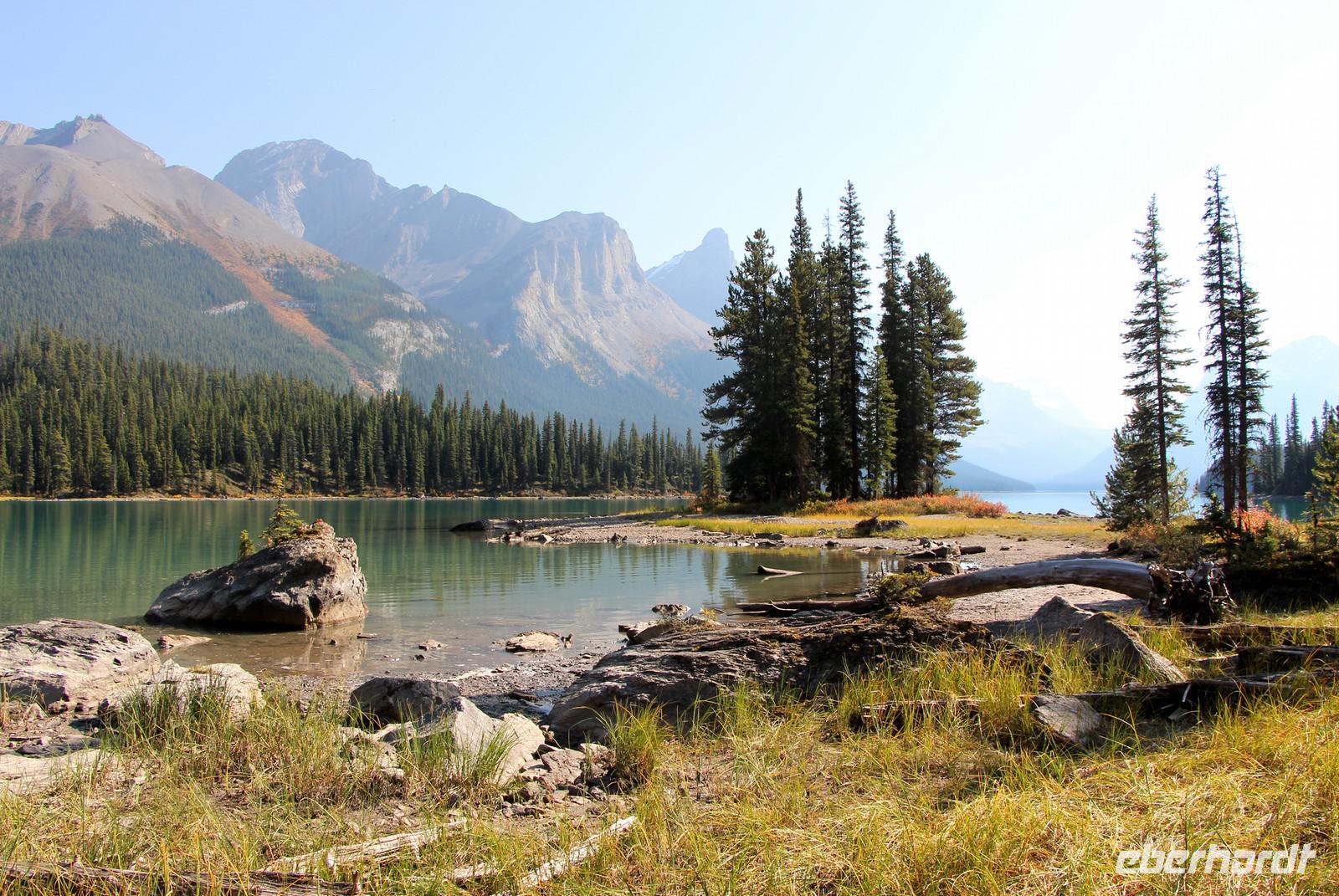 Nach unserer Wanderung geht es weiter in Richtung Maligne Lake. Die Straße führt weiter nach oben fast bis auf 2000 Höhenmeter. Unterwegs legen wir einen Fotostopp am Medicine Lake ein. Gegen Mittag erreichen wir den bekannten Maligne Lake, den zweitgrößten Gletschersee der Welt! Er ist bis zu 100 Meter tief und hat eine Wassertemperatur von 7 °C. Der Maligne Lake wird zu 90% von den umliegenden Gletschern gespeist, der Rest kommt vom Regenwasser oder der Schneeschmelze im Frühjahr. Am Maligne Lake unternehmen einige von uns eine Bootsfahrt zur Insel Spirit Island.