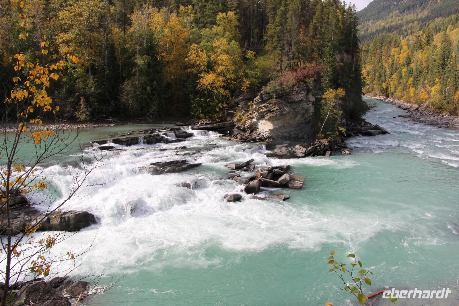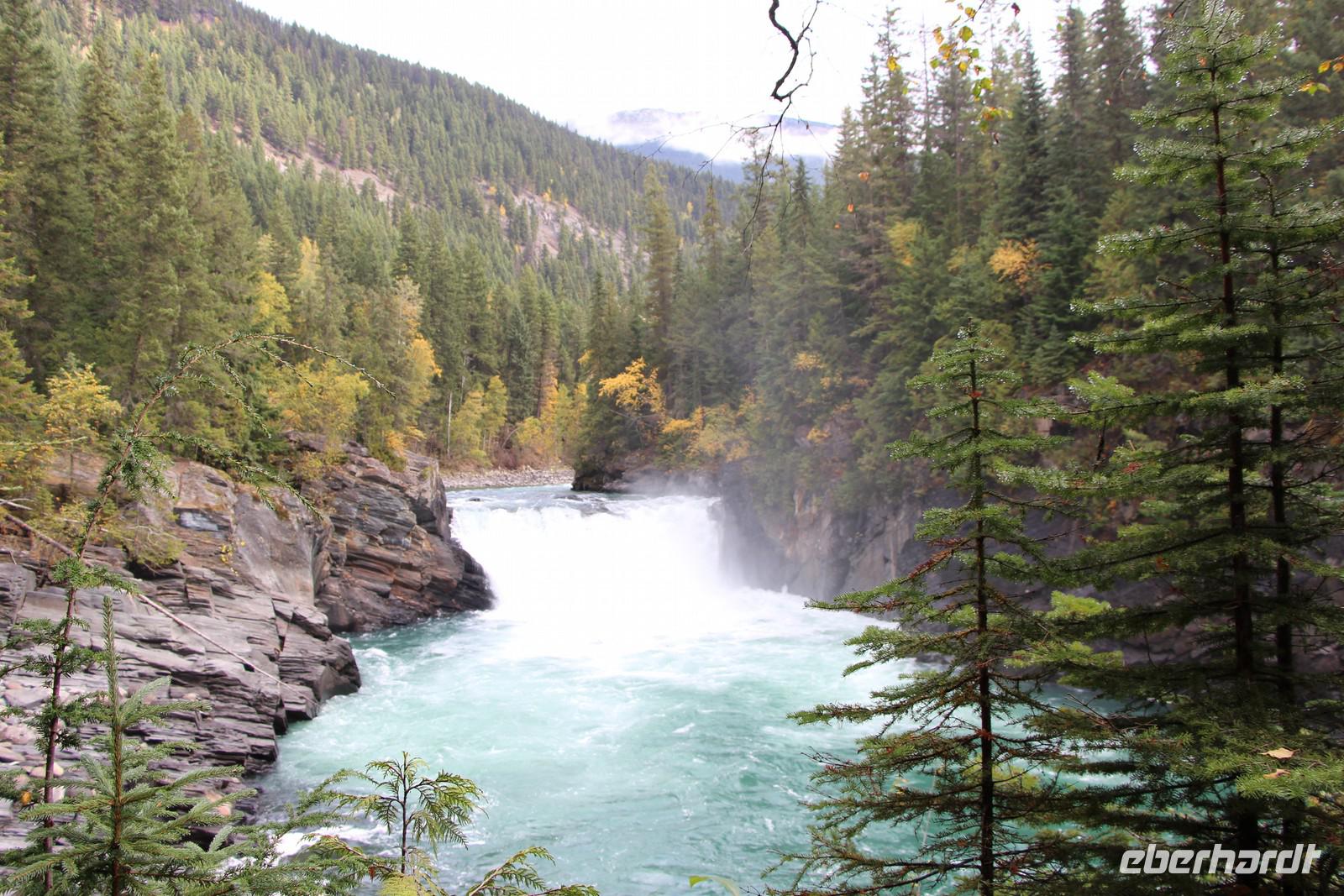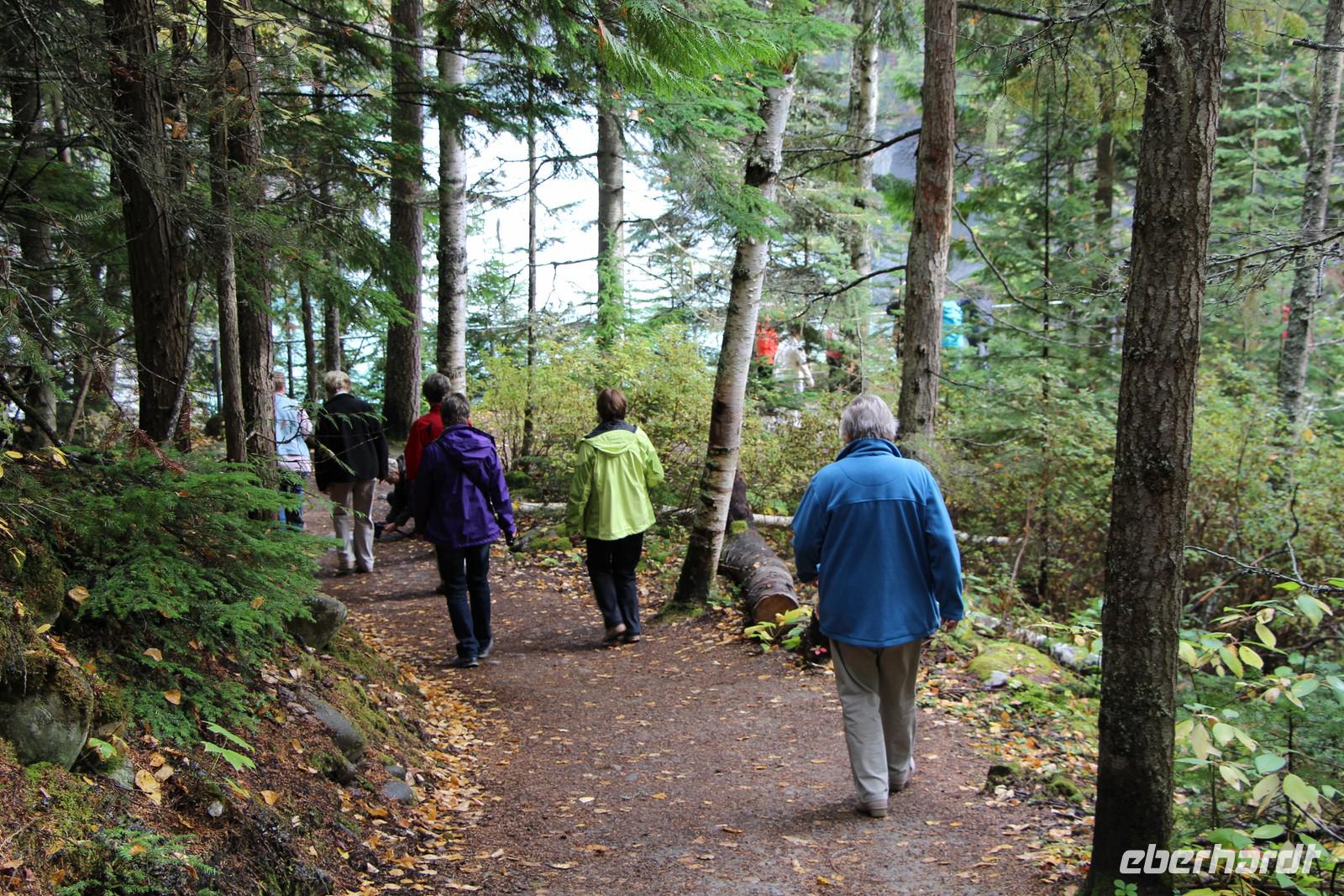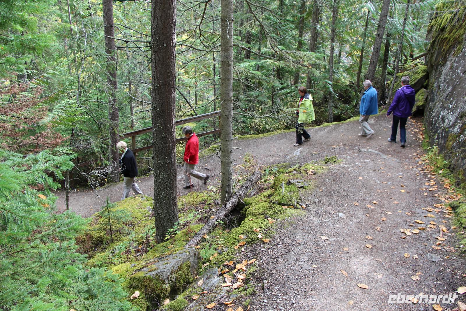 Vorbei an Jasper erreichen wir nach fast zwei Stunden Fahrtzeit die Grenze zur Provinz British Columbia und den Mount Robson Provincial Park. Hier stellen wir die Uhr noch einmal eine Stunde zurück, sodass wir nun neun Stunden Zeitverschiebung zu Deutschland haben. Über den Yellowhead Pass und den Yellowhead Highway geht es weiter zu den Overlander Falls, einem Wasserfall am bekannten Fraser River. Eine kleine Wanderung führt hinunter zum Fluss und zurück. Danach wandern wir etwa 45 Minuten weiter zum Rasthof am Fuße des Mount Robson. Leider ist der höchste Berg der kanadischen Rocky Mountains (3954 m) wie so oft in Wolken gehüllt, sodass wir die schneebedeckte Spitze nicht sehen können. Wir verbringen unsere Mittagspause am Besucherzentrum mit seinem Restaurant und Souvenirläden.