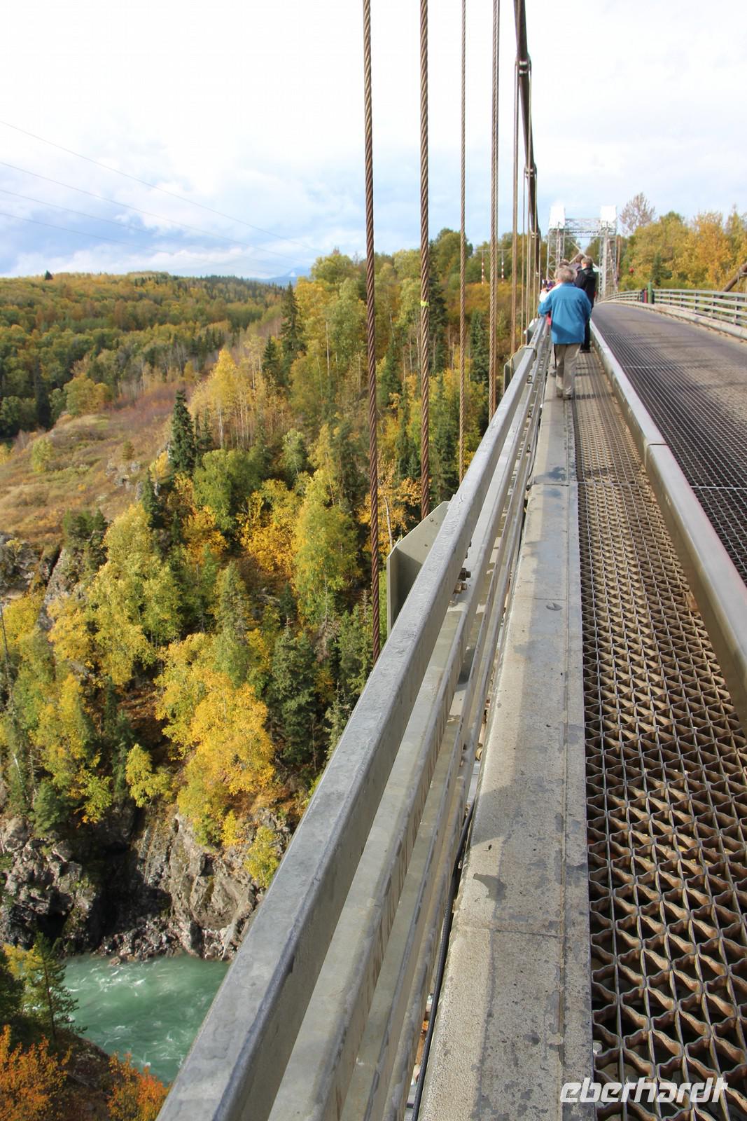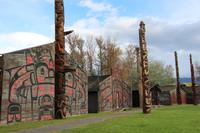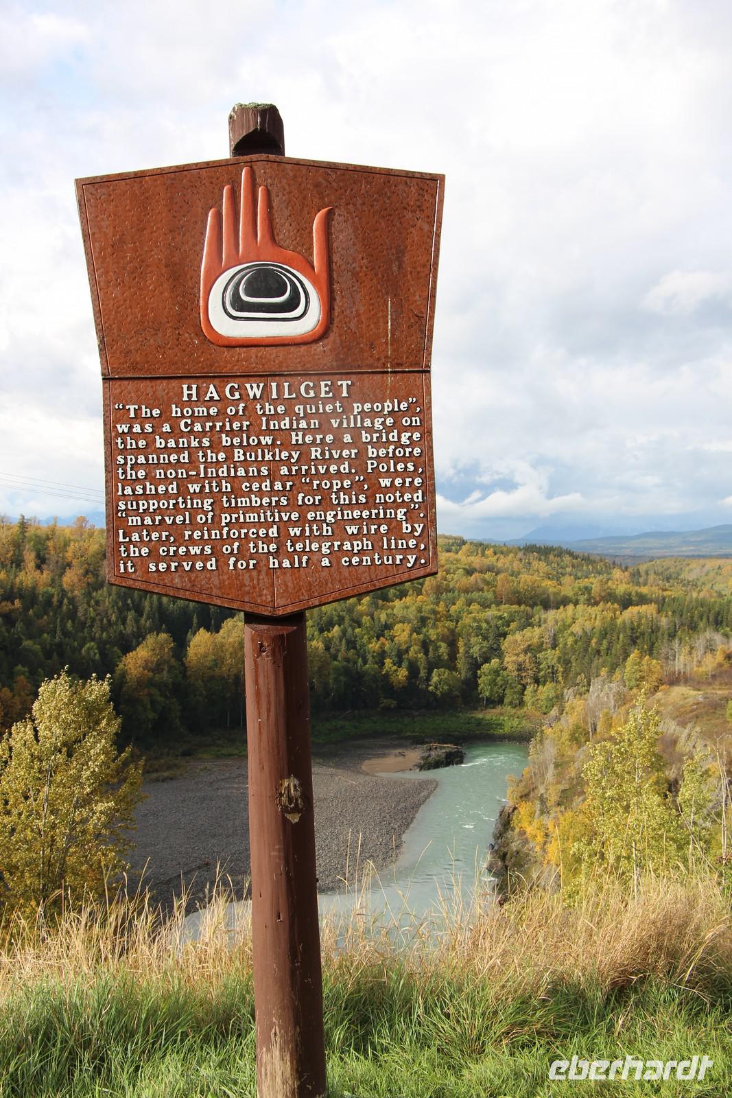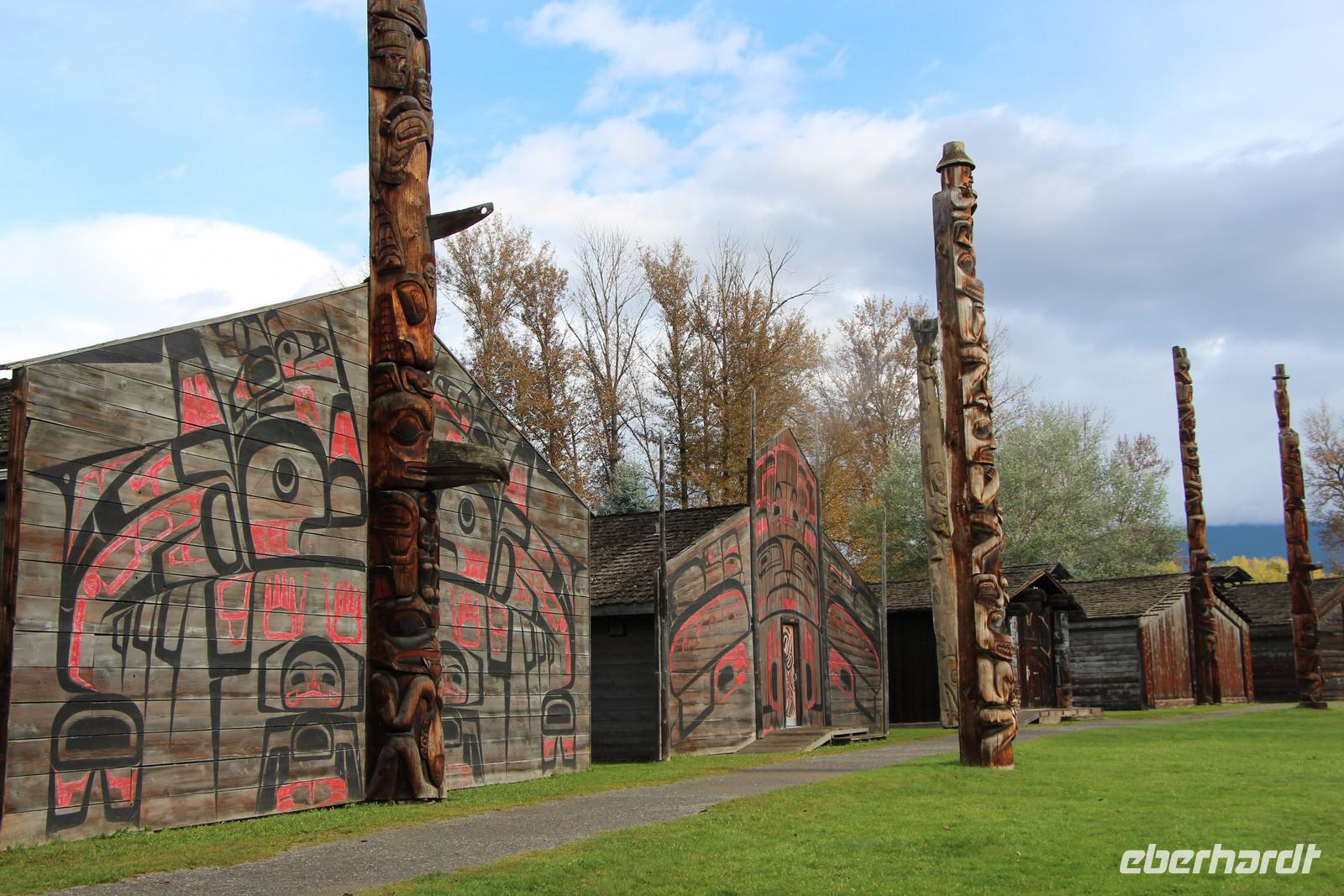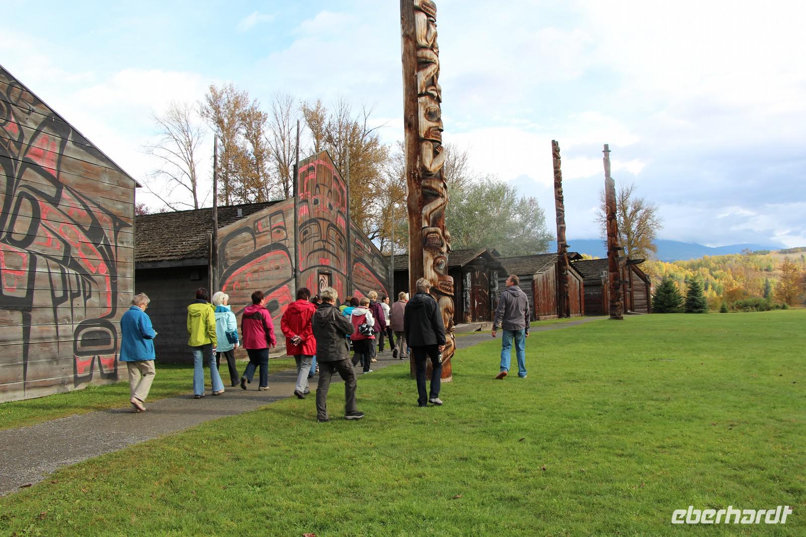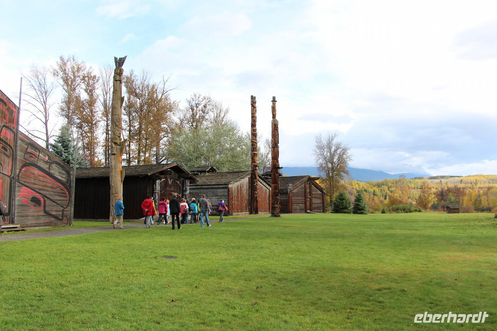 Über die beeindruckende Hängebrücke Hagwilget Bridge gelangen wir später zum Ksan Indian Village, ein Freilichtmuseum, das ein typisches Indianerdorf der Gitxsan-Indianer zeigt. In drei nachgebauten Langhäusern werden die Traditionen, das Alltagsleben und die Festlichkeiten der Indianerkultur gezeigt. In jedem Haus gibt es eine Audio-Führung in Deutsch, die die einzelnen Ausstellungsstücke erklärt. Wir bekommen einen sehr schönen Einblick in die Kultur und können einer jungen Frau der Gitxsan-Indianer unsere Fragen stellen. Totempfähle, ein kleines Räucherhaus, ein Grabhaus, ein Souvenirladen und ein kleines Museum gehören ebenfalls zur Anlage.