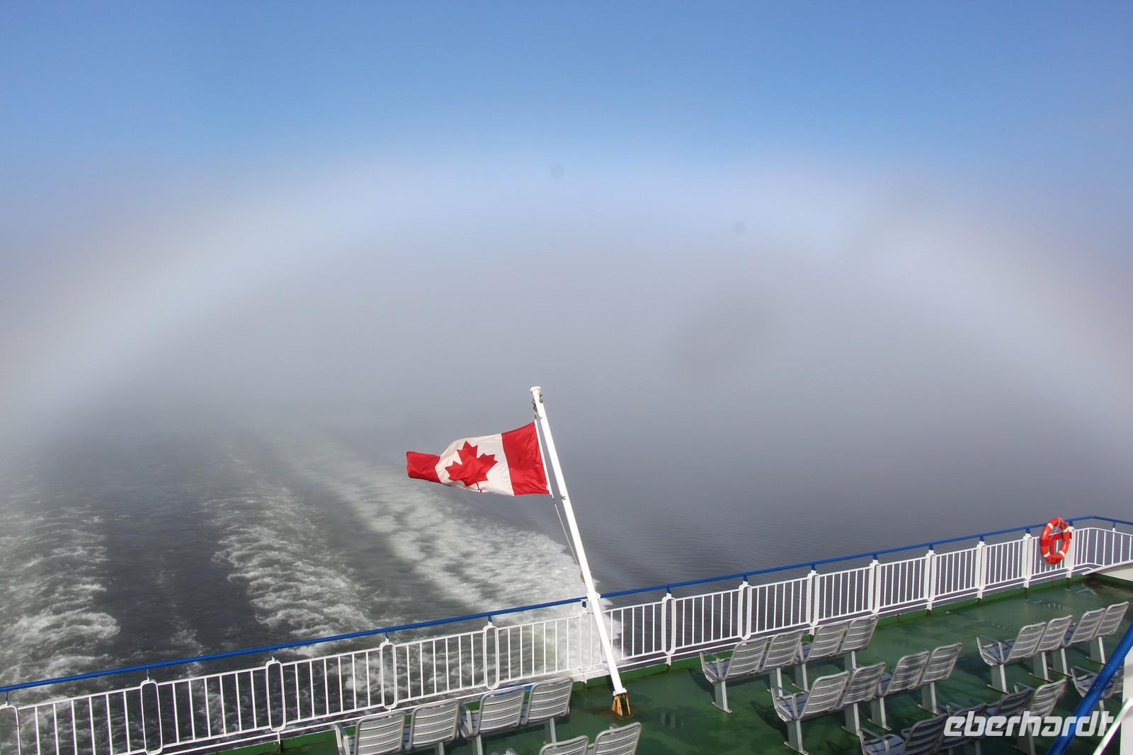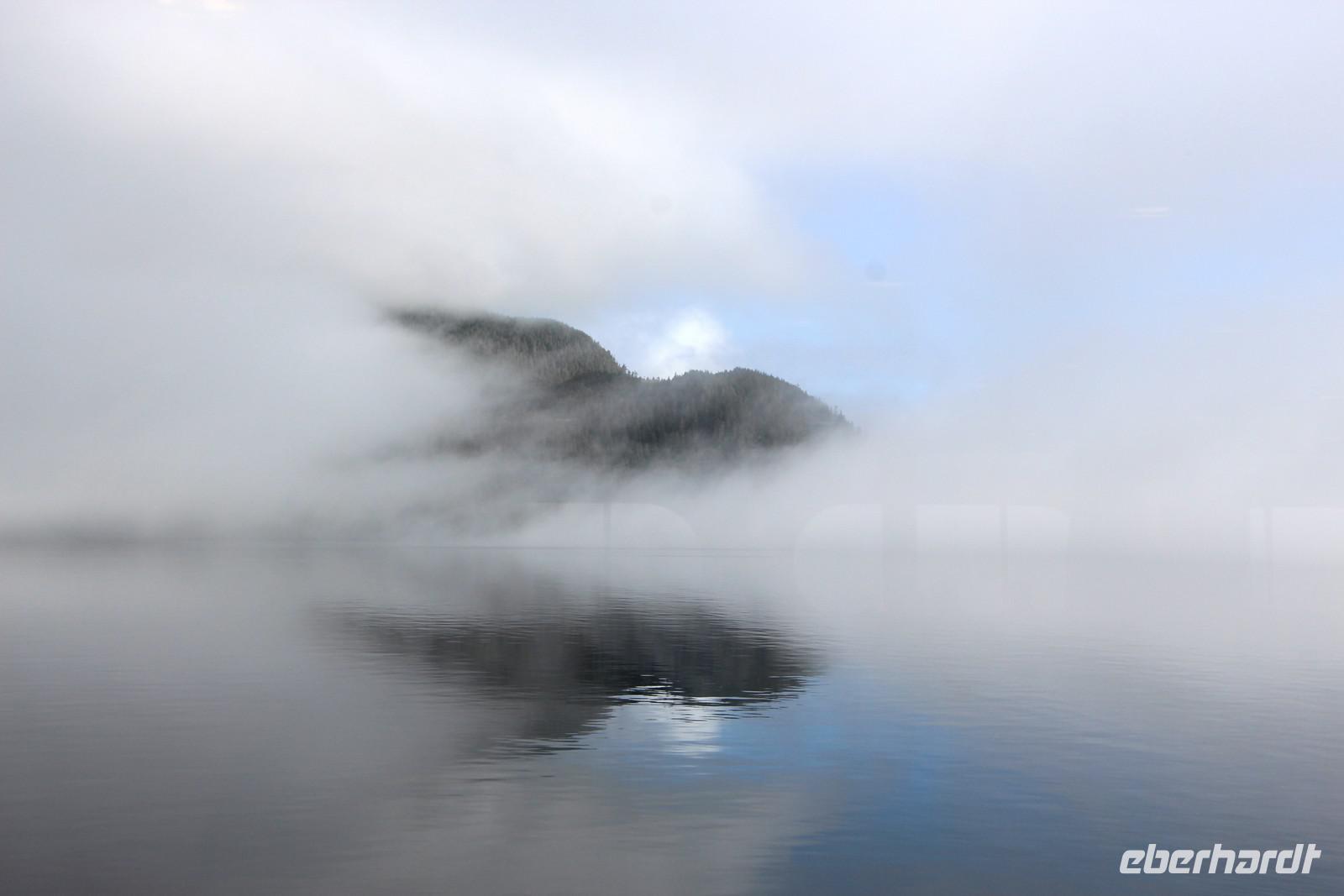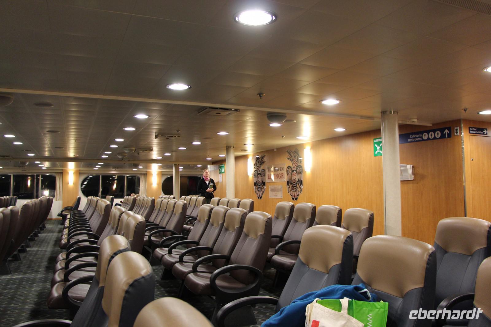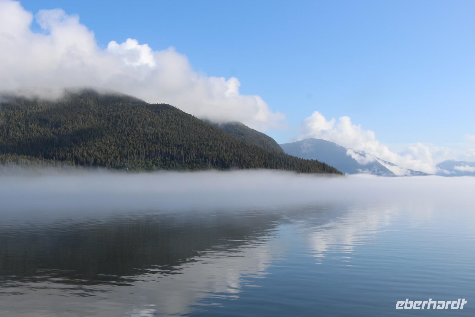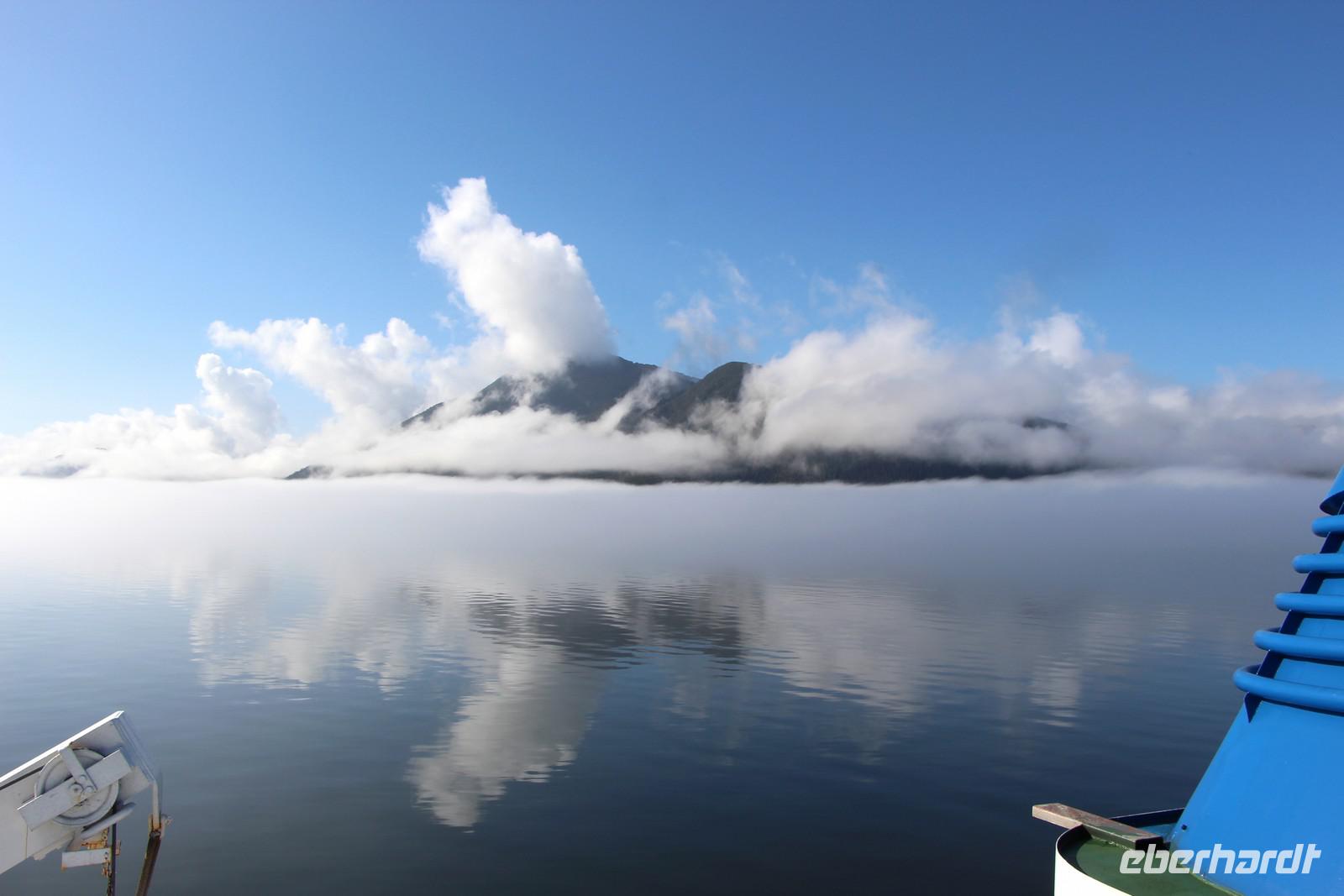 Der Tag beginnt sehr früh, denn heute fahren wir mit dem Fährschiff "Northern Adventure" die etwa 500 Kilometer lange Strecke der Inside Passage von Prince Rupert nach Port Hardy. Das Schiff legt um 7.30 Uhr ab. Insgesamt dauert die Schiffsfahrt entlang der Pazifikküste mit ihren grünen Fjorden und Inseln 16 Stunden. Unser Bus fährt im Parkdeck der Fähre mit. Wir haben Glück mit dem Wetter, es ist zwar am Vormittag etwas neblig, aber das schafft einen besonderen Reiz beim Betrachten der vorbeiziehenden Landschaft. Man kann sich draußen an Deck aufhalten oder innen in den Aufenthaltsräumen mit bequemen Sesseln oder im Bordrestaurant. Frühstück und Abendessen nehmen wir hier alle gemeinsam an Bord ein. Mit etwas Glück kann man während der Fahrt Vögel, Delfine und Wale beobachten.