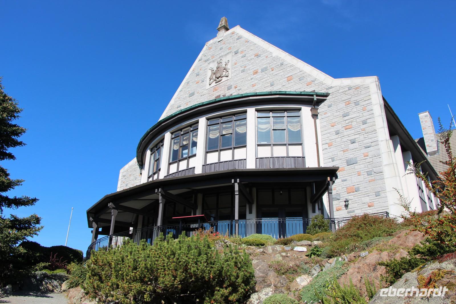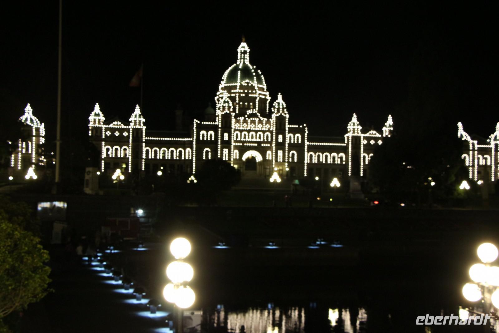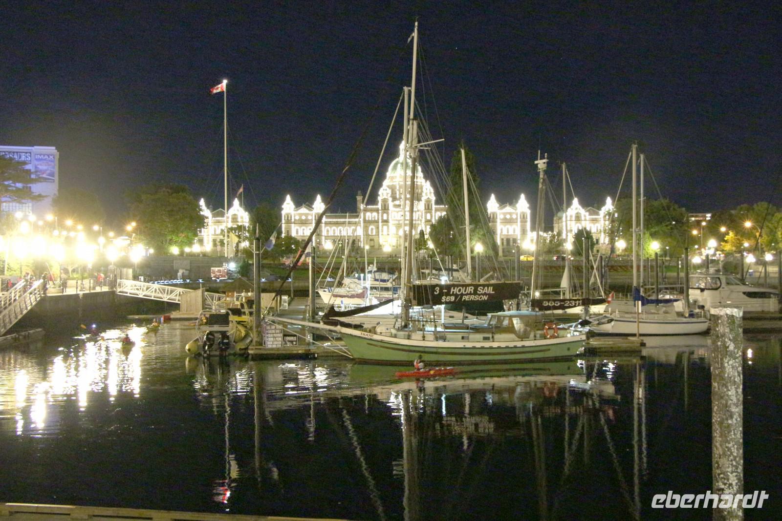Am frühen Abend erreichen wir Victoria. Der Weg führt uns zunächst auf den Mount Tolmie, von dem wir die herrliche Aussicht auf die Südspitze von Vancouver Island in der Abendsonne genießen. Durch die Stadtteile der "Reichen und Schönen" an der Pazifikküste gelangen wir schließlich in die Innenstadt von Victoria und beziehen unser Hotel "Quality Inn Downtown" im Zentrum. Von hier sind es nur ein paar Gehminuten hinunter zum Inneren Hafen, wo am Abend das Parlamentsgebäude Victorias mit tausenden Glühbirnen beleuchtet ist. Im Restaurant "Milestone's" direkt am Hafen gegenüber dem Parlament haben wir heute unser gemeinsames Abendessen.