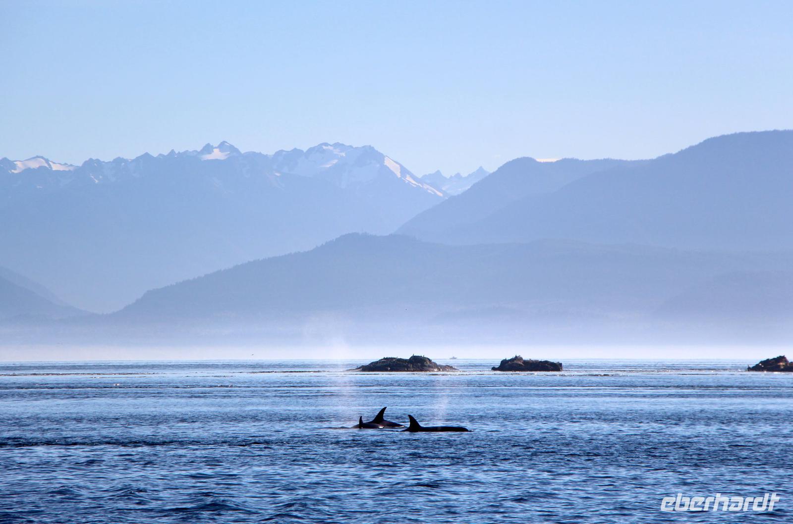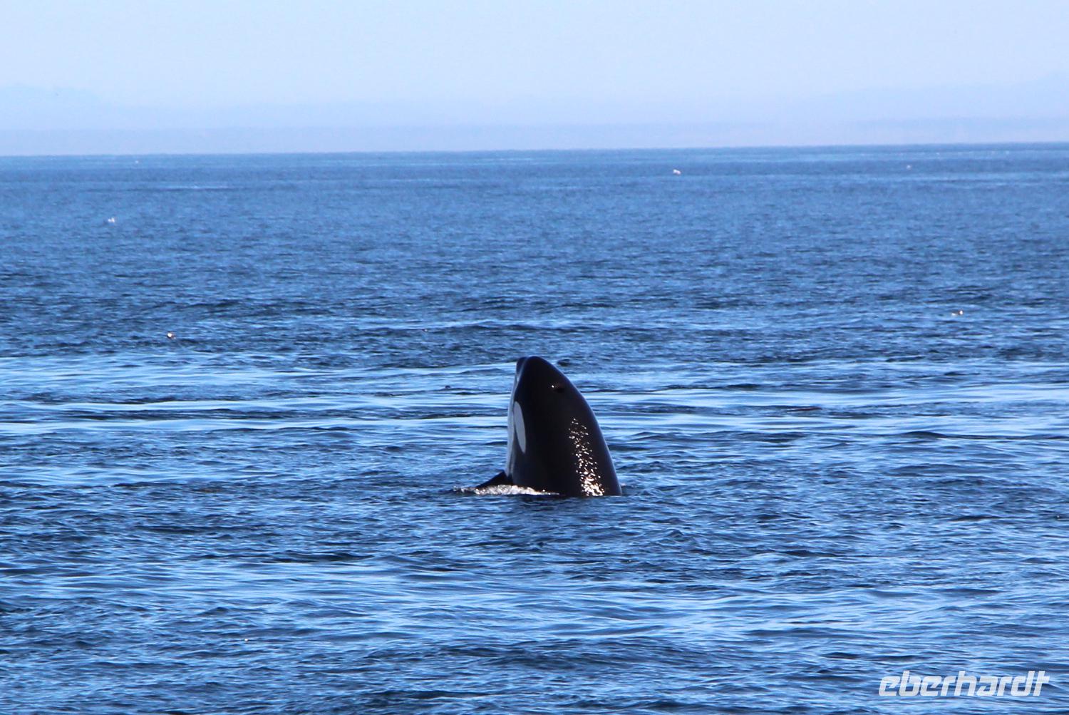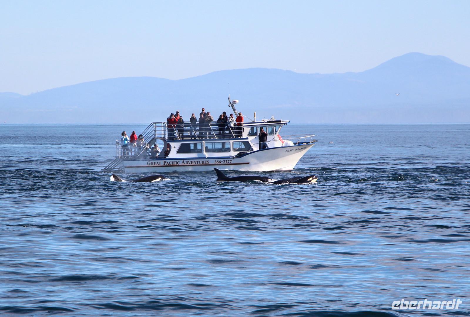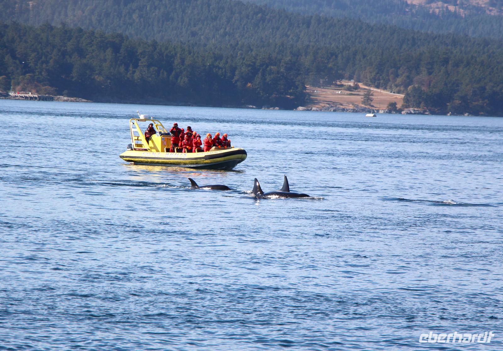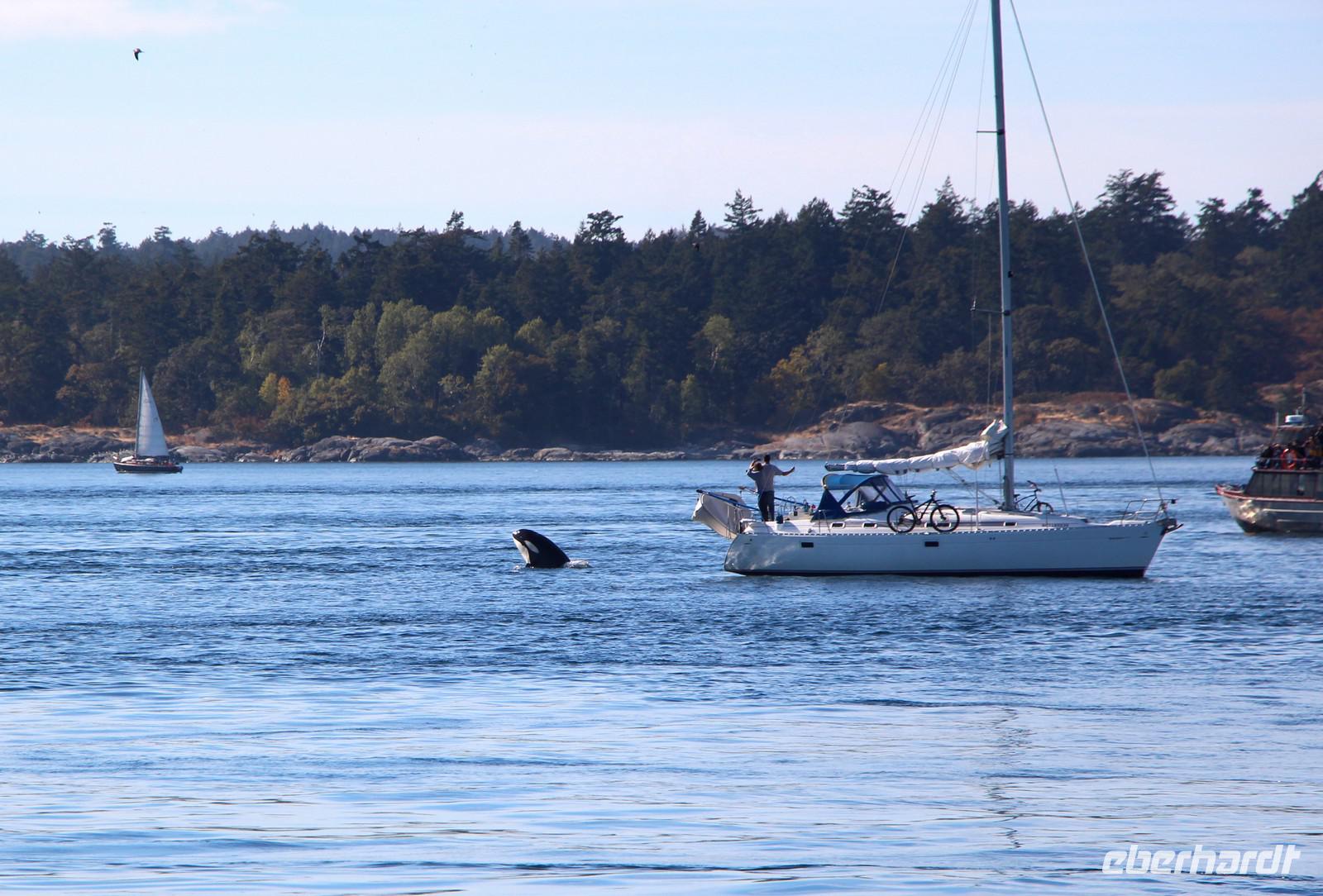 Am Nachmittag gibt es die Möglichkeit, eine Bootsfahrt zur Walbeobachtung zu unternehmen. Ich nehme diese mit einigen Gästen unserer Gruppe auf jeden Fall wahr. Und es wird sich lohnen! Mit einer schicken kleinen Jacht fahren wir am Inneren Hafen von Victoria los vor die Küsten Vancouver Islands in der „Strait of Juan de Fuca". Schon nach etwa 45 Minuten Fahrt haben wir Glück und sehen eine Familie von Orcas (Killerwalen) auf der Jagd. Auf kleinen Inseln tummeln sich Seelöwen und die Wale versuchen, diese ins Wasser zu treiben. Immer wieder tauchen die schwarzen Rückenflossen aus dem Wasser auf und wir hören das Ausblasen der Wale beim Atmen. Auch das Spektakel auf den dicht bevölkerten Robbeninseln wird uns ewig im Gedächtnis bleiben. Nach etwa 3 Stunden auf See kehren wir zurück in den Hafen von Victoria.