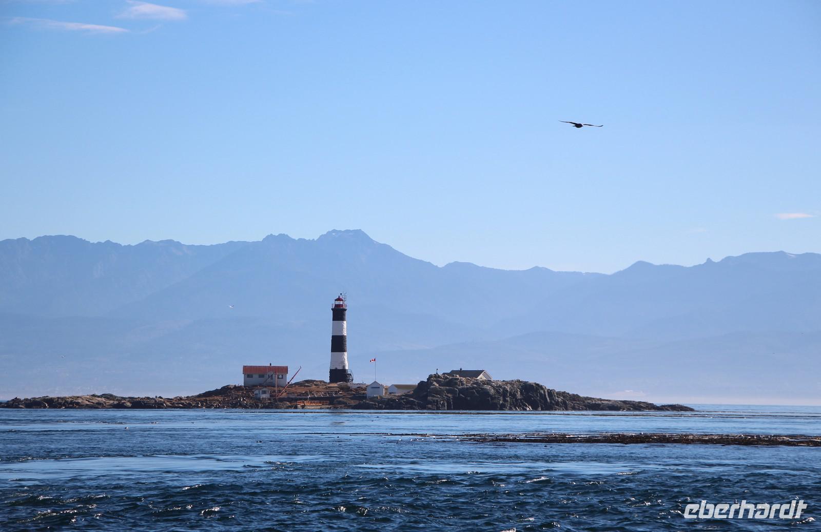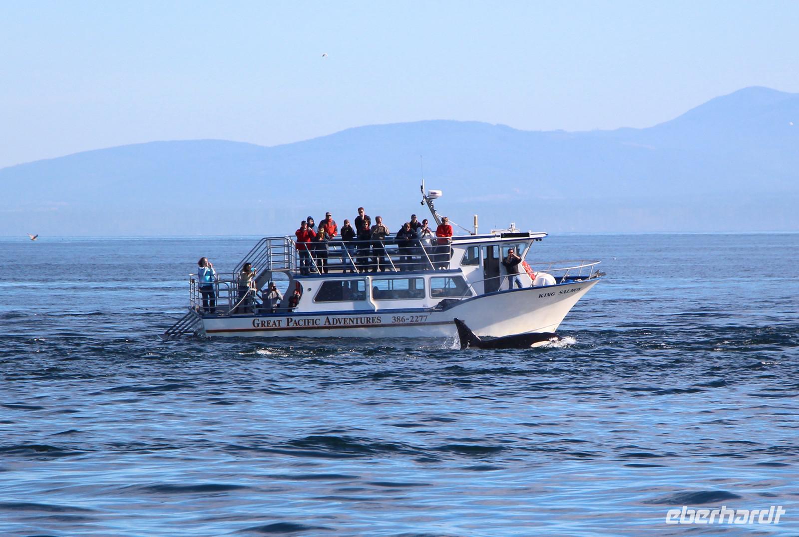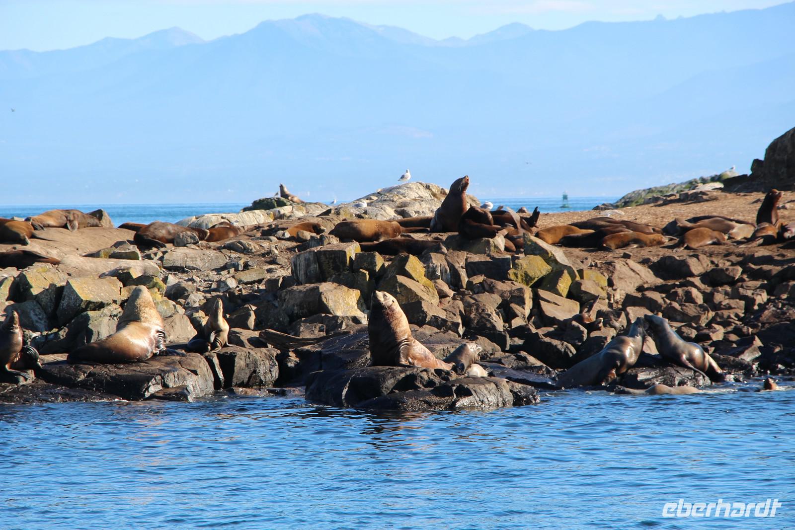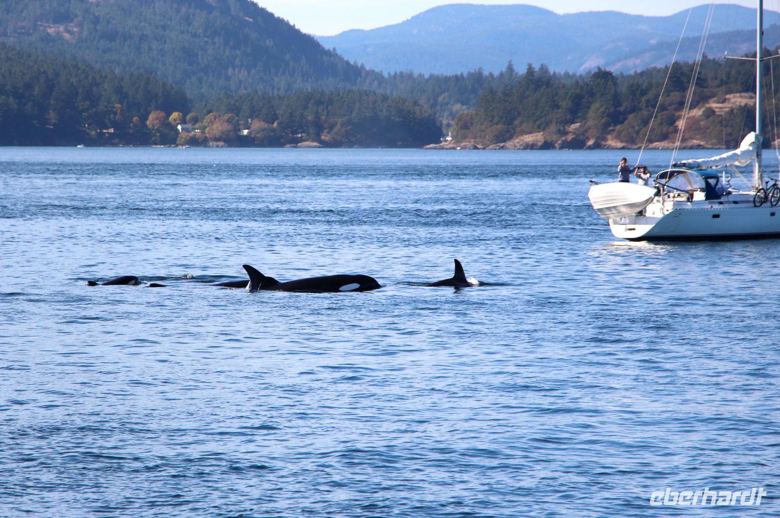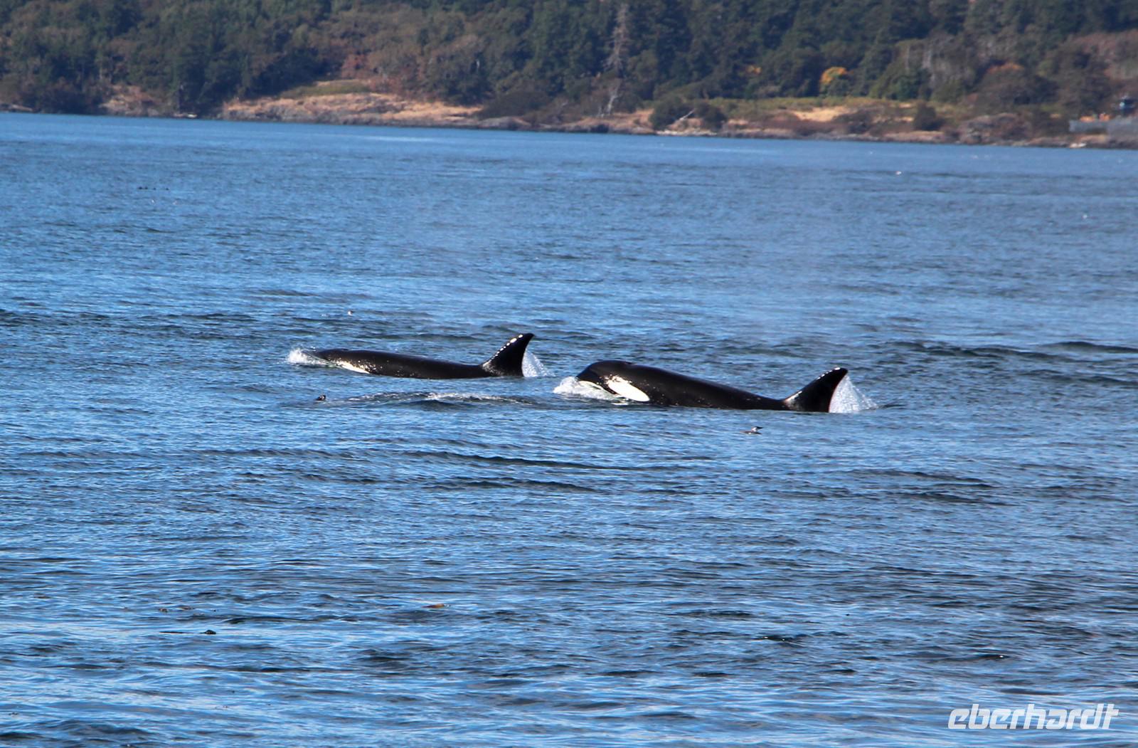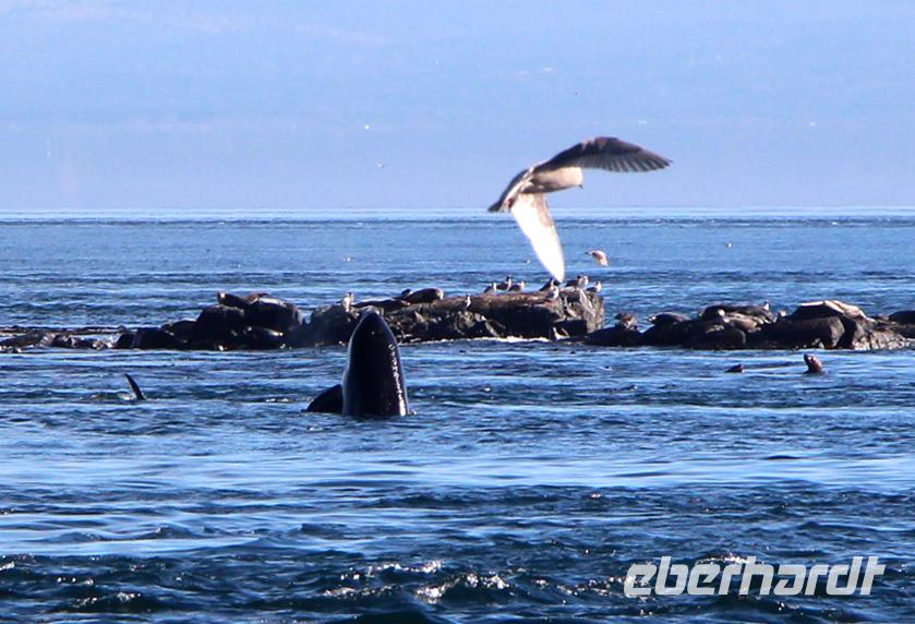 Am Nachmittag gibt es die Möglichkeit, eine Bootsfahrt zur Walbeobachtung zu unternehmen. Ich nehme diese mit einigen Gästen unserer Gruppe auf jeden Fall wahr. Und es wird sich lohnen! Mit einer schicken kleinen Jacht fahren wir am Inneren Hafen von Victoria los vor die Küsten Vancouver Islands in der „Strait of Juan de Fuca". Schon nach etwa 45 Minuten Fahrt haben wir Glück und sehen eine Familie von Orcas (Killerwalen) auf der Jagd. Auf kleinen Inseln tummeln sich Seelöwen und die Wale versuchen, diese ins Wasser zu treiben. Immer wieder tauchen die schwarzen Rückenflossen aus dem Wasser auf und wir hören das Ausblasen der Wale beim Atmen. Auch das Spektakel auf den dicht bevölkerten Robbeninseln wird uns ewig im Gedächtnis bleiben. Nach etwa 3 Stunden auf See kehren wir zurück in den Hafen von Victoria.