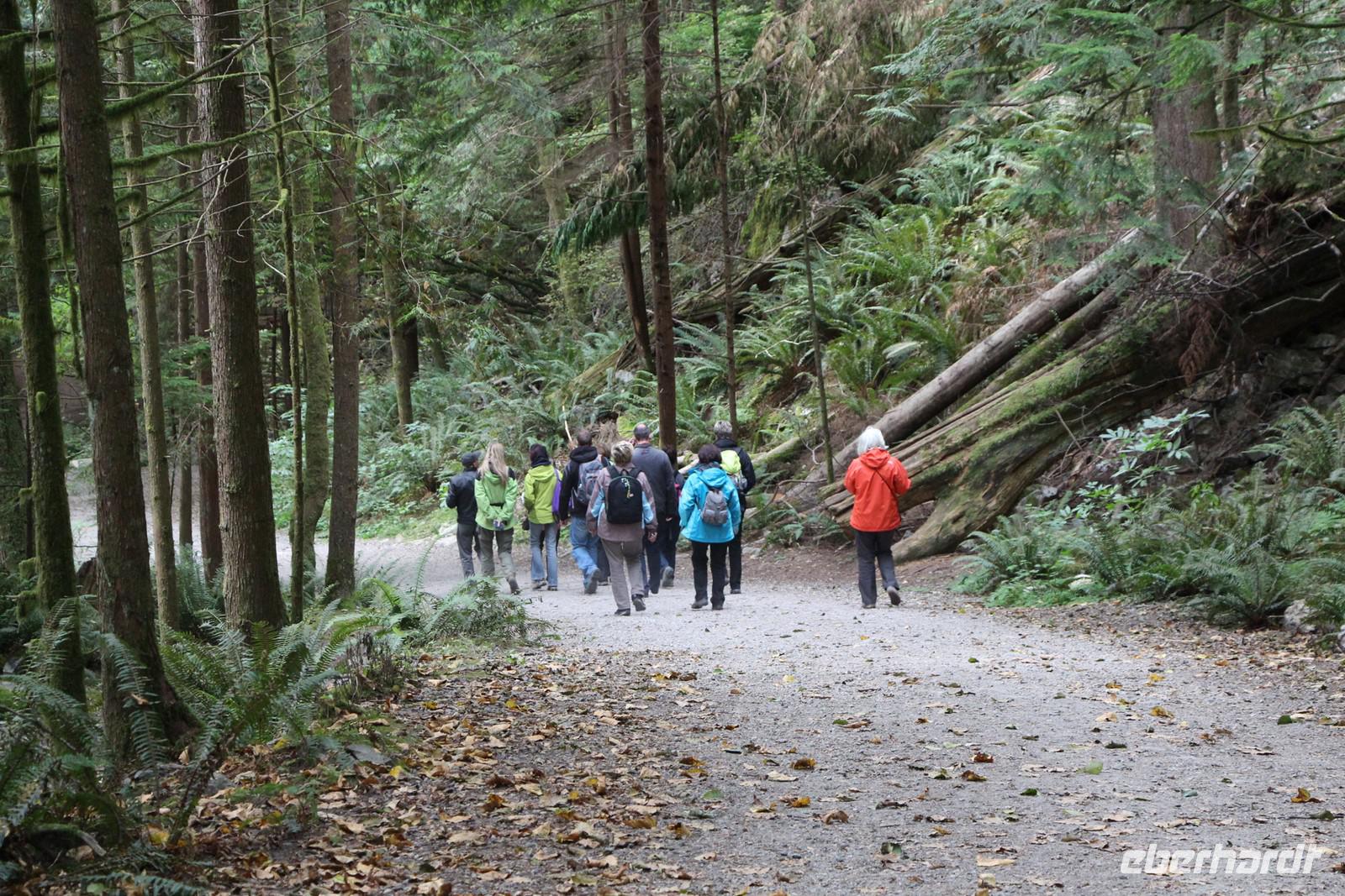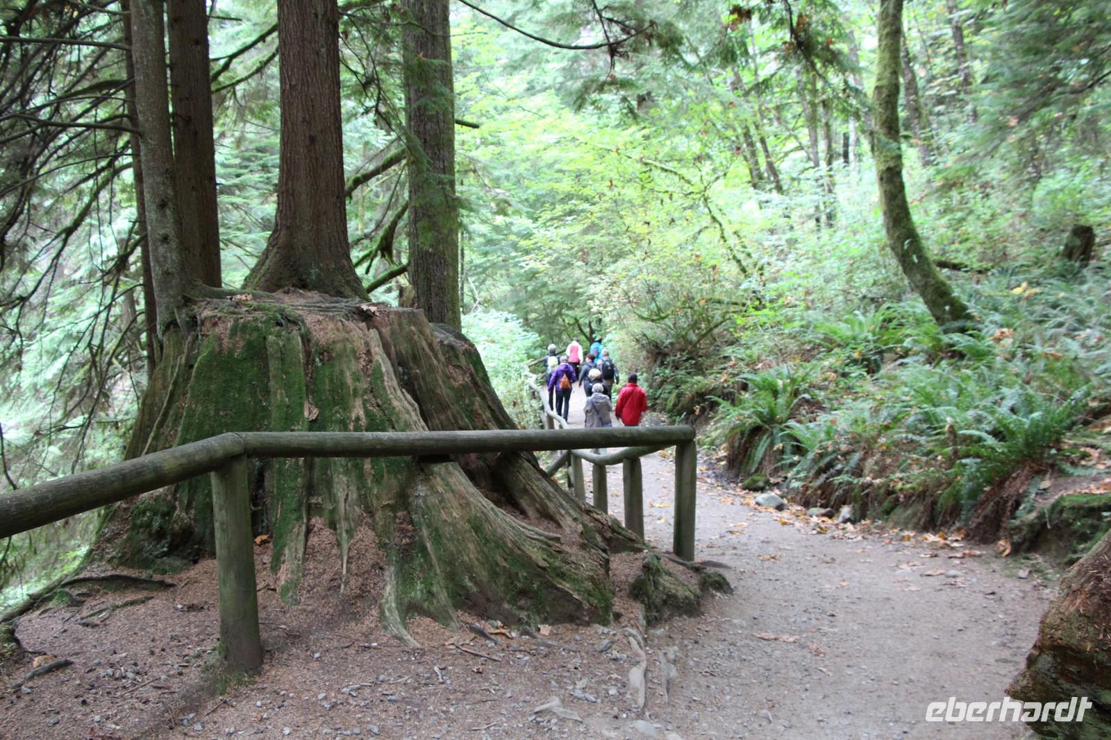 Den Tag vor unserer Abreise kann man nutzen, um Vancouver noch einmal individuell zu erkunden oder für einen Ausflug in den grünen Norden der Stadt. Die meisten Gäste unserer Gruppe entscheiden sich für den Ausflug. Über die Lion's Gate Bridge fahren wir mit dem Bus in den Nordteil von Vancouver. Bei einer Wanderung mit Start am Capilano-Stausee entdecken den urwüchsigen Wald mit seinen riesigen Zedern und Douglasien. Auf schmalen Wanderpfaden, über Brücken und Holzstege erreichen wir eine kleine Lachszuchtstation am Capilano River. Hier werden die verschiedenen Lachsarten wie Chinook Salmon, Pink Salmon und Sockeye Salmon vorgestellt und an einer Fischtreppe können wir die Lachse beim Wandern sehen.