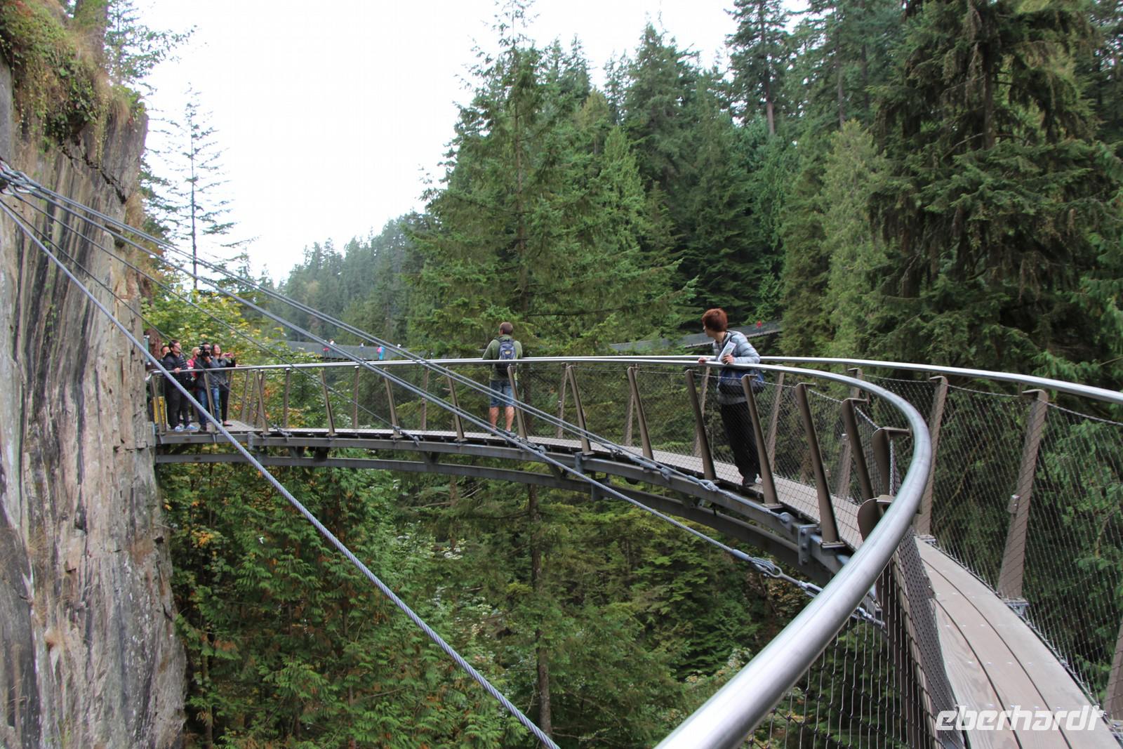 Nächster Programmpunkt ist der Besuch des Capilano Suspension Parkes mit einer der längsten Hängebrücken Nordamerikas. Die Capilano Suspension Bridge ist in 70 Metern Höhe und 136 Meter lang. Auf der anderen Seite der Brücke spazieren wir durch den Baumkronenpfad durch die Wipfel der Mammutbäume. Neu ist der Cliffwalk, eine frei schwebende schmale Brücke über der Capilano-Schlucht.