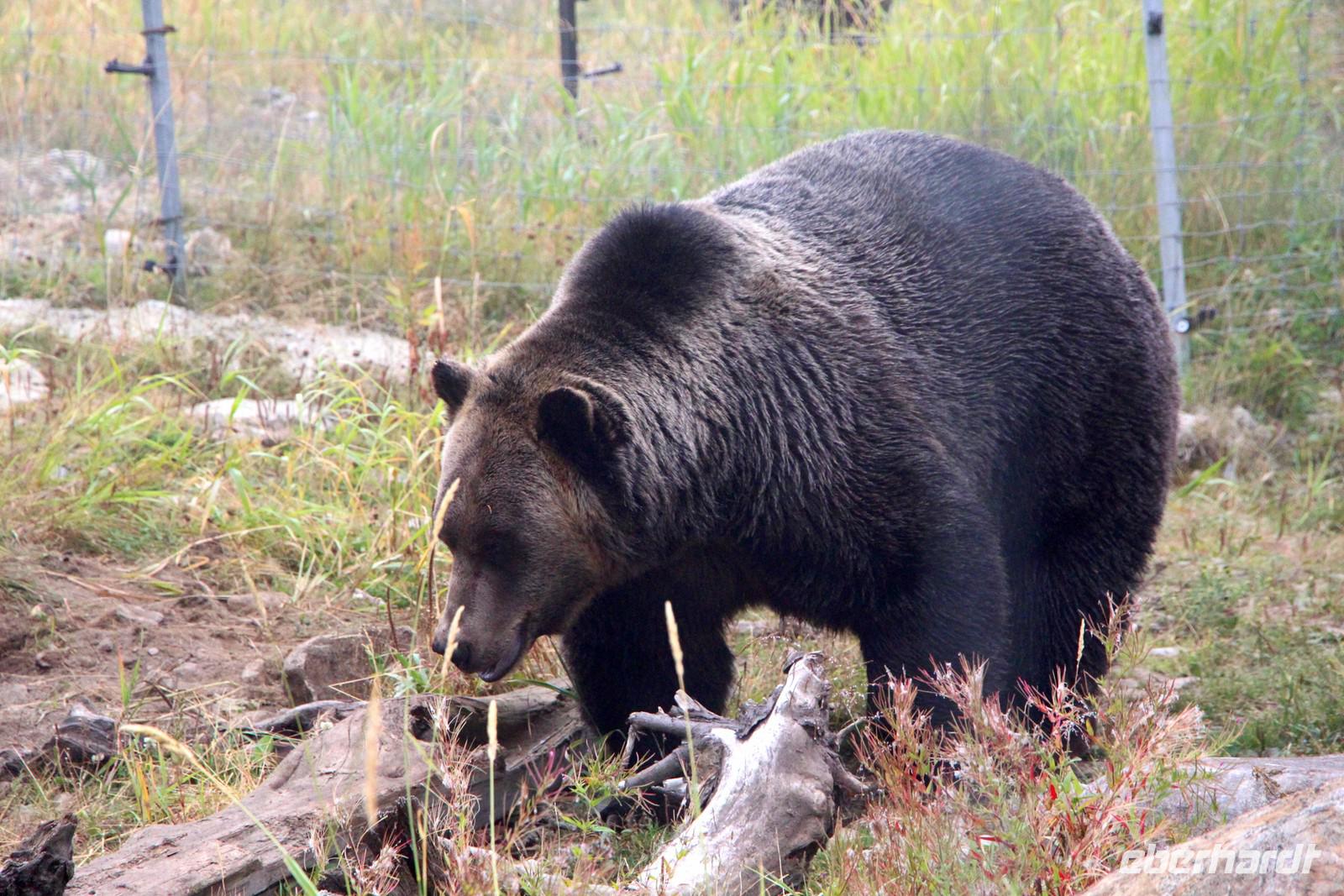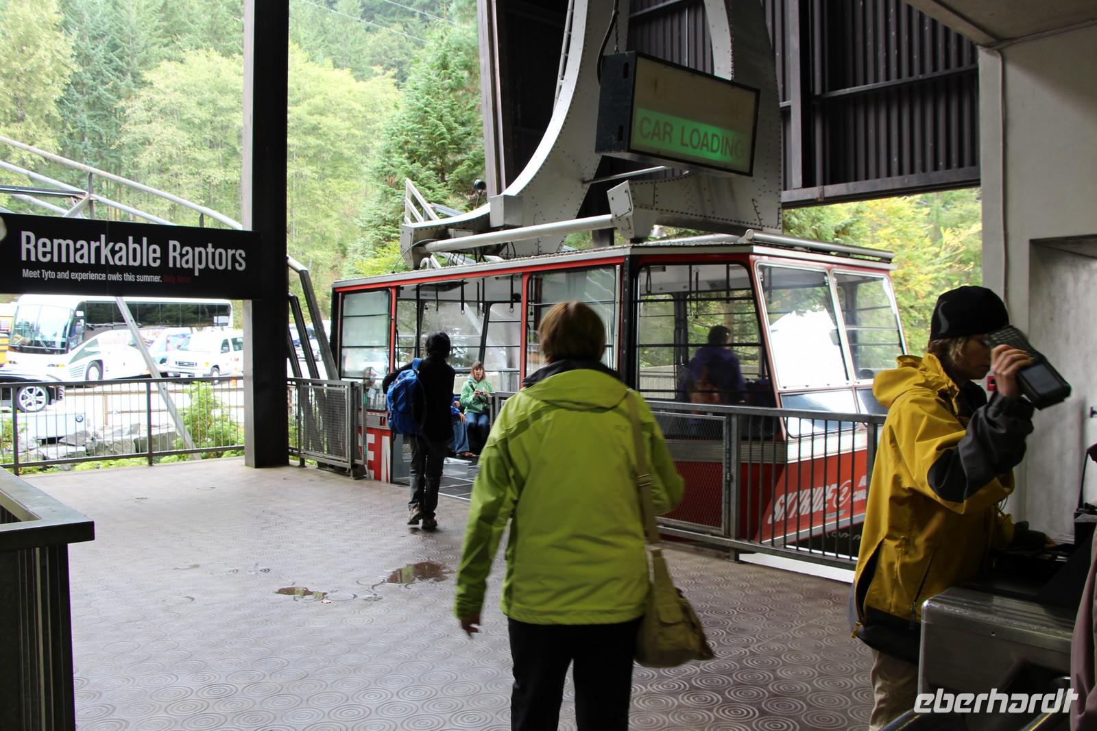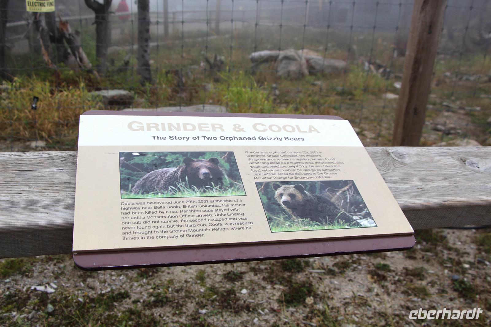 Danach erwartet der Hausberg Vancouvers - Grouse Mountain (1231 Meter) - unseren Besuch. Mit der Gondelbahn fahren wir in etwa 10 Minuten nach oben. Das Wetter ist heute nicht so optimal hier oben. Der Berg ist wolkenverhangen, sodass wir nur bei der Auffahrt einen Ausblick auf Vancouver genießen können. Bei einem Film im Sky Theater sehen wir British Columbia aus der Vogelperspektive. Ein Spaziergang auf dem Grouse Mountain führt uns an riseigen geschnitzten Holzskulpturen vorbei zum Bärengehege, wo die Grizzlybären Grinder und Coola leben. Endlich sehen wir echte kanadische Bären!