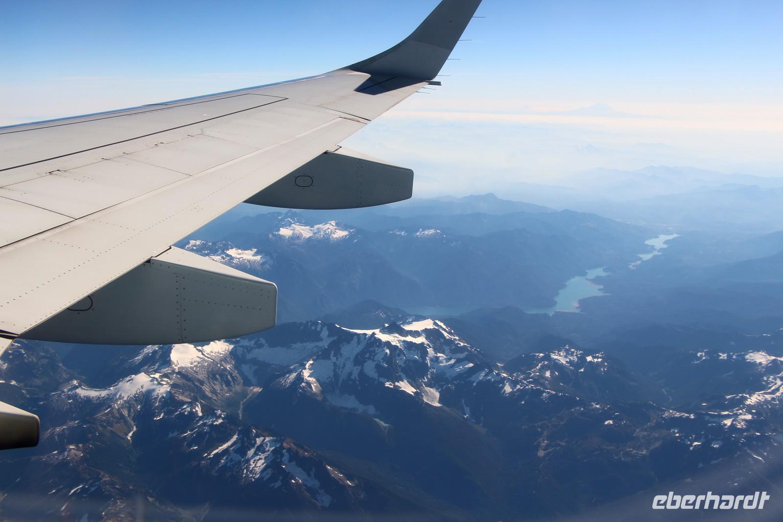 Je nach gebuchter Anreise gelangen alle Reisegäste mit einem Lufthansa-Zubringerflug von Dresden, Leipzig oder Berlin bzw. per Bahn zu unserem Hauptflughafen Frankfurt/Main. Am Abfluggate nach Calgary ist die Reisegruppe schließlich komplett und wir fliegen mit Air Canada nach Calgary. Der Bordservice ist sehr gut. Wir bekommen auf dem 9,5 Stunden langen Flug ein Mittagessen und einen Snack kurz vor Ankunft in Calgary. Im Flugzeug erhalten wir die Zollformulare für die Einreise nach Kanada. Diese müssen wir bei der Passkontrolle vorzeigen und später beim Verlassen des Transit-Bereiches beim Zollbeamten abgeben.