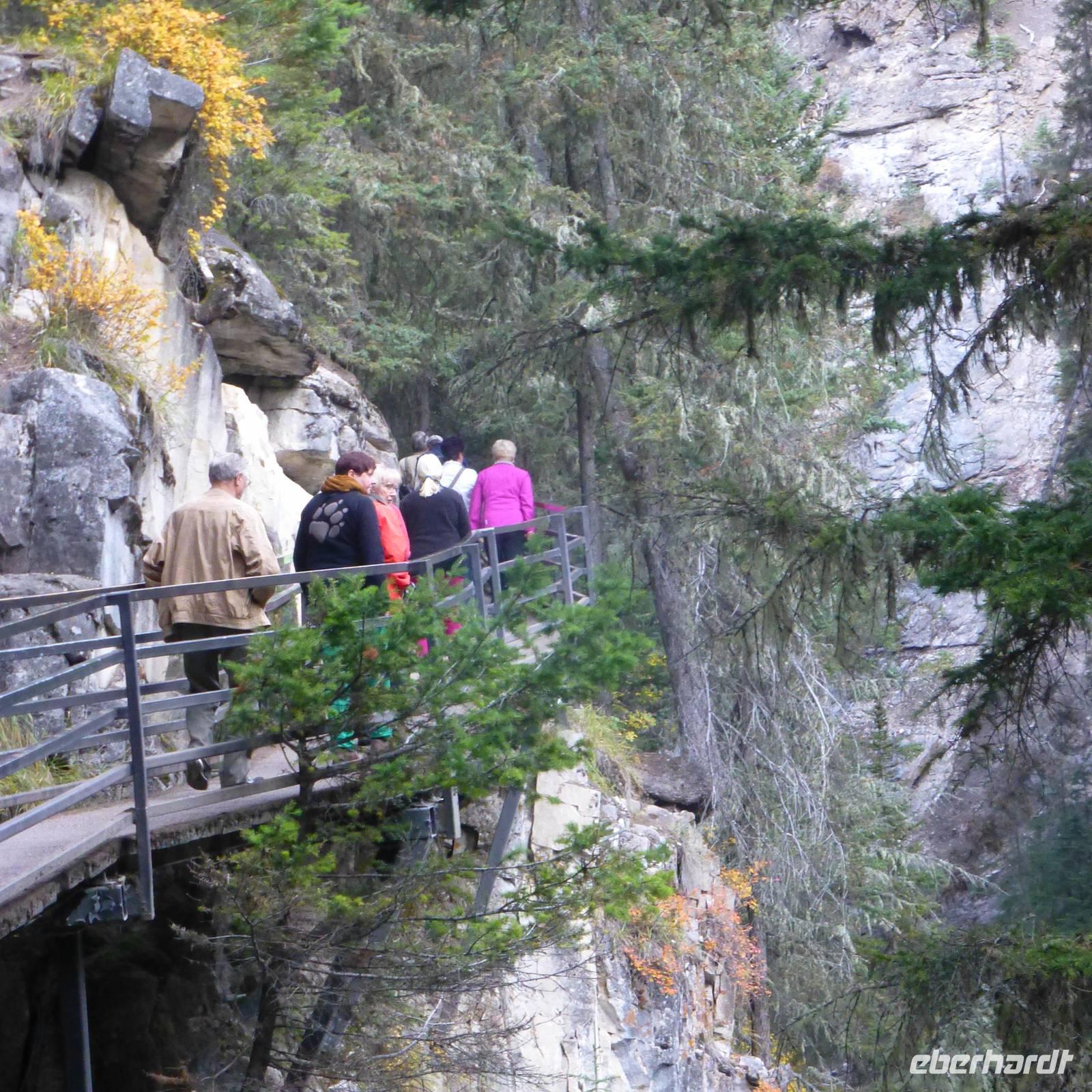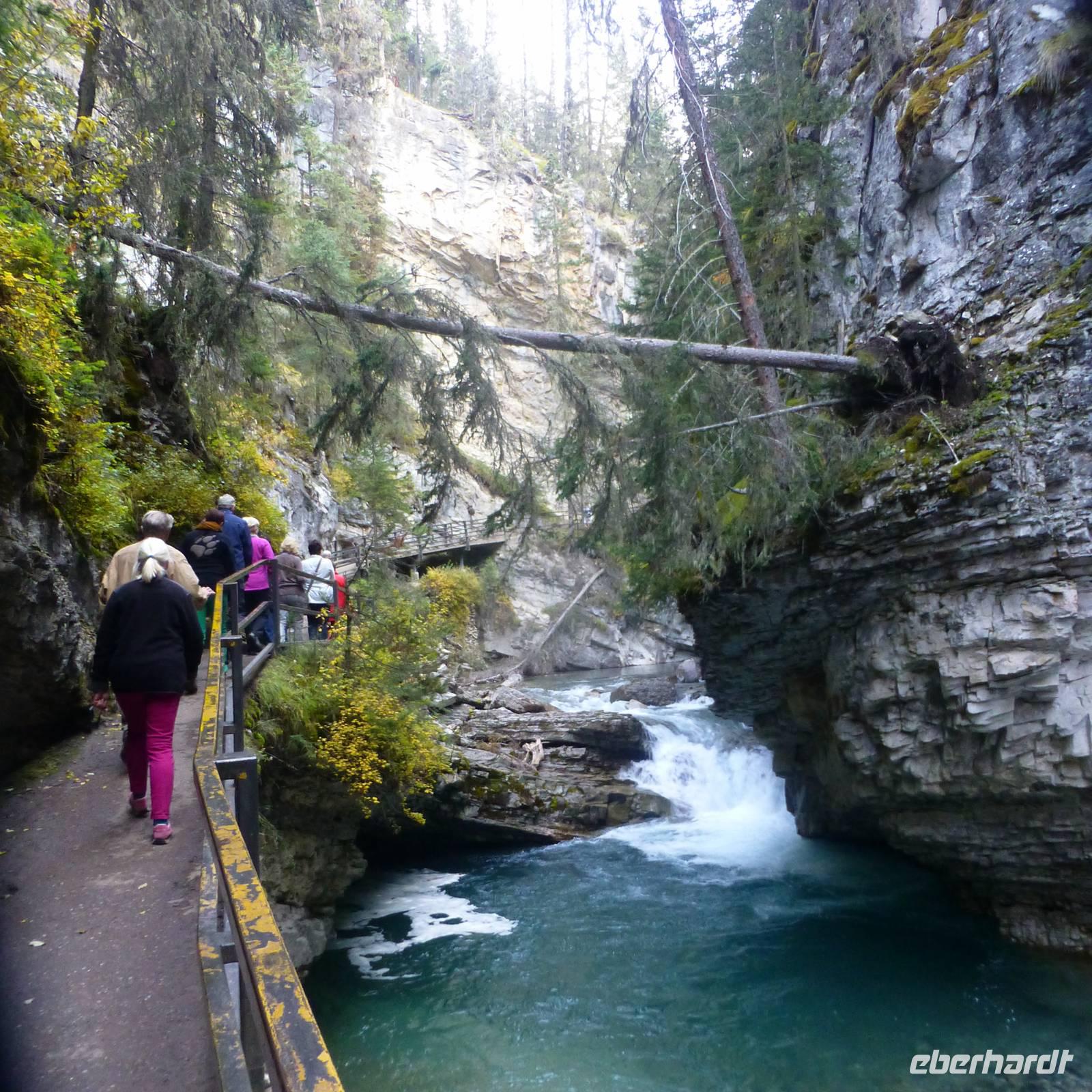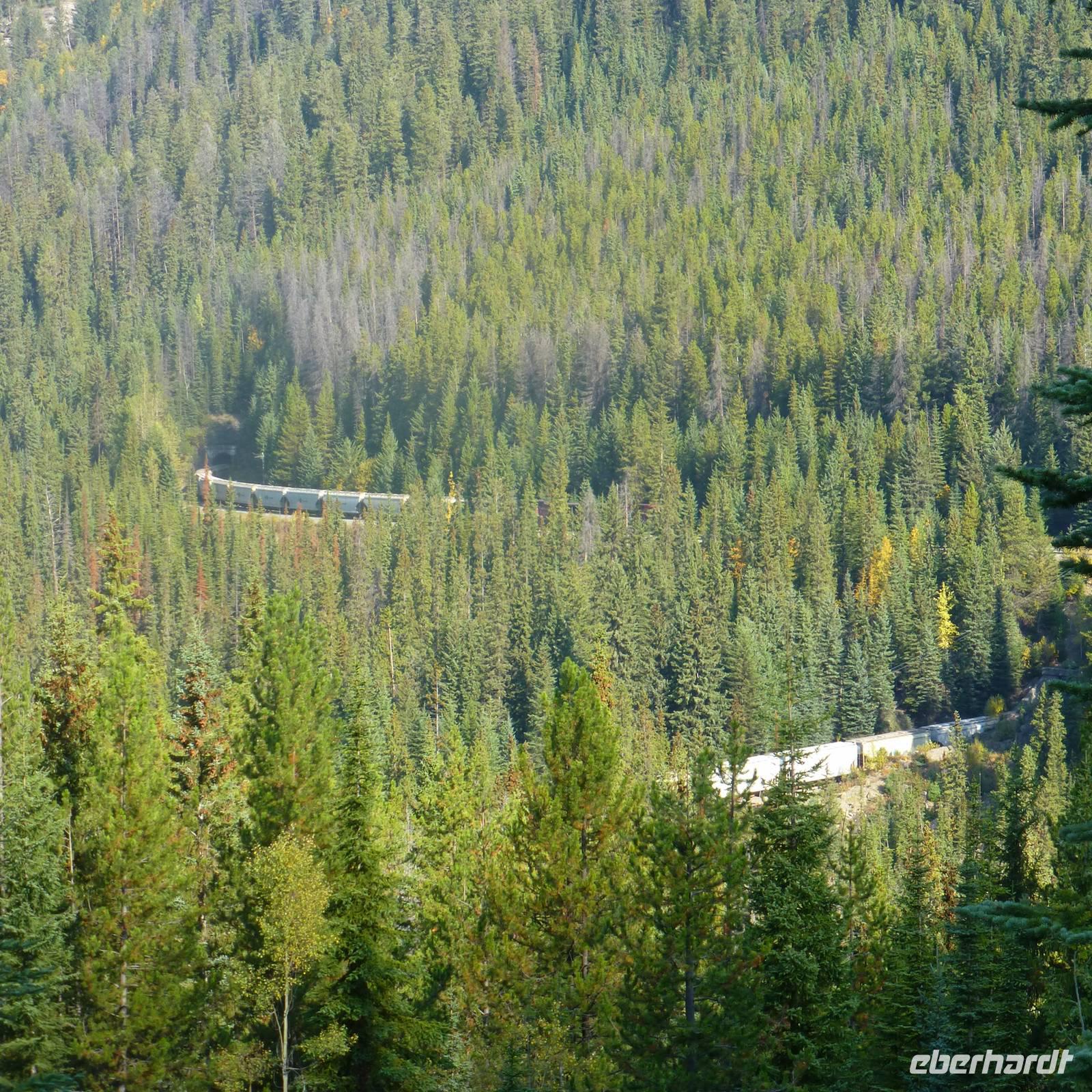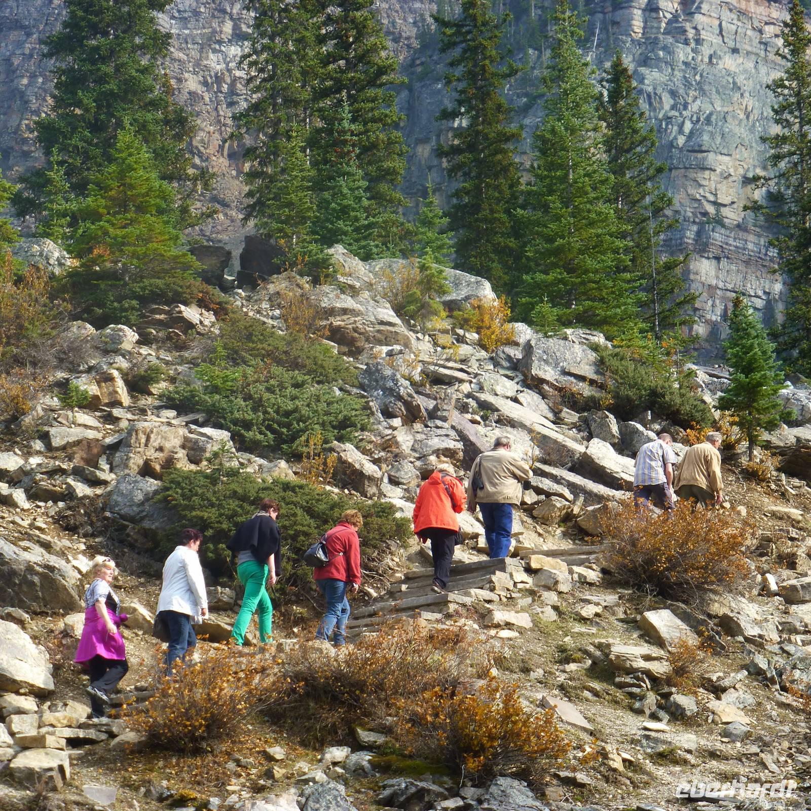 Unser Ausflug führte uns in den Banff Nationalpark. Wir unternahmen einen Spaziergang im Johnston Canyon zum unteren Wasserfall. Vorbei am Tempel Mountain erreichten wir über den Waschbeckensee und den Kicking Horse Pass1200m - den Spiraltunnel. Er wurde gebaut um die Steigungen zu minimieren. Wir hörten es donnert und wir hofften einen Zug zusehen. Wir hatten Glück. Ein einmaliges Schauspiel als der Zug aus einem Tunnel hinein fuhr und an einem anderen Tunnel wieder heraus. Alles sah aus wie auf einer Eisenbahnplatte. Weiter gingt es in das Herz des Yoho Nationalpark in den kleinen Ort Field und an den Emerald Lake - Schmaragdsee. Die Bergkulisse und das Türkisblaue Wasser hat uns begeistert. Ein besonderer Höhepunkt war der Besuch am Lake Louis - das meist fotographierte Motiv in Kanada. Nach einem Rundgang durch das Fairmont Chateau Lake Louise spazierten wir entlang des Sees. Viele Fotomotive erfreuten unser Gemüt. Besonders schön ist der Mount Victoria, dessen Gletscher weit bis an das Wasser reicht.