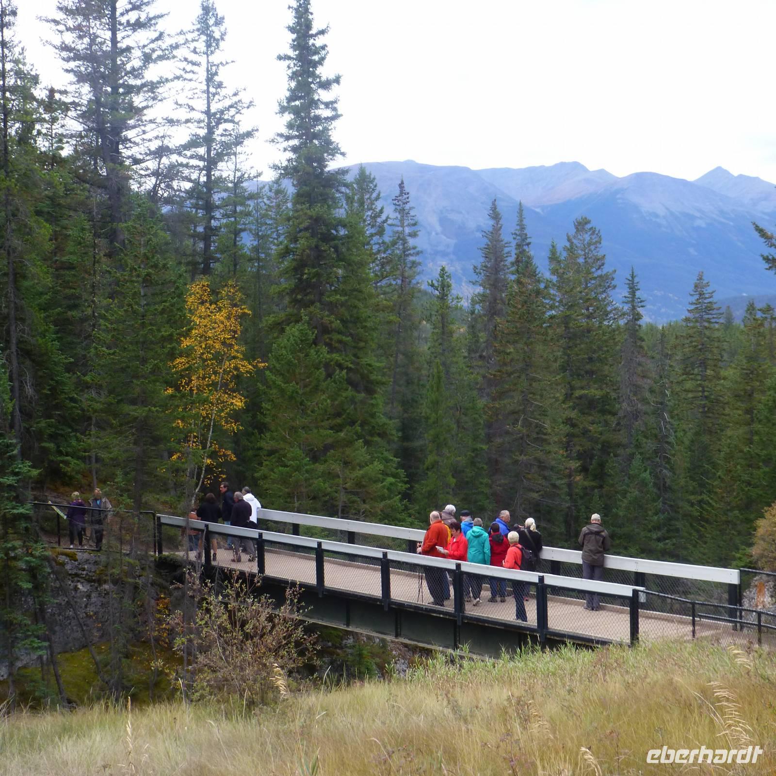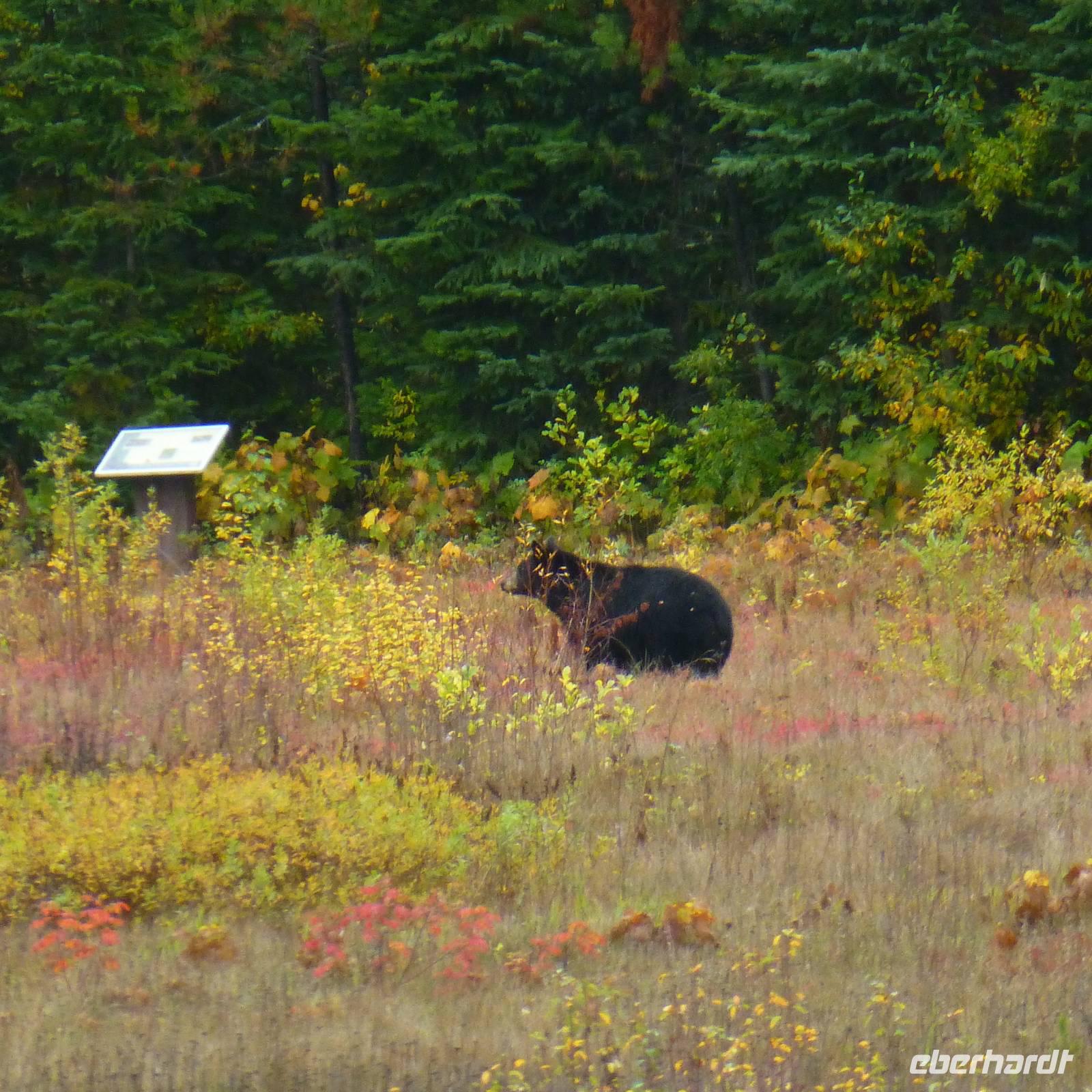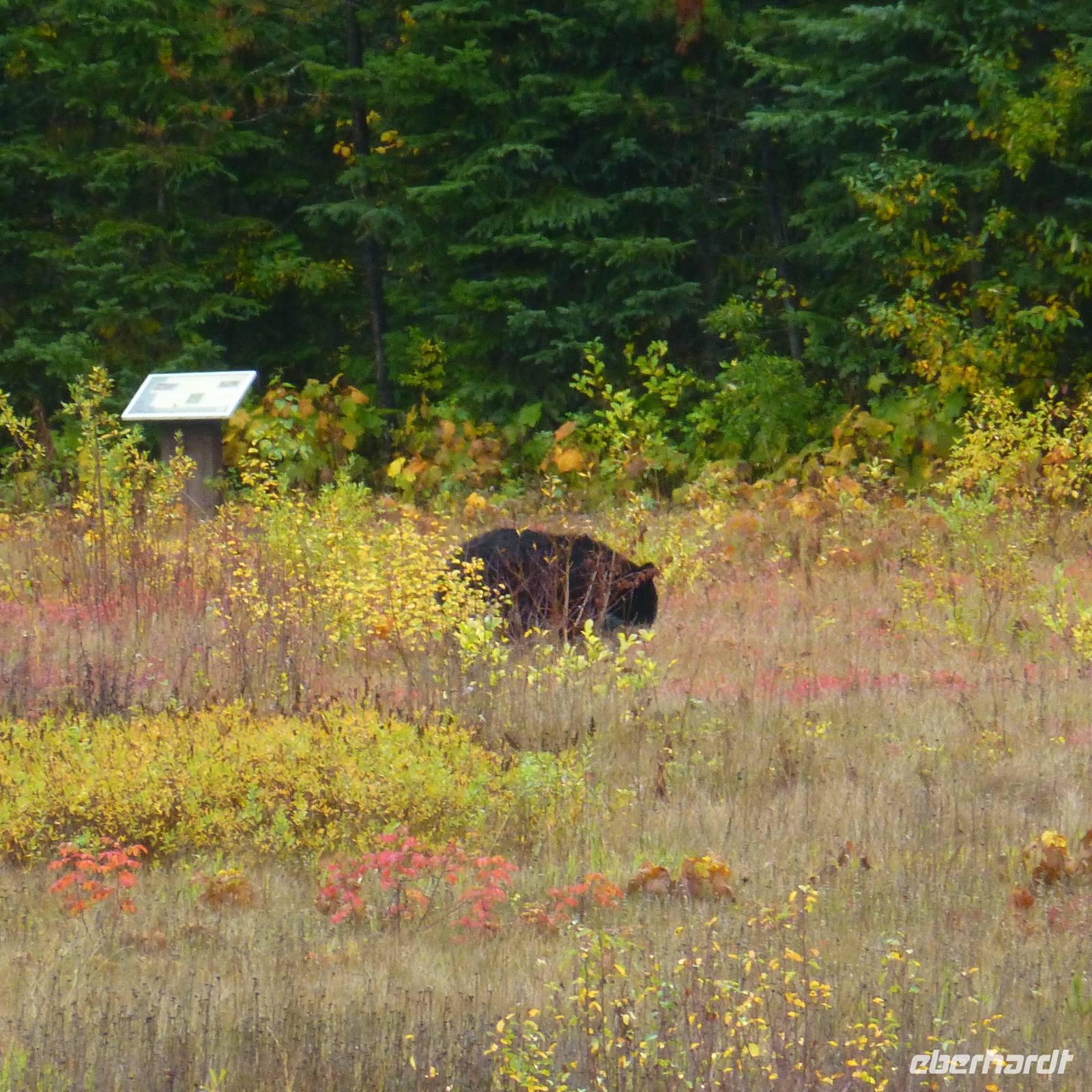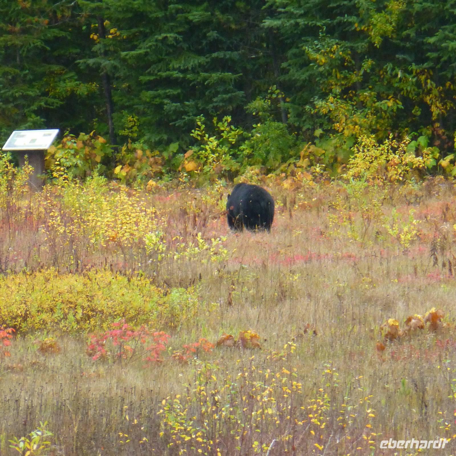 Leider war wieder keine Sonne zu sehen. Unser erstes Ziel waren die Athabasca Wasserfälle. Sehr gewaltig. Der Athabasca Fluss stürzt über einen Felsvorsprung in einen schmalen Canyon in die Tiefe und bahnt sich seinen Weg durch das Felsgestein und stürzt einige Meter in die Tiefe. Man spürte die Kraft des Wassers. Es war sehr beindruckend. Leider fängt es wieder an zu regnen. Wir erreichten Jasper und fuhren zum Patrizia See und weiter zum Pyramiden See. Aussteigen lohnt sich nicht den es lag alles im Regen. Auf dem Yellowhead-Highway fuhren über den Yelloheedpass an die Grenze. Wir verließen Alberta und weiter ging es nach Britisch Columbia. Das bedeutete unsere Uhren noch einmal 1 Stunde zurück zu stellen .Wir erreichten den Mount Robson Provincial Park. Entlang der High Mountain Road fuhren wir über den Fraser River. Vorbei am Moosee kamen wir am Mount Robsen Center an. Plötzlich ein Auflauf - ein Schwarzbär ließ sich nicht aus der Ruhe bringen. Die Kameras klickten ununterbrochen. Weiter ging es zu den Reargard Falls. Hier befindet sich der nördlichste Punkt wohin die Königslachse kommen, wenn sie nach einer langen und anstrengenden Reise versuchen, die Fälle zu überqueren, um zu ihren Laichgründen zu gelangen. Leider waren keine mehr zu sehen. Entlang des Thomsen River fuhren wir in Wieglers Heli Ski Resort. Uns erwarteten tolle Holzhäuser mit mehreren Zimmern und einem gemütlichen Gemeinschaftsraum. Kaffeemaschinen waren auch vorhanden und so ließen wir es uns schmecken. Nach der Kaffeepause spazierten wir zum See und wurden durch eine schöne Laubfärbung überrascht. Nach dem Abendessen in Tonys Grill, wo es die leckersten Steaks der gesamten Reise gab, setzten wir uns noch gemütlich zusammen.