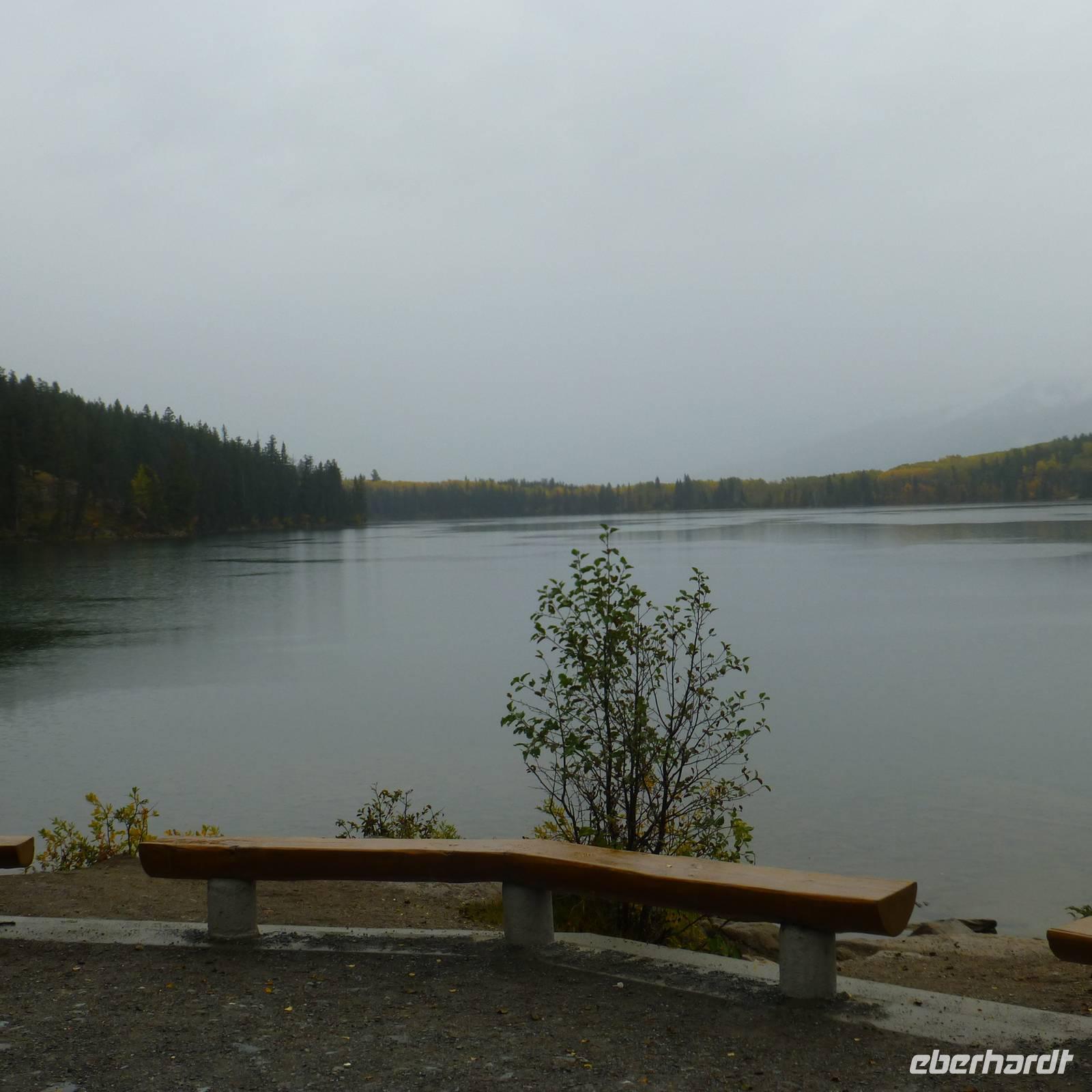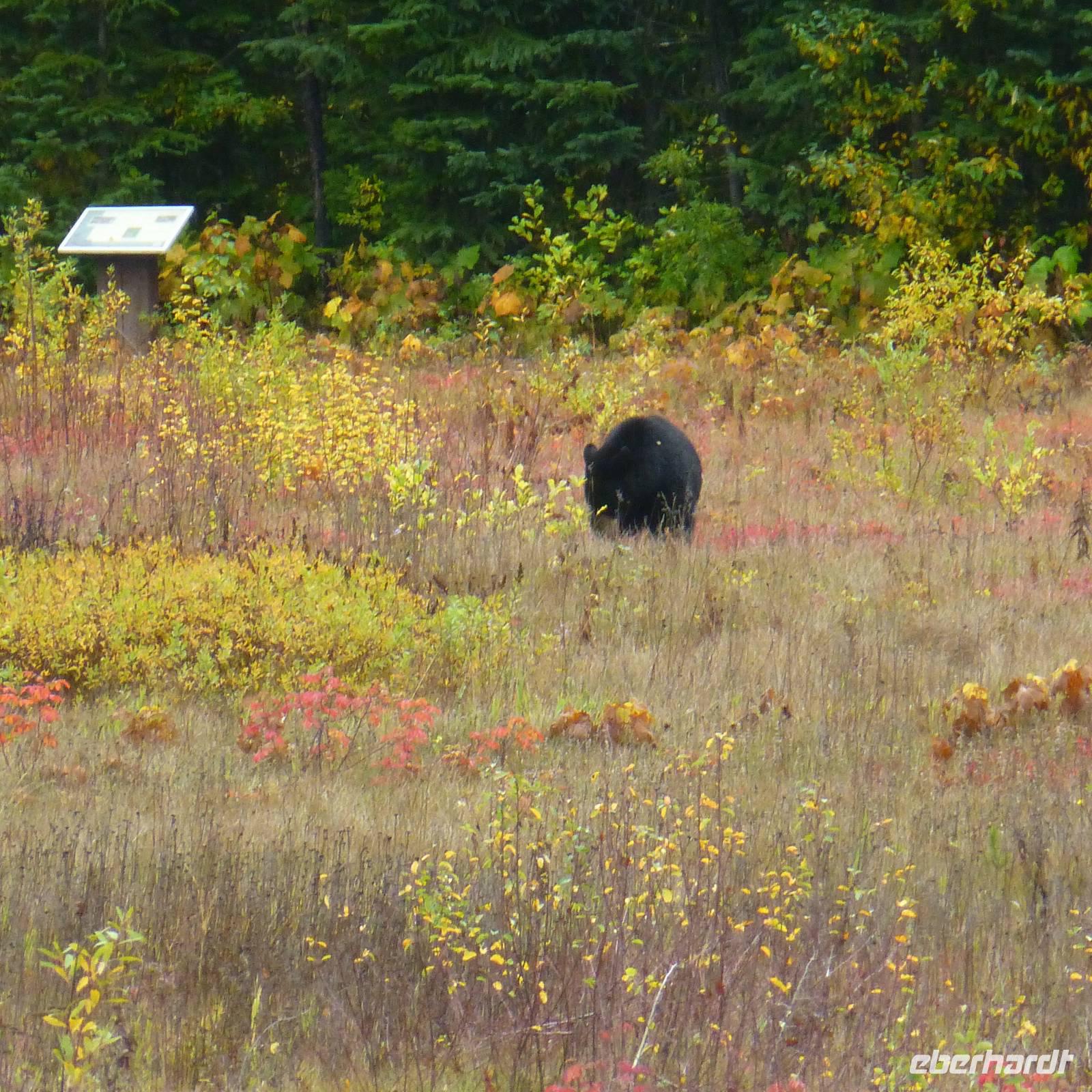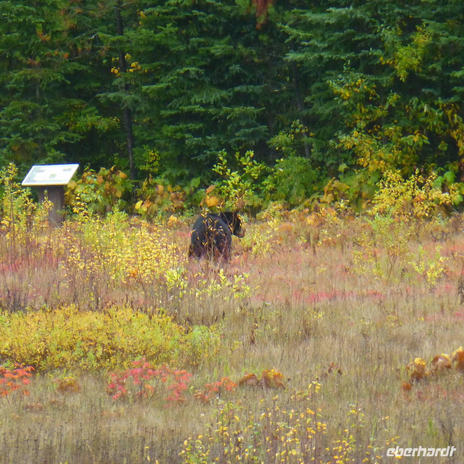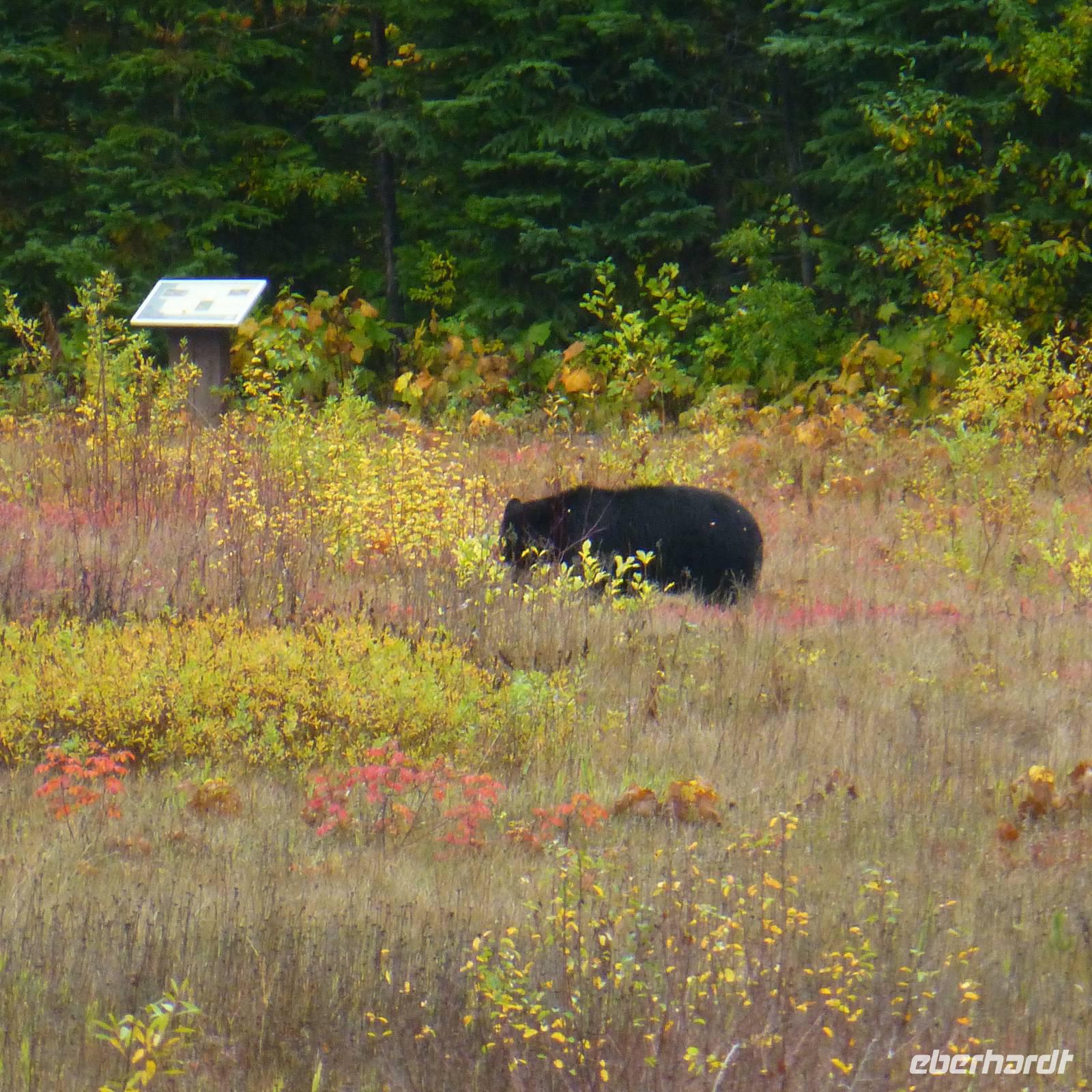 Leider war wieder keine Sonne zu sehen. Unser erstes Ziel waren die Athabasca Wasserfälle. Sehr gewaltig. Der Athabasca Fluss stürzt über einen Felsvorsprung in einen schmalen Canyon in die Tiefe und bahnt sich seinen Weg durch das Felsgestein und stürzt einige Meter in die Tiefe. Man spürte die Kraft des Wassers. Es war sehr beindruckend. Leider fängt es wieder an zu regnen. Wir erreichten Jasper und fuhren zum Patrizia See und weiter zum Pyramiden See. Aussteigen lohnt sich nicht den es lag alles im Regen. Auf dem Yellowhead-Highway fuhren über den Yelloheedpass an die Grenze. Wir verließen Alberta und weiter ging es nach Britisch Columbia. Das bedeutete unsere Uhren noch einmal 1 Stunde zurück zu stellen .Wir erreichten den Mount Robson Provincial Park. Entlang der High Mountain Road fuhren wir über den Fraser River. Vorbei am Moosee kamen wir am Mount Robsen Center an. Plötzlich ein Auflauf - ein Schwarzbär ließ sich nicht aus der Ruhe bringen. Die Kameras klickten ununterbrochen. Weiter ging es zu den Reargard Falls. Hier befindet sich der nördlichste Punkt wohin die Königslachse kommen, wenn sie nach einer langen und anstrengenden Reise versuchen, die Fälle zu überqueren, um zu ihren Laichgründen zu gelangen. Leider waren keine mehr zu sehen. Entlang des Thomsen River fuhren wir in Wieglers Heli Ski Resort. Uns erwarteten tolle Holzhäuser mit mehreren Zimmern und einem gemütlichen Gemeinschaftsraum. Kaffeemaschinen waren auch vorhanden und so ließen wir es uns schmecken. Nach der Kaffeepause spazierten wir zum See und wurden durch eine schöne Laubfärbung überrascht. Nach dem Abendessen in Tonys Grill, wo es die leckersten Steaks der gesamten Reise gab, setzten wir uns noch gemütlich zusammen.