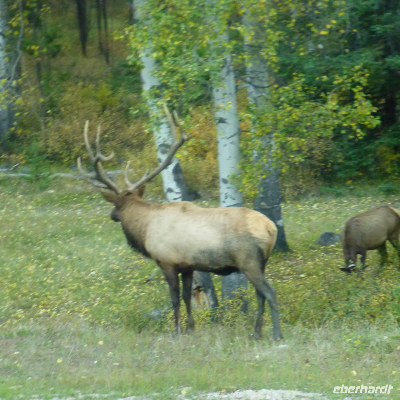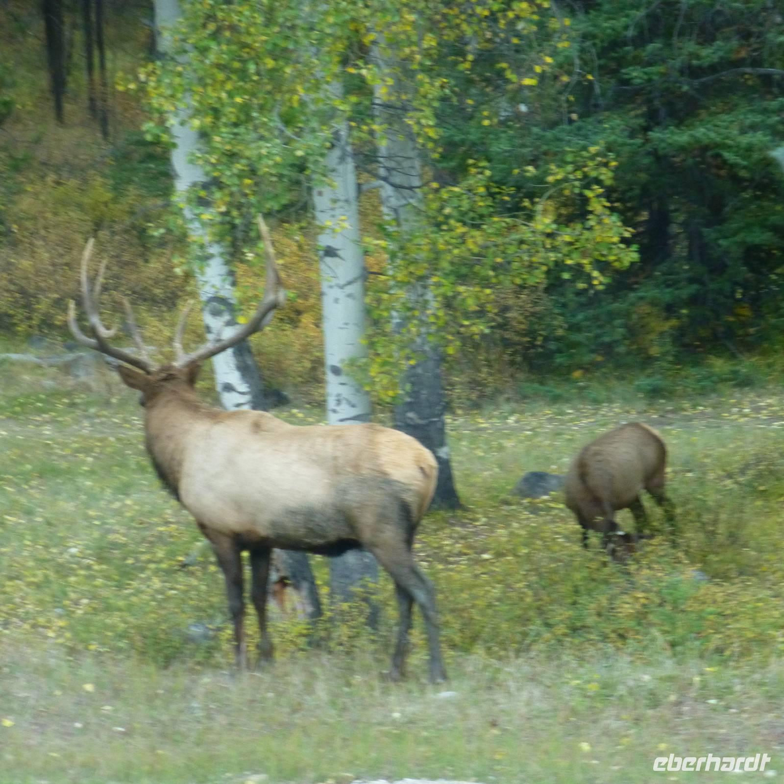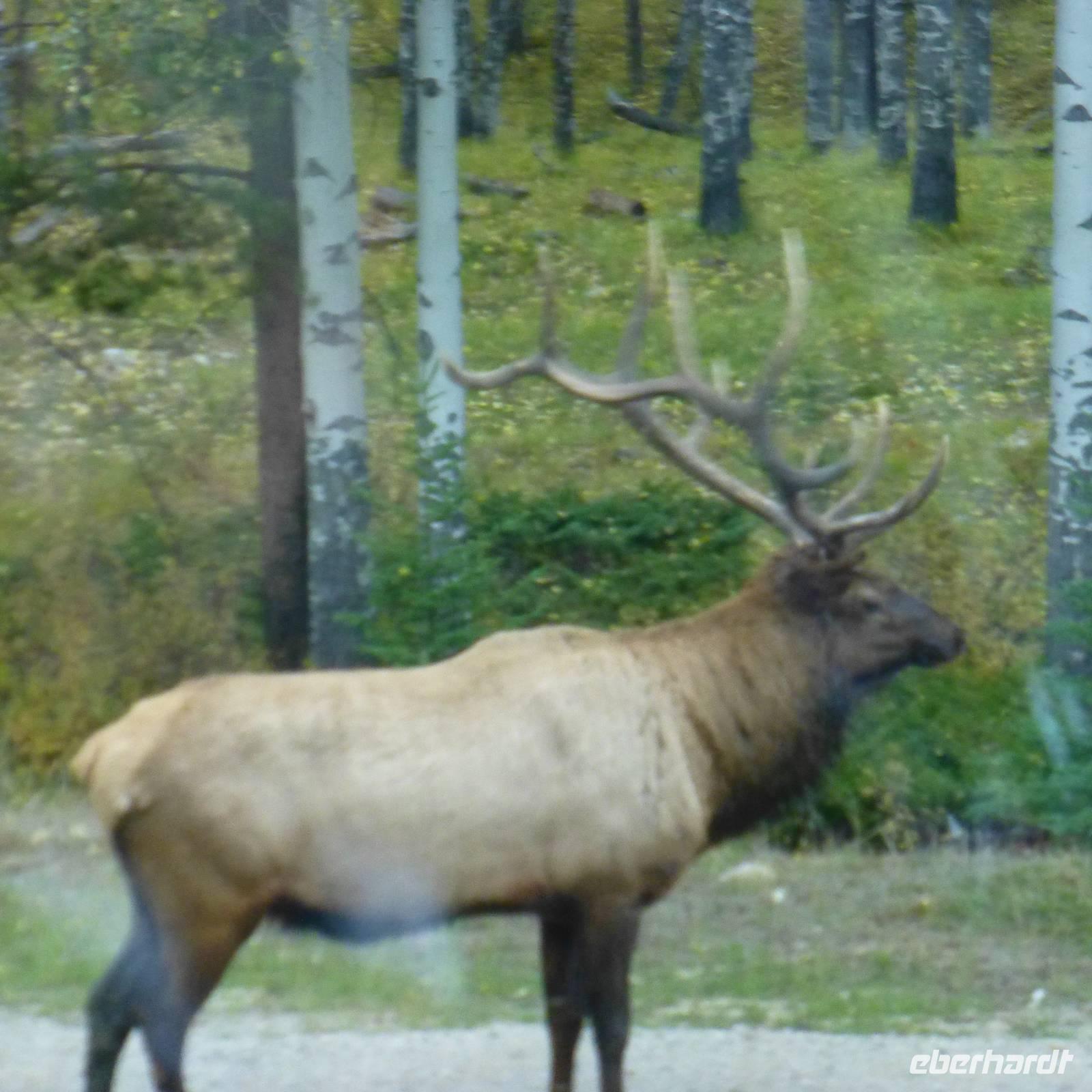 Der Blick aus dem Zimmer leichter Regen und bewölkt. Entlang am Atabaca Fluss fuhren wir in die Eisenbahnerstadt Jasper. Es wurde langsam heller und der blaue Himmel kam zum Vorschein. Auf der der Maligne Lake Road erreichten wir die Maligne Canyon. Er ist 50 Meter tief. Wir unternahmen einen Spaziergang auf dem Rundweg bis zum Teehaus. Endlich konnten wir wieder zum Shopping gehen. Weiter ging unsere Reise vorbei am Mediziensee zum Maligne Lake. Doch hier hatten wir schlechtes Wetter. Wir spazierten entlang des Sees und im Restaurant legten wir unser Mittagspause ein. Zurück in Jasper bummelten wir durch die Stadt. In einem Pub kehrten wir auf ein Getränk ein. In gemütlicher Runde ließen wir es uns schmecken. Auf der Rückfahrt in unsere Lodge hatten wir Glück. Einige Wapitihirsche tummelten sich am Straßenrand. Den Abend ließen wir bei einem gemeinsamen Zusammensein in der Lodge ausklingen.