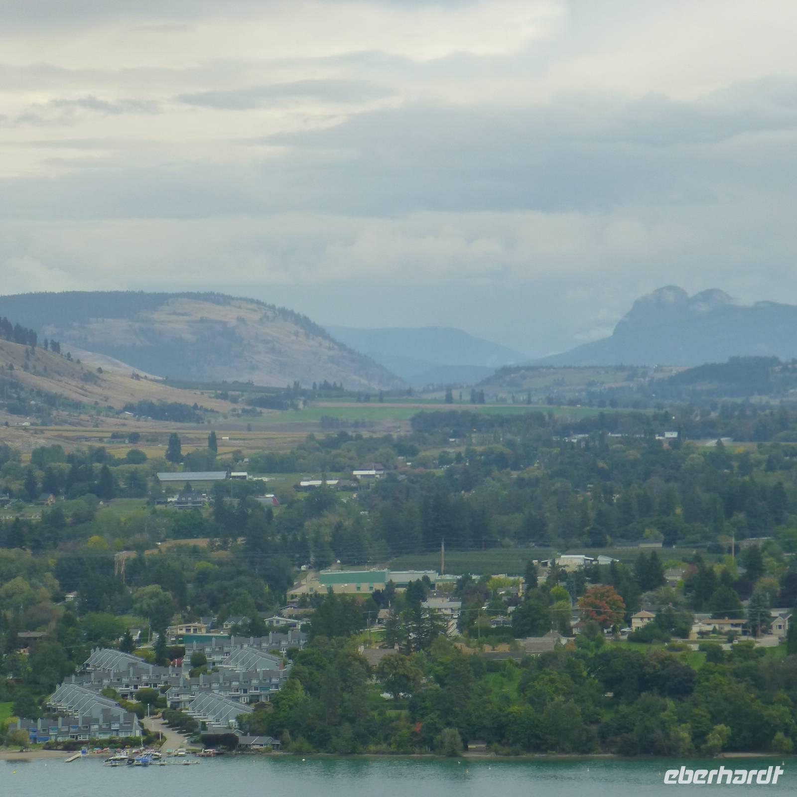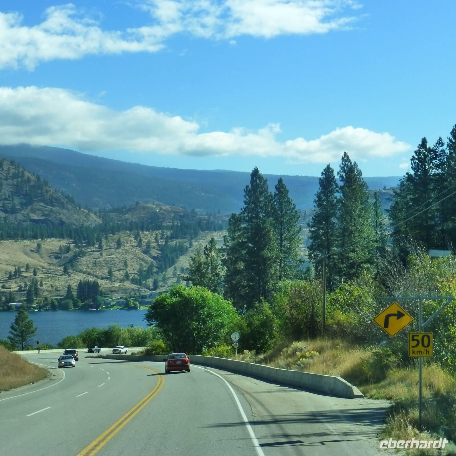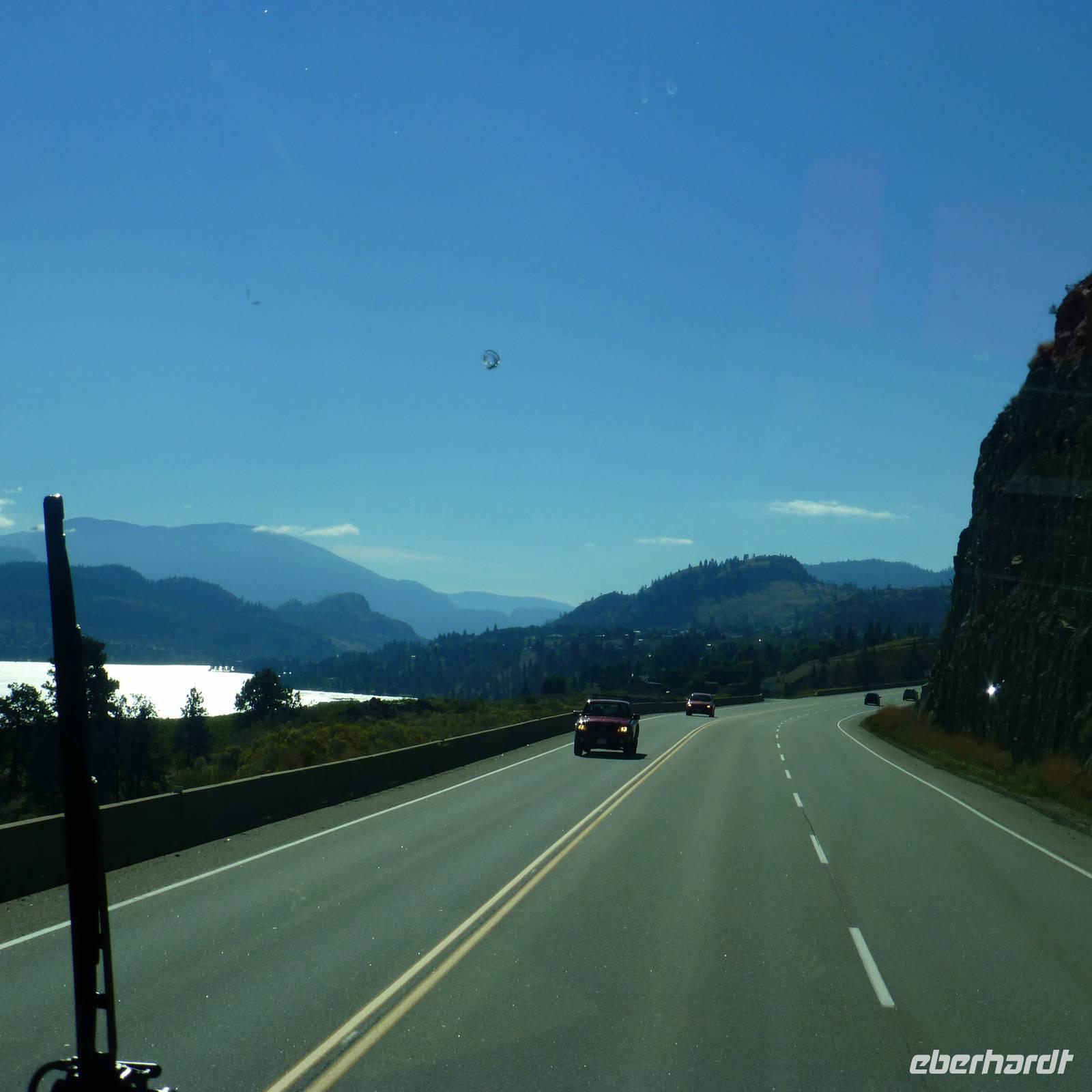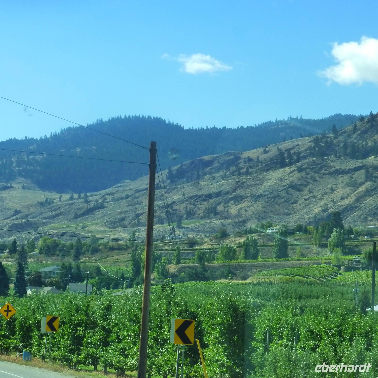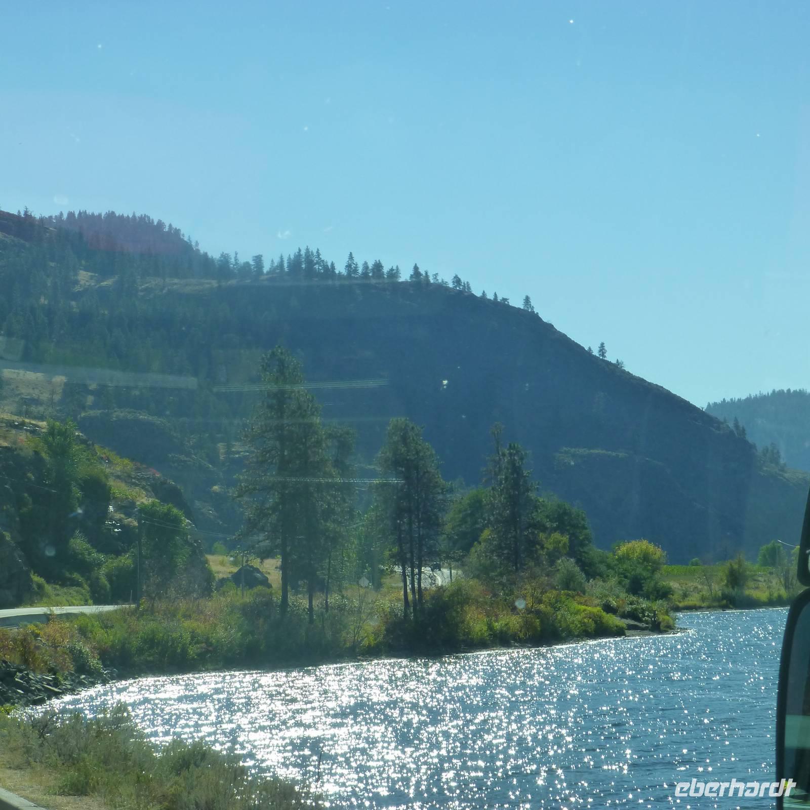 Das Frühstück wurde uns wieder in Tonys Grill gereicht. Auf dem Weg nach Kamlops zeigte sich der erste blaue Himmel. Wir erreichten Clearwater und den Spahats Wasserfall. Im Information Center kauften wir uns noch eine Landkarte um unseren Reiseverlauf fest zu halten. Nun kamen wir langsam in das Ranchgebiet. Erste Rinderherden und Ginseng Felder waren zu sehen. Die Berge wurden niedriger und wir erreichten Barrier. Vor einigen Jahren war diese Stadt bekannt durch einen verheerenden Waldbrand. Die Stadt musste damals evakuiert werden. Überall waren verbrannte Berge zu sehen. In Kamlops fuhren wir an einem Indianerreservat mit einem POW WOW Gelände vorbei. In der South Thomsen Rang legten wir unsere Mittagspause ein und setzten anschließend unsere Fahrt nach Wilhelms fort. Wir näherten uns dem Okanakental. Bekannt durch den Obstanbau. Vor allem werden hier Äpfel, Birnen, Pflaumen und Pfirsiche angebaut. Verschiedene Obststände standen entlang der Straße. Nach kurzem Halt kauften auch wir einiges Obst ein. Unser nächstes Ziel war der Kalamalka See.