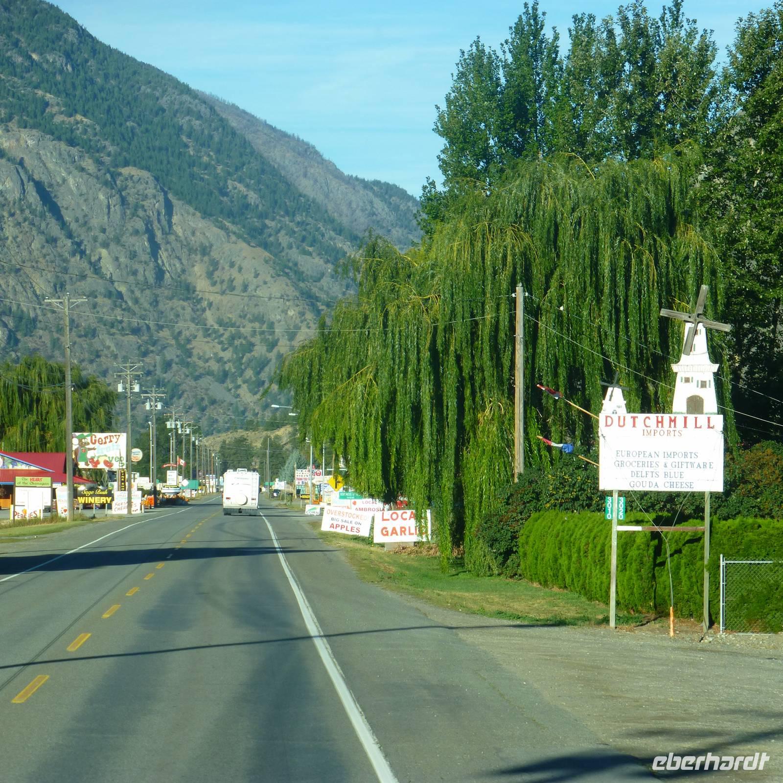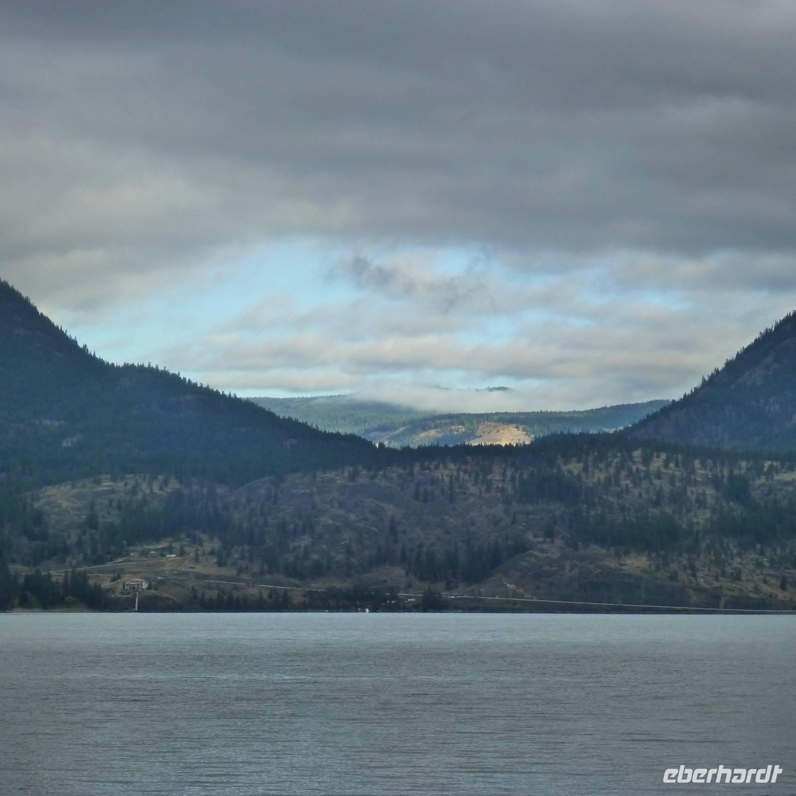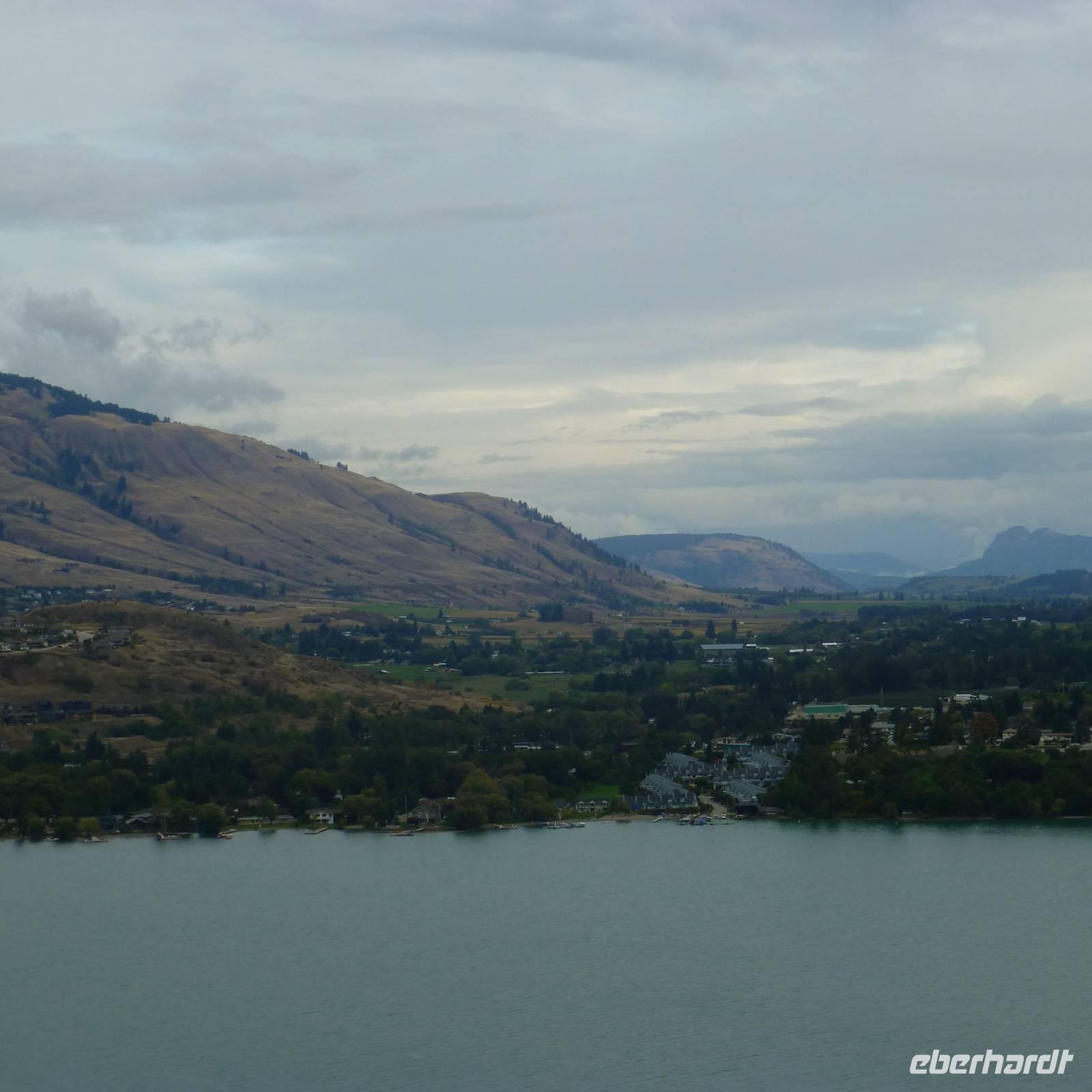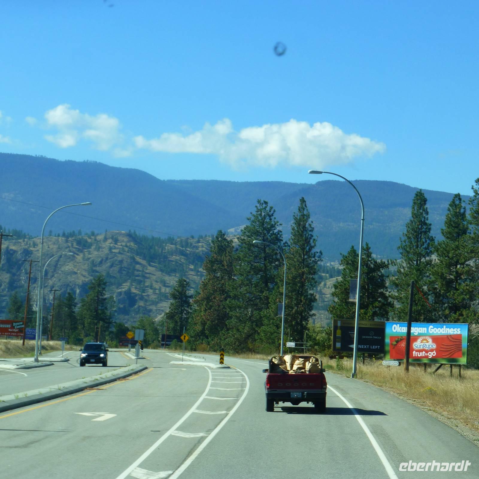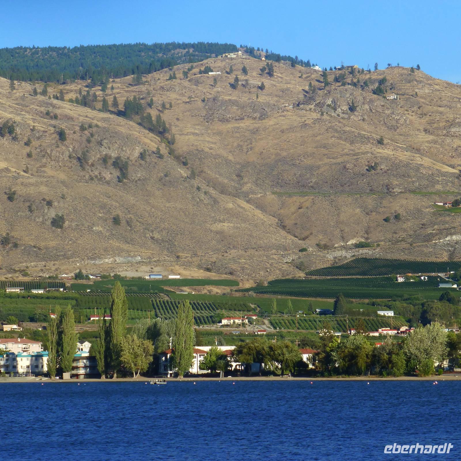 Das Frühstück wurde uns wieder in Tonys Grill gereicht. Auf dem Weg nach Kamlops zeigte sich der erste blaue Himmel. Wir erreichten Clearwater und den Spahats Wasserfall. Im Information Center kauften wir uns noch eine Landkarte um unseren Reiseverlauf fest zu halten. Nun kamen wir langsam in das Ranchgebiet. Erste Rinderherden und Ginseng Felder waren zu sehen. Die Berge wurden niedriger und wir erreichten Barrier. Vor einigen Jahren war diese Stadt bekannt durch einen verheerenden Waldbrand. Die Stadt musste damals evakuiert werden. Überall waren verbrannte Berge zu sehen. In Kamlops fuhren wir an einem Indianerreservat mit einem POW WOW Gelände vorbei. In der South Thomsen Rang legten wir unsere Mittagspause ein und setzten anschließend unsere Fahrt nach Wilhelms fort. Wir näherten uns dem Okanakental. Bekannt durch den Obstanbau. Vor allem werden hier Äpfel, Birnen, Pflaumen und Pfirsiche angebaut. Verschiedene Obststände standen entlang der Straße. Nach kurzem Halt kauften auch wir einiges Obst ein. Unser nächstes Ziel war der Kalamalka See.
