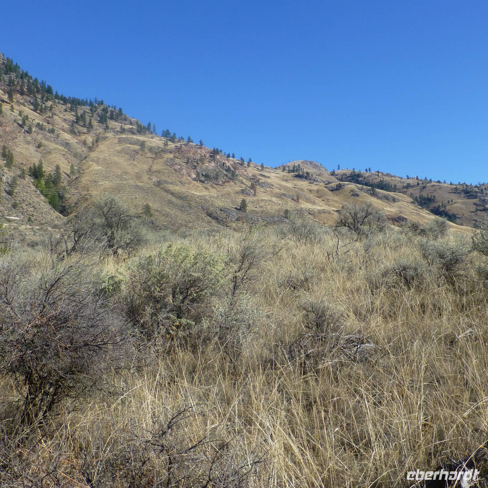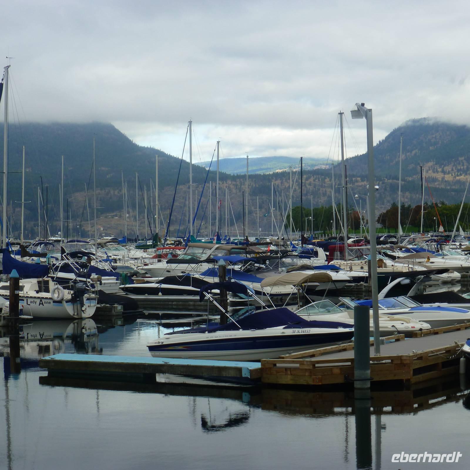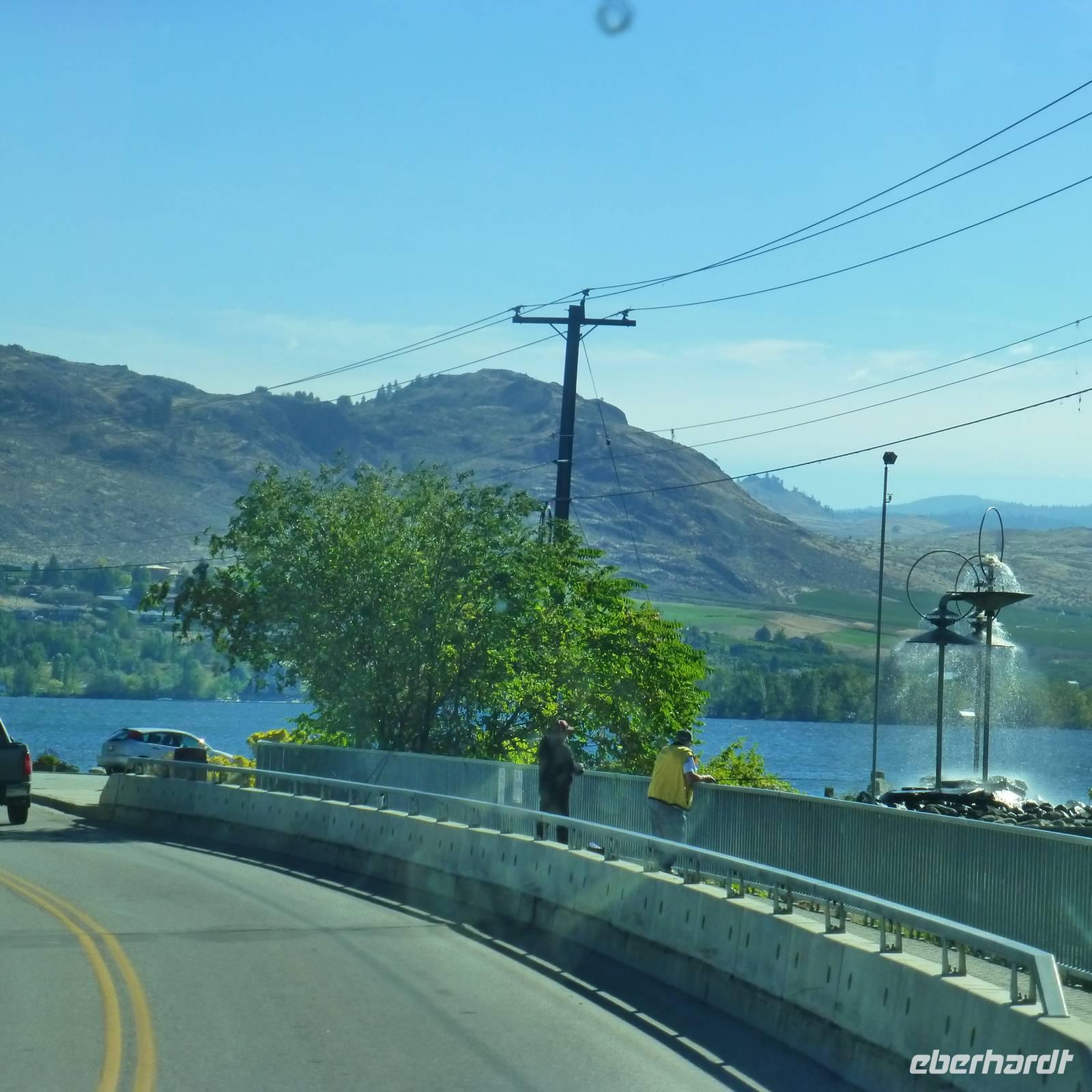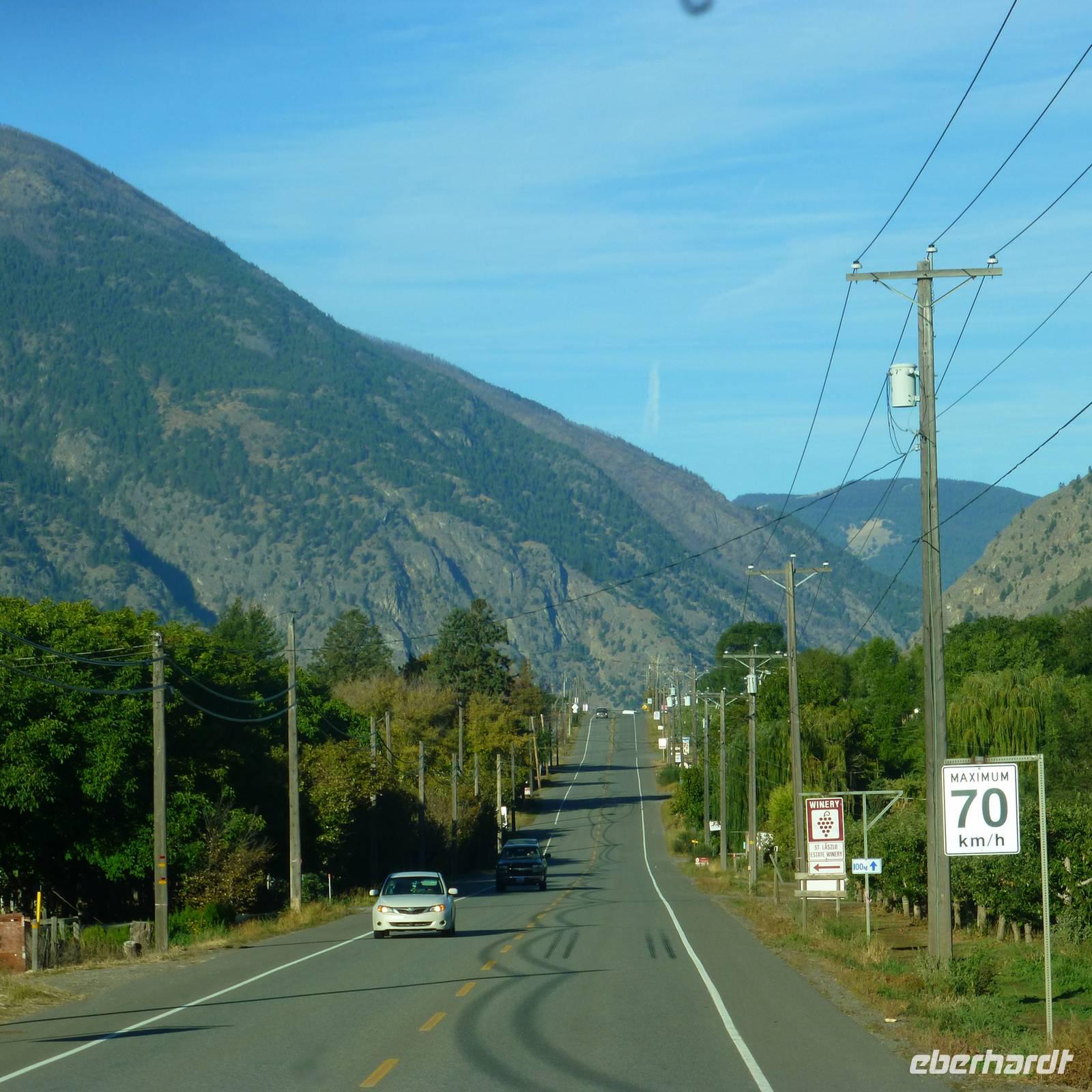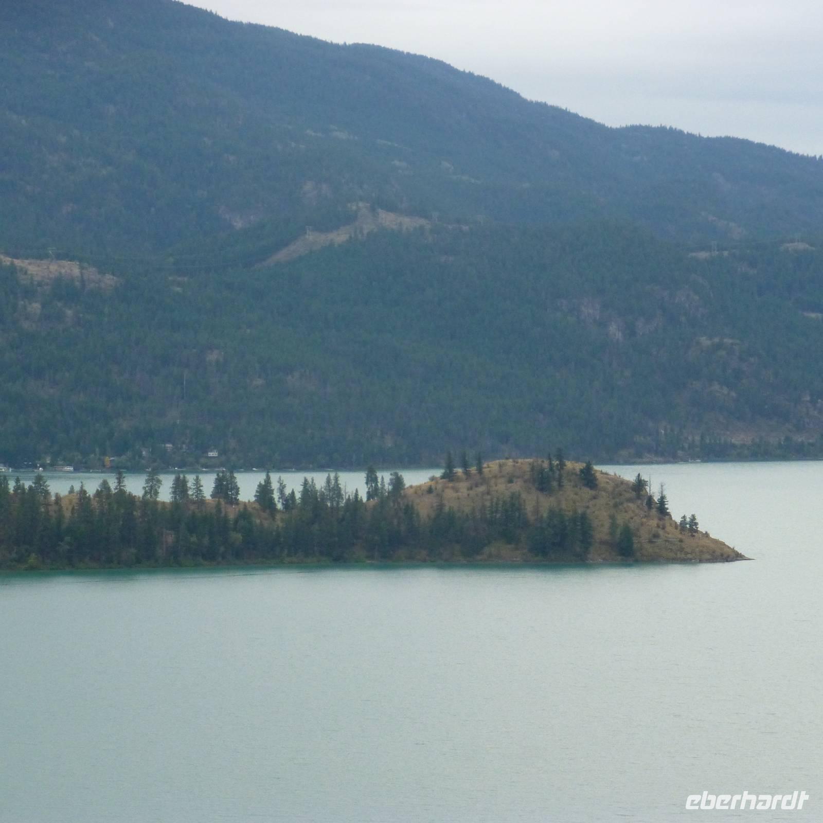 Das Frühstück wurde uns wieder in Tonys Grill gereicht. Auf dem Weg nach Kamlops zeigte sich der erste blaue Himmel. Wir erreichten Clearwater und den Spahats Wasserfall. Im Information Center kauften wir uns noch eine Landkarte um unseren Reiseverlauf fest zu halten. Nun kamen wir langsam in das Ranchgebiet. Erste Rinderherden und Ginseng Felder waren zu sehen. Die Berge wurden niedriger und wir erreichten Barrier. Vor einigen Jahren war diese Stadt bekannt durch einen verheerenden Waldbrand. Die Stadt musste damals evakuiert werden. Überall waren verbrannte Berge zu sehen. In Kamlops fuhren wir an einem Indianerreservat mit einem POW WOW Gelände vorbei. In der South Thomsen Rang legten wir unsere Mittagspause ein und setzten anschließend unsere Fahrt nach Wilhelms fort. Wir näherten uns dem Okanakental. Bekannt durch den Obstanbau. Vor allem werden hier Äpfel, Birnen, Pflaumen und Pfirsiche angebaut. Verschiedene Obststände standen entlang der Straße. Nach kurzem Halt kauften auch wir einiges Obst ein. Unser nächstes Ziel war der Kalamalka See.