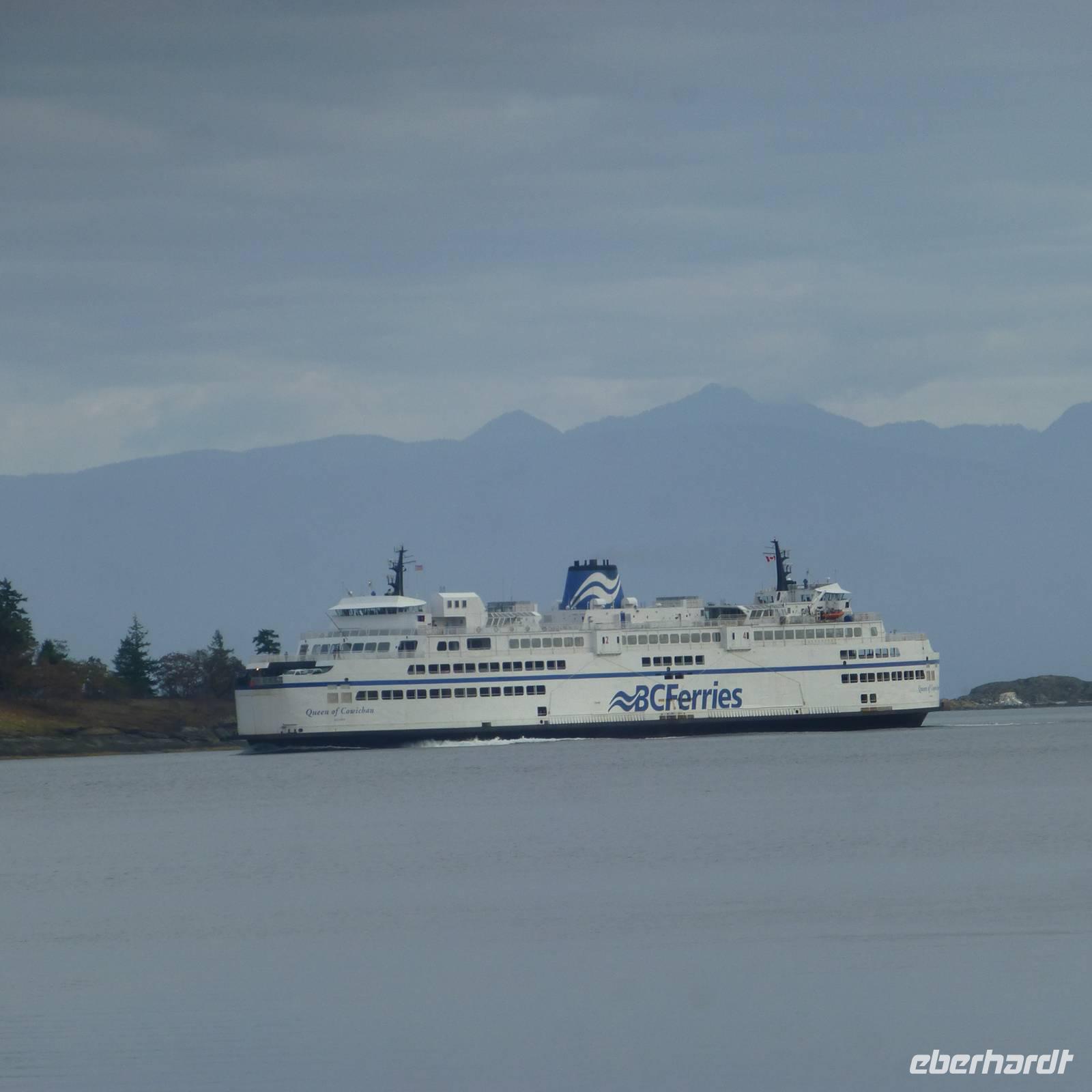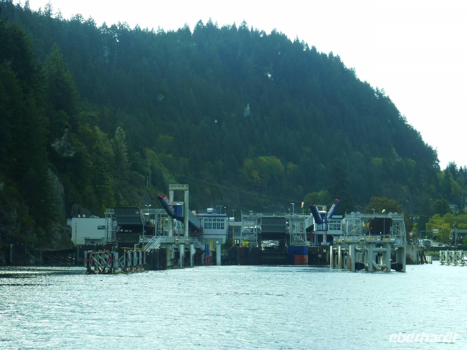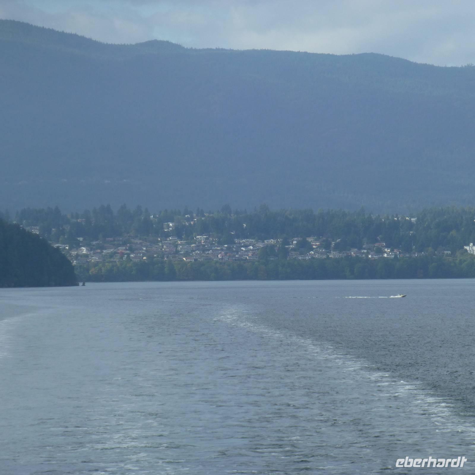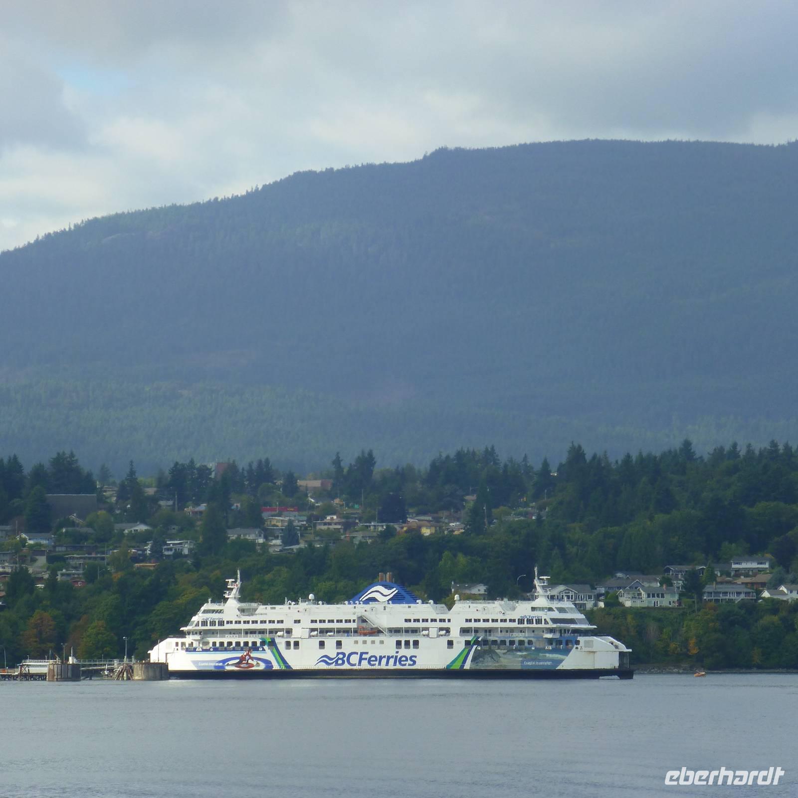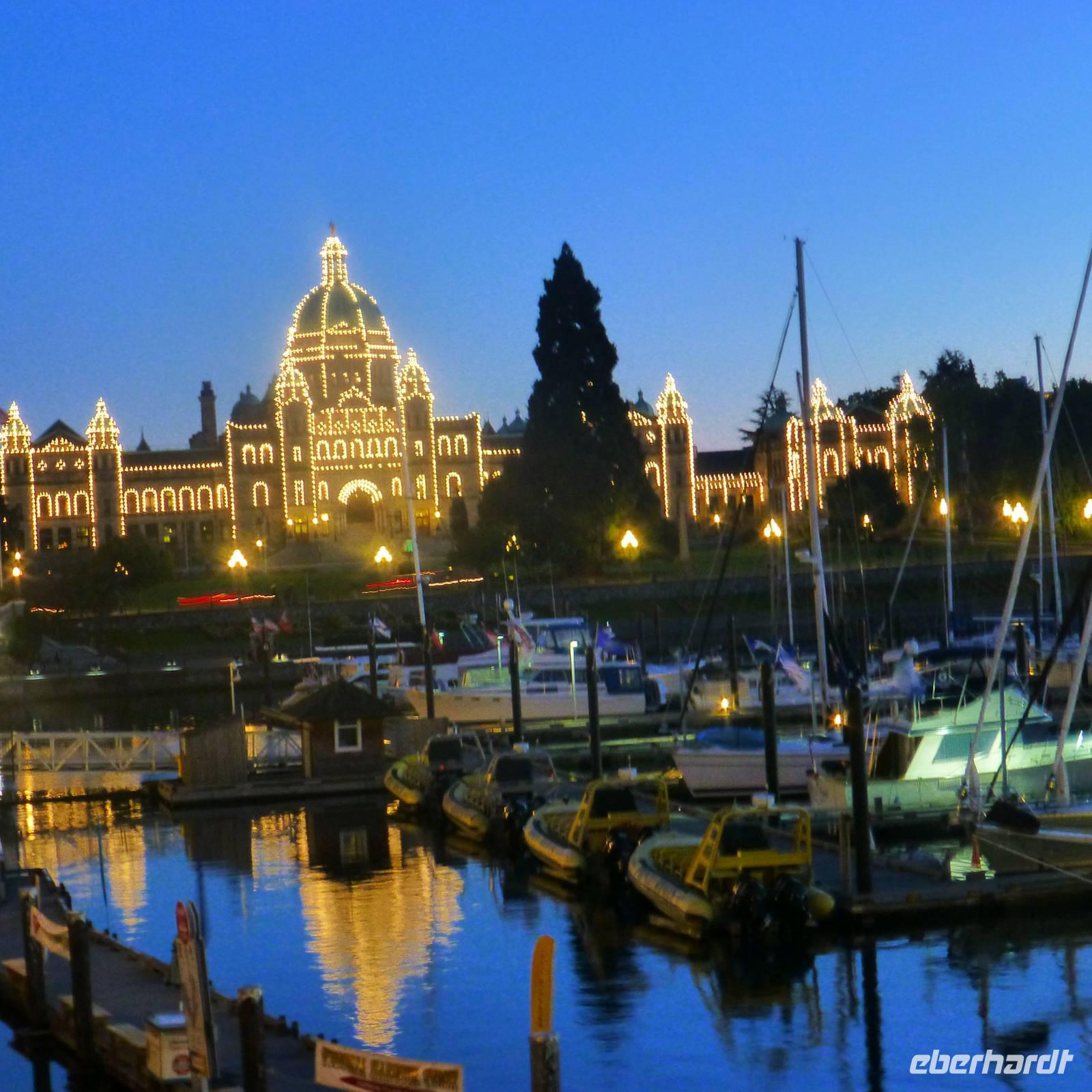 Heute stand eine lange Fahrt bevor. Bei schönem Wetter mit blauer Himmel und Sonnenschein fuhren wir 411km nach Tsawassen zur Fähre nach Vancouver Island. Wir erreichten Korumeus - die letzte Stadt des Obstanbaus. Auch hier gab es viele Obststände. Unsere weitere Reise führte uns hinein in die Kaskadenberge nach Hedley, die frühere Goldstadt. Auch jetzt kann man in den Flüssen noch Gold waschen. Weiter ging es nach Princeton. Diese Stadt besitzt eines der größten Sägewerke Kanadas. Auch der Roter Oker -rote Farbe - wird dort noch abgebaut. Auf einer sehr kurvenreichen Straße fuhren wir bis auf 1300 m Höhe. Durch den Manninge Park - benannt nach einem Premierminister - erreichten wir das Ski Gebiet. In diesem Naturbelassenen Park wurden zu den Winterspielen in Vancouver etliche Laster mit Schnee nach Vancouver gefahren. In der Manning Lodge legten wir eine Pause ein. Endlich konnten die begehrten Bärenglocken gekauft werden. Wir fuhren über den Allision Pass 1290 m weiter nach Hope. Am Fräserfluss befand sich eine schöne Parkanlage mit verschiedenen geschnitzten Figuren. Es wurde wieder etwas bergig. Die Kaskadenberge begleiten uns wieder. Das Tal wird immer breiter und auch der Fräserfluss breitet sich aus. Bald sehen wir rechts schon die Küstenberge. Wir erreichen den Fährhafen in Twarwansen und konnten sofort auf die Fähre nach Vancouver Island. Als wir los fuhren war alles im Nebel. Doch dann lichtete er sich und wir hatten einen schönen Blick auf die Golf Inseln. Ein Stück wurden wir sogar von Robben begleitet. Die Überfahrt dauert fast 2 Stunden bis nach Schwarz Bay. Wir erreichten unser Hotel in Viktoria und nutzten die Zeit bis zum Abendessen für die ersten Fotos. Das Restaurant befand sich direkt am Hafen. Doch vorher besichtigten wir noch das Empire Hotel und bestaunten das schön beleuchtete Parlament. Nach dem Abendessen kehrten wir noch in einem urigen Pub ein.
