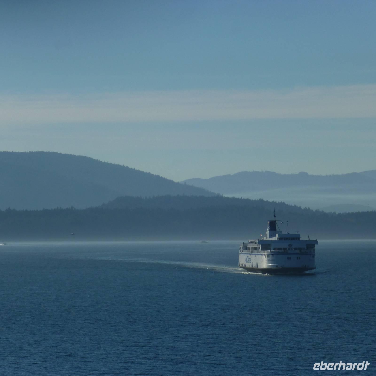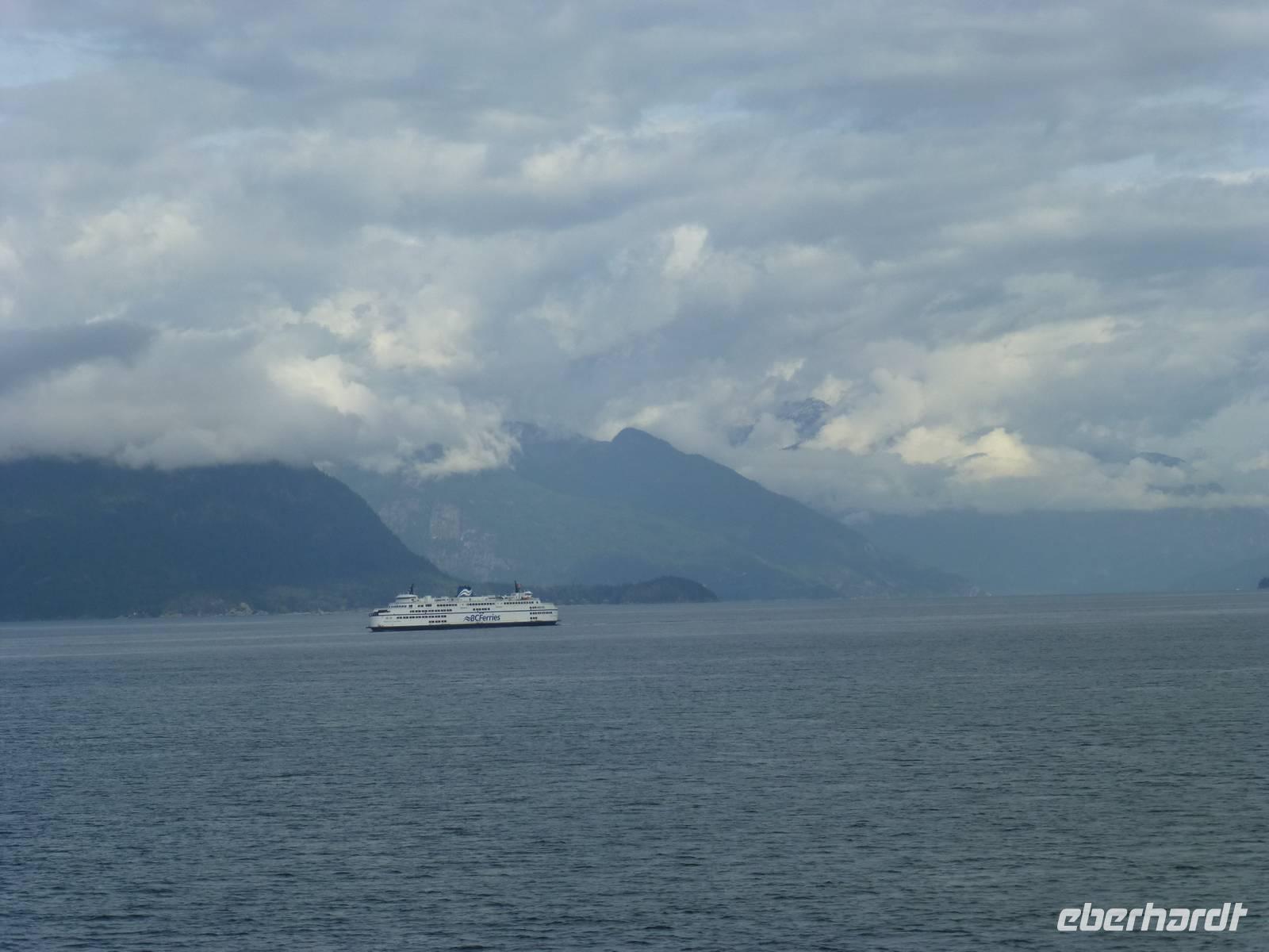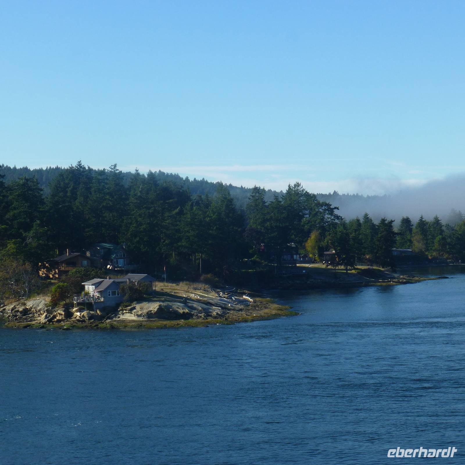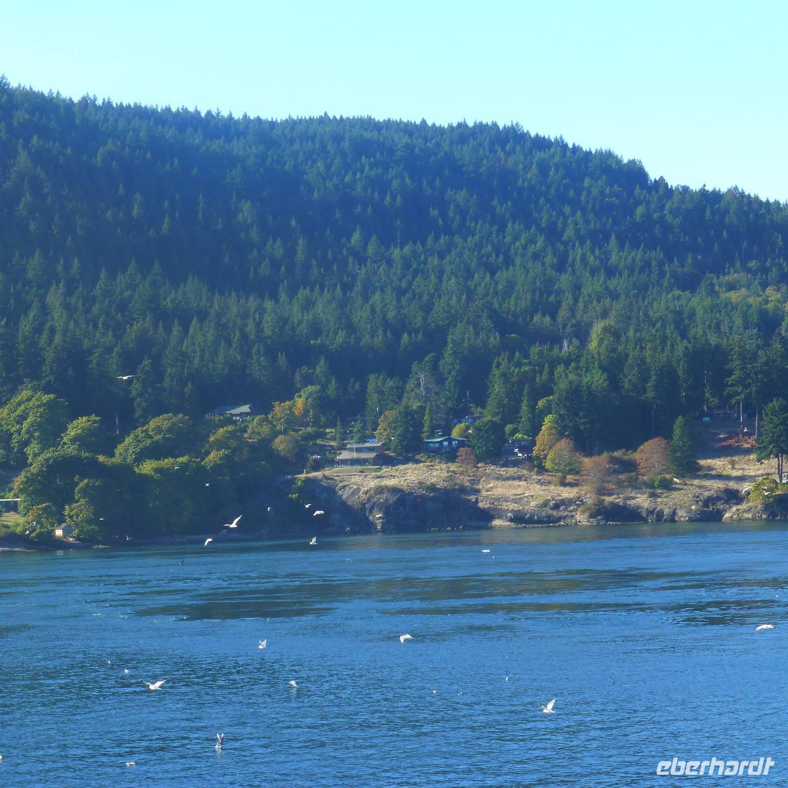 Heute stand eine lange Fahrt bevor. Bei schönem Wetter mit blauer Himmel und Sonnenschein fuhren wir 411km nach Tsawassen zur Fähre nach Vancouver Island. Wir erreichten Korumeus - die letzte Stadt des Obstanbaus. Auch hier gab es viele Obststände. Unsere weitere Reise führte uns hinein in die Kaskadenberge nach Hedley, die frühere Goldstadt. Auch jetzt kann man in den Flüssen noch Gold waschen. Weiter ging es nach Princeton. Diese Stadt besitzt eines der größten Sägewerke Kanadas. Auch der Roter Oker -rote Farbe - wird dort noch abgebaut. Auf einer sehr kurvenreichen Straße fuhren wir bis auf 1300 m Höhe. Durch den Manninge Park - benannt nach einem Premierminister - erreichten wir das Ski Gebiet. In diesem Naturbelassenen Park wurden zu den Winterspielen in Vancouver etliche Laster mit Schnee nach Vancouver gefahren. In der Manning Lodge legten wir eine Pause ein. Endlich konnten die begehrten Bärenglocken gekauft werden. Wir fuhren über den Allision Pass 1290 m weiter nach Hope. Am Fräserfluss befand sich eine schöne Parkanlage mit verschiedenen geschnitzten Figuren. Es wurde wieder etwas bergig. Die Kaskadenberge begleiten uns wieder. Das Tal wird immer breiter und auch der Fräserfluss breitet sich aus. Bald sehen wir rechts schon die Küstenberge. Wir erreichen den Fährhafen in Twarwansen und konnten sofort auf die Fähre nach Vancouver Island. Als wir los fuhren war alles im Nebel. Doch dann lichtete er sich und wir hatten einen schönen Blick auf die Golf Inseln. Ein Stück wurden wir sogar von Robben begleitet. Die Überfahrt dauert fast 2 Stunden bis nach Schwarz Bay. Wir erreichten unser Hotel in Viktoria und nutzten die Zeit bis zum Abendessen für die ersten Fotos. Das Restaurant befand sich direkt am Hafen. Doch vorher besichtigten wir noch das Empire Hotel und bestaunten das schön beleuchtete Parlament. Nach dem Abendessen kehrten wir noch in einem urigen Pub ein.