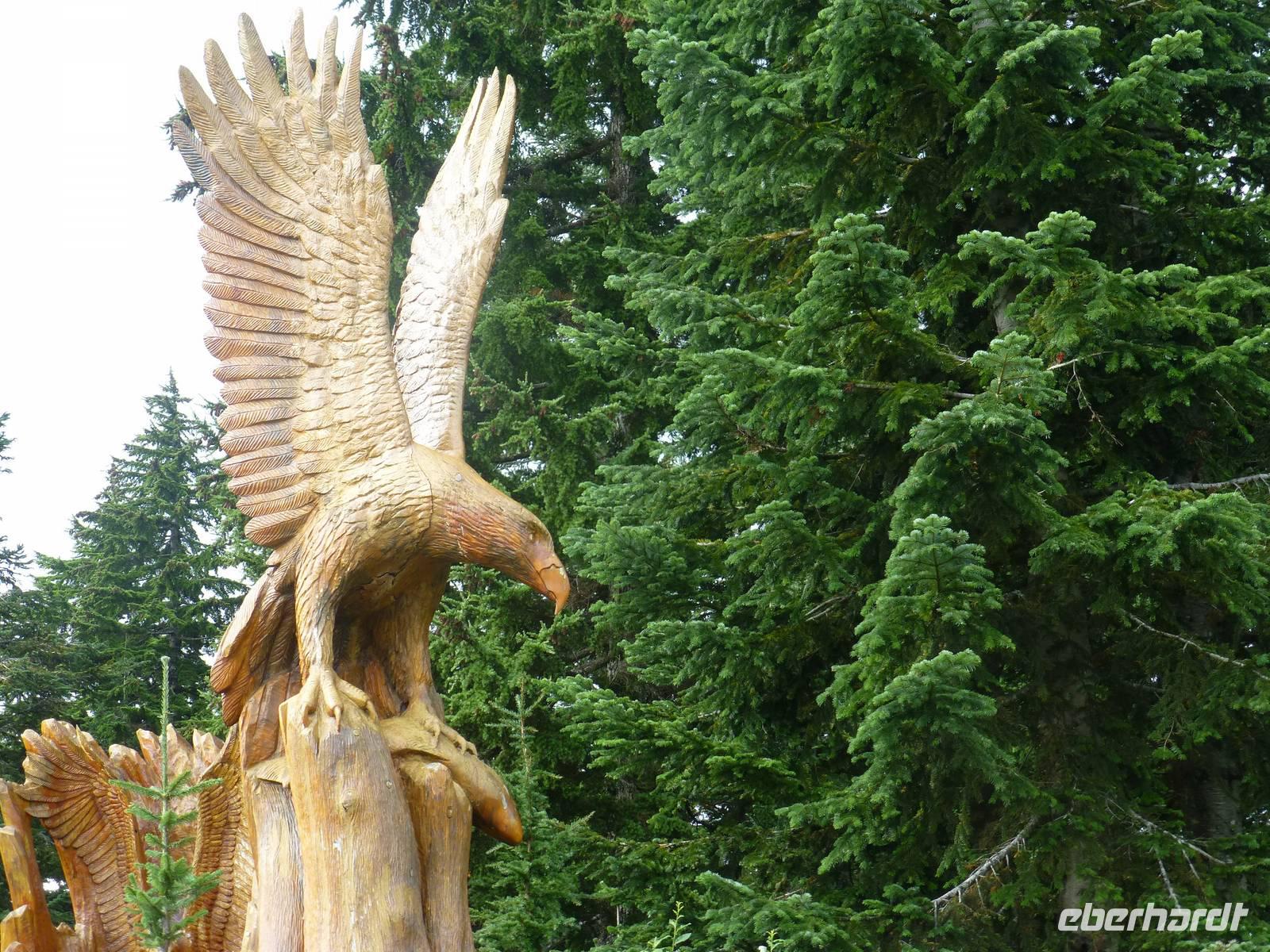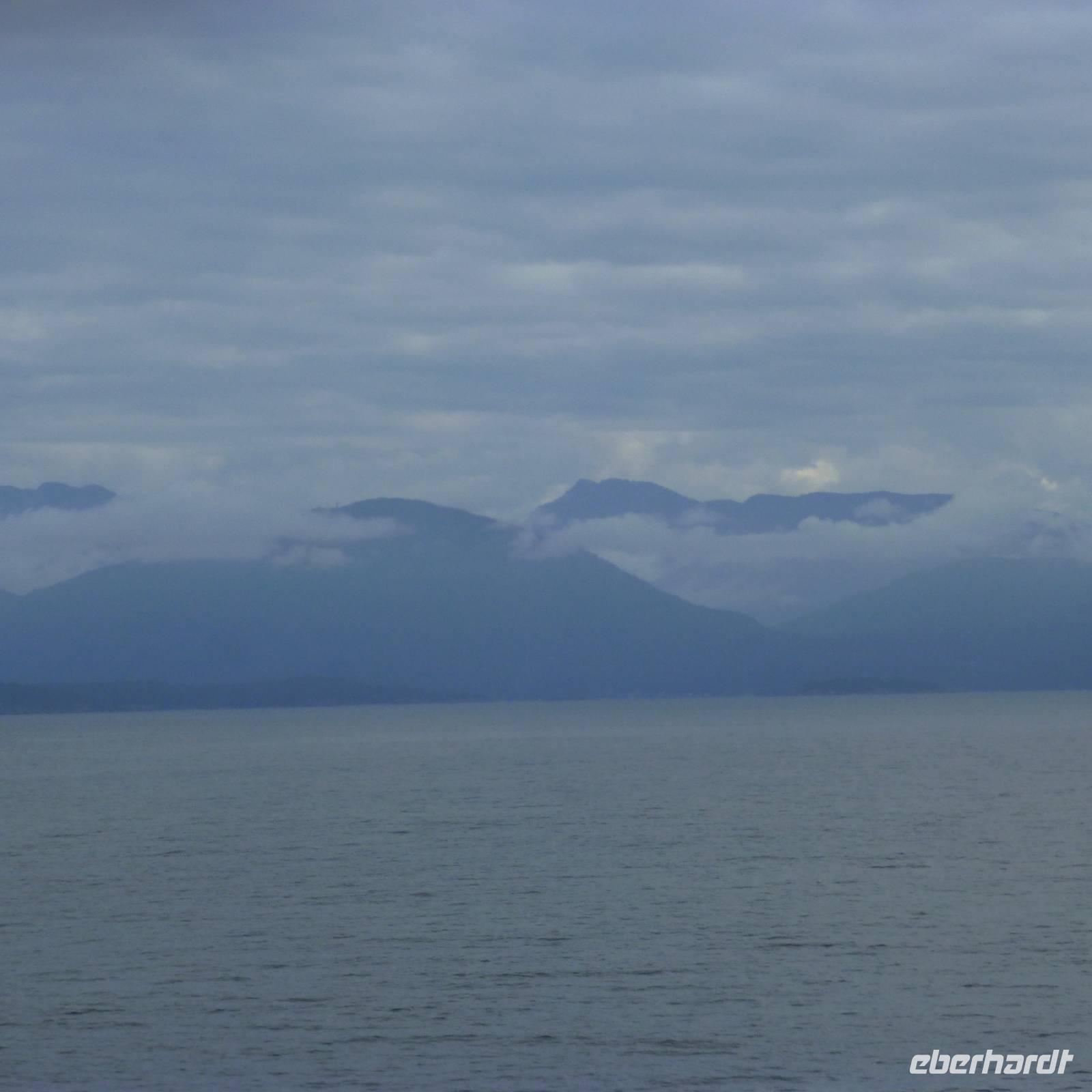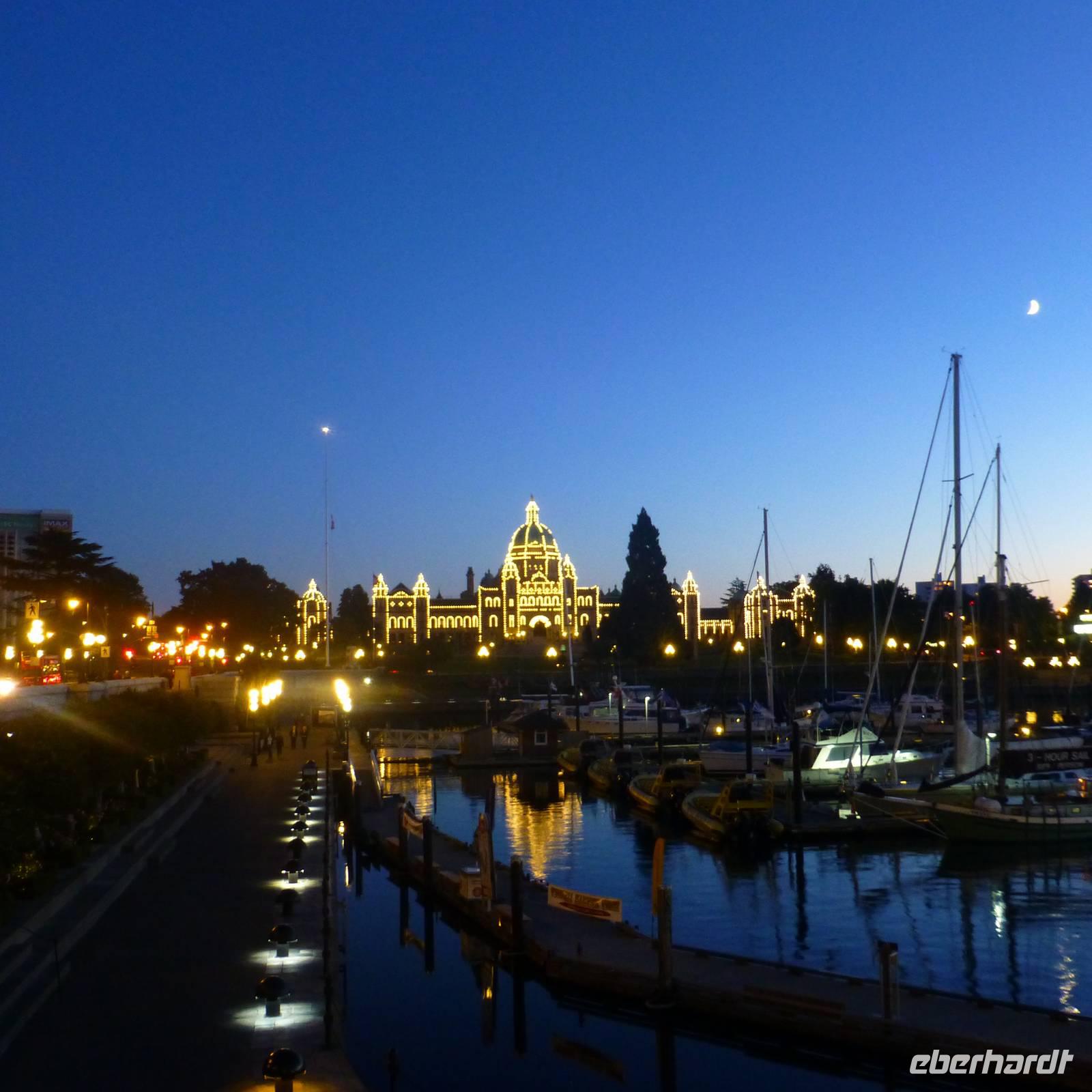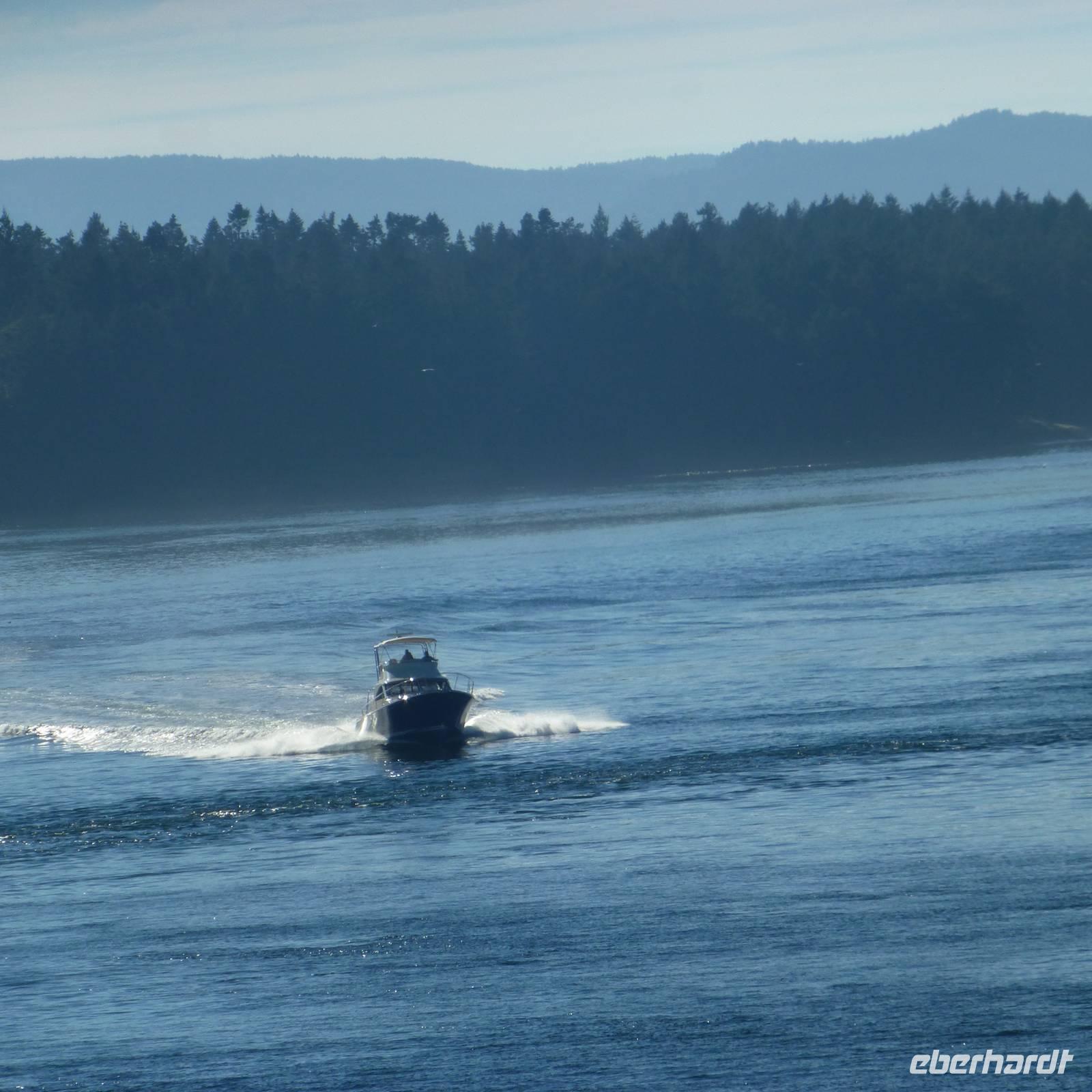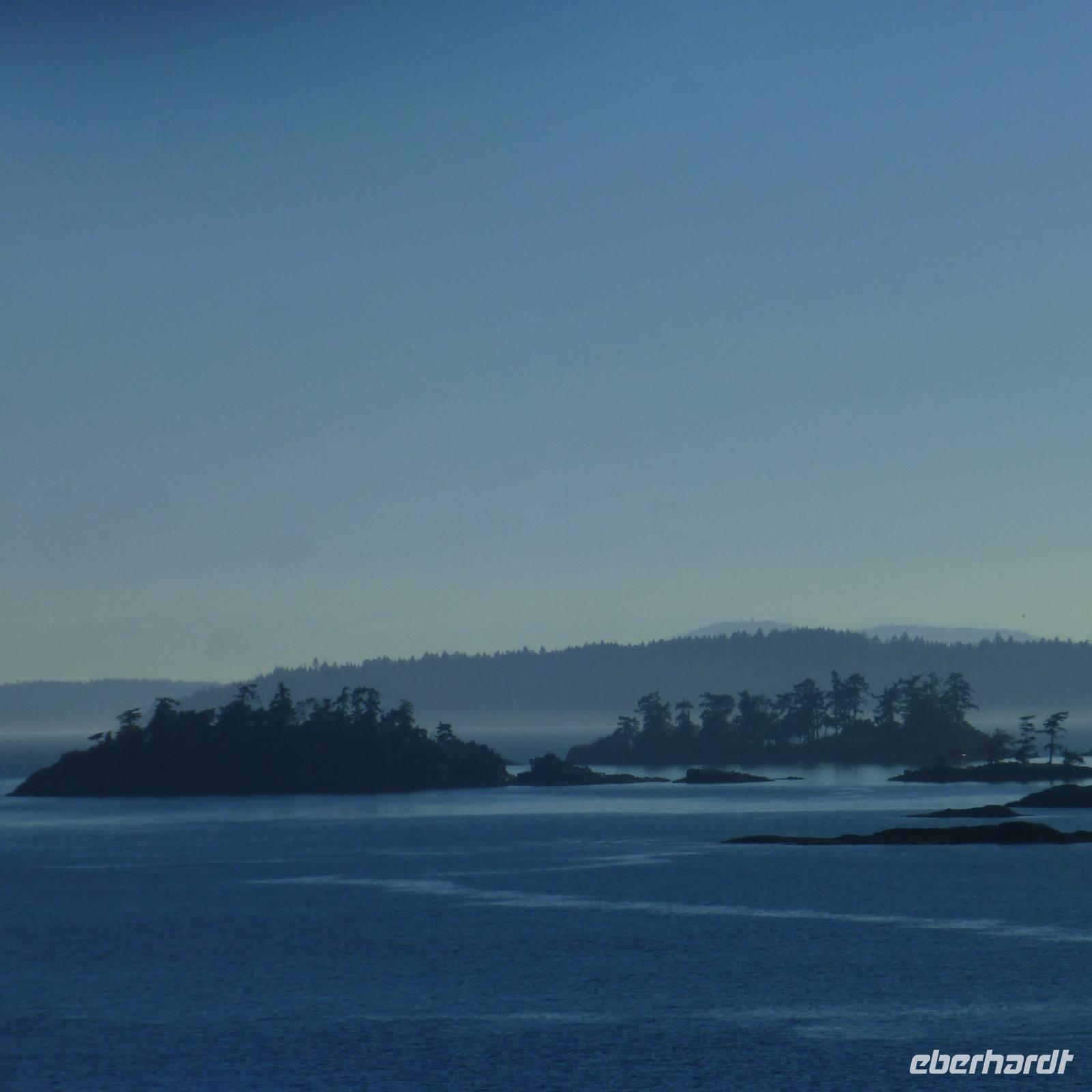 Heute stand eine lange Fahrt bevor. Bei schönem Wetter mit blauer Himmel und Sonnenschein fuhren wir 411km nach Tsawassen zur Fähre nach Vancouver Island. Wir erreichten Korumeus - die letzte Stadt des Obstanbaus. Auch hier gab es viele Obststände. Unsere weitere Reise führte uns hinein in die Kaskadenberge nach Hedley, die frühere Goldstadt. Auch jetzt kann man in den Flüssen noch Gold waschen. Weiter ging es nach Princeton. Diese Stadt besitzt eines der größten Sägewerke Kanadas. Auch der Roter Oker -rote Farbe - wird dort noch abgebaut. Auf einer sehr kurvenreichen Straße fuhren wir bis auf 1300 m Höhe. Durch den Manninge Park - benannt nach einem Premierminister - erreichten wir das Ski Gebiet. In diesem Naturbelassenen Park wurden zu den Winterspielen in Vancouver etliche Laster mit Schnee nach Vancouver gefahren. In der Manning Lodge legten wir eine Pause ein. Endlich konnten die begehrten Bärenglocken gekauft werden. Wir fuhren über den Allision Pass 1290 m weiter nach Hope. Am Fräserfluss befand sich eine schöne Parkanlage mit verschiedenen geschnitzten Figuren. Es wurde wieder etwas bergig. Die Kaskadenberge begleiten uns wieder. Das Tal wird immer breiter und auch der Fräserfluss breitet sich aus. Bald sehen wir rechts schon die Küstenberge. Wir erreichen den Fährhafen in Twarwansen und konnten sofort auf die Fähre nach Vancouver Island. Als wir los fuhren war alles im Nebel. Doch dann lichtete er sich und wir hatten einen schönen Blick auf die Golf Inseln. Ein Stück wurden wir sogar von Robben begleitet. Die Überfahrt dauert fast 2 Stunden bis nach Schwarz Bay. Wir erreichten unser Hotel in Viktoria und nutzten die Zeit bis zum Abendessen für die ersten Fotos. Das Restaurant befand sich direkt am Hafen. Doch vorher besichtigten wir noch das Empire Hotel und bestaunten das schön beleuchtete Parlament. Nach dem Abendessen kehrten wir noch in einem urigen Pub ein.