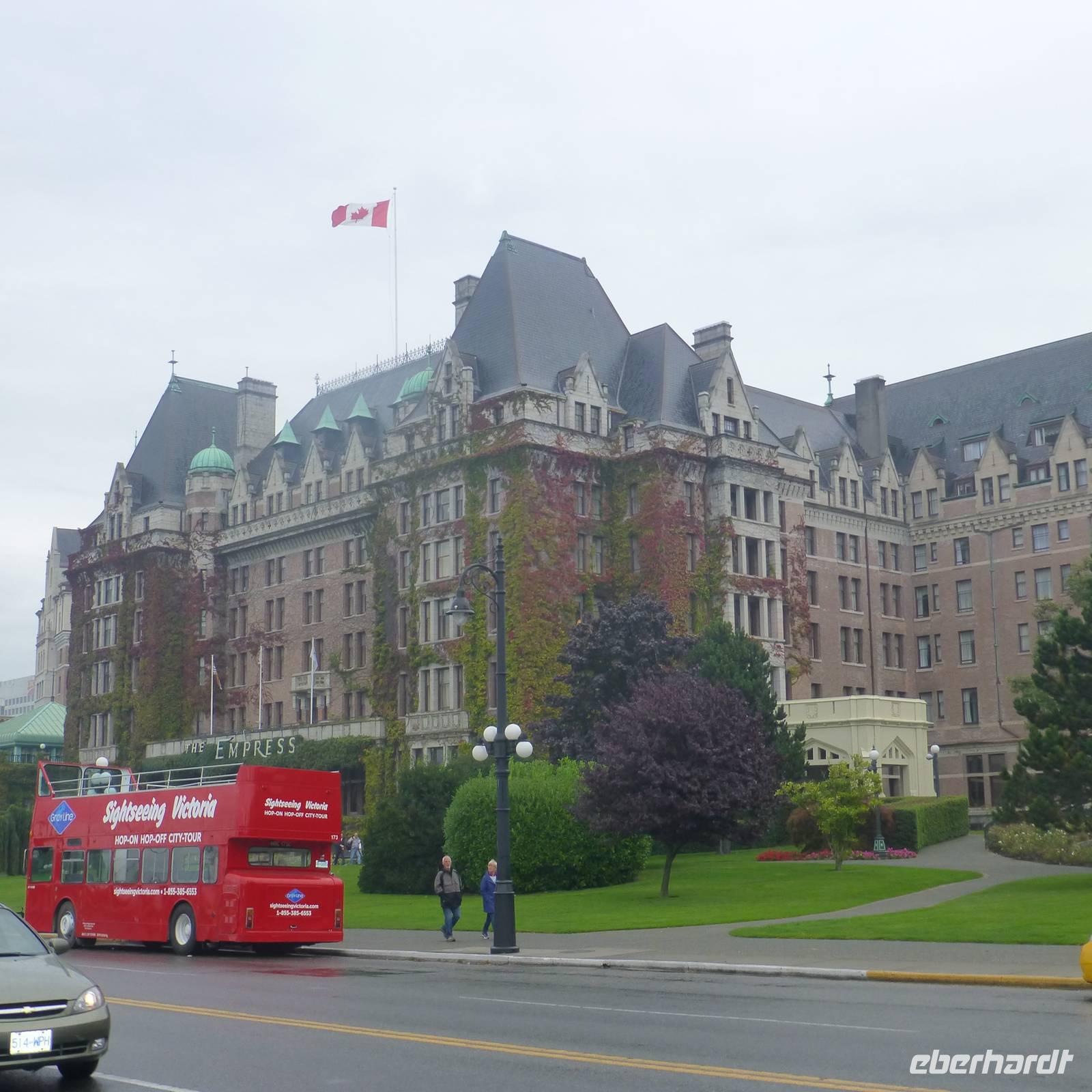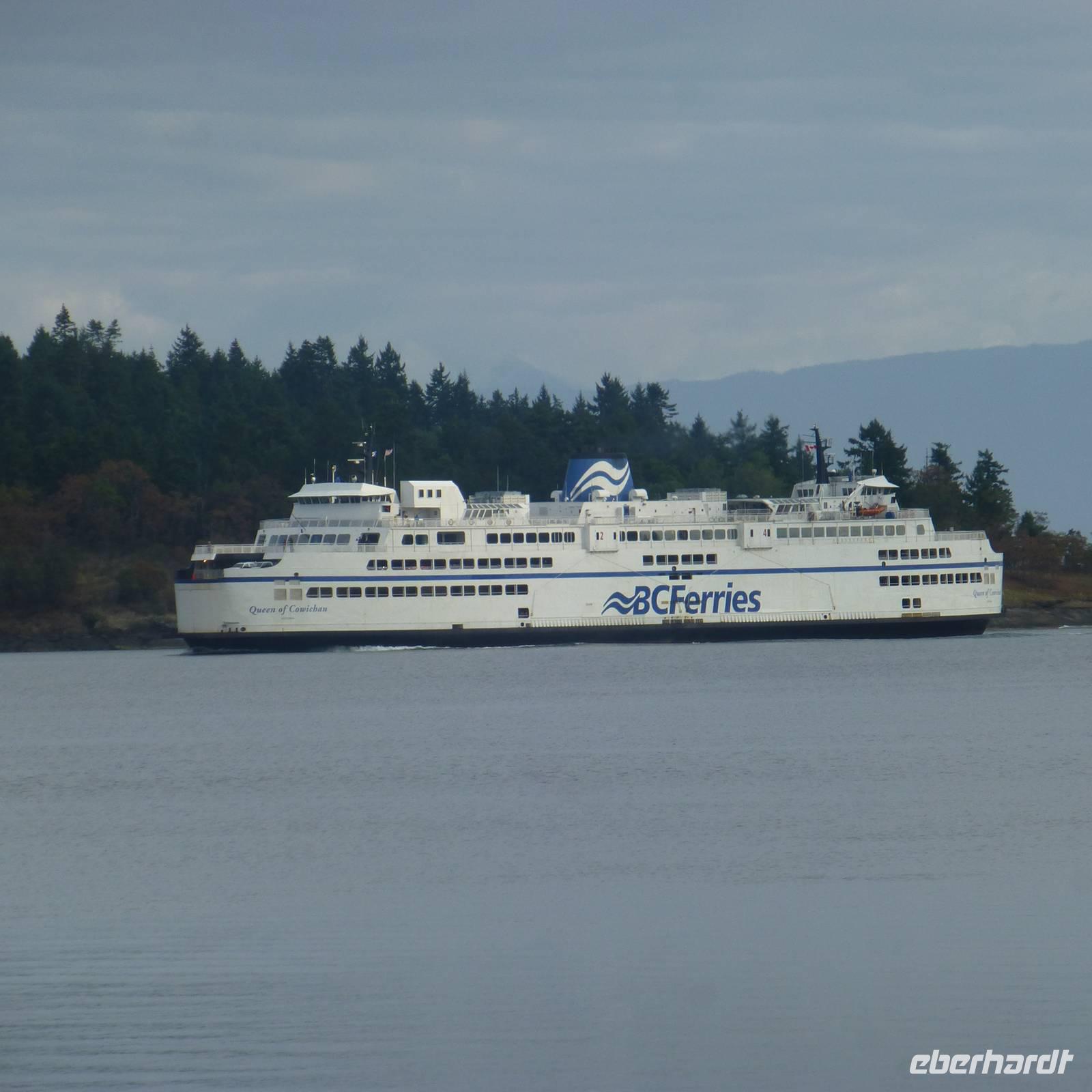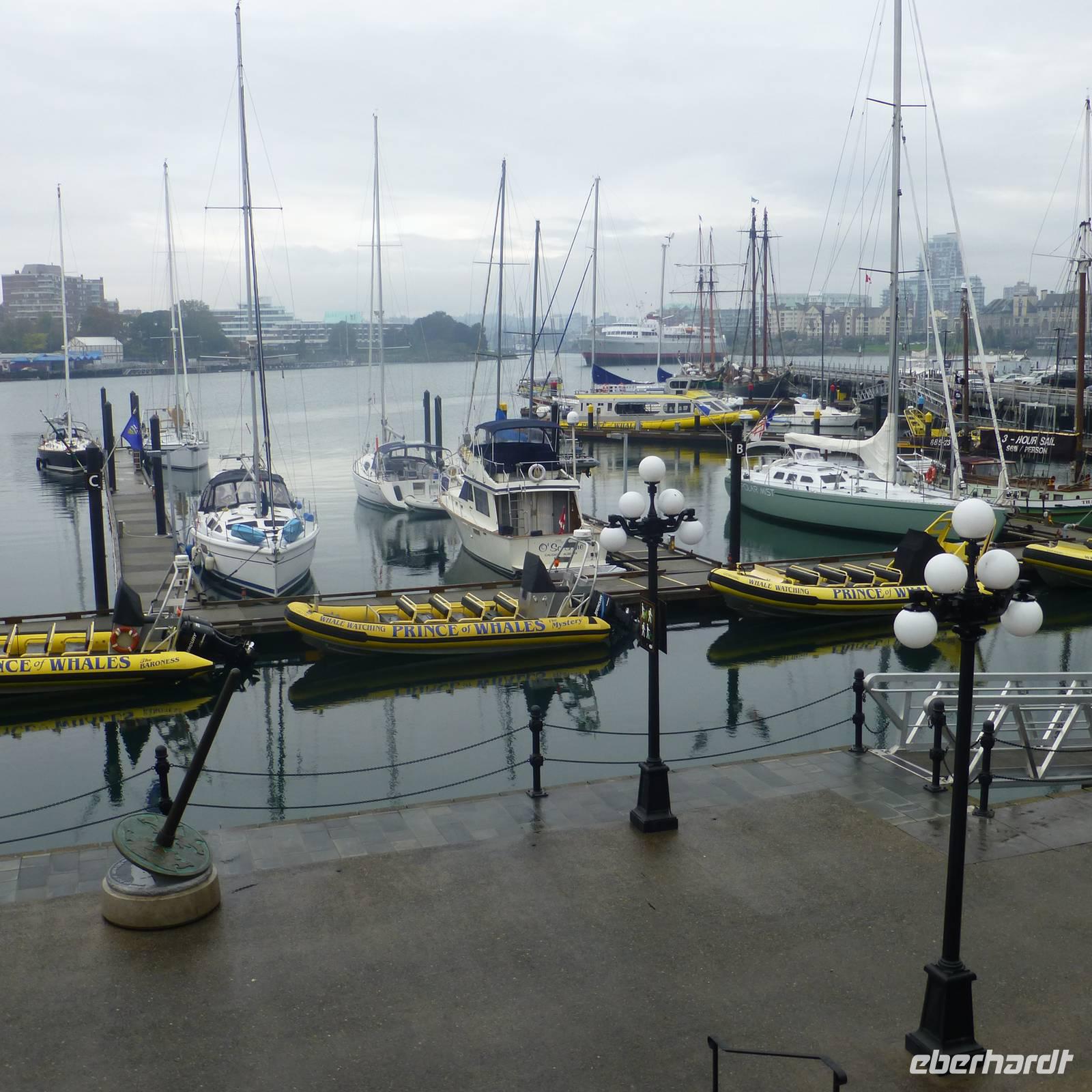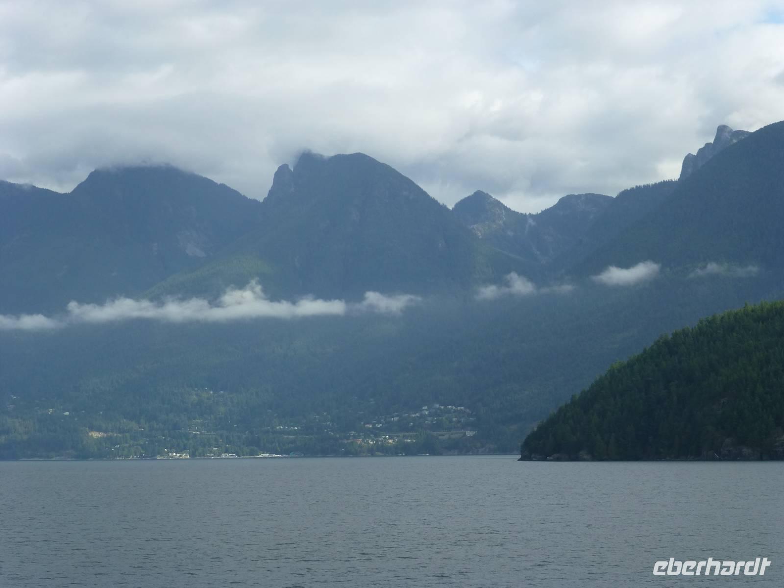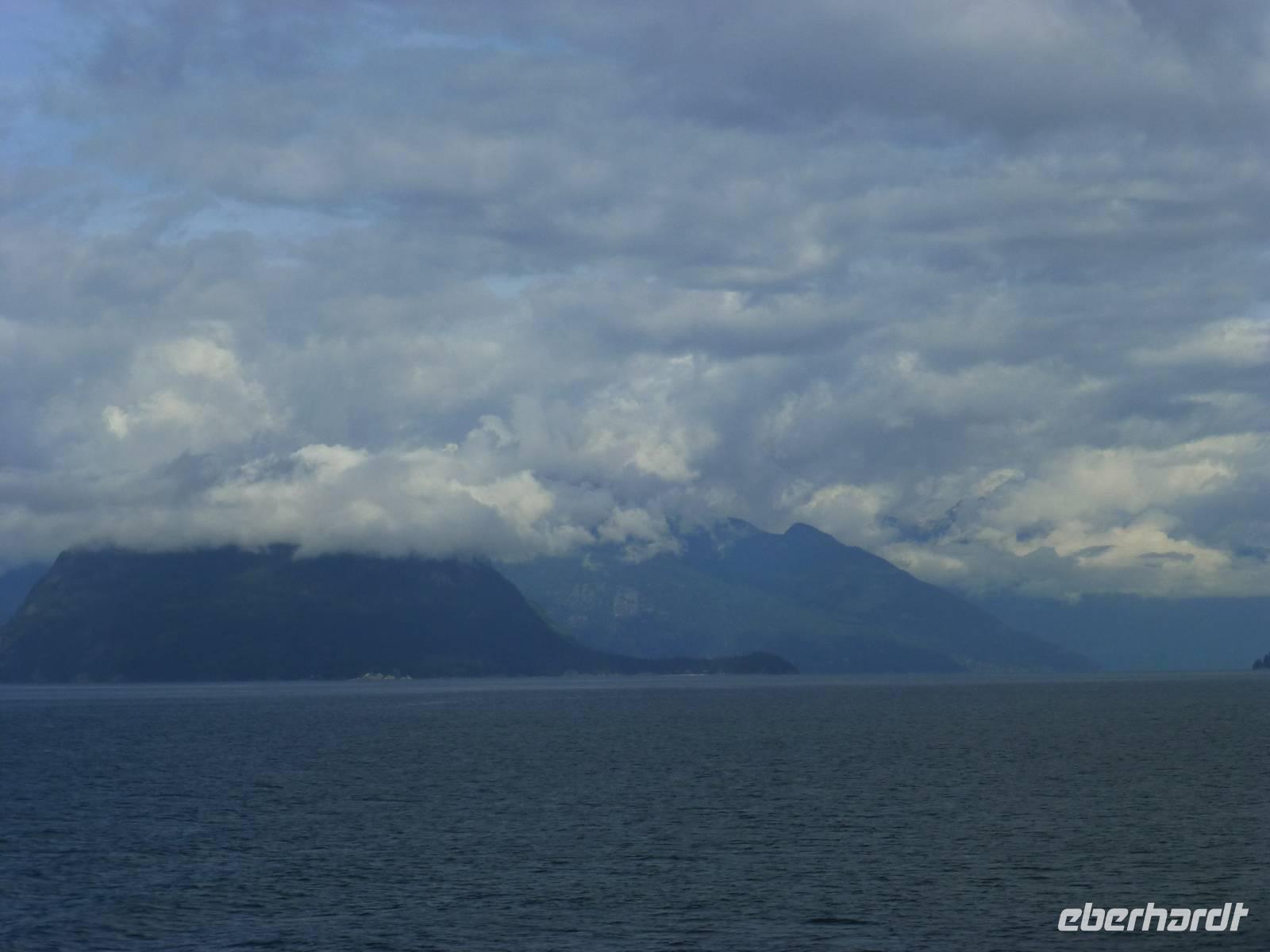 Heute stand eine lange Fahrt bevor. Bei schönem Wetter mit blauer Himmel und Sonnenschein fuhren wir 411km nach Tsawassen zur Fähre nach Vancouver Island. Wir erreichten Korumeus - die letzte Stadt des Obstanbaus. Auch hier gab es viele Obststände. Unsere weitere Reise führte uns hinein in die Kaskadenberge nach Hedley, die frühere Goldstadt. Auch jetzt kann man in den Flüssen noch Gold waschen. Weiter ging es nach Princeton. Diese Stadt besitzt eines der größten Sägewerke Kanadas. Auch der Roter Oker -rote Farbe - wird dort noch abgebaut. Auf einer sehr kurvenreichen Straße fuhren wir bis auf 1300 m Höhe. Durch den Manninge Park - benannt nach einem Premierminister - erreichten wir das Ski Gebiet. In diesem Naturbelassenen Park wurden zu den Winterspielen in Vancouver etliche Laster mit Schnee nach Vancouver gefahren. In der Manning Lodge legten wir eine Pause ein. Endlich konnten die begehrten Bärenglocken gekauft werden. Wir fuhren über den Allision Pass 1290 m weiter nach Hope. Am Fräserfluss befand sich eine schöne Parkanlage mit verschiedenen geschnitzten Figuren. Es wurde wieder etwas bergig. Die Kaskadenberge begleiten uns wieder. Das Tal wird immer breiter und auch der Fräserfluss breitet sich aus. Bald sehen wir rechts schon die Küstenberge. Wir erreichen den Fährhafen in Twarwansen und konnten sofort auf die Fähre nach Vancouver Island. Als wir los fuhren war alles im Nebel. Doch dann lichtete er sich und wir hatten einen schönen Blick auf die Golf Inseln. Ein Stück wurden wir sogar von Robben begleitet. Die Überfahrt dauert fast 2 Stunden bis nach Schwarz Bay. Wir erreichten unser Hotel in Viktoria und nutzten die Zeit bis zum Abendessen für die ersten Fotos. Das Restaurant befand sich direkt am Hafen. Doch vorher besichtigten wir noch das Empire Hotel und bestaunten das schön beleuchtete Parlament. Nach dem Abendessen kehrten wir noch in einem urigen Pub ein.