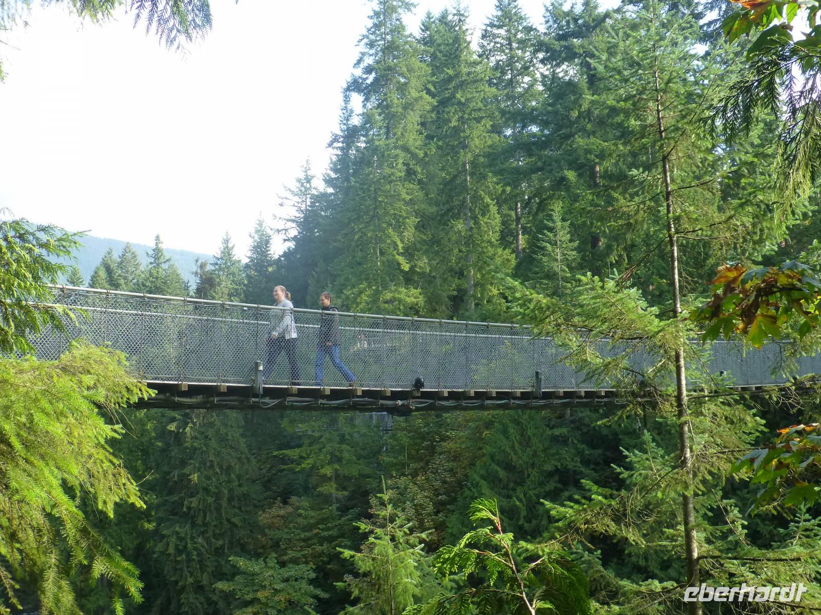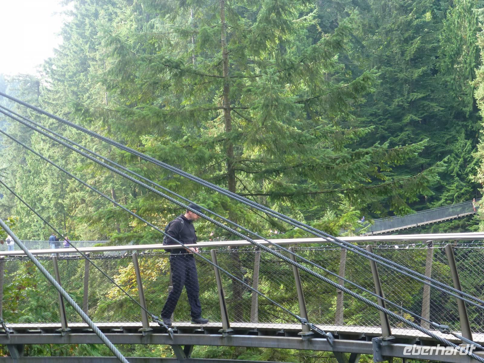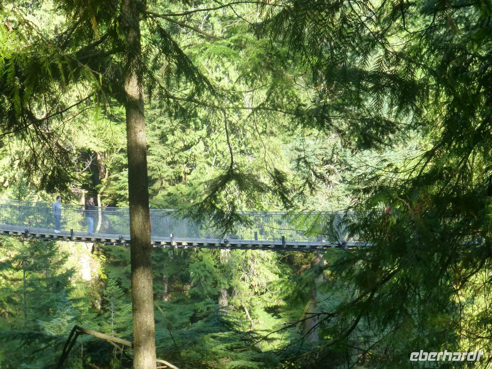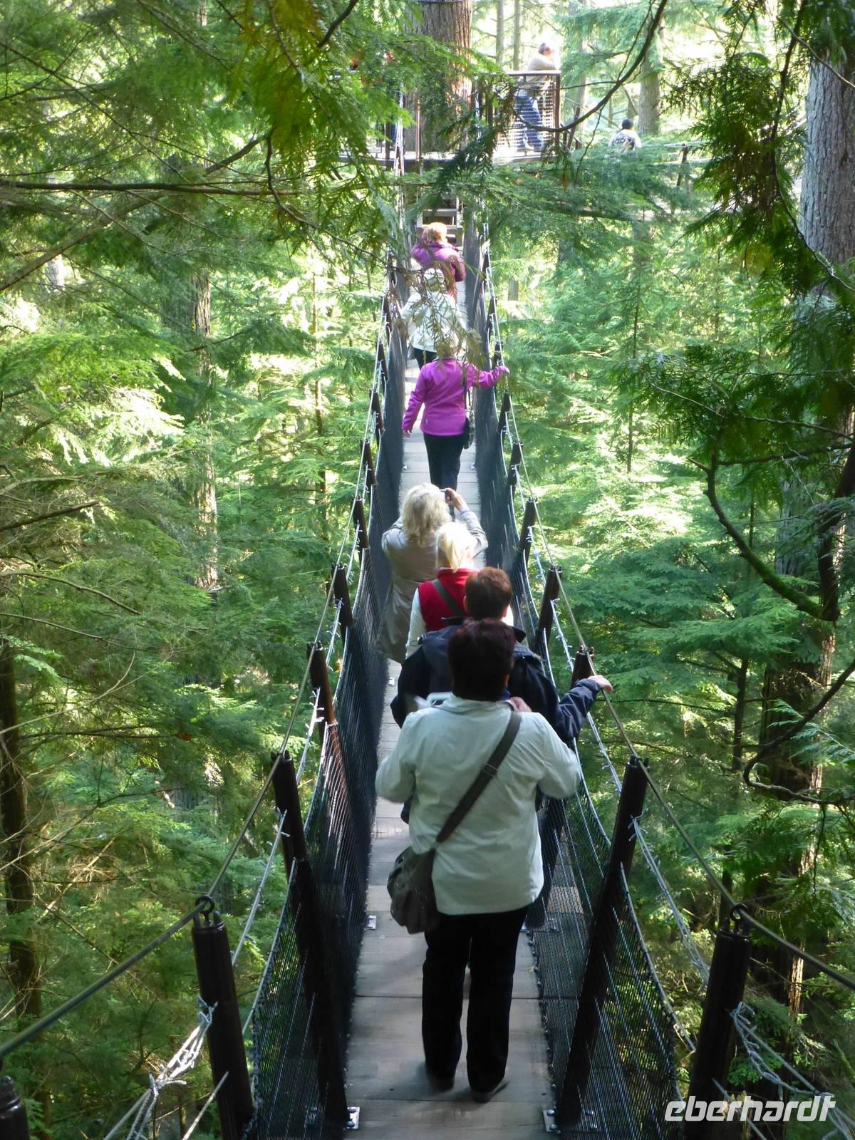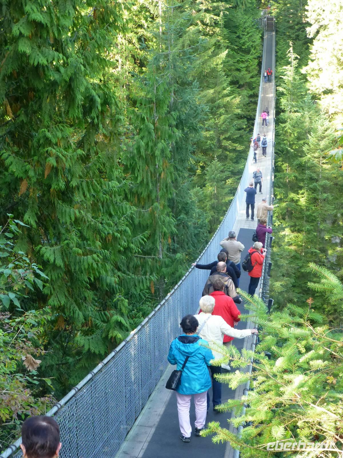Der heutige Ausflug führte uns in den Norden von Vancouver. Doch erst fuhren wir in den Stanlay Park. An den Totempfählen der Westküsten Indianer legten wir einen Stopp ein und bestaunten die Skyline von Vancouver. Anschließend besuchten wir die Capilano Salmon Hatchery, eine Lachszuchtanstalt, wo der Lebenskreis der Lachse demonstriert wird. Über eine Lachstreppe überwinden Sie Lachse die Stromschnellen und springen Stromaufwärts. Im Anschluss daran besuchten wir den Capilano Suspension Bridge Park. Als erstes überquerten wir mutig die Capilano Suspension Bridge, die längste und höchste Fußgängerhängebrücke der Welt! Es schaukelte schon etwas. Auf dem Baumlehrpfad konnten wir auf sieben Hängebrücken entlang wandeln. Auch den neuen Cliffwalk liefen wir entlang. Anschließend fuhren wir mit Nordamerikas größter Luftseilbahn auf den Hausberg von Vancouver, den Grouse Mountain. Wir genießen bei einem Picknick den Blick über Vancouver. Auch wenn wir schon Schwarzbeeren gesehen haben, fehlte noch der Besuch der Grizzly Bären. Einer der Bären hatte sich im Wald schlafen gelegt. Doch der andere stellte sich gern als Fotomotiv zur Verfügung. Die Holzfäller Show Lumber Jacks' war lustig und amüsant.