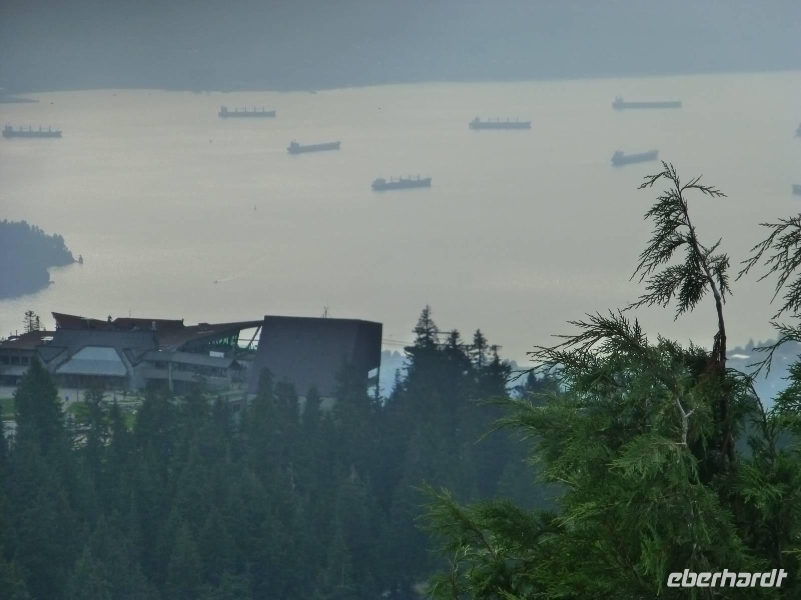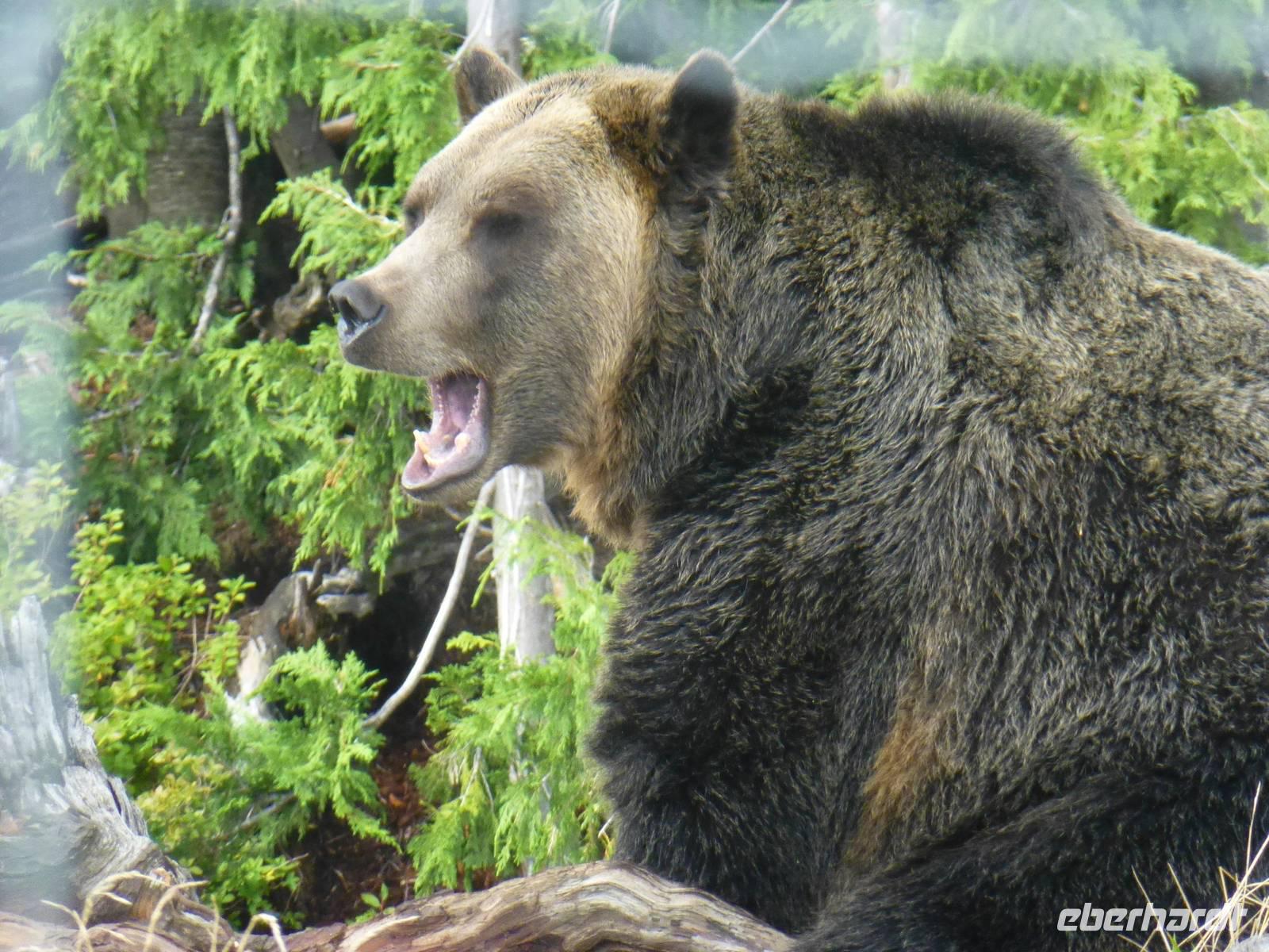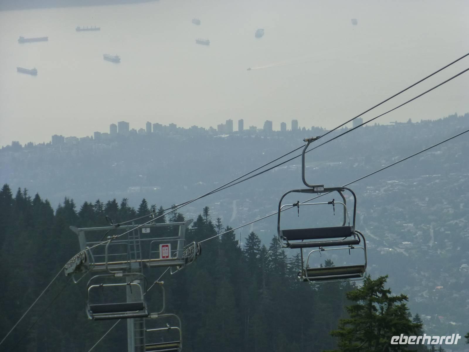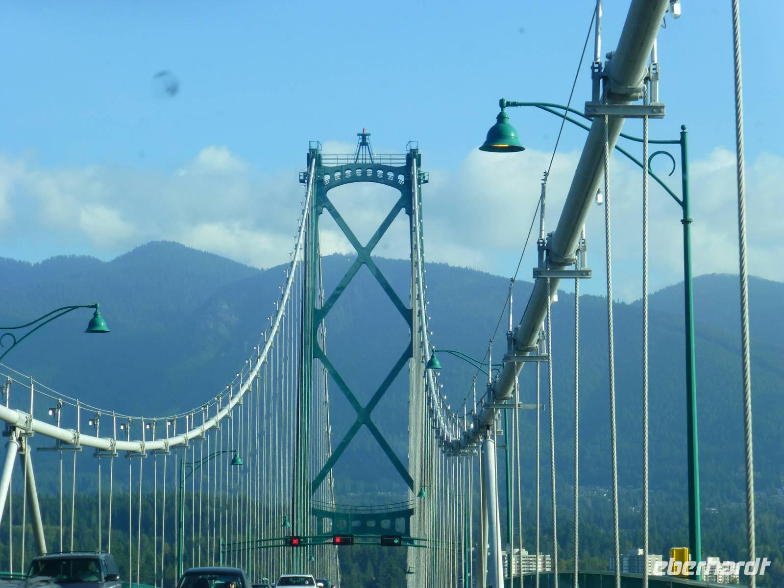 Der heutige Ausflug führte uns in den Norden von Vancouver. Doch erst fuhren wir in den Stanlay Park. An den Totempfählen der Westküsten Indianer legten wir einen Stopp ein und bestaunten die Skyline von Vancouver. Anschließend besuchten wir die Capilano Salmon Hatchery, eine Lachszuchtanstalt, wo der Lebenskreis der Lachse demonstriert wird. Über eine Lachstreppe überwinden Sie Lachse die Stromschnellen und springen Stromaufwärts. Im Anschluss daran besuchten wir den Capilano Suspension Bridge Park. Als erstes überquerten wir mutig die Capilano Suspension Bridge, die längste und höchste Fußgängerhängebrücke der Welt! Es schaukelte schon etwas. Auf dem Baumlehrpfad konnten wir auf sieben Hängebrücken entlang wandeln. Auch den neuen Cliffwalk liefen wir entlang. Anschließend fuhren wir mit Nordamerikas größter Luftseilbahn auf den Hausberg von Vancouver, den Grouse Mountain. Wir genießen bei einem Picknick den Blick über Vancouver. Auch wenn wir schon Schwarzbeeren gesehen haben, fehlte noch der Besuch der Grizzly Bären. Einer der Bären hatte sich im Wald schlafen gelegt. Doch der andere stellte sich gern als Fotomotiv zur Verfügung. Die Holzfäller Show Lumber Jacks' war lustig und amüsant.