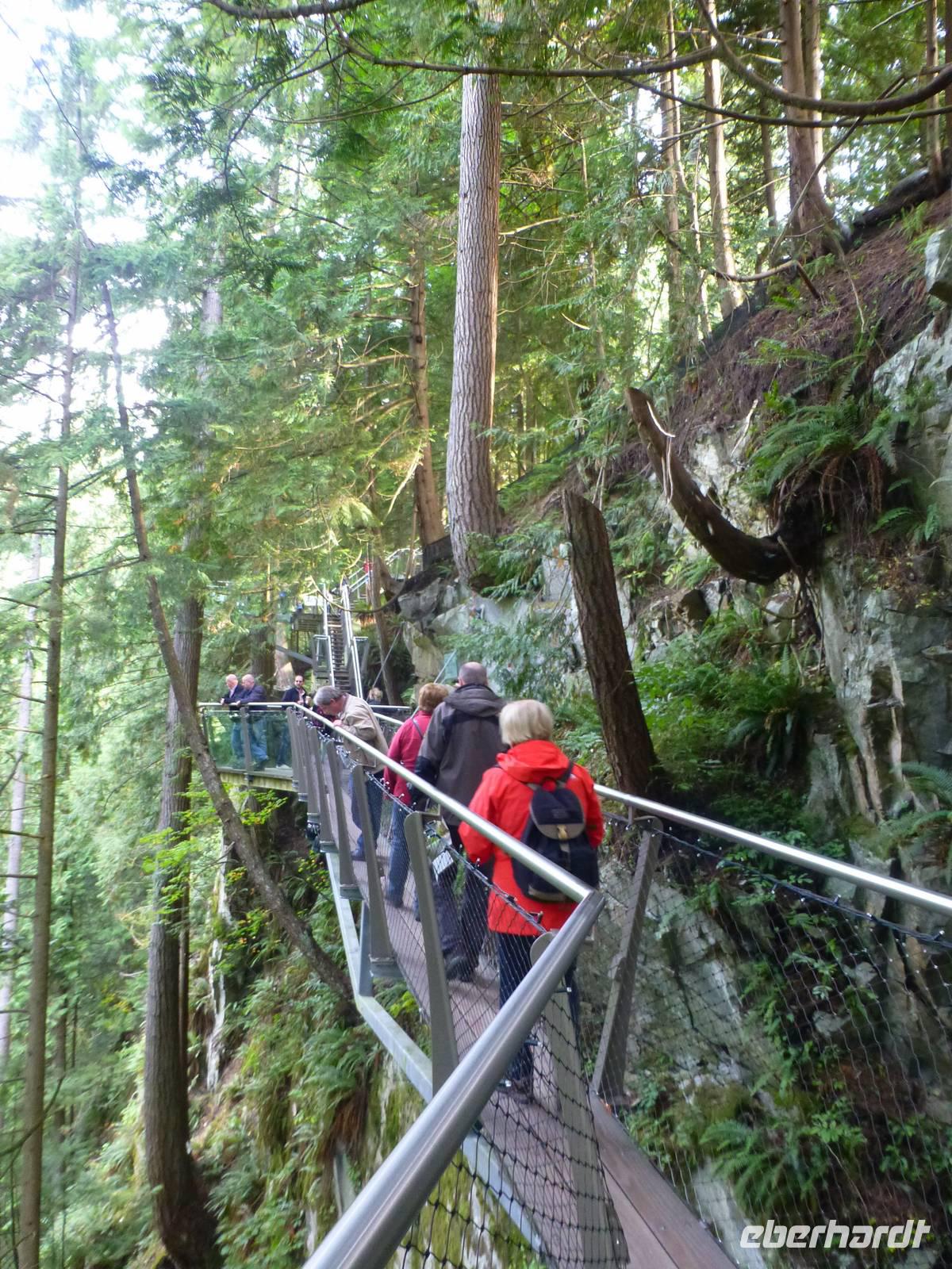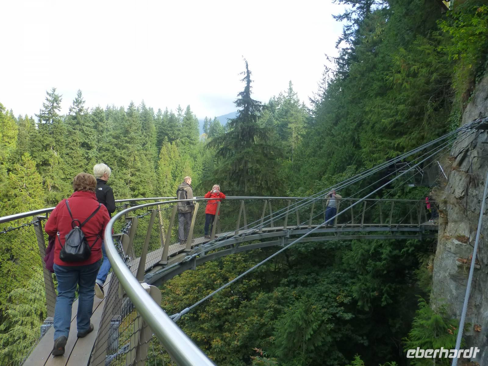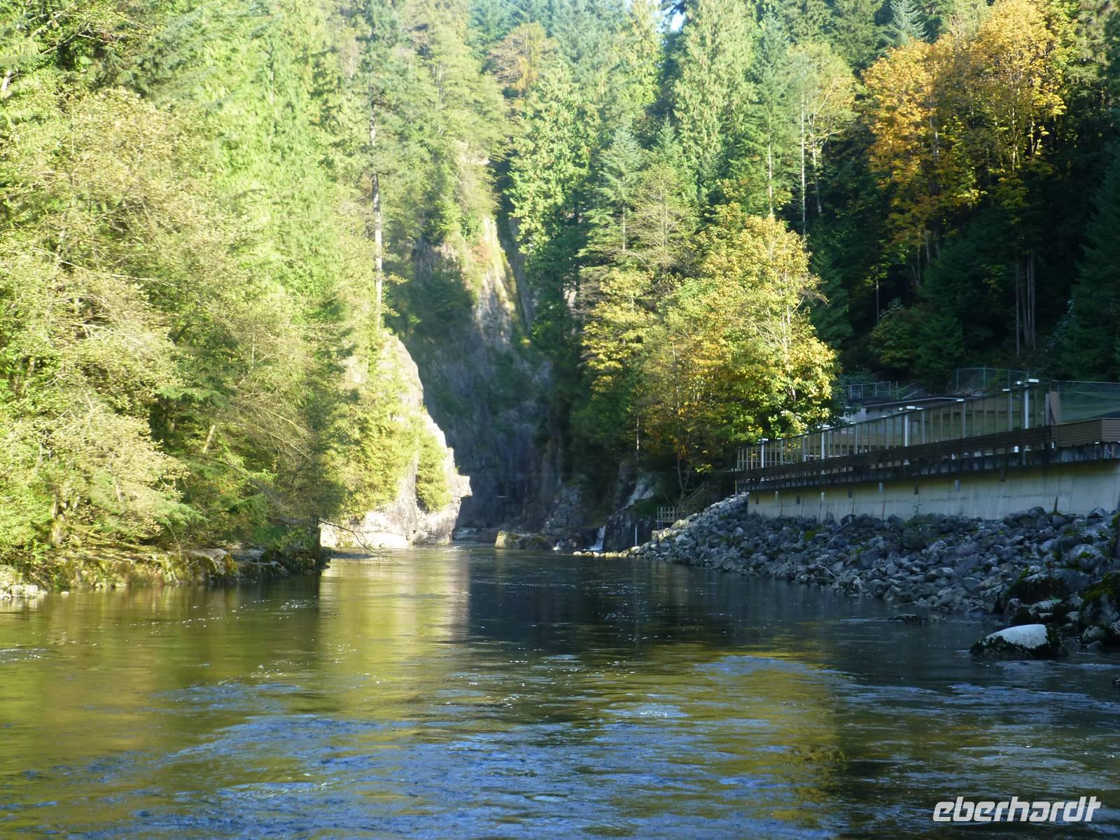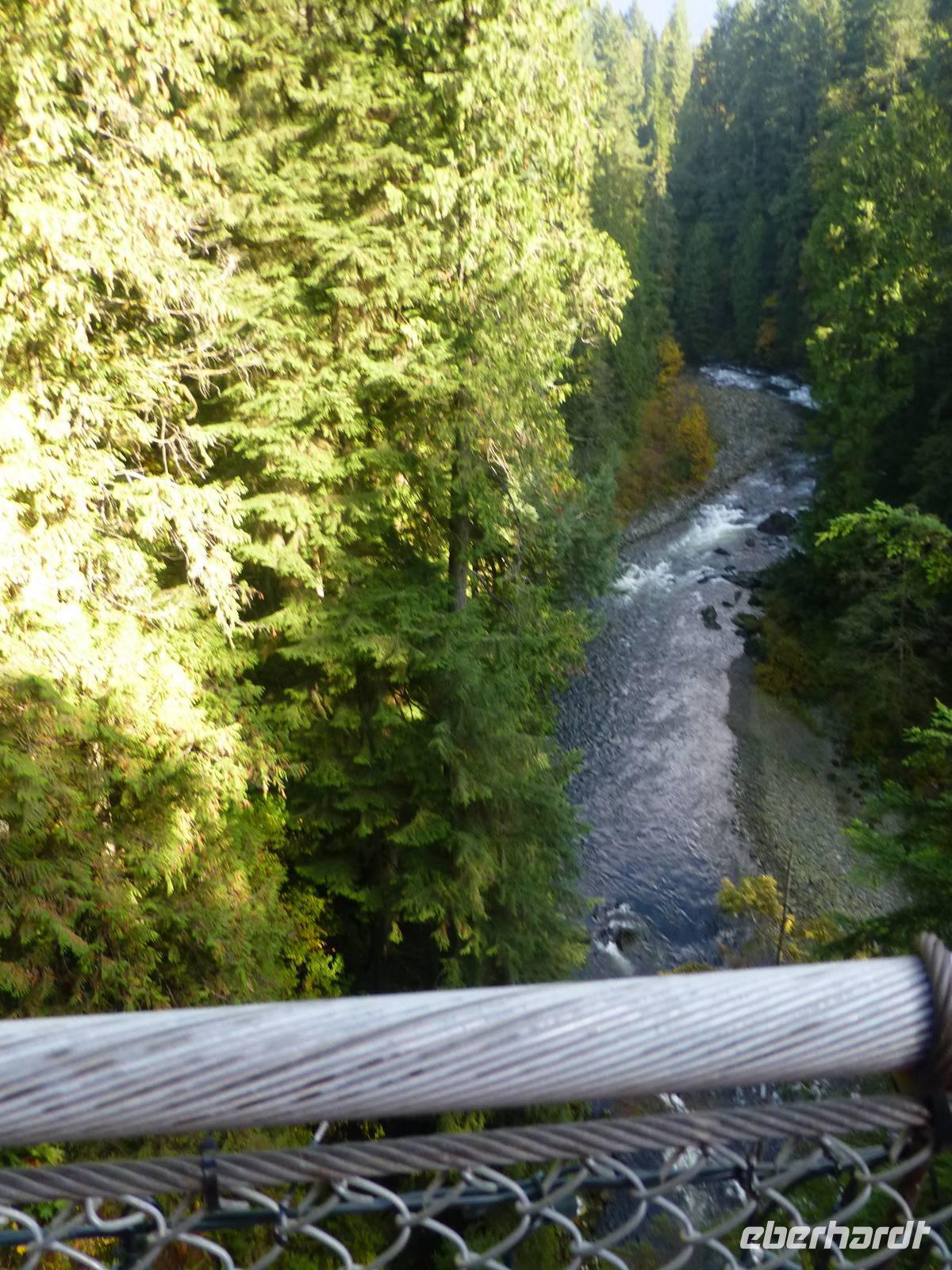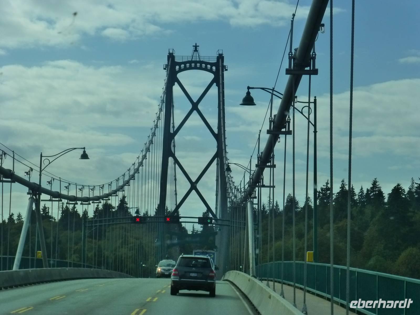 Der heutige Ausflug führte uns in den Norden von Vancouver. Doch erst fuhren wir in den Stanlay Park. An den Totempfählen der Westküsten Indianer legten wir einen Stopp ein und bestaunten die Skyline von Vancouver. Anschließend besuchten wir die Capilano Salmon Hatchery, eine Lachszuchtanstalt, wo der Lebenskreis der Lachse demonstriert wird. Über eine Lachstreppe überwinden Sie Lachse die Stromschnellen und springen Stromaufwärts. Im Anschluss daran besuchten wir den Capilano Suspension Bridge Park. Als erstes überquerten wir mutig die Capilano Suspension Bridge, die längste und höchste Fußgängerhängebrücke der Welt! Es schaukelte schon etwas. Auf dem Baumlehrpfad konnten wir auf sieben Hängebrücken entlang wandeln. Auch den neuen Cliffwalk liefen wir entlang. Anschließend fuhren wir mit Nordamerikas größter Luftseilbahn auf den Hausberg von Vancouver, den Grouse Mountain. Wir genießen bei einem Picknick den Blick über Vancouver. Auch wenn wir schon Schwarzbeeren gesehen haben, fehlte noch der Besuch der Grizzly Bären. Einer der Bären hatte sich im Wald schlafen gelegt. Doch der andere stellte sich gern als Fotomotiv zur Verfügung. Die Holzfäller Show Lumber Jacks' war lustig und amüsant.